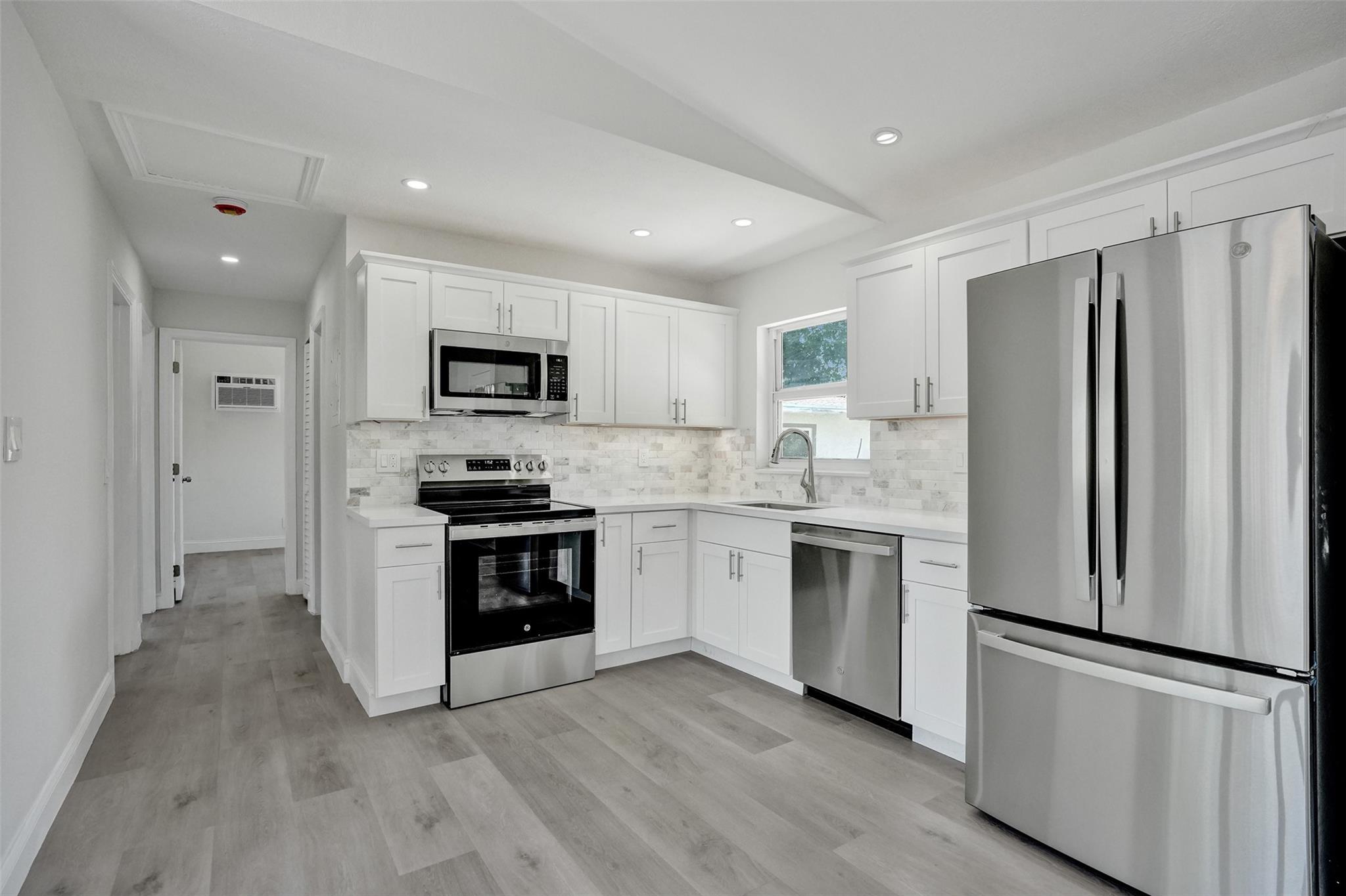 Price Improvement! Completely Remodeled w/ Modern Upgrades. Beautifully renovated home featuring bright & open layout w/ large combined kitchen, dining & living area—perfect for entertaining or relaxing w/ family. Brand new roof (March 2025) with transferable warranty for peace of mind. Impact windows & solid doors for added security and energy efficiency. Stunning new kitchen complete with quartz countertops, under-cabinet lighting, garbage disposal, brand-new SS appliances, custom cabinetry & stylish tile finishes. Luxury Vinyl Plank flooring throughout home for a modern & durable touch & new ceiling fans w/ remotes. Spacious backyard is a tropical retreat w/ mature mango tree, ideal for outdoor gatherings. Additional upgrades include new hot water heater & outdoor tiles. Move in ready!