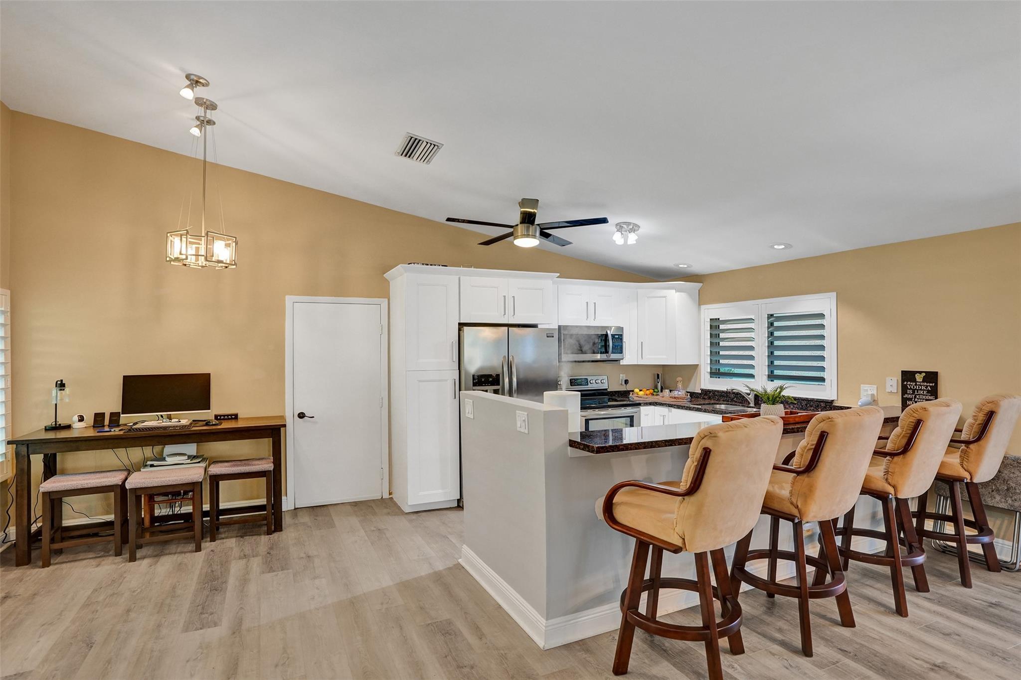 Great new price on this beautifully updated and decorated home with golf course and water views. There is a very reasonable turn-key option, move-in ready this season! Bonus: low HOA fees in Indian Spring which include 24/7 manned gates! Open-concept 2 bedroom 2 bath floor plan has high ceilings with impact windows and beautiful plantation shutters. Also included, LVP flooring, updated baths, & kitchen. Screened patio has 2 other patios attached, 1 with pass-through kitchen window ideal for grill, larger 2nd one provides direct access to golf course and lakeside. Short walk to community pool, tennis and pickleball courts. Known as a guard-gated and patrolled golf community, membership is NOT required but very affordable & includes access to sister country club 8 miles north.