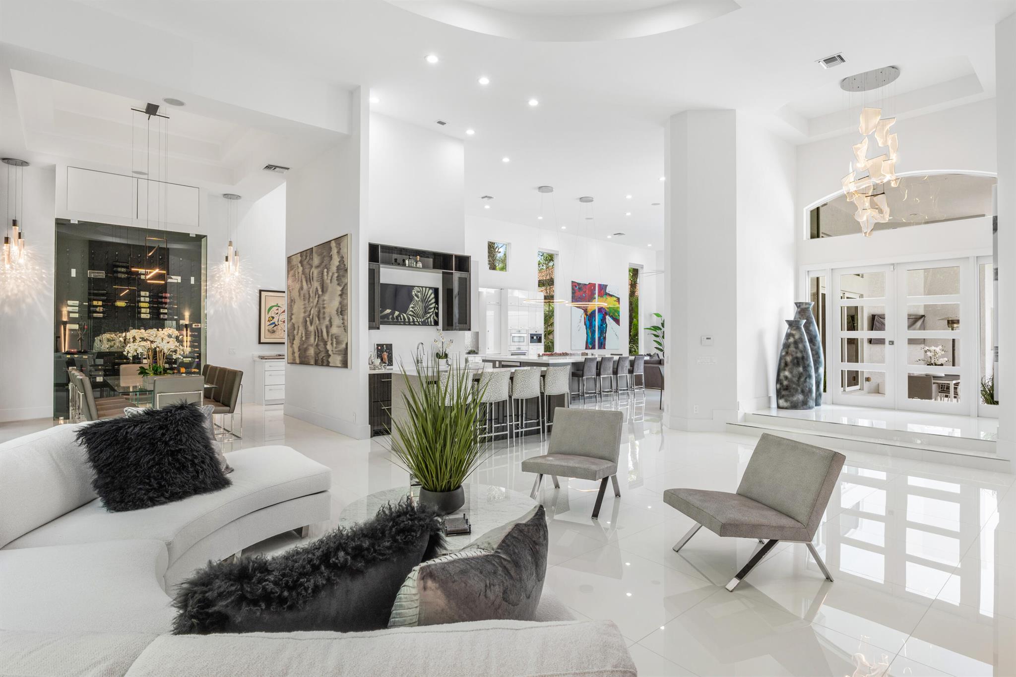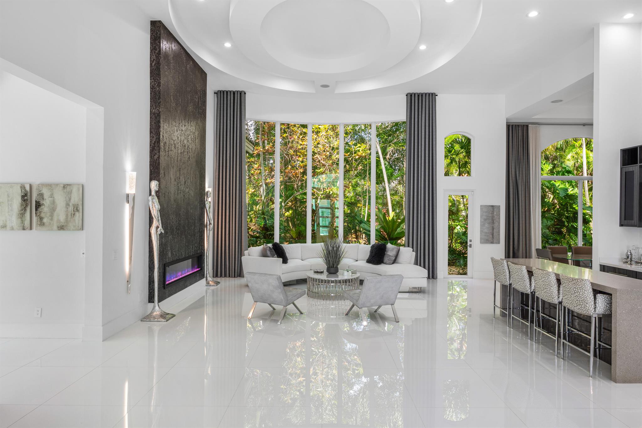 Welcome to a masterfully renovated estate in the prestigious Polo Club, where timeless elegance meets modern sophistication. This stunning residence is an absolute showstopper, brimming with exquisite details, designer finishes, and impeccable craftsmanship throughout. As you step through the grand entryway, you're immediately greeted by an expansive living room featuring soaring floor-to-ceiling windows that frame lush greenery and bathe the space in natural light. A sleek, modern electric fireplace anchors the room, flanked by elegant wall sconces, creating a warm and inviting ambiance. Entertaining is effortless with the fully equipped wet bar, complete with two beverage drawers, an ice maker, abundant custom cabinetry, and bar seating--perfect for hosting in style. The gourmet kitchen