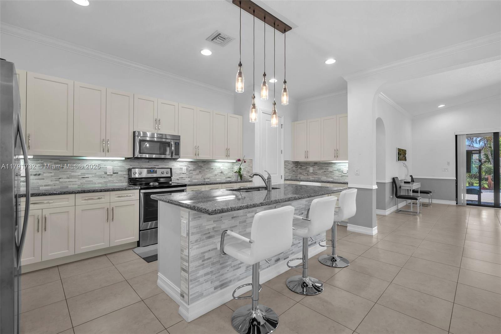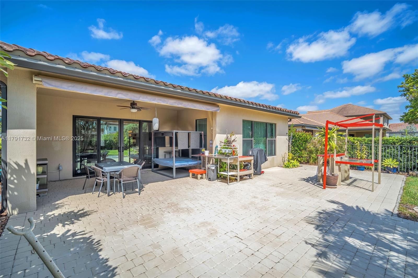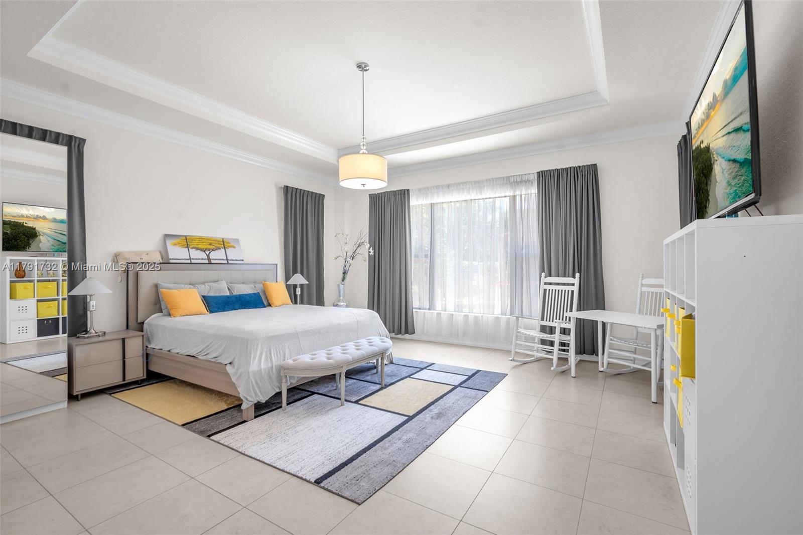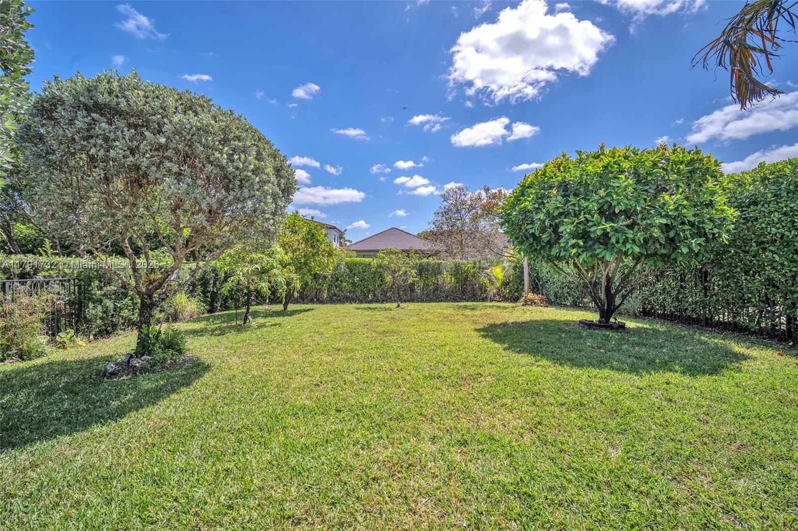 Enter this modern, 2015 3/2.5 single floor home via a lush garden with orchid adorned palms & glass patterned door. Notice the wood ceiling trim and large porcelain tiles throughout. Kitchen boasts dark granite counters with contrasting cream cabinets & backsplash + under cabinet lighting & SS appliances. 2421 SF of living space is reflected in the oversized master with glass enclosed shower + jacuzzi & 2 custom closets. Back yard has large, covered lanai with pavers and plenty of space for a pool. The two-car garage is tiled & has AC. Driveway holds 3 cars. This home also includes high impact windows and alarm system. All this in the prestigious & gated Raintree community with gym & heated pool. You will be close to shops, restaurants, services & the I75.