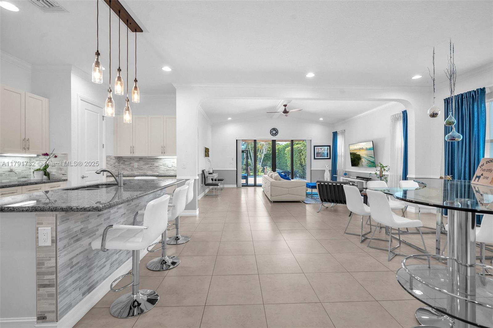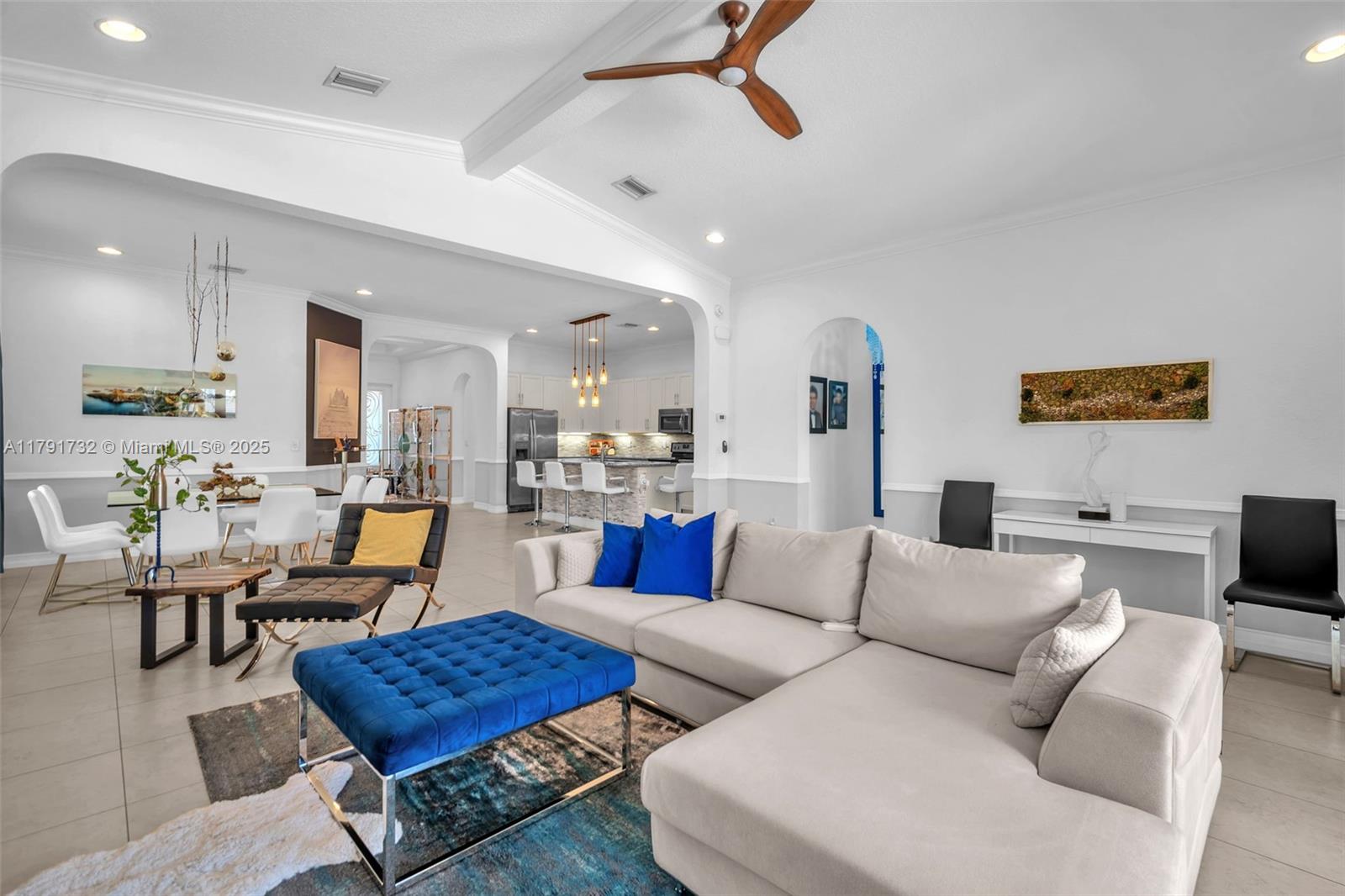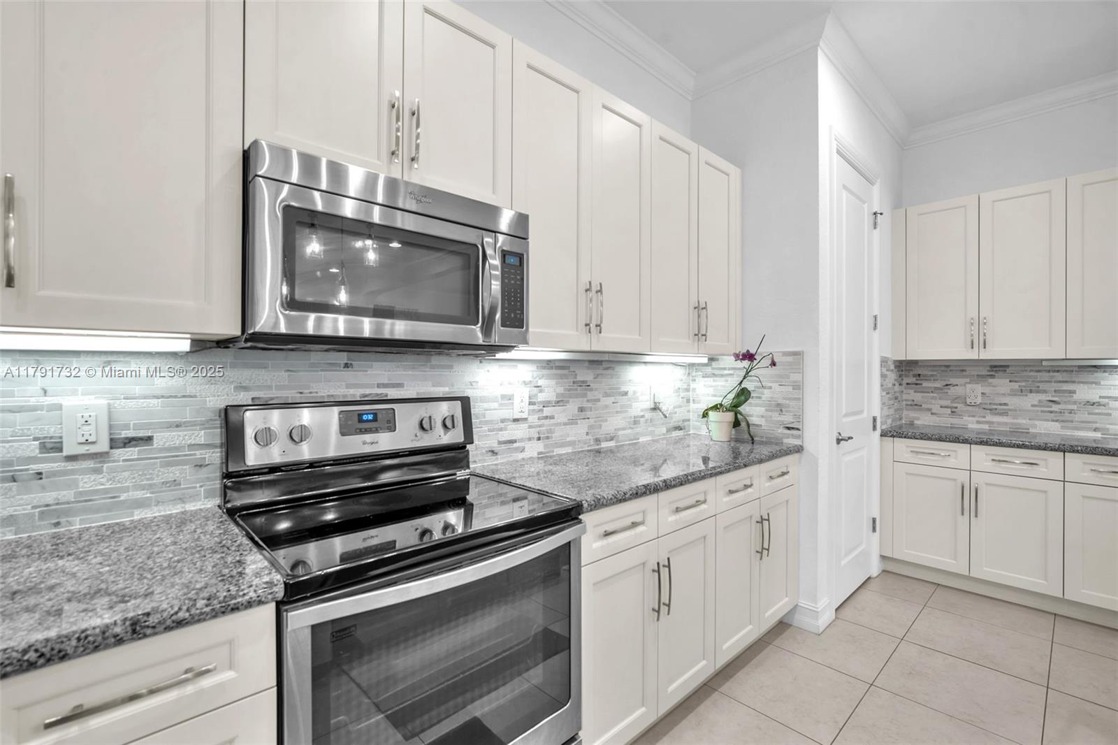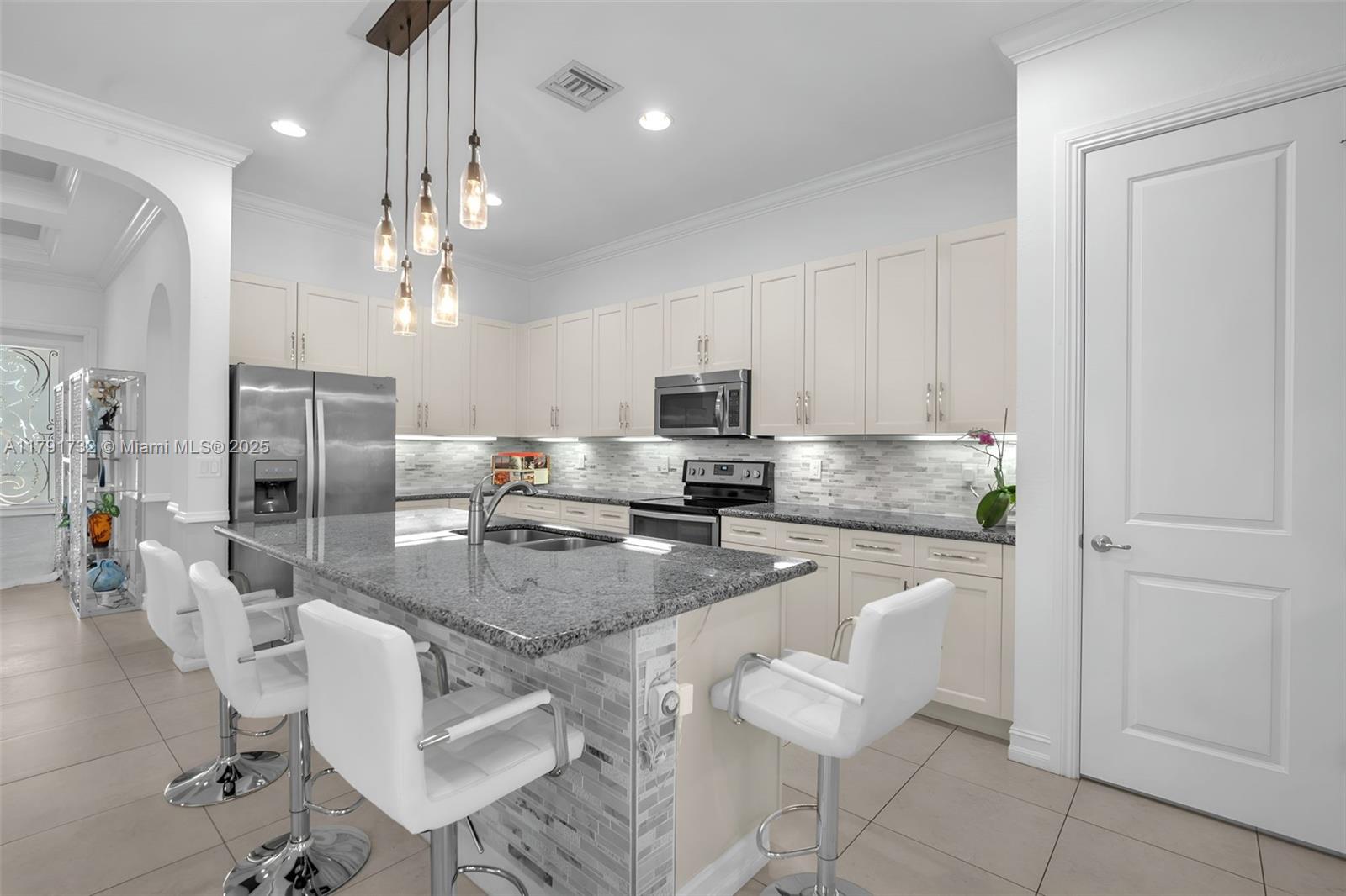 Enter this modern, 2015 3/2.5 single floor home via a lush garden with orchid adorned palms & glass patterned door. Notice the wood ceiling trim and large porcelain tiles throughout. Kitchen boasts dark granite counters with contrasting cream cabinets & backsplash + under cabinet lighting & SS appliances. 2421 SF of living space is reflected in the oversized master with glass enclosed shower + jacuzzi & 2 custom closets. Back yard has large, covered lanai with pavers and plenty of space for a pool. The two-car garage is tiled & has AC. Driveway holds 3 cars. This home also includes high impact windows and alarm system. All this in the prestigious & gated Raintree community with gym & heated pool. You will be close to shops, restaurants, services & the I75.