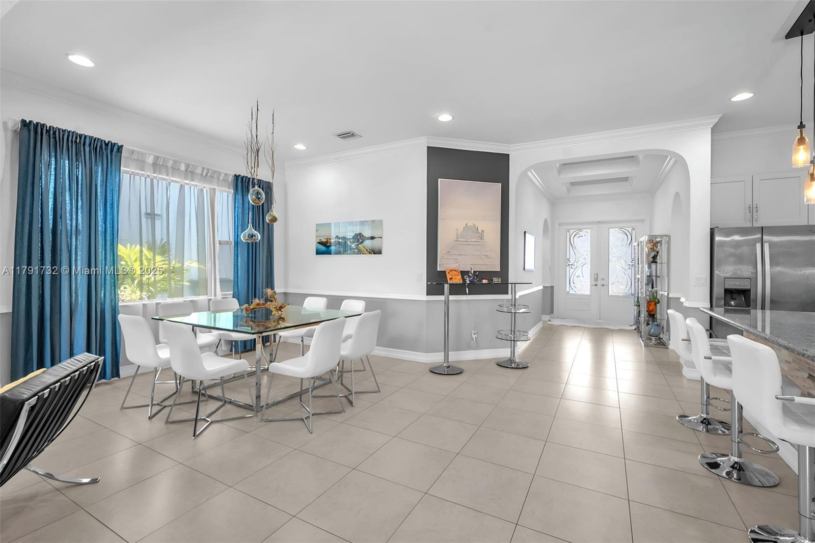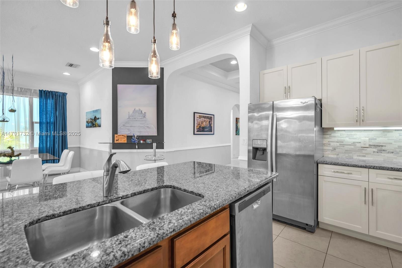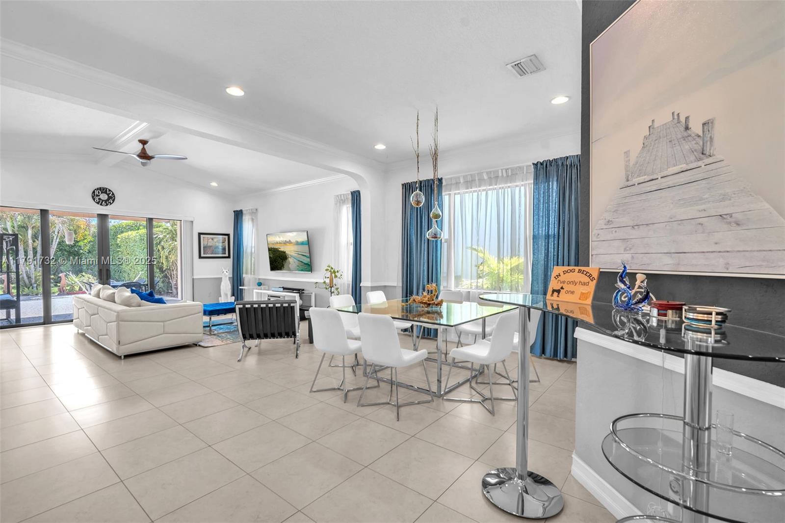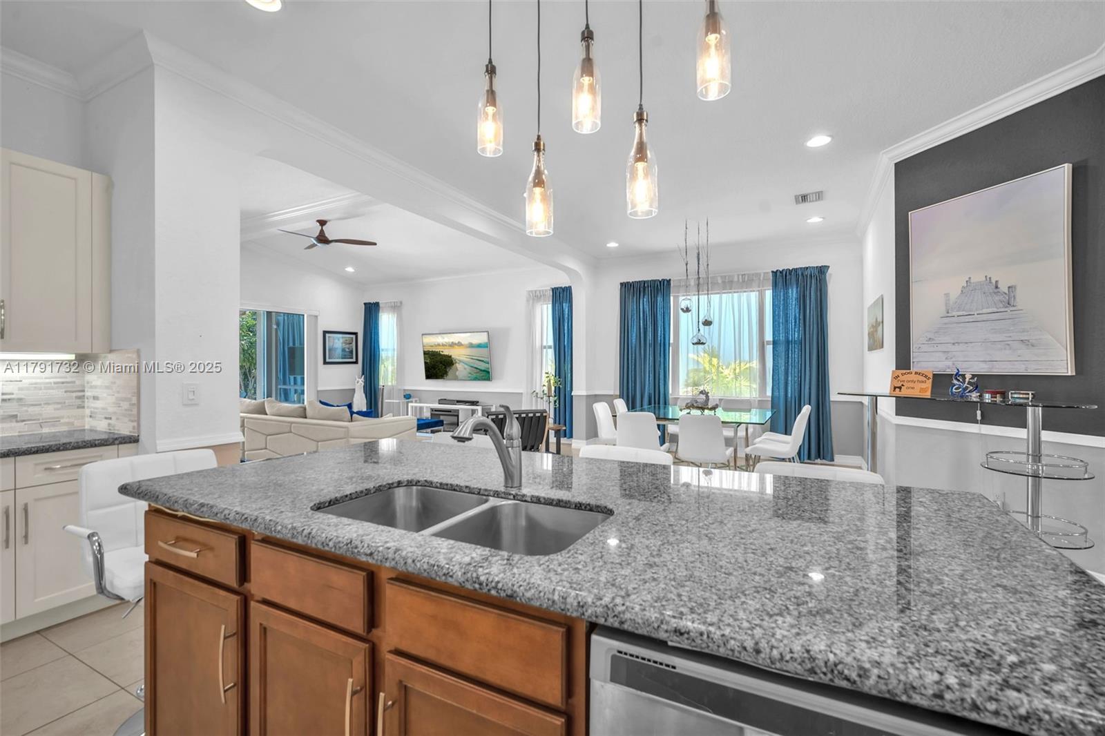 Enter this modern, 2015 3/2.5 single floor home via a lush garden with orchid adorned palms & glass patterned door. Notice the wood ceiling trim and large porcelain tiles throughout. Kitchen boasts dark granite counters with contrasting cream cabinets & backsplash + under cabinet lighting & SS appliances. 2421 SF of living space is reflected in the oversized master with glass enclosed shower + jacuzzi & 2 custom closets. Back yard has large, covered lanai with pavers and plenty of space for a pool. The two-car garage is tiled & has AC. Driveway holds 3 cars. This home also includes high impact windows and alarm system. All this in the prestigious & gated Raintree community with gym & heated pool. You will be close to shops, restaurants, services & the I75.