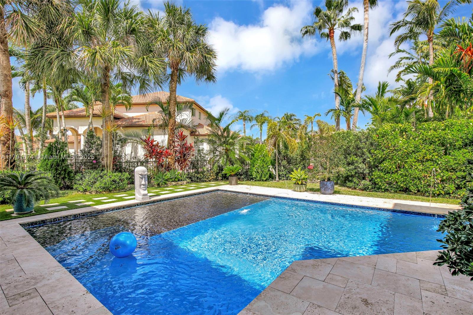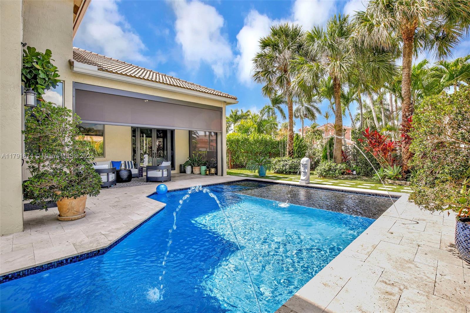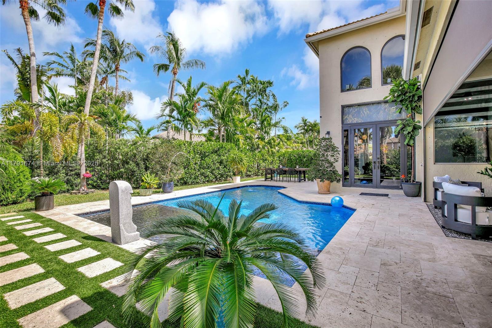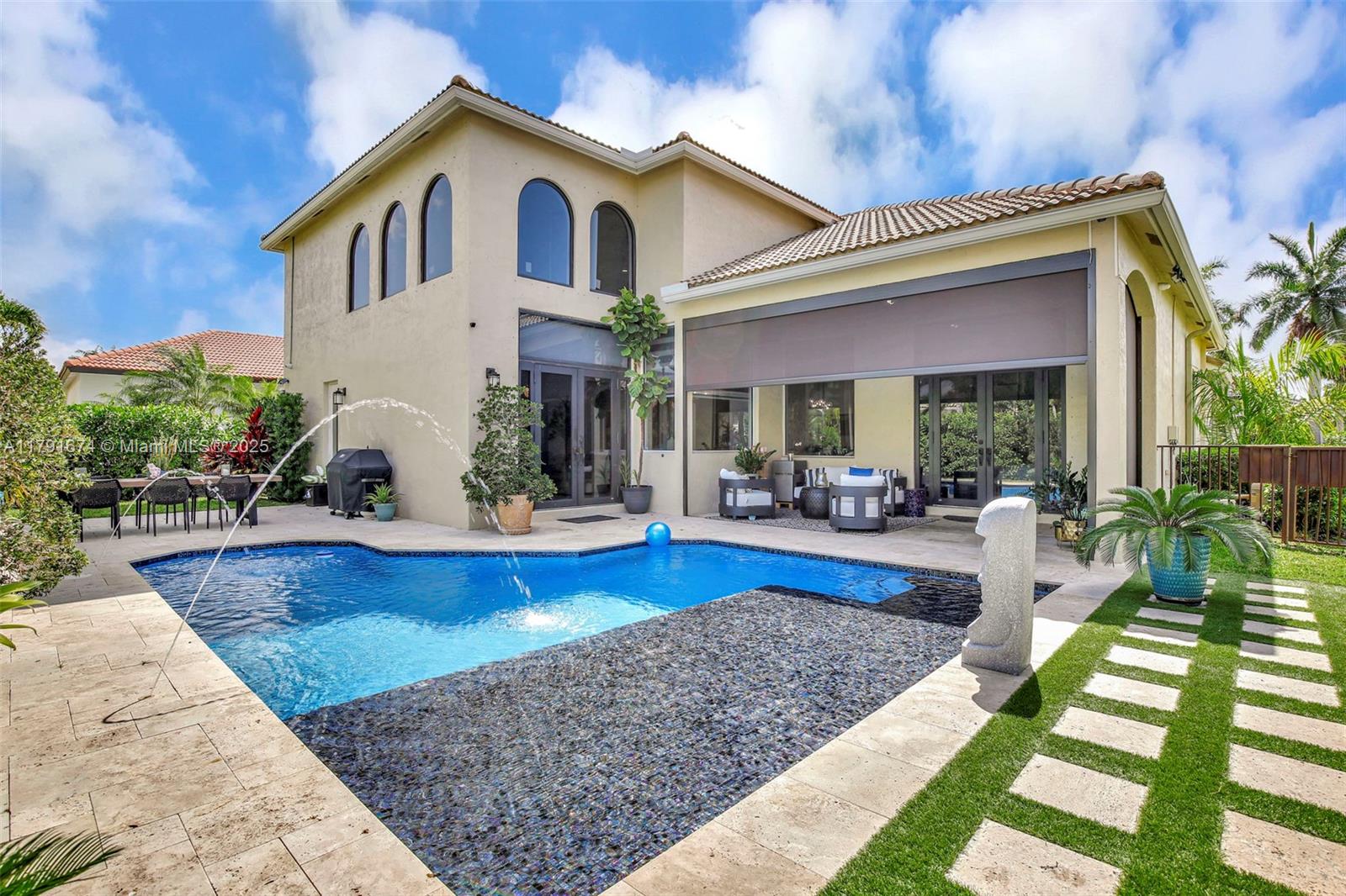 Experience refined living in the exclusive Sunset Lake community. 5/5+loft blends timeless sophistication with a modern edge, featuring dramatic volume ceilings, elegant arched windows, and a seamless indoor-outdoor flow. Enjoy serene afternoons on the expansive covered terrace with motorized screens, overlooking a private resort-style pool framed by lush tropical zen garden. Inside, an open-concept design welcomes abundant natural light through impact glass doors. The chef's kitchen impresses with quartz countertops, wood cabinets, double wall ovens, a wine cooler, barista station with floating shelves, and a peninsula perfect for casual gatherings in the sun-drenched breakfast nook and expansive family room. Primary wing includes sitting area, walk-in closes, and big bathroom. Low HOA.