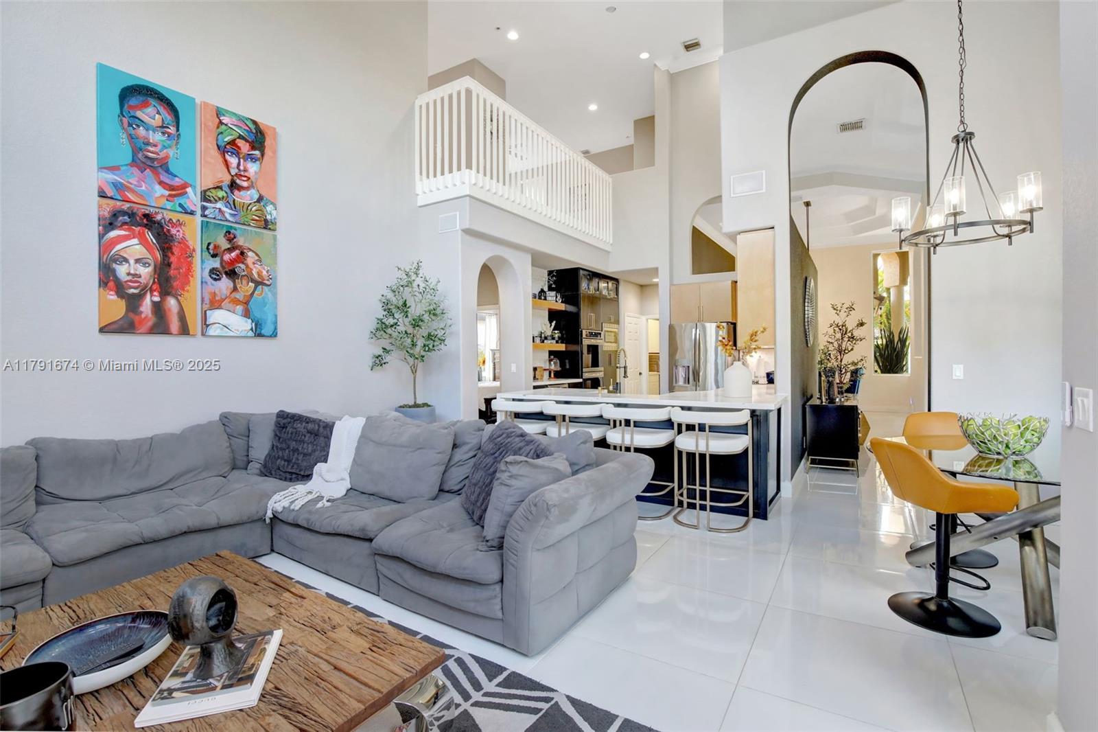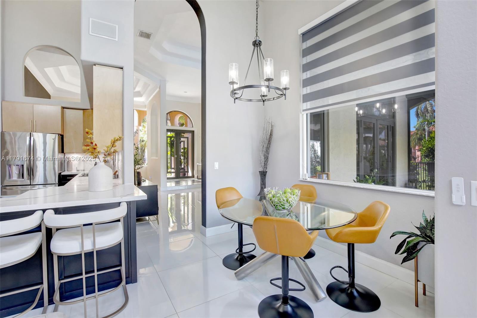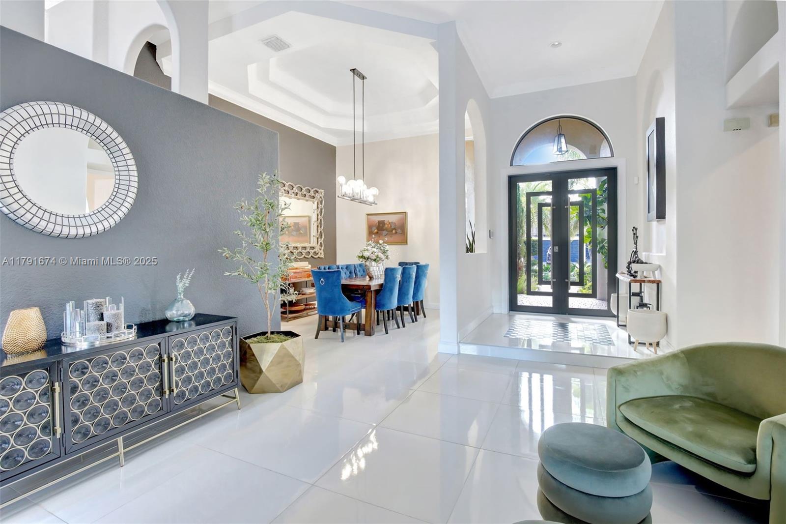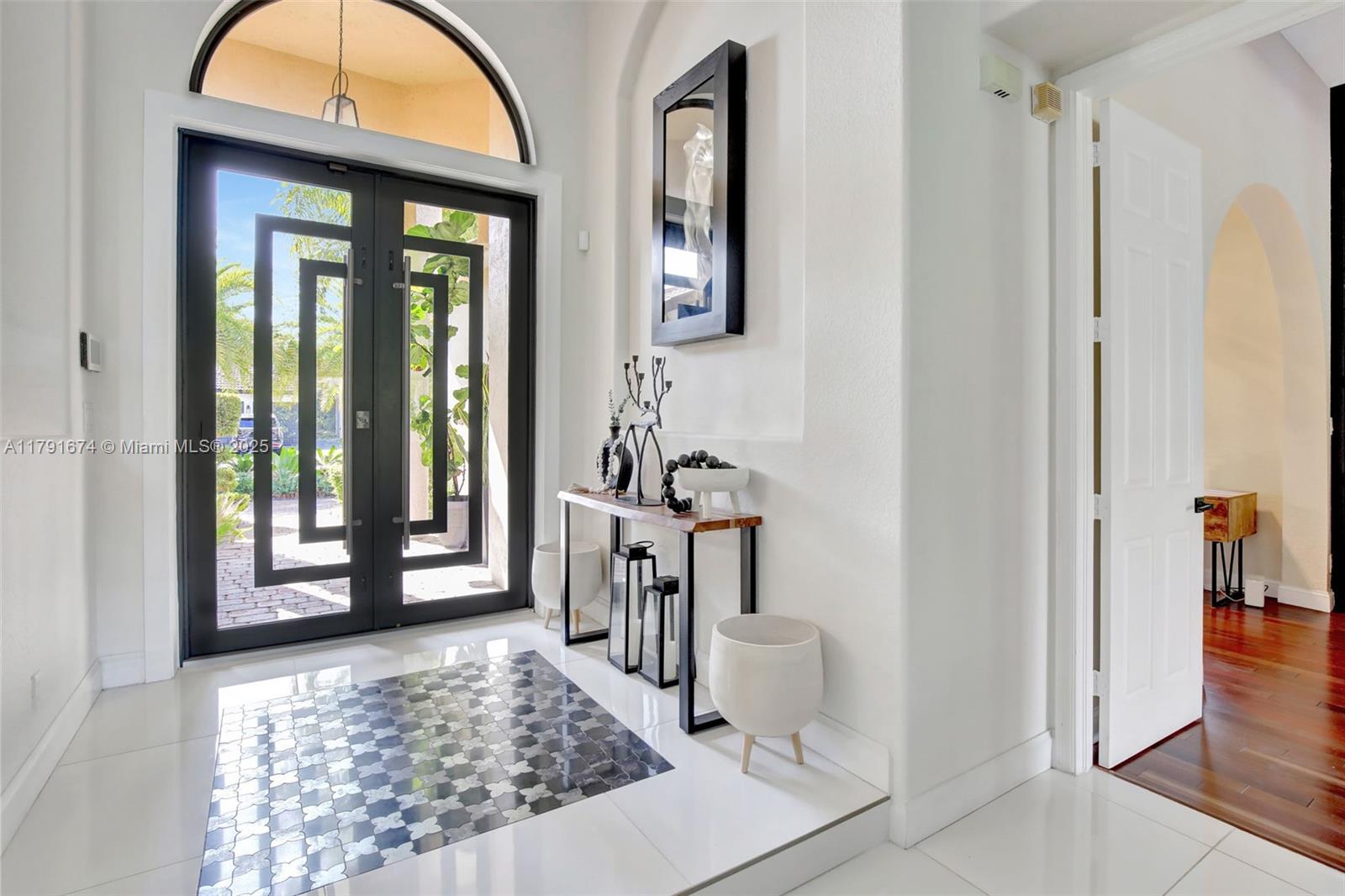 Experience refined living in the exclusive Sunset Lake community. 5/5+loft blends timeless sophistication with a modern edge, featuring dramatic volume ceilings, elegant arched windows, and a seamless indoor-outdoor flow. Enjoy serene afternoons on the expansive covered terrace with motorized screens, overlooking a private resort-style pool framed by lush tropical zen garden. Inside, an open-concept design welcomes abundant natural light through impact glass doors. The chef's kitchen impresses with quartz countertops, wood cabinets, double wall ovens, a wine cooler, barista station with floating shelves, and a peninsula perfect for casual gatherings in the sun-drenched breakfast nook and expansive family room. Primary wing includes sitting area, walk-in closes, and big bathroom. Low HOA.