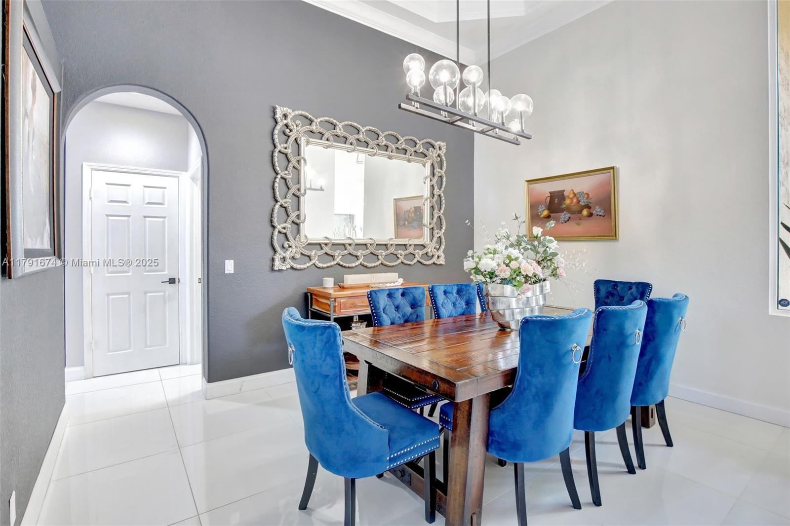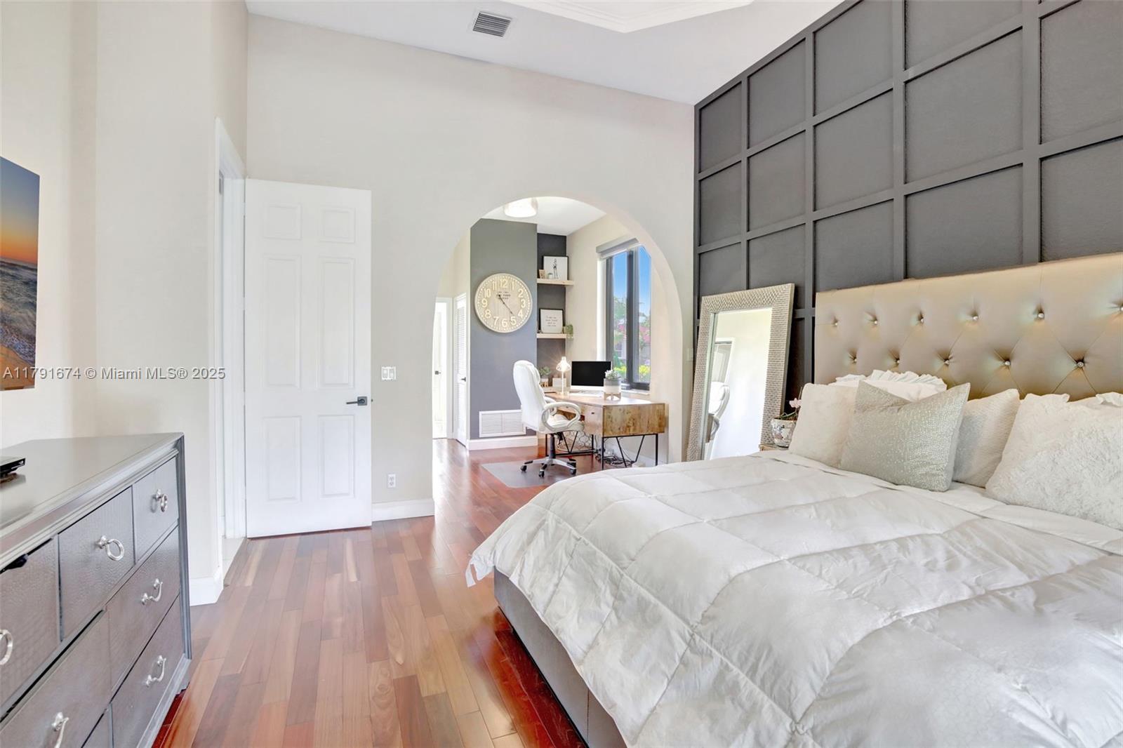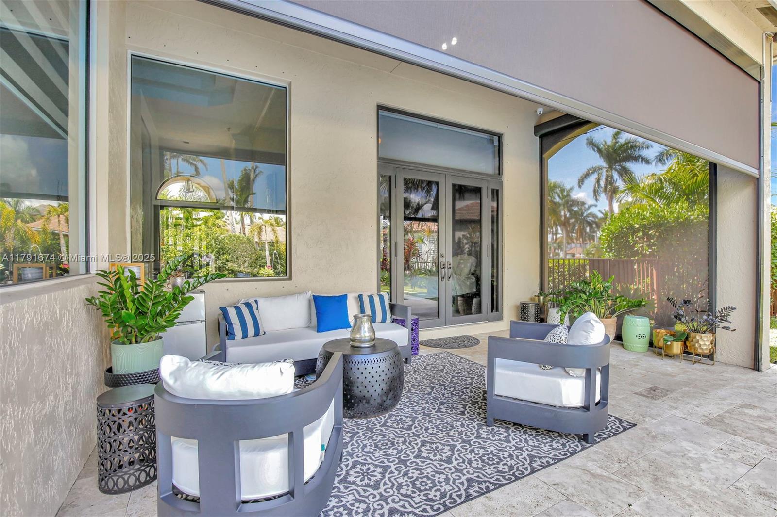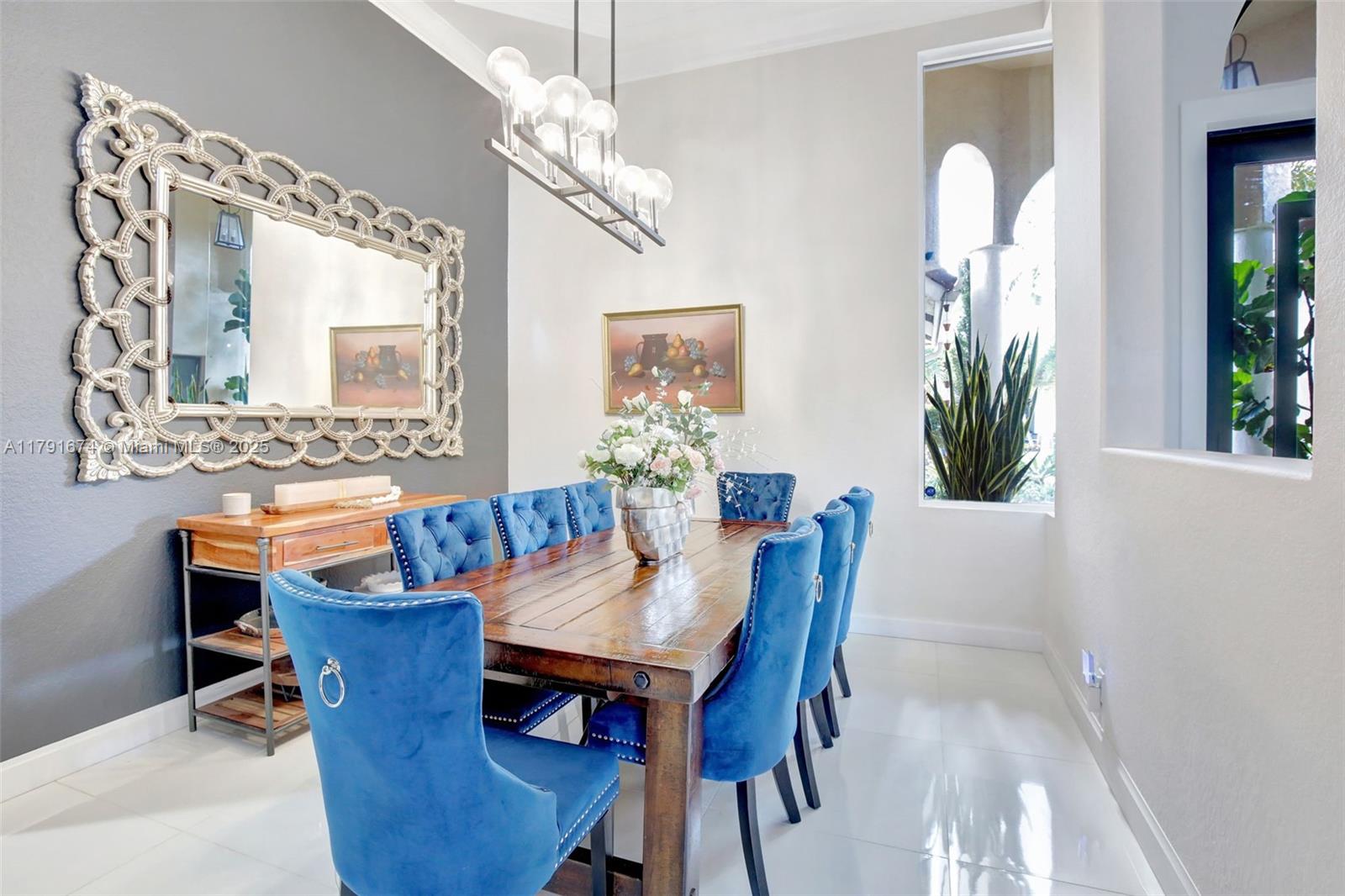 Experience refined living in the exclusive Sunset Lake community. 5/5+loft blends timeless sophistication with a modern edge, featuring dramatic volume ceilings, elegant arched windows, and a seamless indoor-outdoor flow. Enjoy serene afternoons on the expansive covered terrace with motorized screens, overlooking a private resort-style pool framed by lush tropical zen garden. Inside, an open-concept design welcomes abundant natural light through impact glass doors. The chef's kitchen impresses with quartz countertops, wood cabinets, double wall ovens, a wine cooler, barista station with floating shelves, and a peninsula perfect for casual gatherings in the sun-drenched breakfast nook and expansive family room. Primary wing includes sitting area, walk-in closes, and big bathroom. Low HOA.