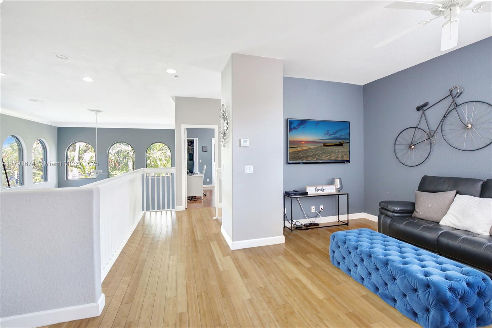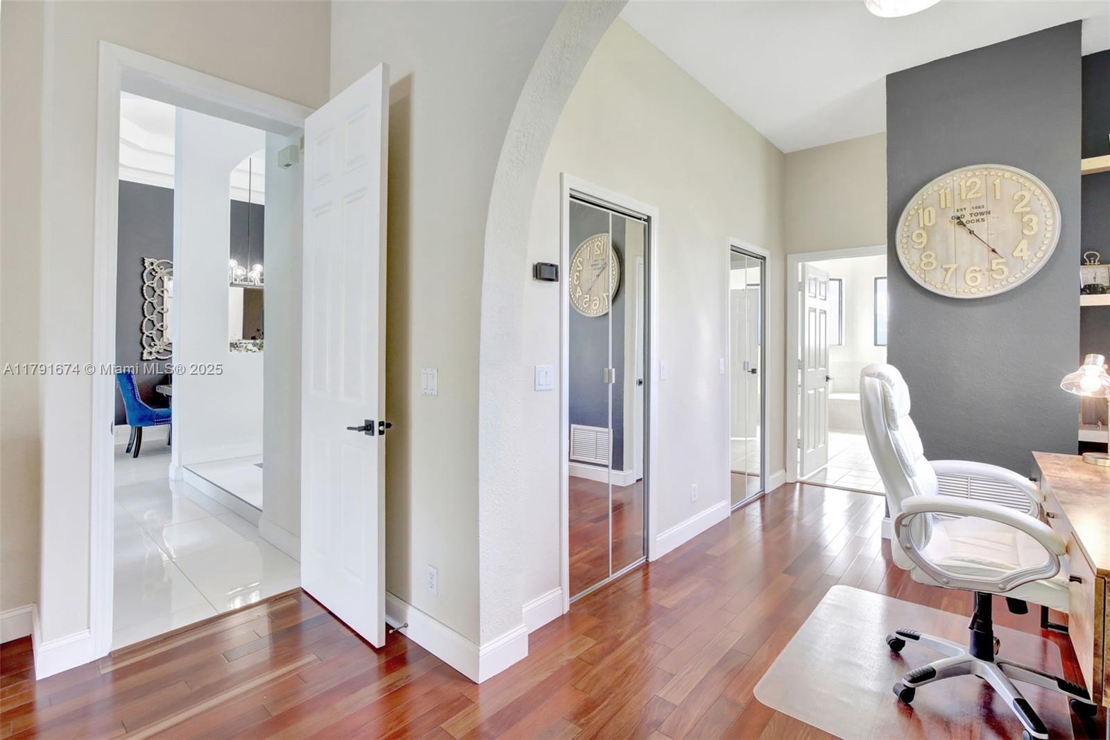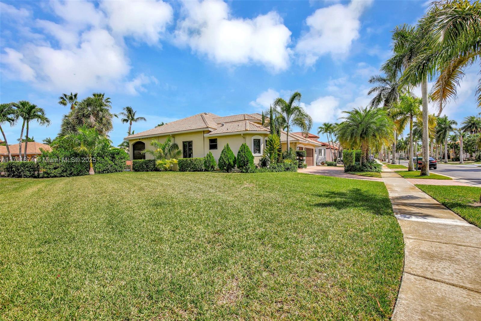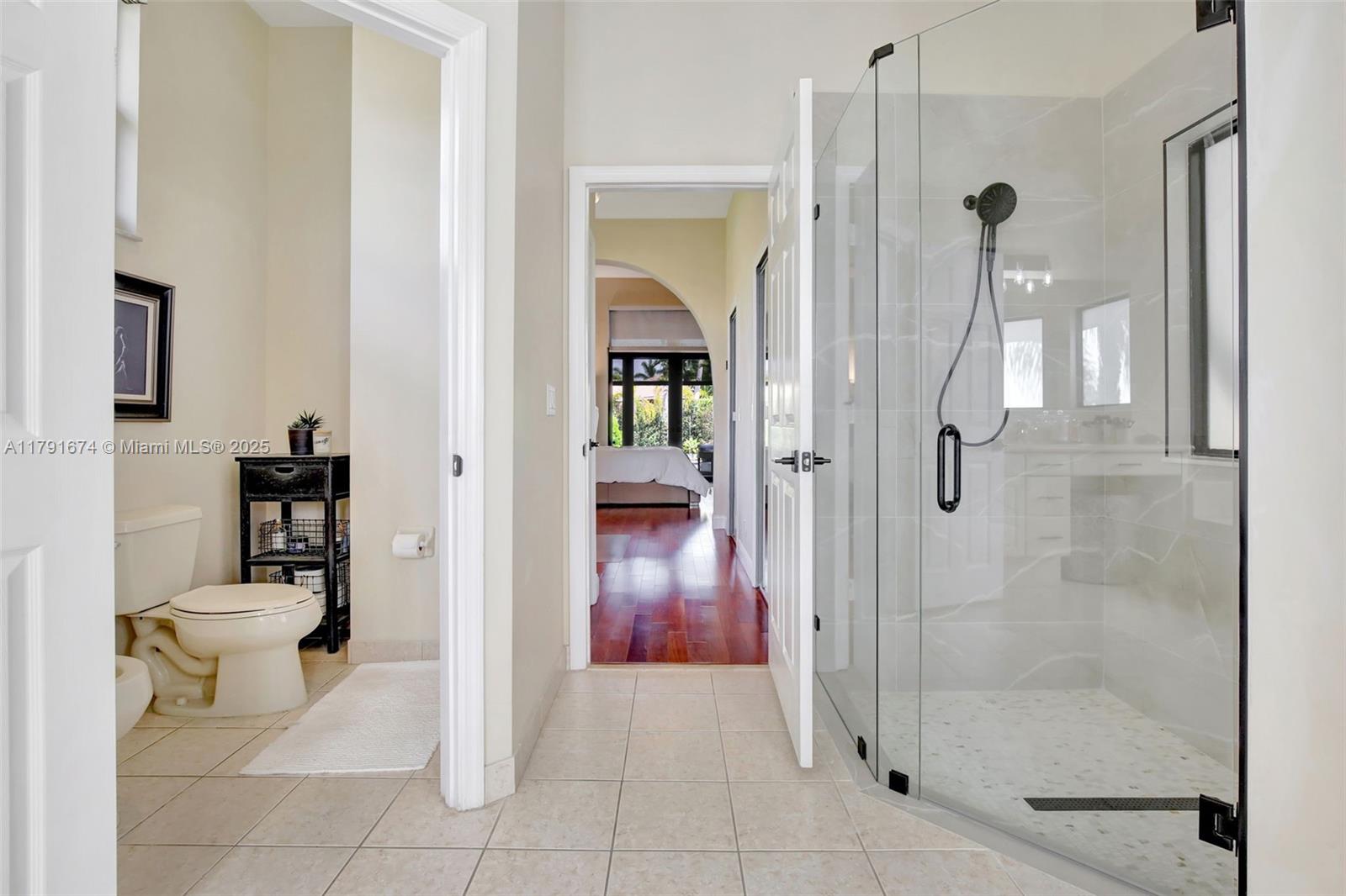 Experience refined living in the exclusive Sunset Lake community. 5/5+loft blends timeless sophistication with a modern edge, featuring dramatic volume ceilings, elegant arched windows, and a seamless indoor-outdoor flow. Enjoy serene afternoons on the expansive covered terrace with motorized screens, overlooking a private resort-style pool framed by lush tropical zen garden. Inside, an open-concept design welcomes abundant natural light through impact glass doors. The chef's kitchen impresses with quartz countertops, wood cabinets, double wall ovens, a wine cooler, barista station with floating shelves, and a peninsula perfect for casual gatherings in the sun-drenched breakfast nook and expansive family room. Primary wing includes sitting area, walk-in closes, and big bathroom. Low HOA.