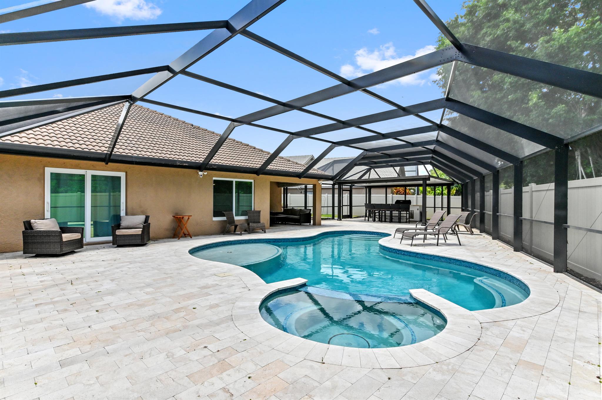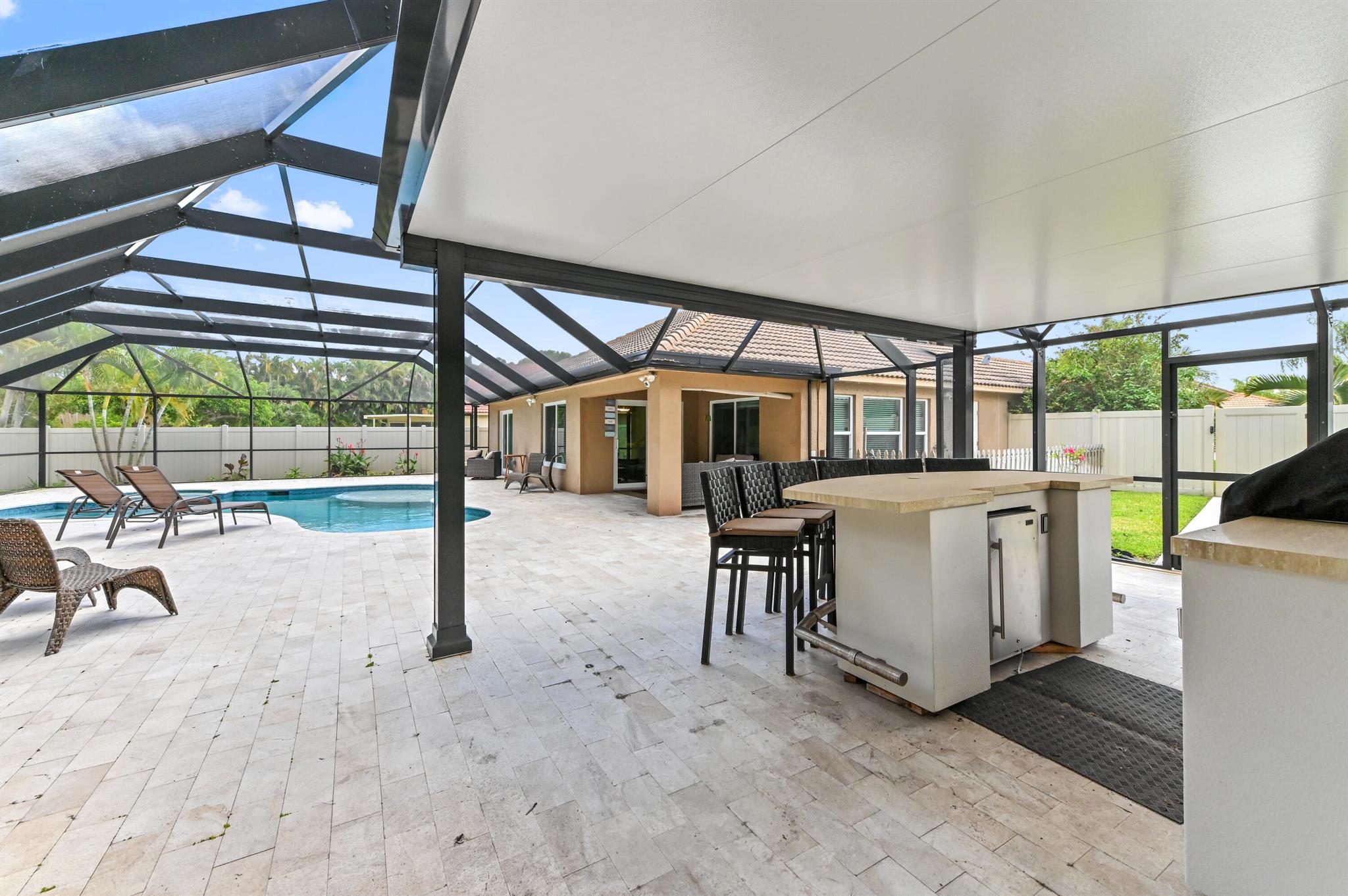 Beautifully maintained home in adorable, community of Sunset Cay...a hidden gem with only 41 homes & an incredibly low HOA. 2Br/2Ba with additional den/flex room that can easily be made into a 3rd bedroom or office space. Seller put in over $200,000 in the backyard creating a true paradise--features include an in-gound, gunite heated pool w/sunshelf & jacuzzi, an outdoor kitchen w/ fridge & built in Bbque, 65ft x 45ft travertine patio & brand new lanai over entire pool & patio creating an entertainer's haven. Entire home is hurricane proof! $20,000 ROOF CREDIT AT CLOSING!! Property backs up to 5 acres of quiet & untouchable land. Perfectly located near PBI, I-95, the Turnpike, many stores & restaurants and just 6 miles from the beach. All measurements are approximate.