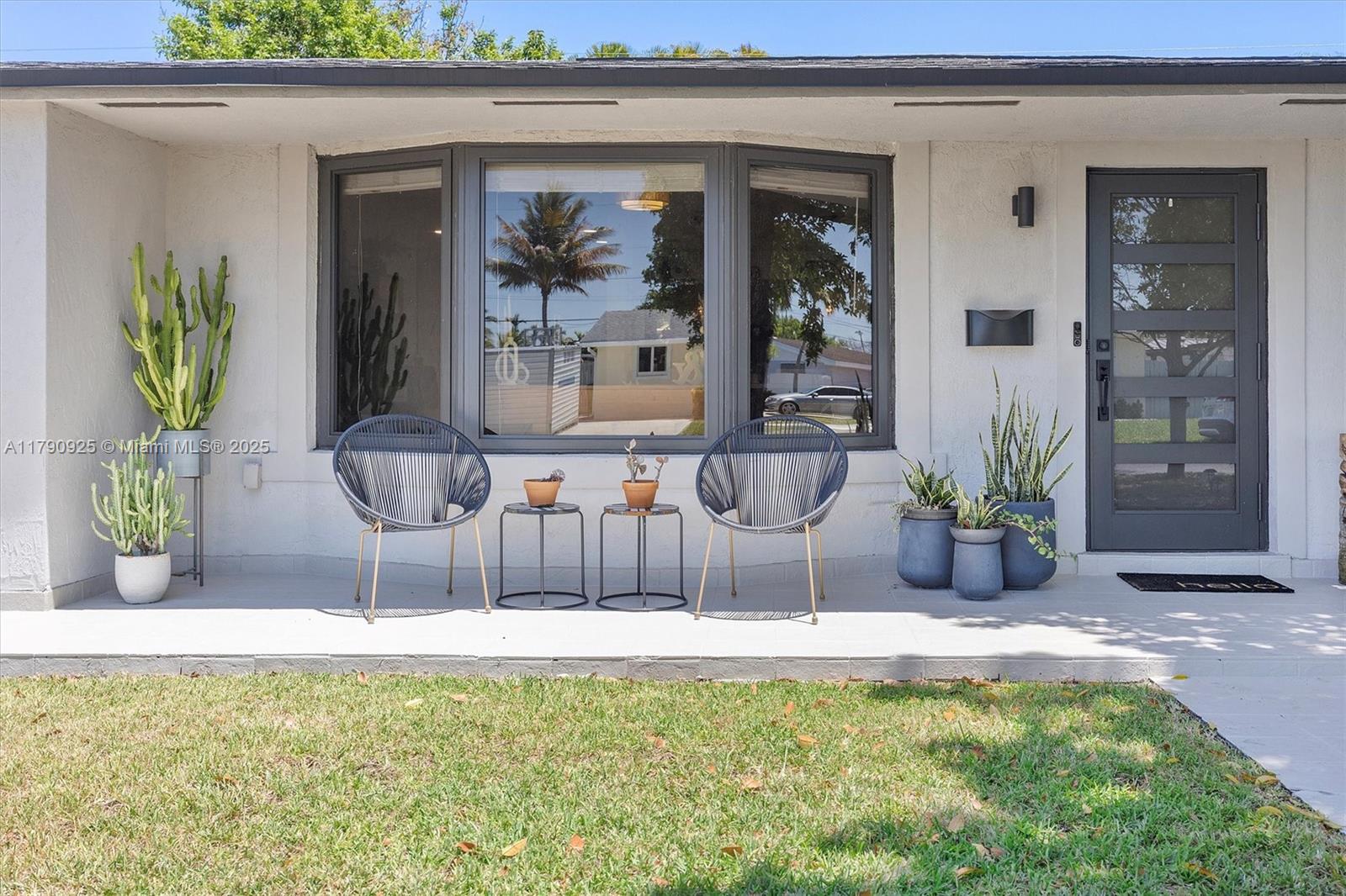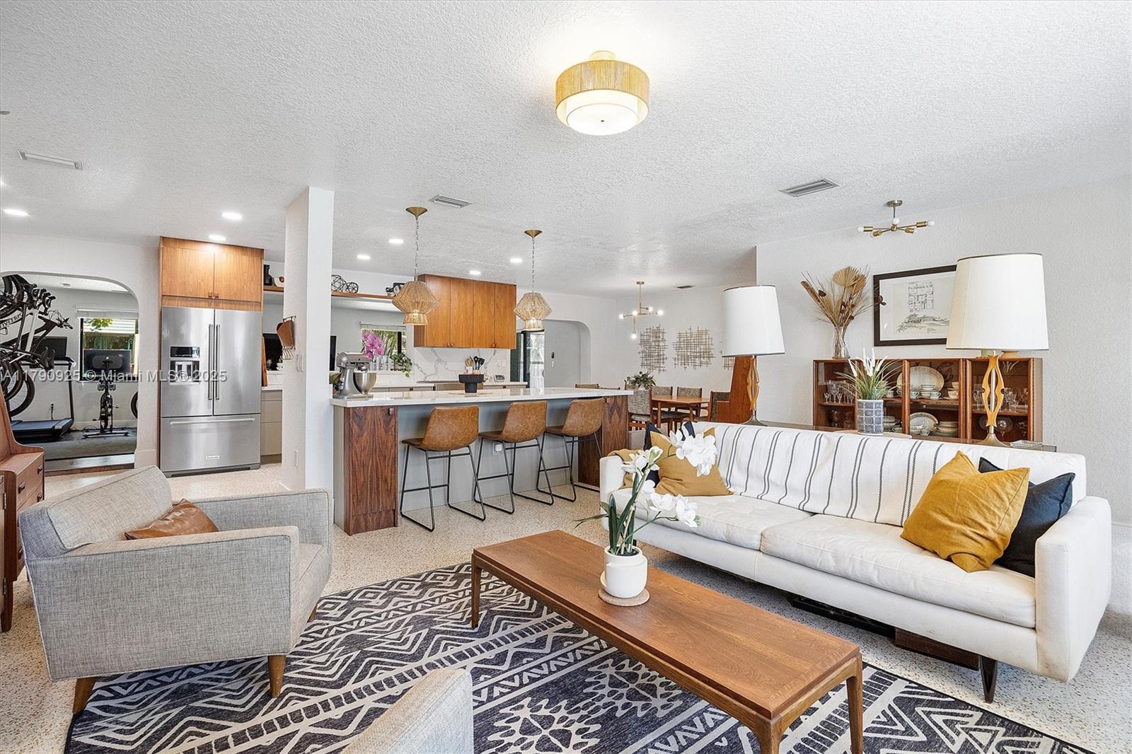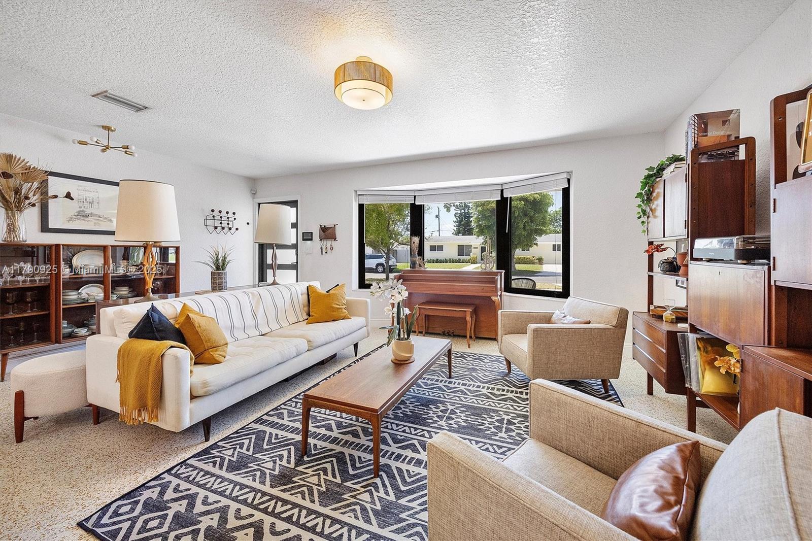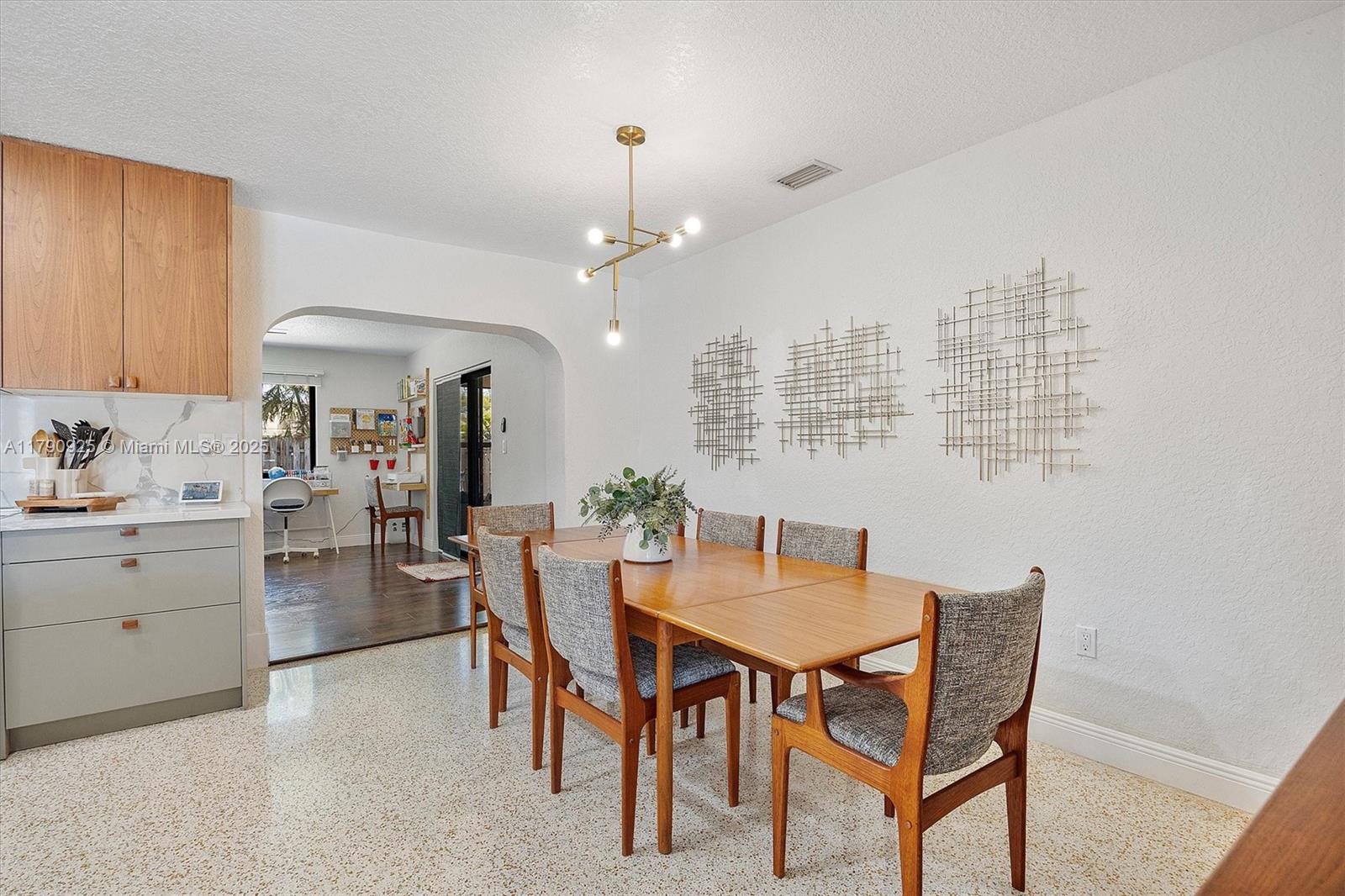 Bright and updated 3 bedroom, 2 bathroom home with a welcoming mid-century modern aesthetic. Restored terrazzo floors flow through the open living spaces and bedrooms. The open kitchen is a standout with walnut cabinets, Quartz countertops and newer Stainless Steel KitchenAid appliances. Bathrooms feature matching walnut vanities and elegant brass fixtures for a cohesive flow. You'll enjoy the screened Florida room—perfect for relaxing or entertaining—overlooking an above-ground pool with room to add an in-ground option. Hurricane impact windows and doors, new A/C, 2018 roof, one-car garage, and a double-wide side gate with space for RV or boat. Stylish and move-in ready!