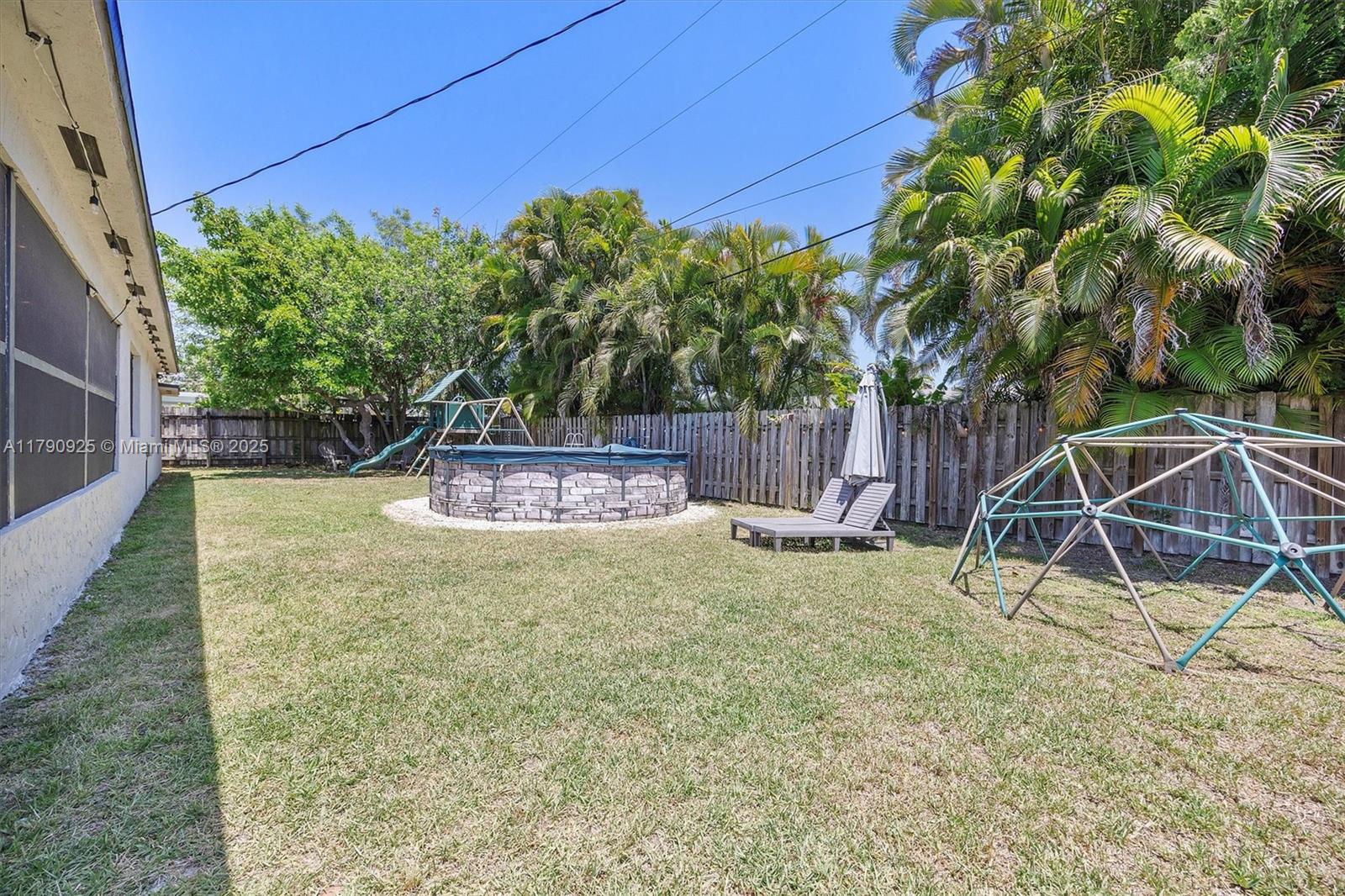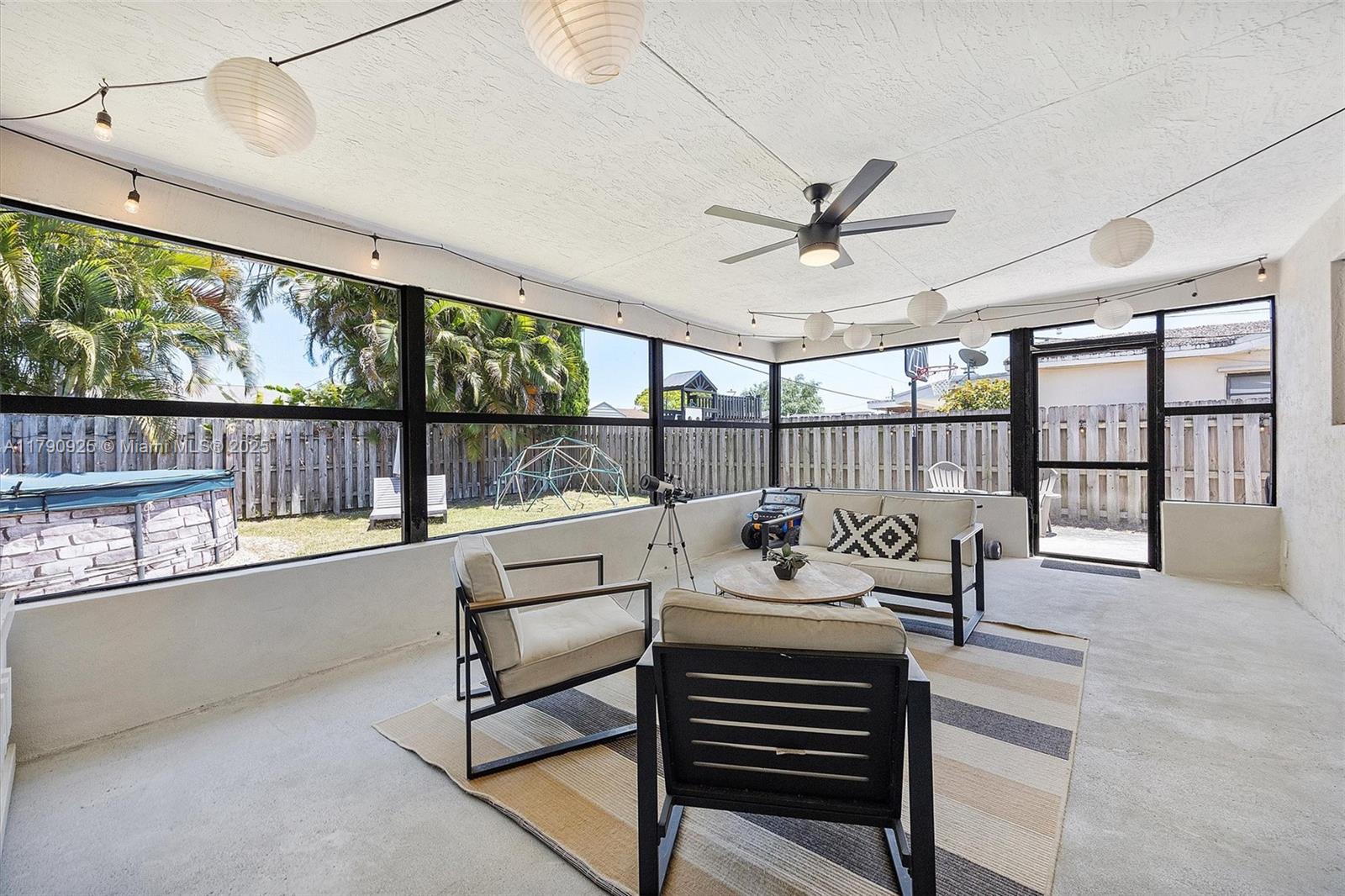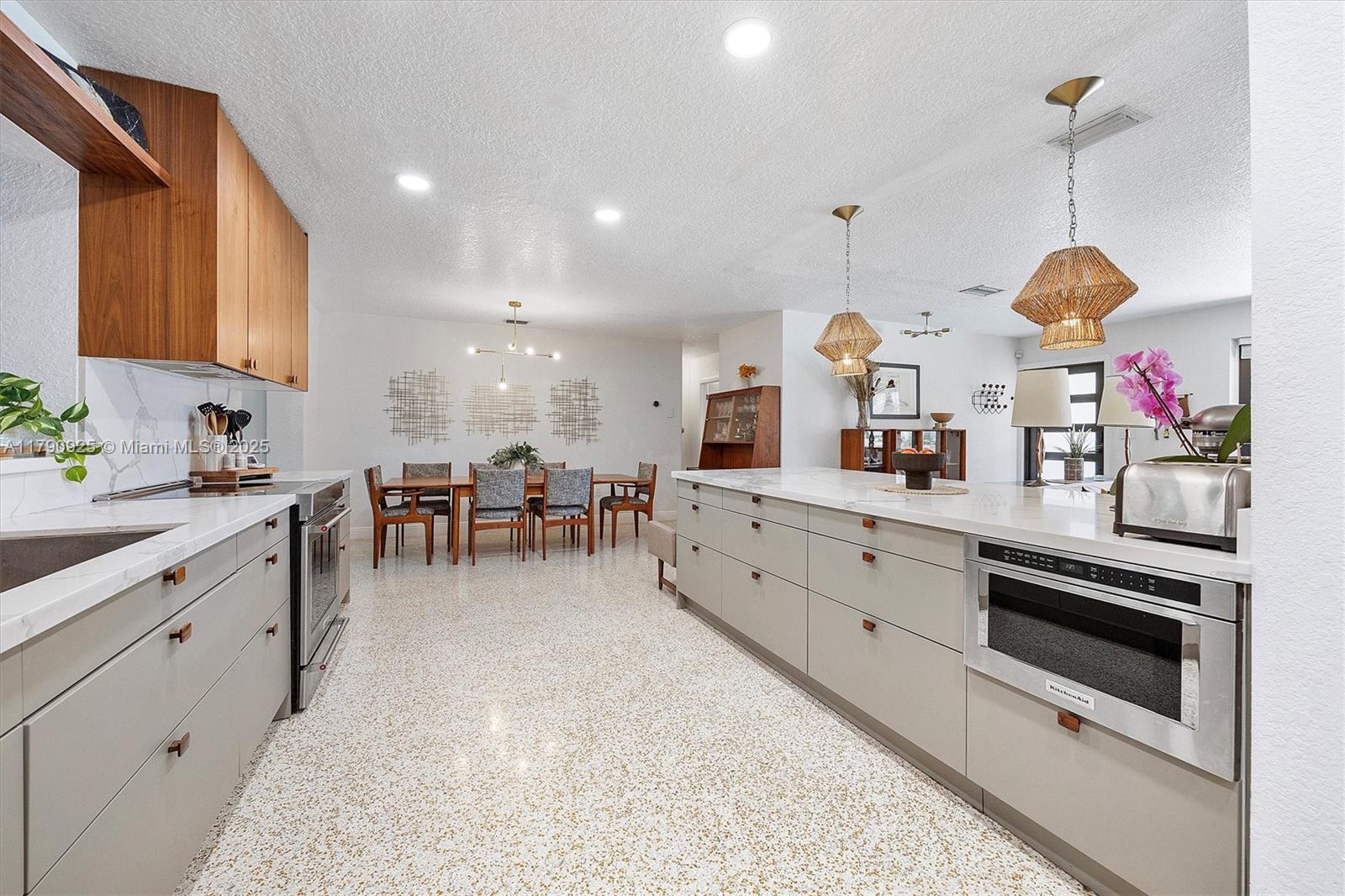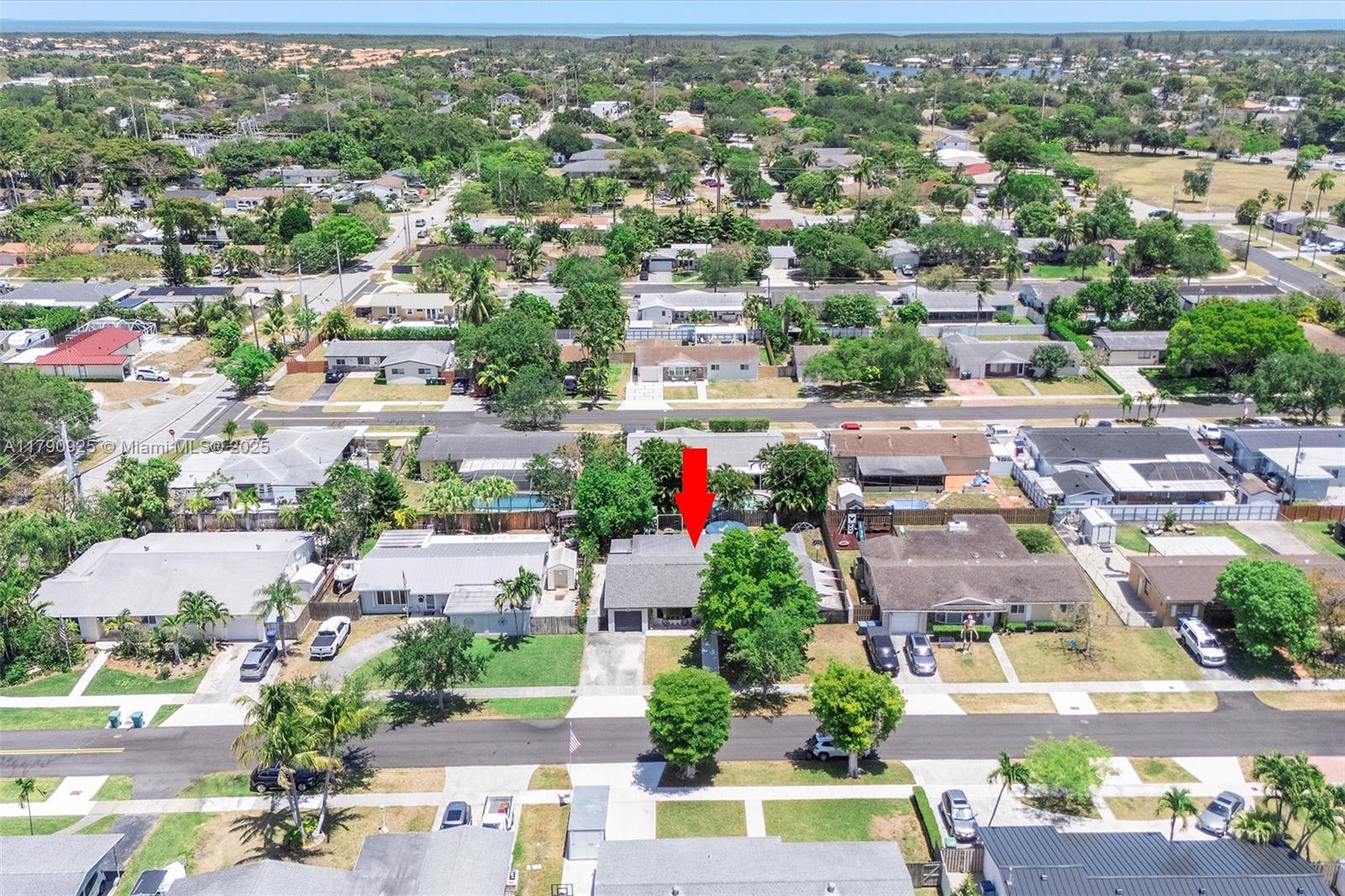 Bright and updated 3 bedroom, 2 bathroom home with a welcoming mid-century modern aesthetic. Restored terrazzo floors flow through the open living spaces and bedrooms. The open kitchen is a standout with walnut cabinets, Quartz countertops and newer Stainless Steel KitchenAid appliances. Bathrooms feature matching walnut vanities and elegant brass fixtures for a cohesive flow. You'll enjoy the screened Florida room—perfect for relaxing or entertaining—overlooking an above-ground pool with room to add an in-ground option. Hurricane impact windows and doors, new A/C, 2018 roof, one-car garage, and a double-wide side gate with space for RV or boat. Stylish and move-in ready!