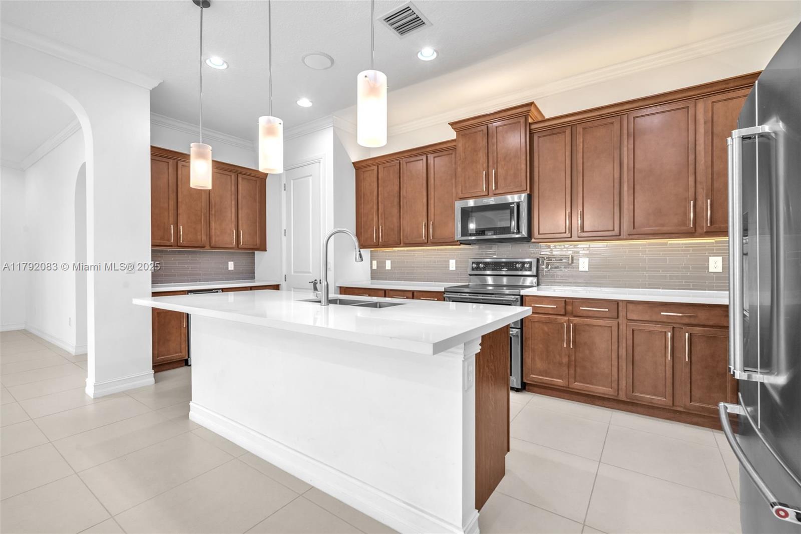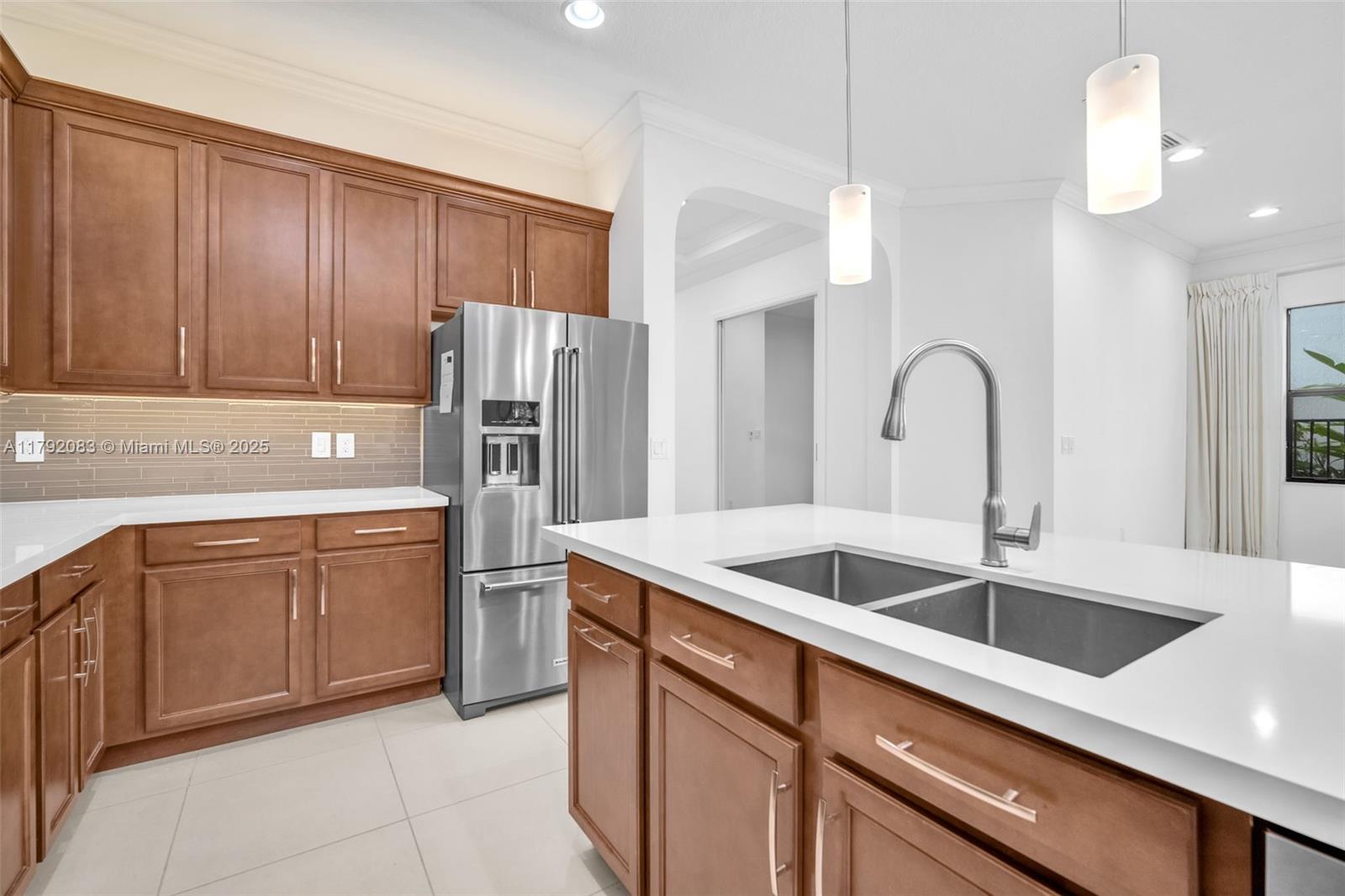 Stunning, 2016 modern single floor 3/2.5 home with lovely finishes & lots of fine details. Kitchen has white quartz counters, wine cooler, cooking faucet, pull out cabinets, customized pantry & Kitchen Aid appliances. Large master sports electronic shades, glass enclosed rain shower, soak tub, dual customized closets & relaxing view of the water. Great area is spacious, with modern ceiling light fixtures, classic window treatments & great water view. Every area is beautifully appointed. Even the laundry room is special with solid counters, custom closets & wash tub. Back yard is nicely hedged for privacy with clear view of canal. Tiled & closeted 2 car garage +2 driveway spaces! This marvelous home even has a water filter! Well located and in great community. Near I75, shops & services.