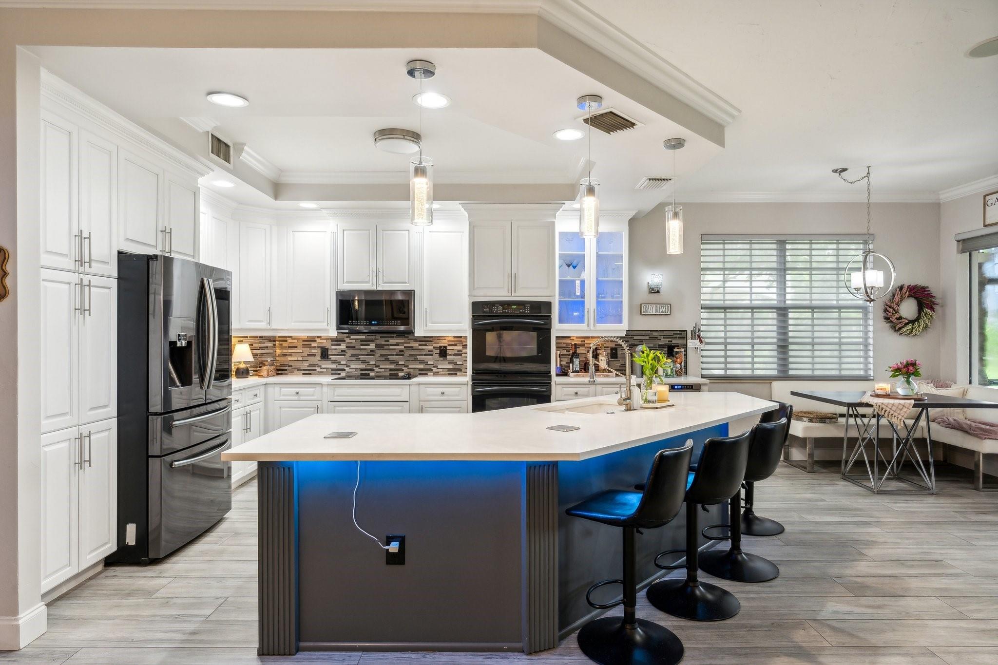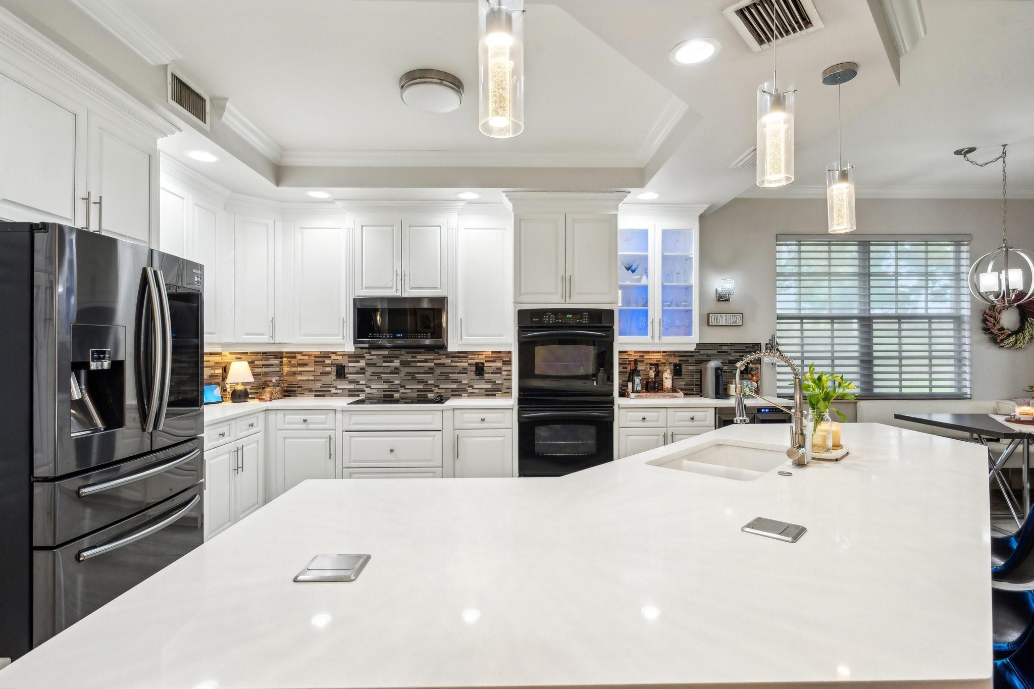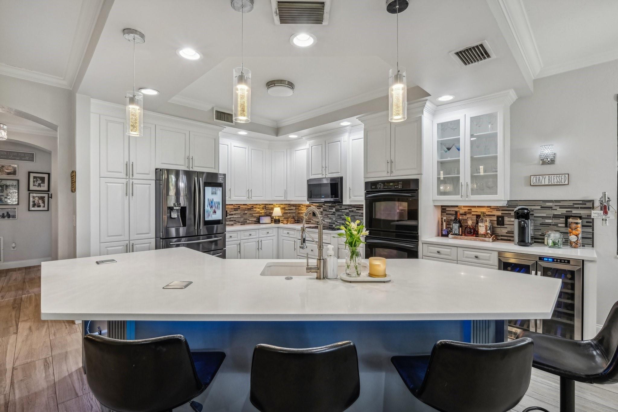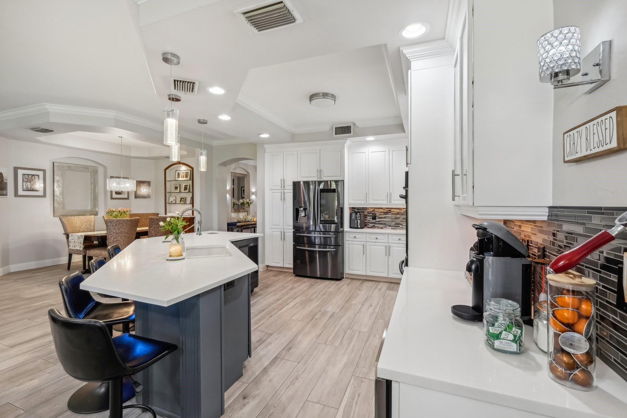 Welcome to your beautifully remodeled, one-level townhome! This turnkey home seamlessly blends luxury and comfort. New 2025 Roof, Impact windows, modern kitchen featuring top-of-the-line appliances, wine fridge, quartz countertops, double oven, smart-fridge, ample cabinet space, open & spacious floor plan, The primary bedroom boasting a generous walk-in closet and a en-suite bathroom. Enjoy the lanai soaking in the tranquil surroundings. The additional bedrooms are perfect for family, guests, or a home office. The community offers top amenities & remolded in 2024, including golf cousrse, fitness center, sauna, pool, tennis courts, pickle ball, bar & restaurant. Quarterly HOA Covers, Insurance, Roof, Lawn Care, Pool, & Maintenance. Home is Gated with 24 hour Security.