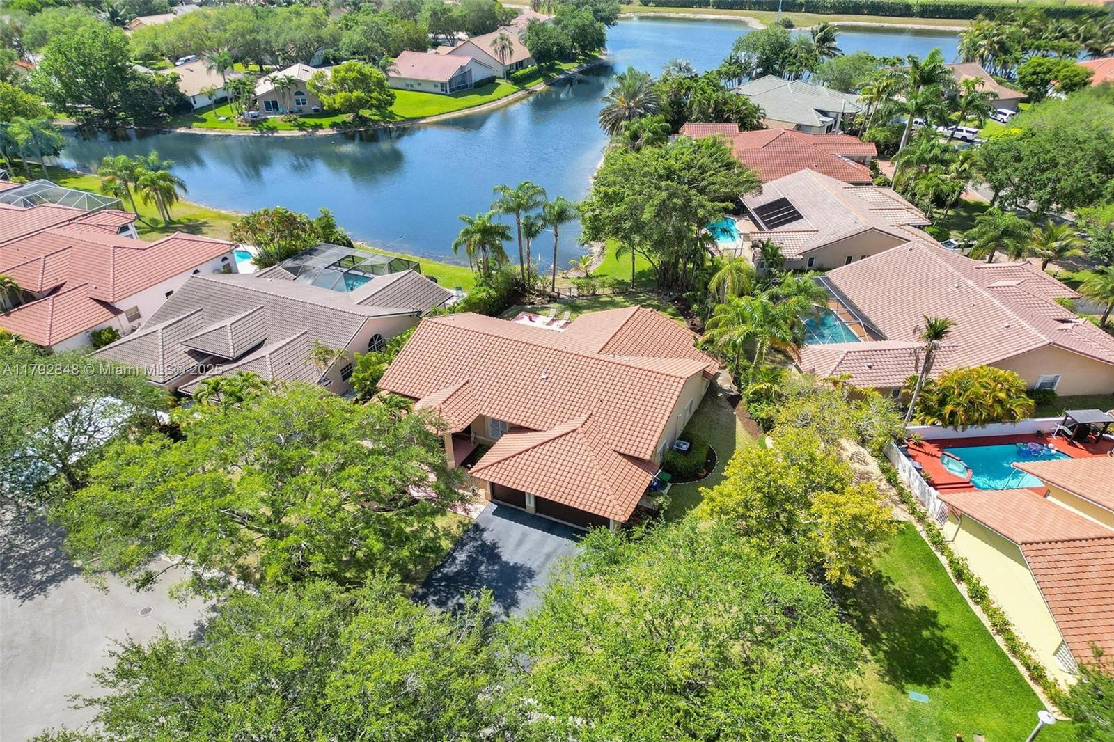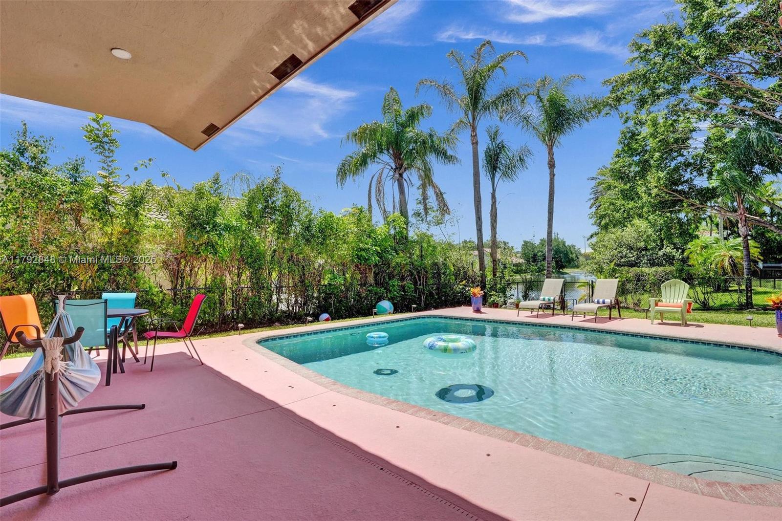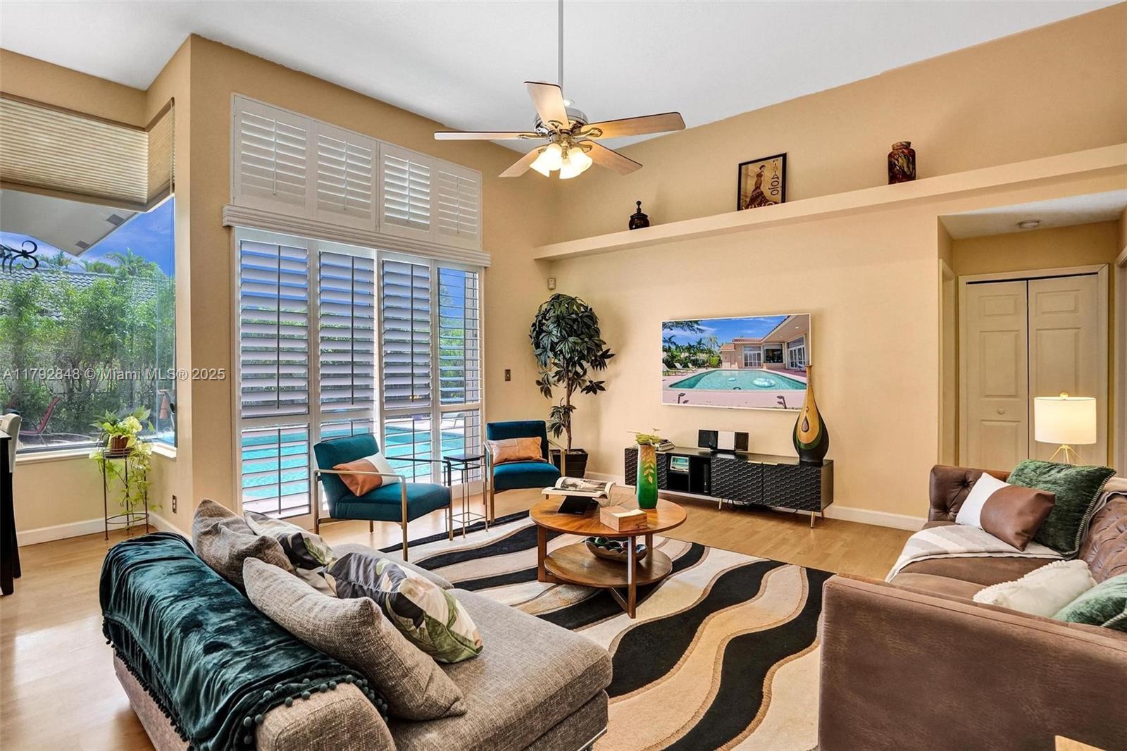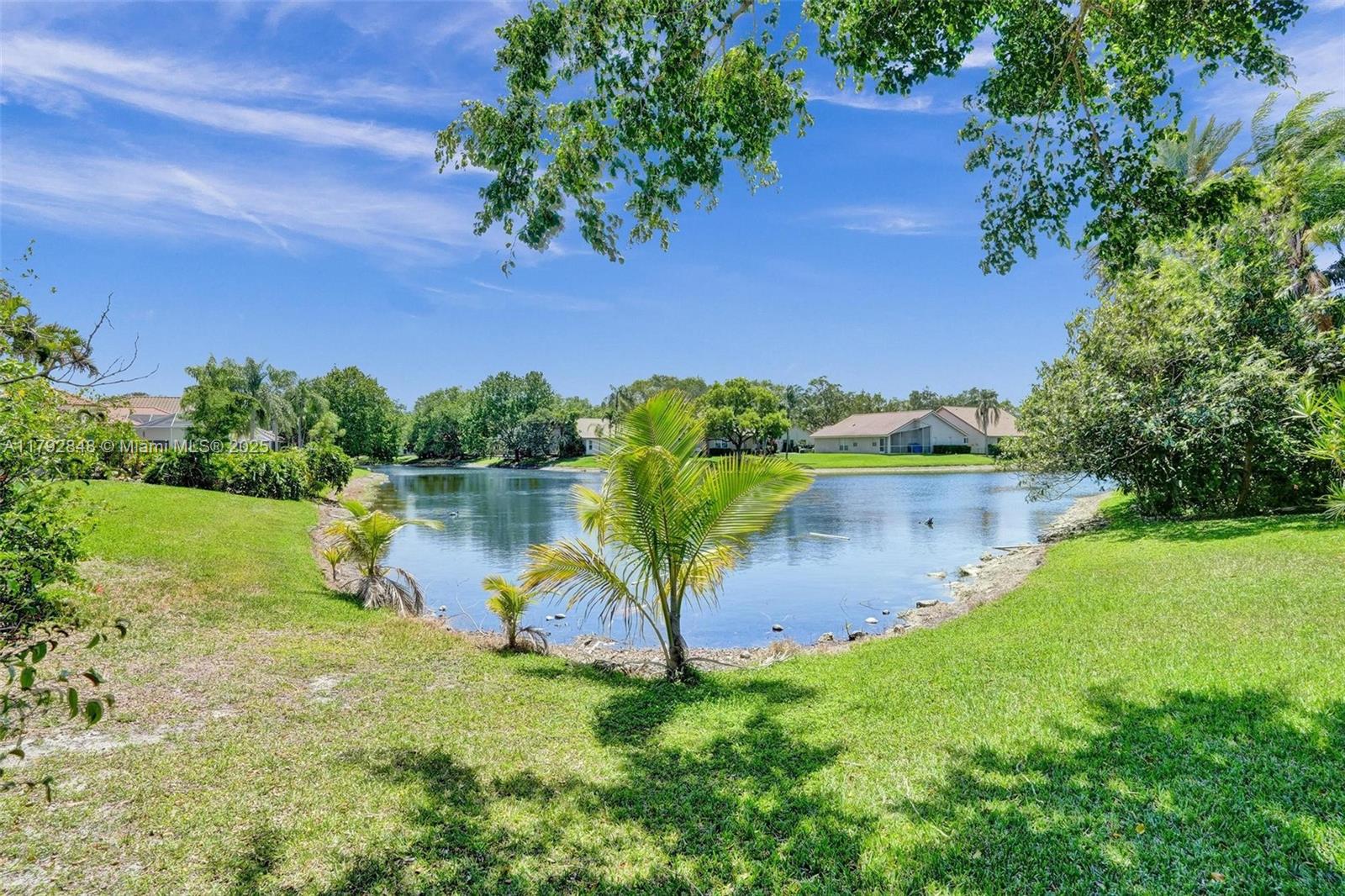 Nestled in an intimate section of Brookside on a pie-shaped homesite with beautiful curb appeal! This 4BD/3BA, 3-car garage home offers a perfect flow with soaring volume ceilings, vinyl plank floors, versatile formal dining room with outside hurricane & inside plantation shutters. Grand double-door entry opens to spacious living areas separated by a wet bar with storage, while butted glass windows frame tranquil water views. The custom kitchen features Quartz counters, beautiful cabinets & tiled backsplash. Oversized bedrooms in a triple-split layout with cabana bath. Spacious laundry w/ tub. The owner’s retreat boasts floor-to-ceiling windows, dual walk-ins with built-ins, Roman tub & dual vanities. Freshly painted pool deck and fenced yard with lake views complete the picture!