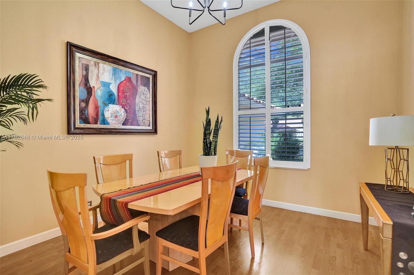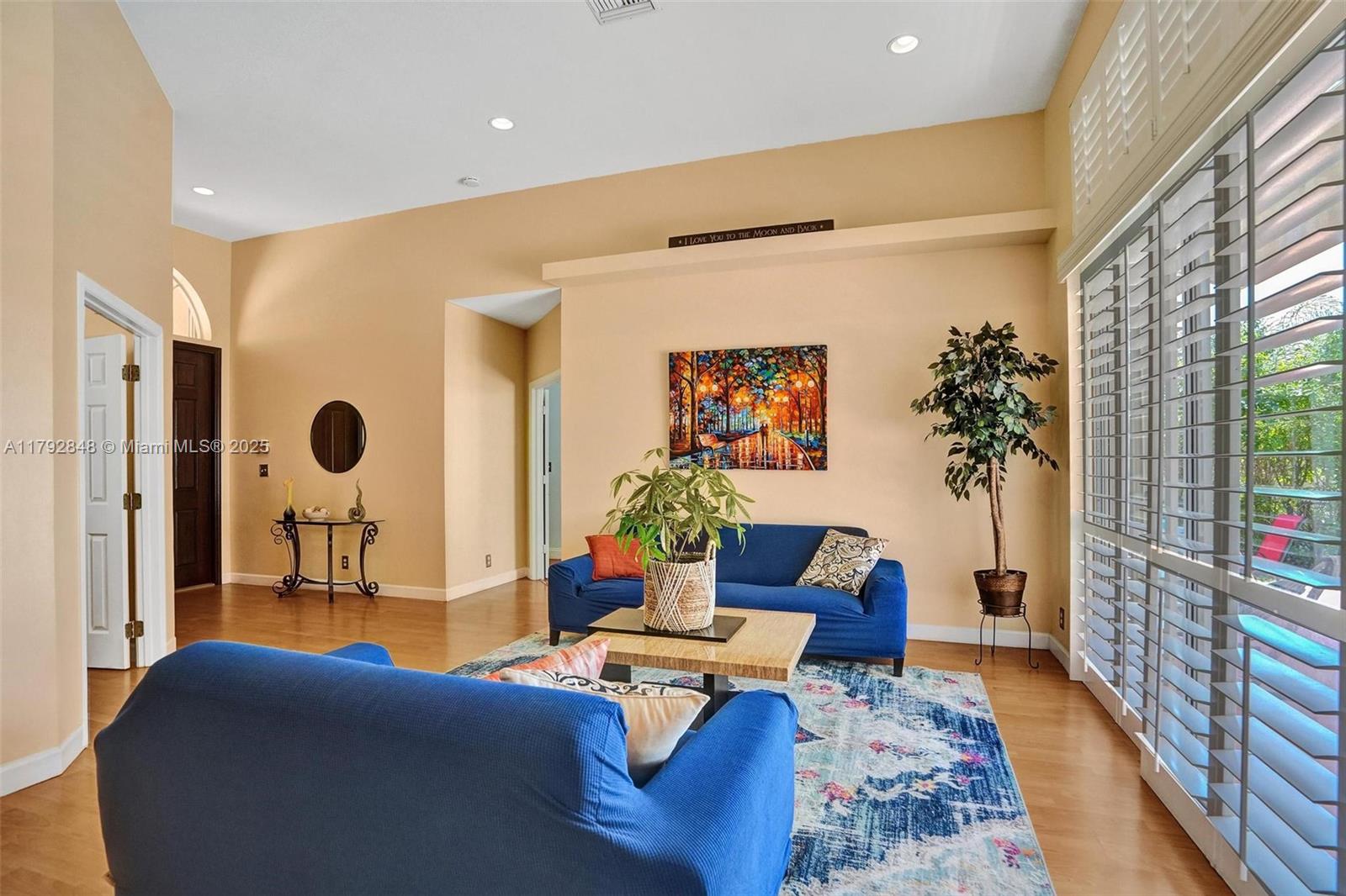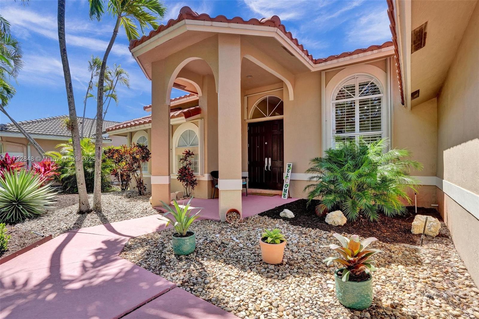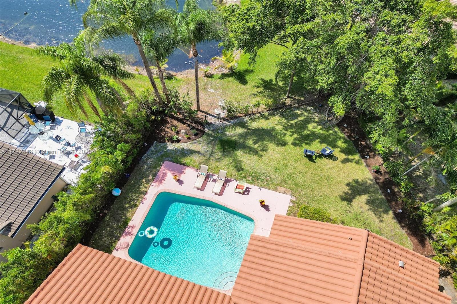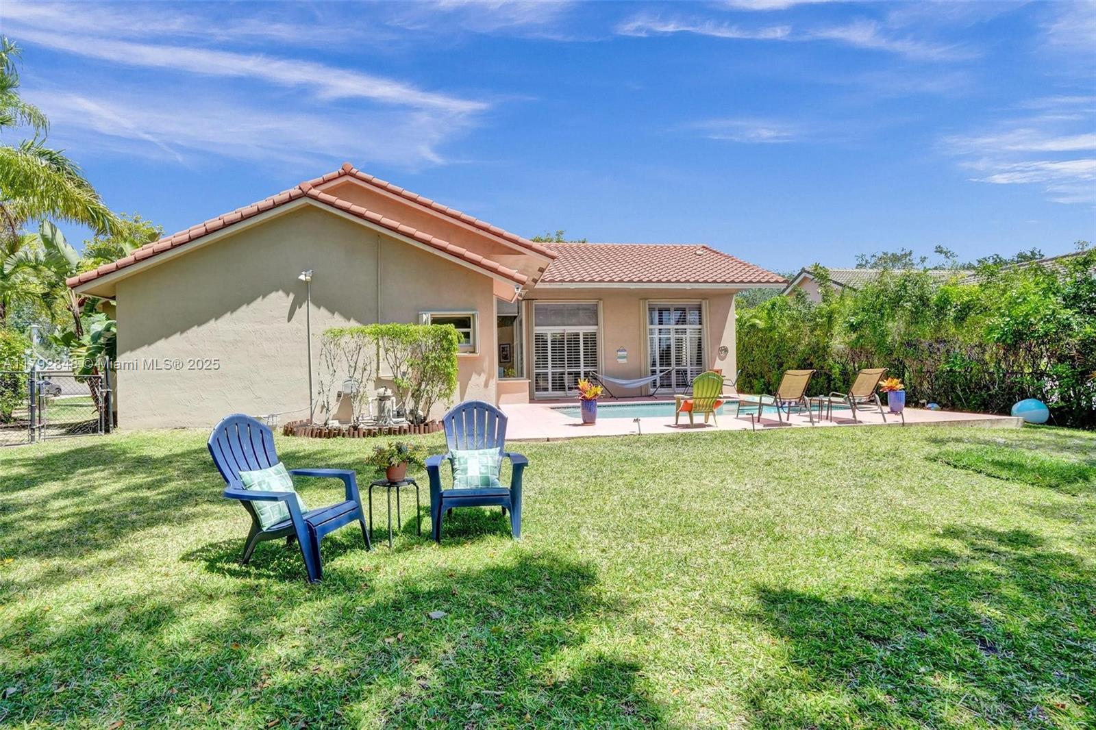 Nestled in an intimate section of Brookside on a pie-shaped homesite with beautiful curb appeal! This 4BD/3BA, 3-car garage home offers a perfect flow with soaring volume ceilings, vinyl plank floors, versatile formal dining room with outside hurricane & inside plantation shutters. Grand double-door entry opens to spacious living areas separated by a wet bar with storage, while butted glass windows frame tranquil water views. The custom kitchen features Quartz counters, beautiful cabinets & tiled backsplash. Oversized bedrooms in a triple-split layout with cabana bath. Spacious laundry w/ tub. The owner’s retreat boasts floor-to-ceiling windows, dual walk-ins with built-ins, Roman tub & dual vanities. Freshly painted pool deck and fenced yard with lake views complete the picture!