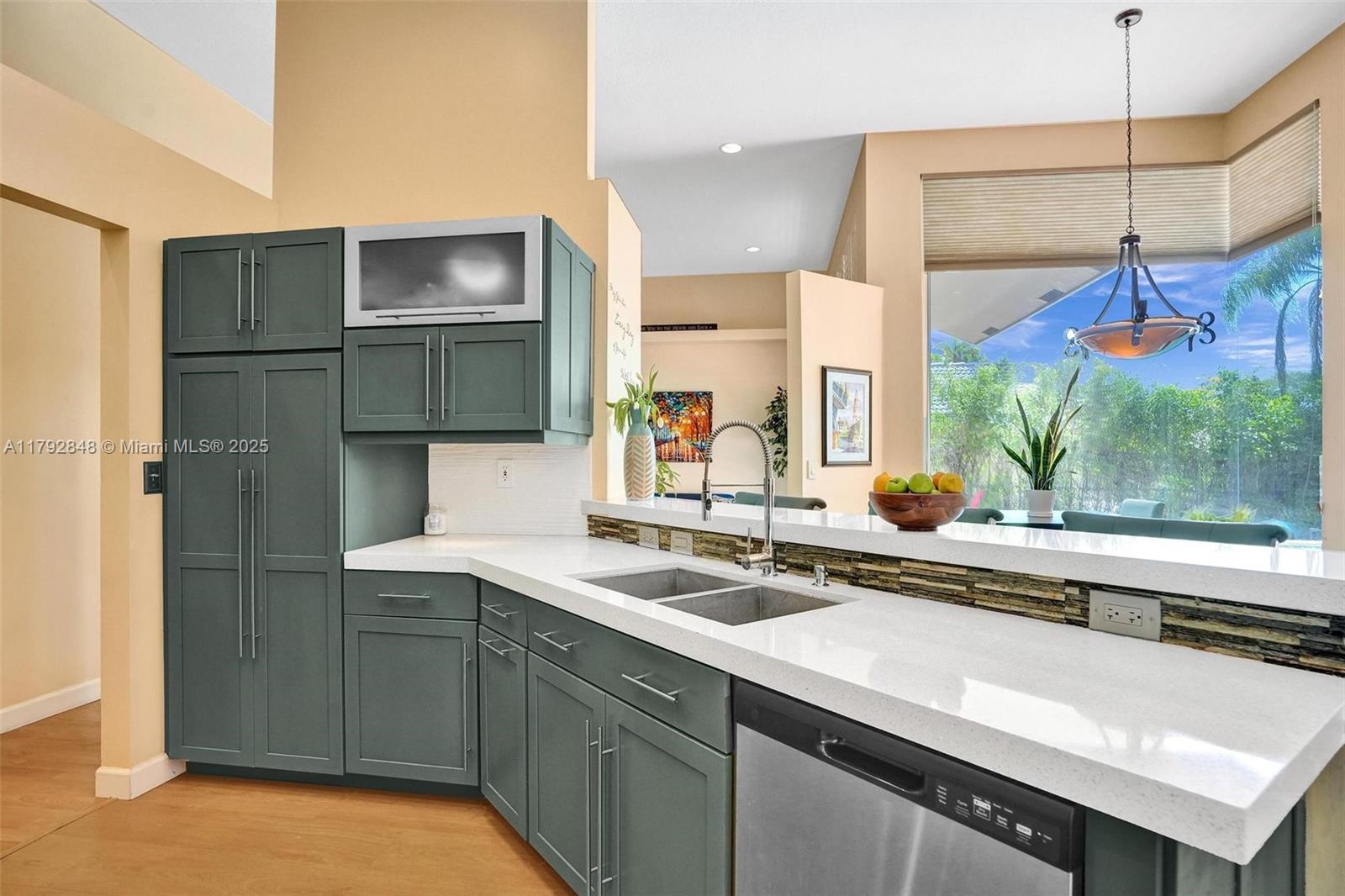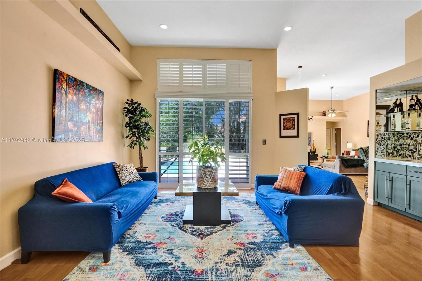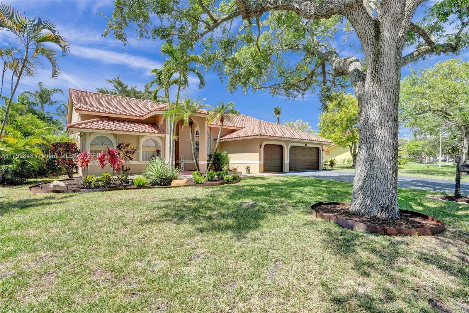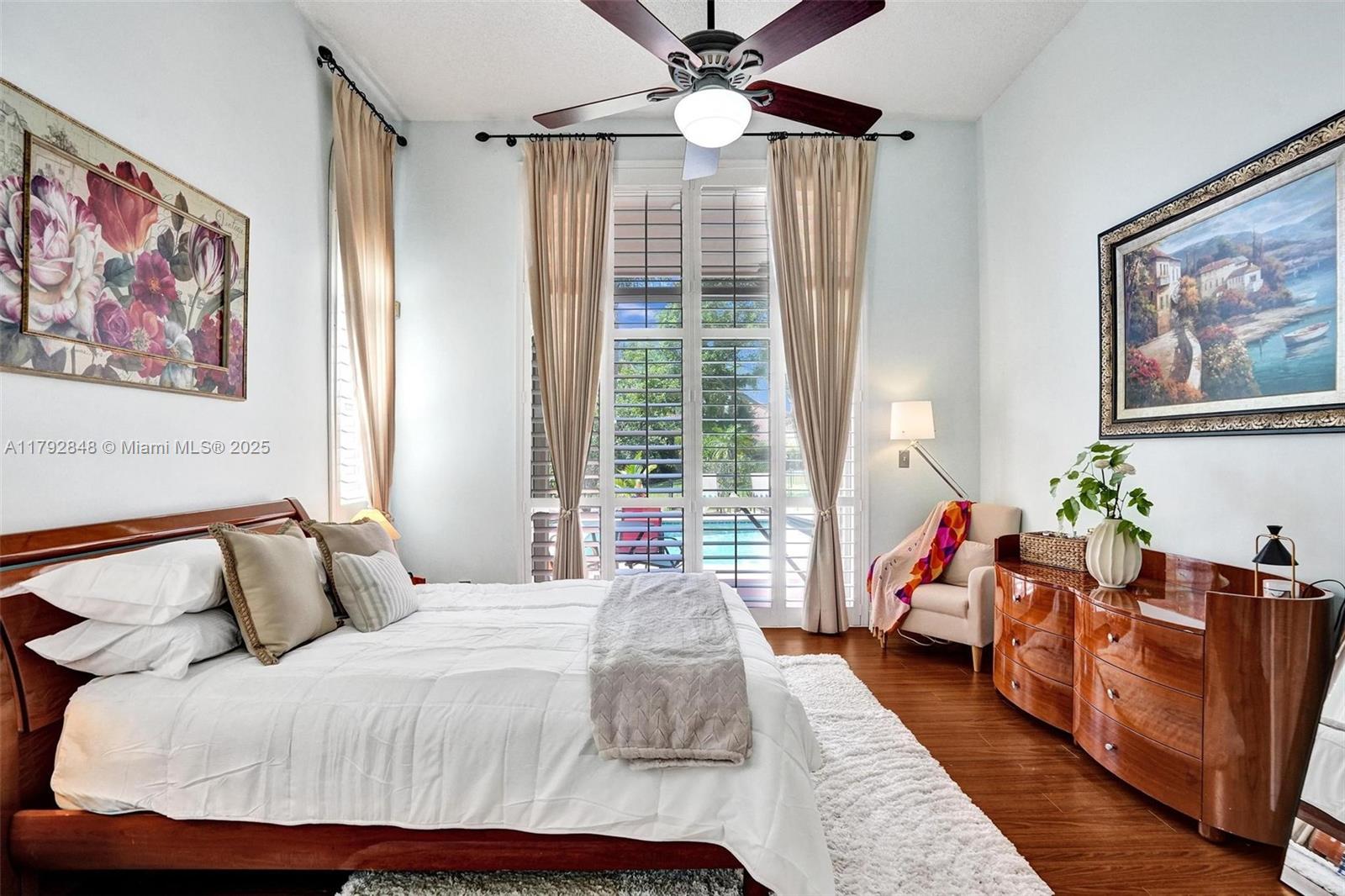 Nestled in an intimate section of Brookside on a pie-shaped homesite with beautiful curb appeal! This 4BD/3BA, 3-car garage home offers a perfect flow with soaring volume ceilings, vinyl plank floors, versatile formal dining room with outside hurricane & inside plantation shutters. Grand double-door entry opens to spacious living areas separated by a wet bar with storage, while butted glass windows frame tranquil water views. The custom kitchen features Quartz counters, beautiful cabinets & tiled backsplash. Oversized bedrooms in a triple-split layout with cabana bath. Spacious laundry w/ tub. The owner’s retreat boasts floor-to-ceiling windows, dual walk-ins with built-ins, Roman tub & dual vanities. Freshly painted pool deck and fenced yard with lake views complete the picture!