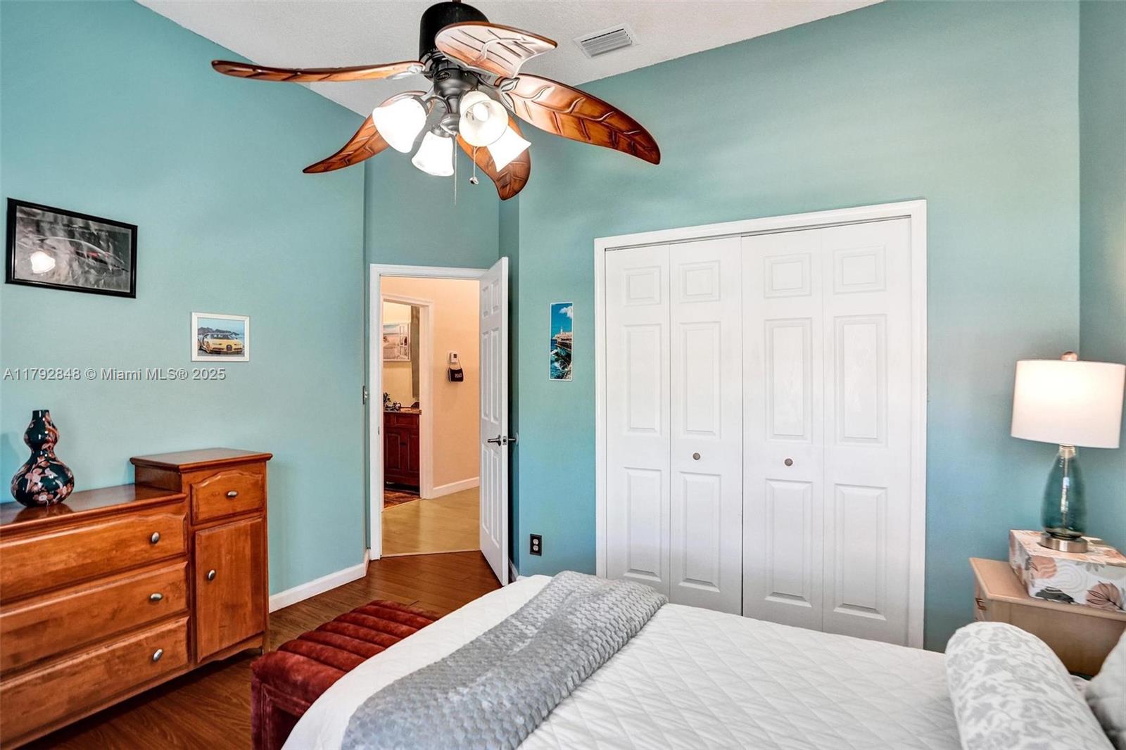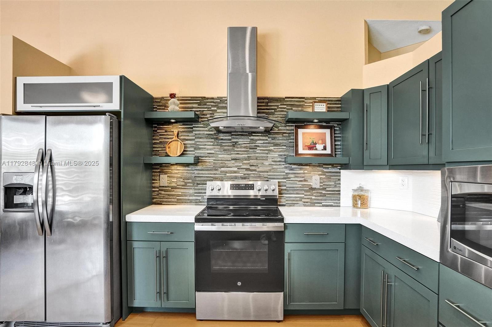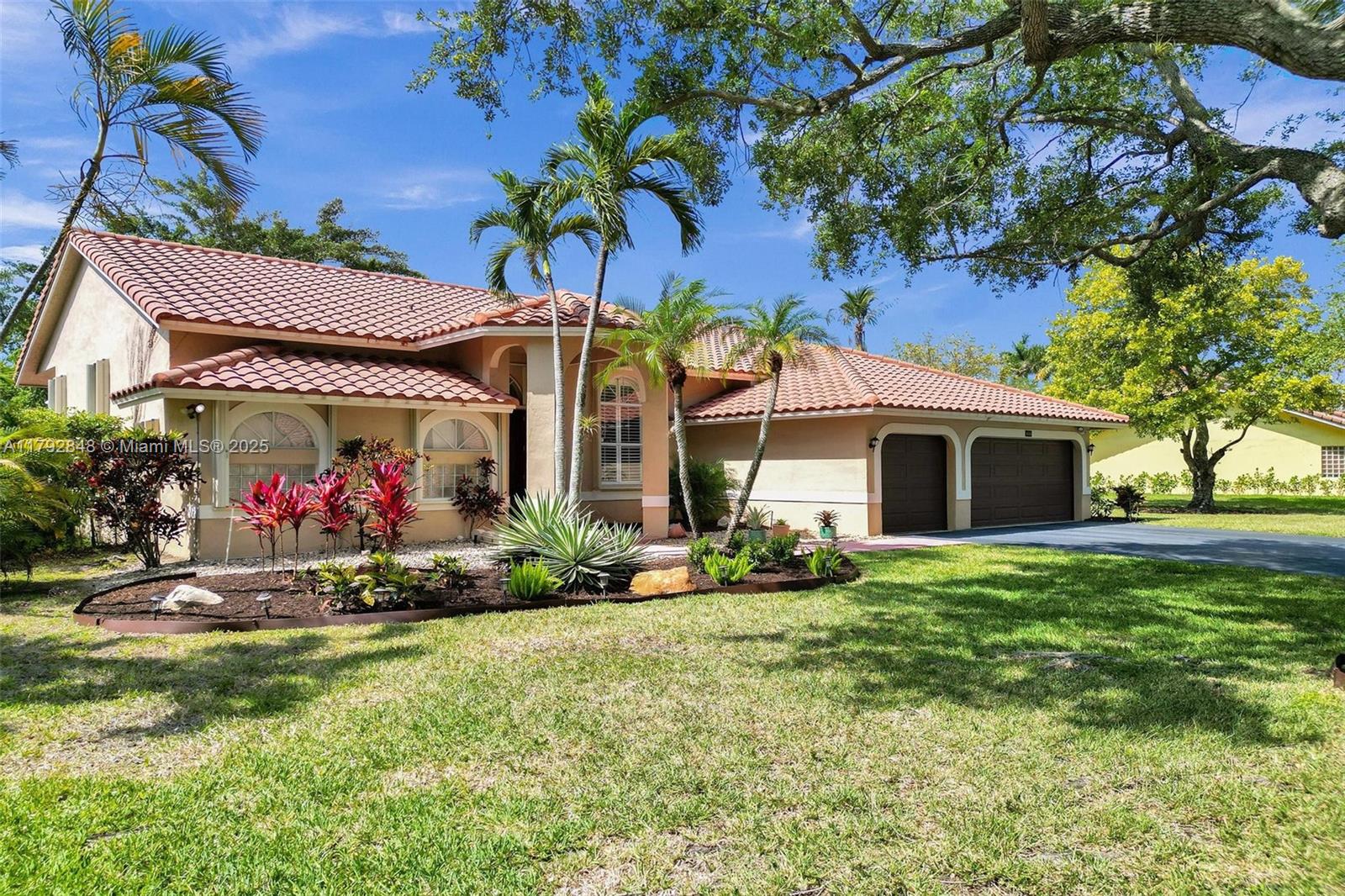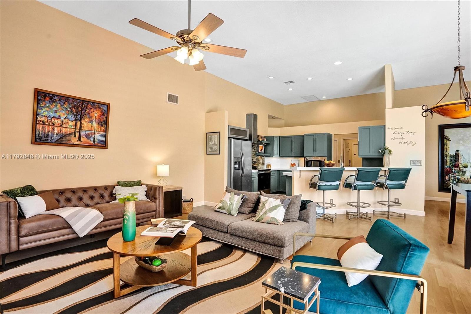 Nestled in an intimate section of Brookside on a pie-shaped homesite with beautiful curb appeal! This 4BD/3BA, 3-car garage home offers a perfect flow with soaring volume ceilings, vinyl plank floors, versatile formal dining room with outside hurricane & inside plantation shutters. Grand double-door entry opens to spacious living areas separated by a wet bar with storage, while butted glass windows frame tranquil water views. The custom kitchen features Quartz counters, beautiful cabinets & tiled backsplash. Oversized bedrooms in a triple-split layout with cabana bath. Spacious laundry w/ tub. The owner’s retreat boasts floor-to-ceiling windows, dual walk-ins with built-ins, Roman tub & dual vanities. Freshly painted pool deck and fenced yard with lake views complete the picture!