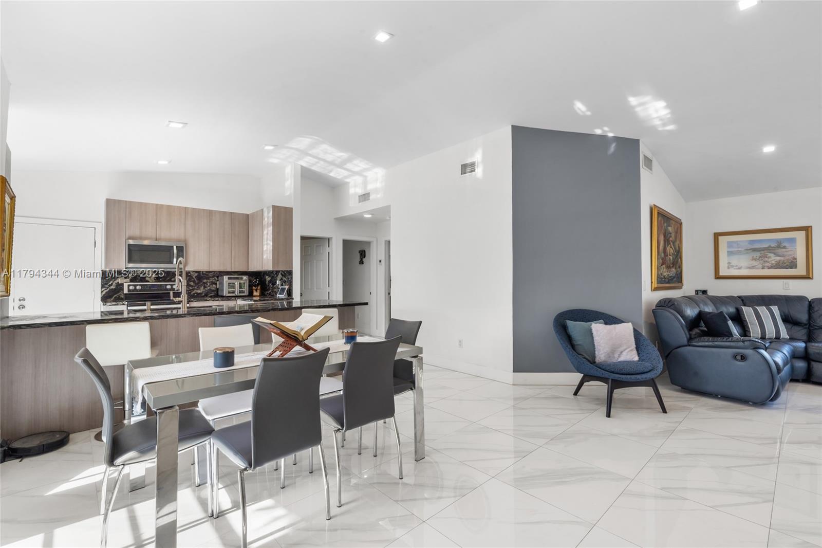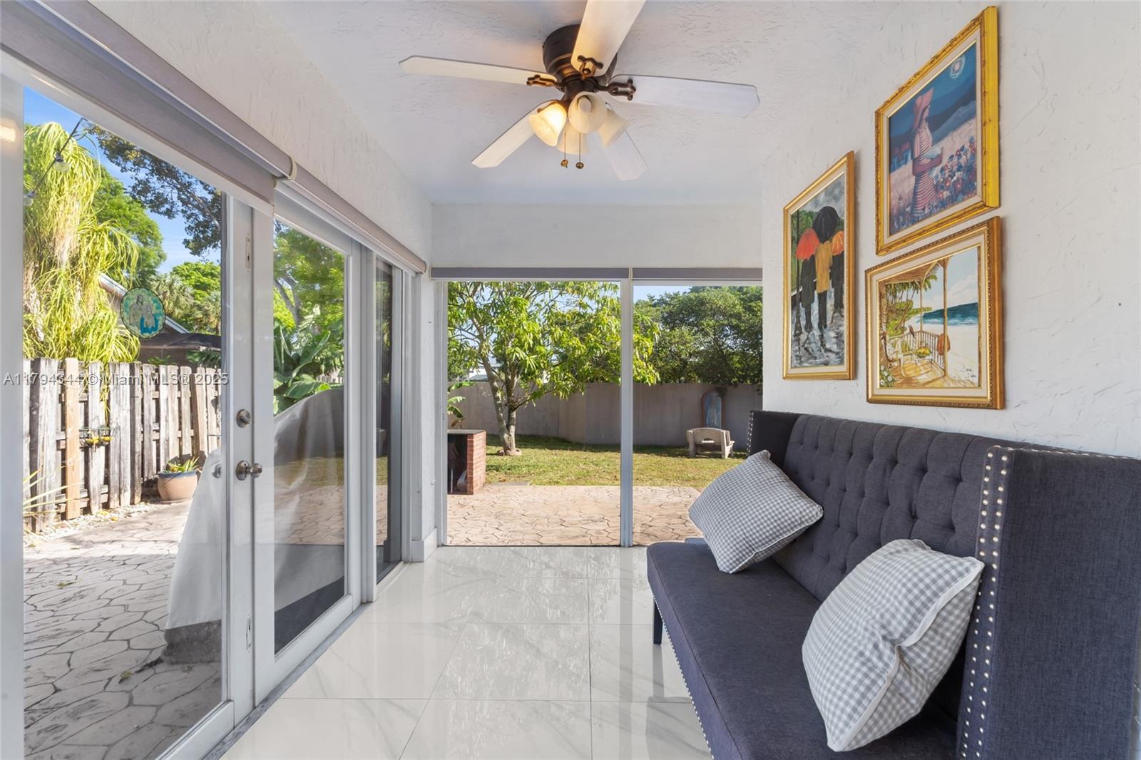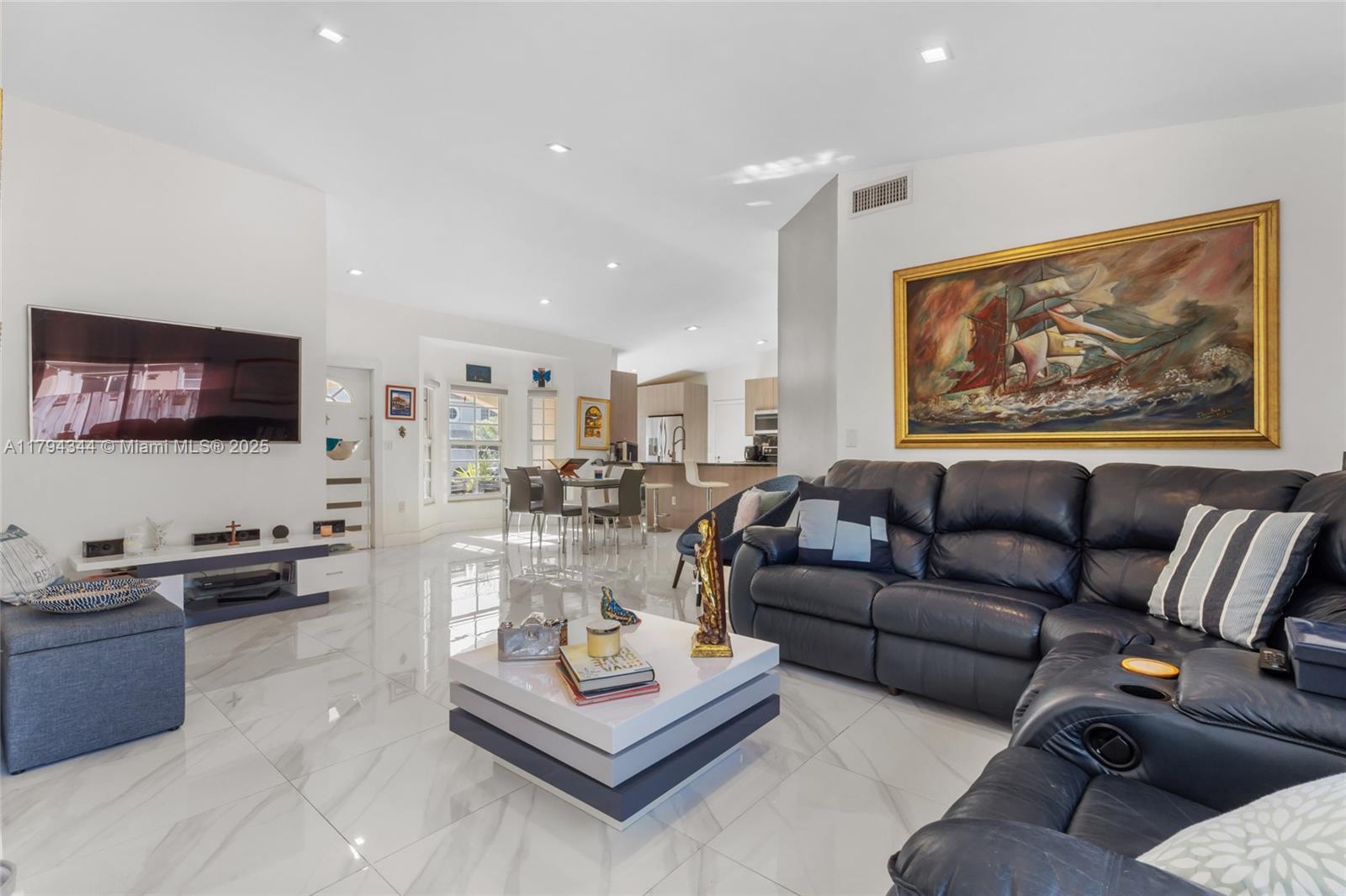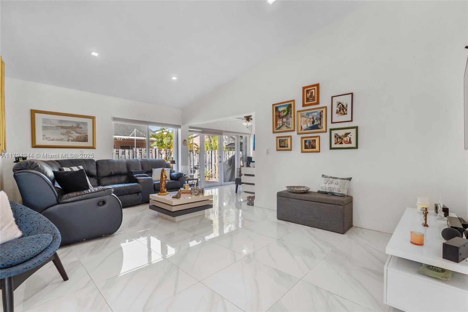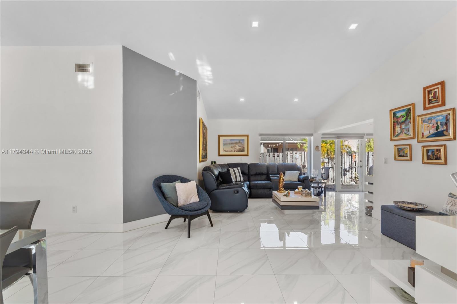 This beautifully remodeled 3-bed, 2-bath residence offers a perfect blend of modern comfort and stylish design. Completely renovated in 2020, the home features a spacious open-floor concept, vaulted ceiling, and a converted garage with an additional bedroom and reach-in closet. The home also features impact windows throughout, a a spacious sunroom, new modern kitchen, new roof and gutters, porcelin tile floors throughout, and a tankless water heater. Step outside to a large backyard perfect for entertaining, complete with an outdoor kitchen for BBQs and gatherings. Located in a gated community with 24-hour security, residents also enjoy fantastic amenities including a pool and kiddie playground. This home combines comfort, security, and outdoor living in a sought-after Doral neighborhood.
