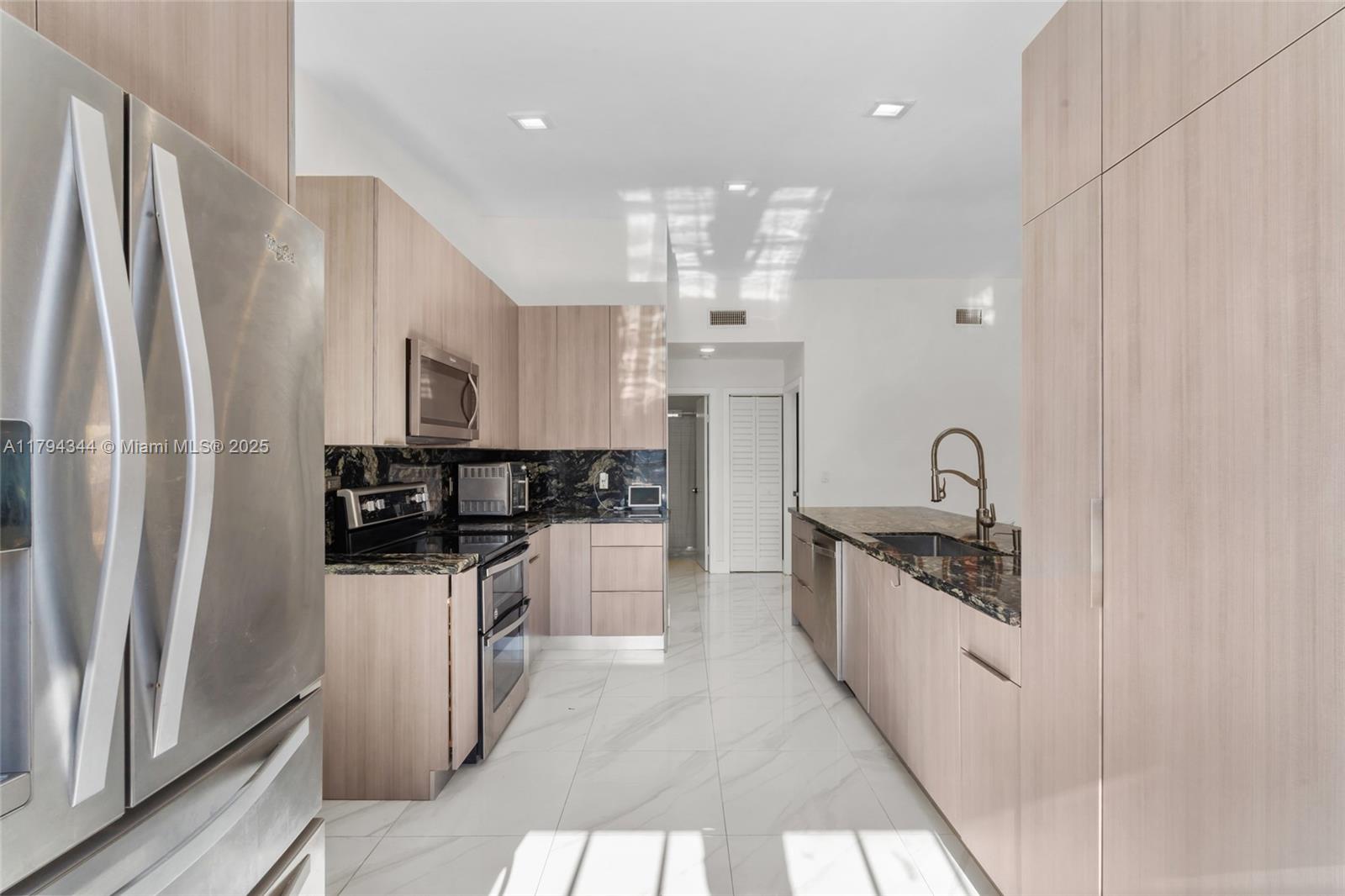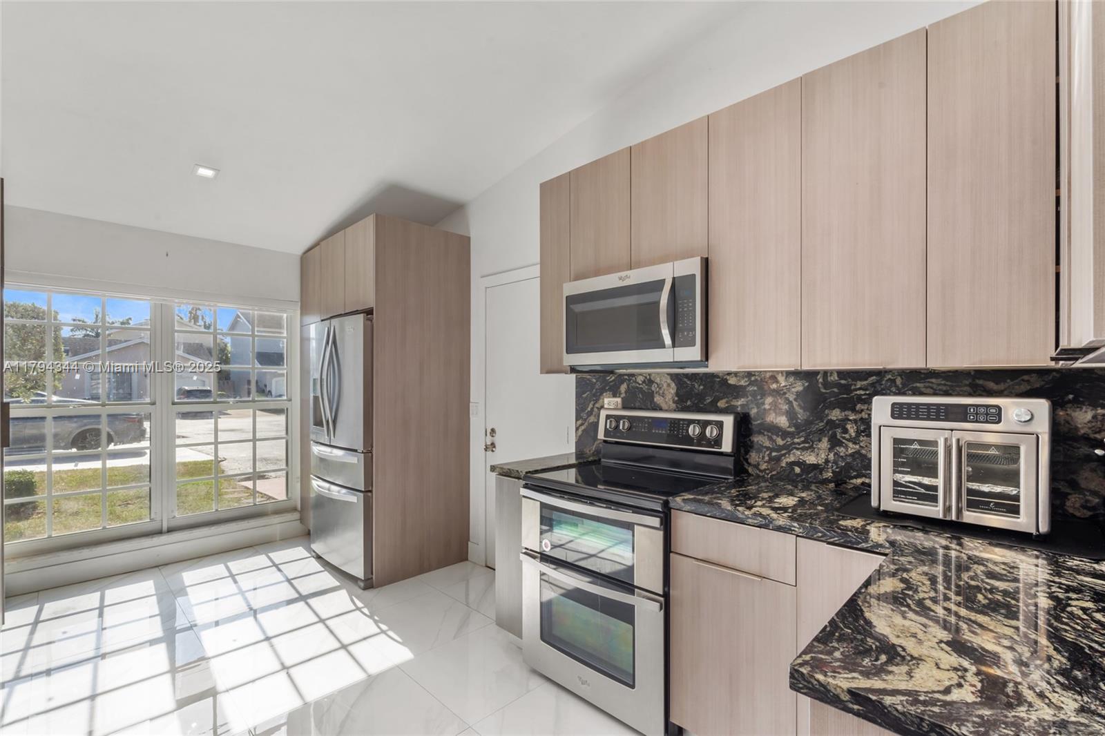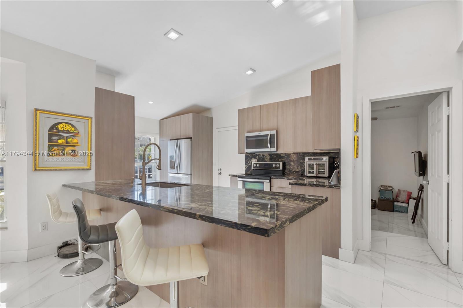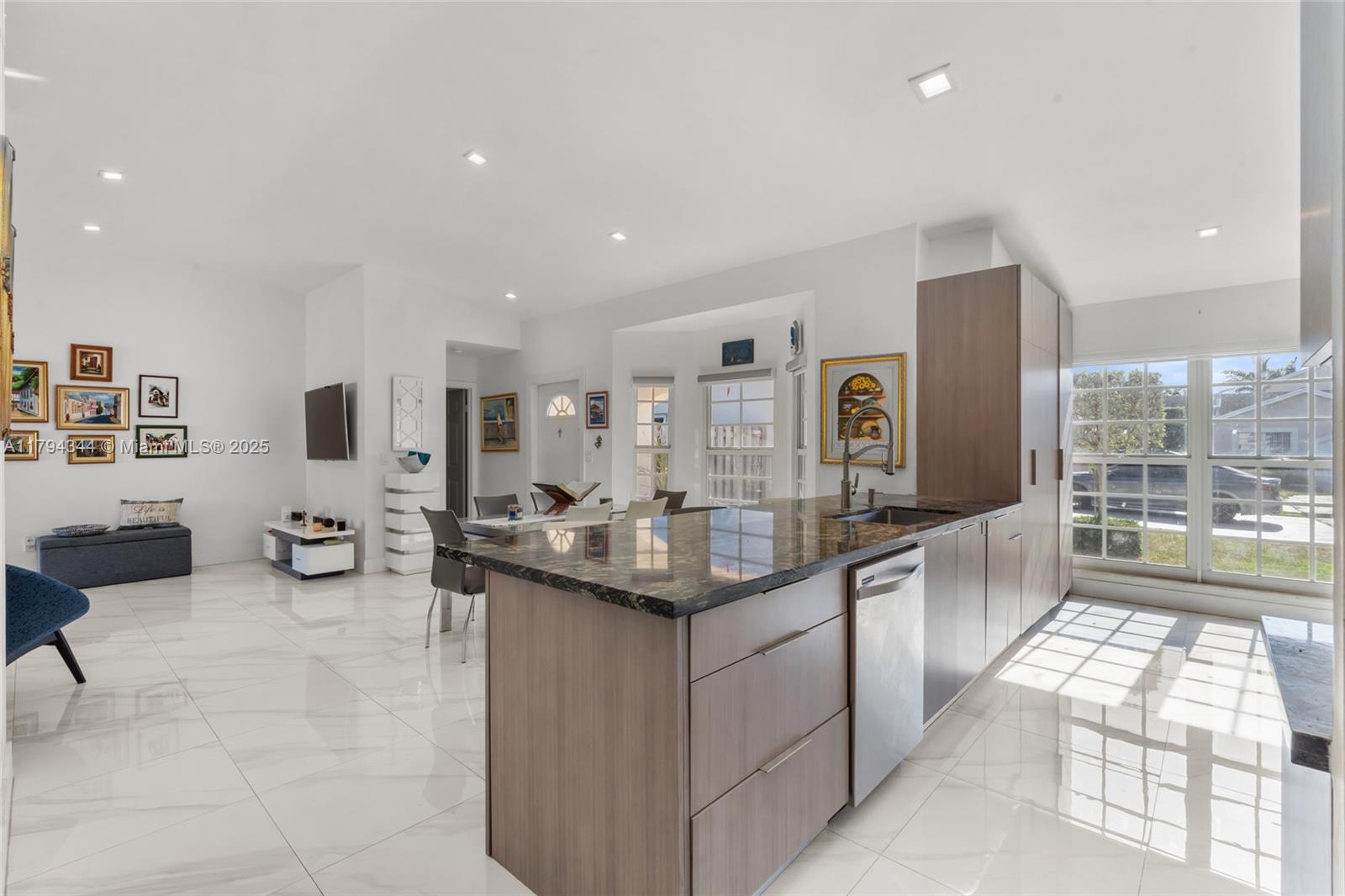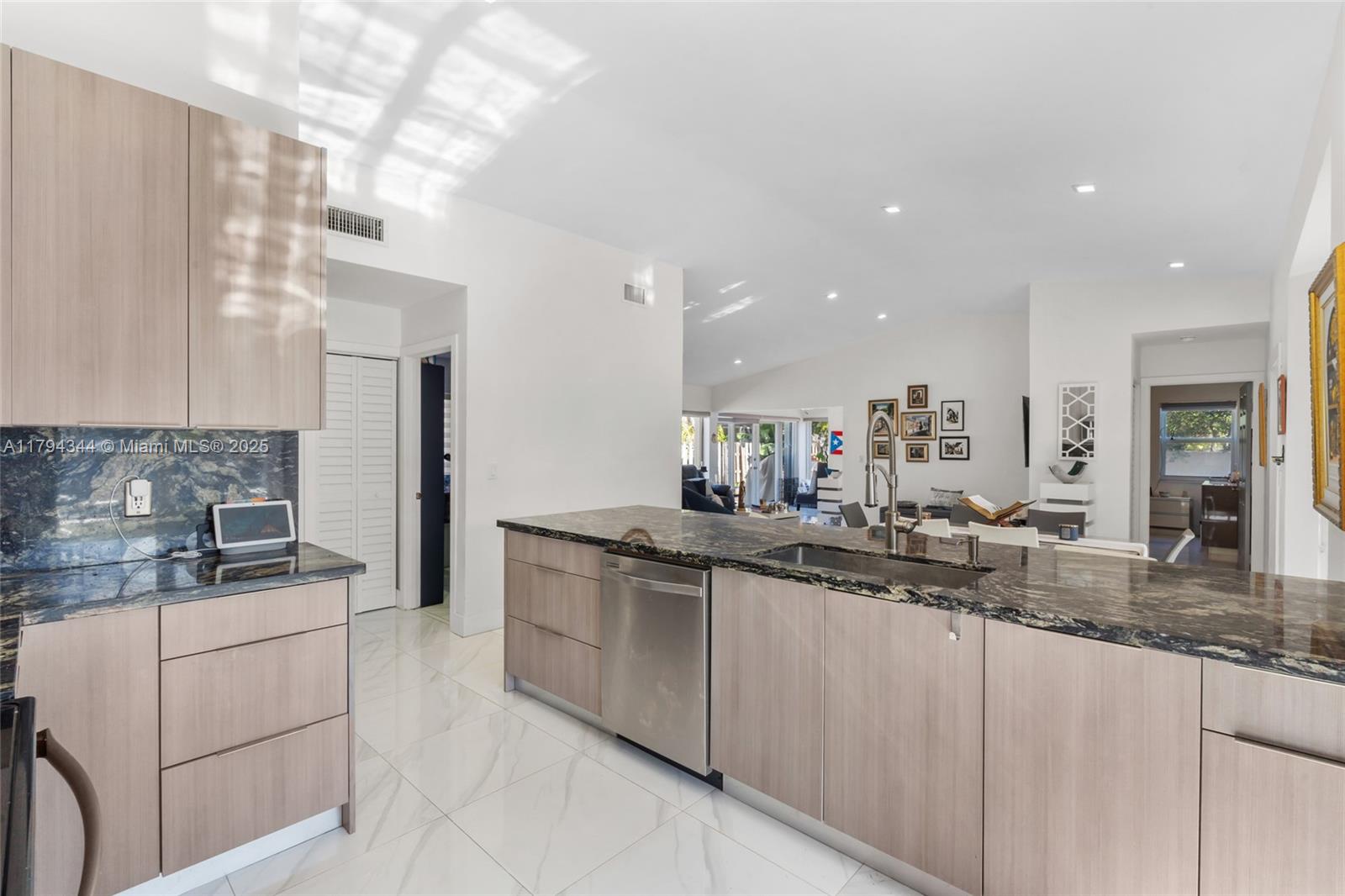 This beautifully remodeled 3-bed, 2-bath residence offers a perfect blend of modern comfort and stylish design. Completely renovated in 2020, the home features a spacious open-floor concept, vaulted ceiling, and a converted garage with an additional bedroom and reach-in closet. The home also features impact windows throughout, a a spacious sunroom, new modern kitchen, new roof and gutters, porcelin tile floors throughout, and a tankless water heater. Step outside to a large backyard perfect for entertaining, complete with an outdoor kitchen for BBQs and gatherings. Located in a gated community with 24-hour security, residents also enjoy fantastic amenities including a pool and kiddie playground. This home combines comfort, security, and outdoor living in a sought-after Doral neighborhood.