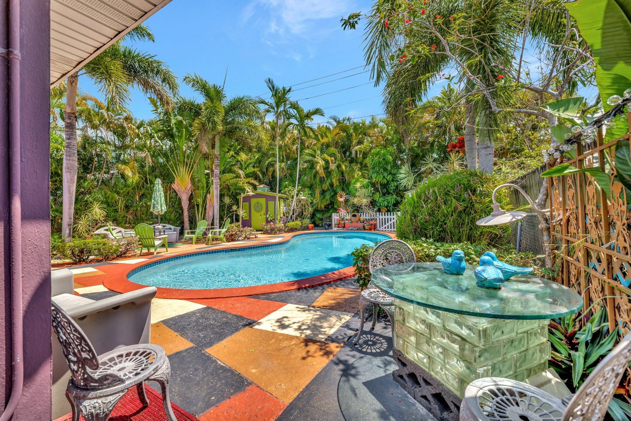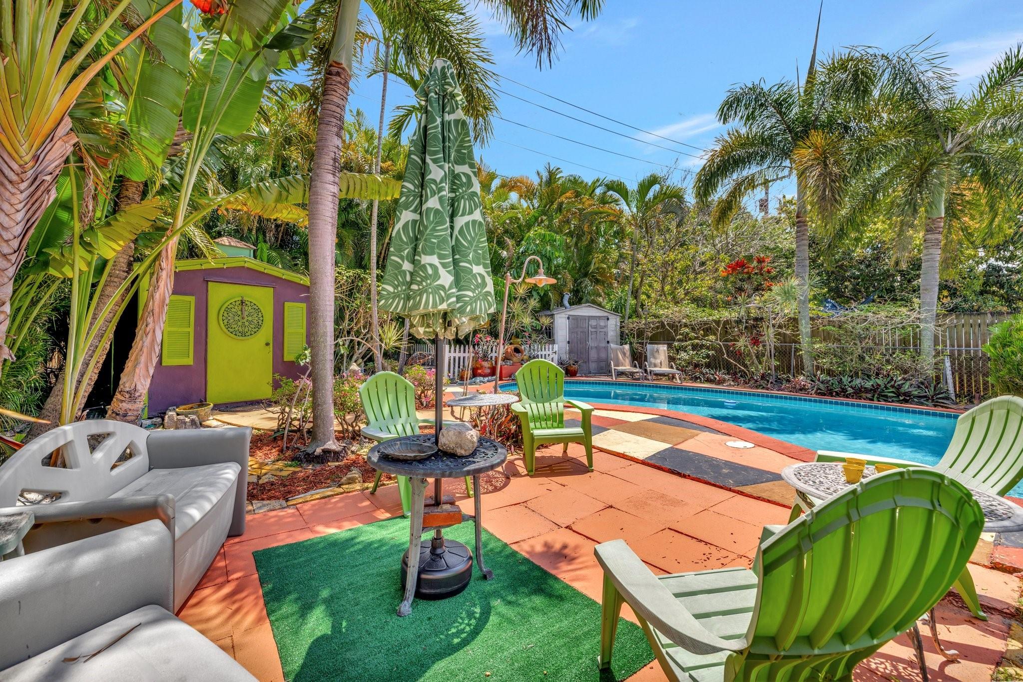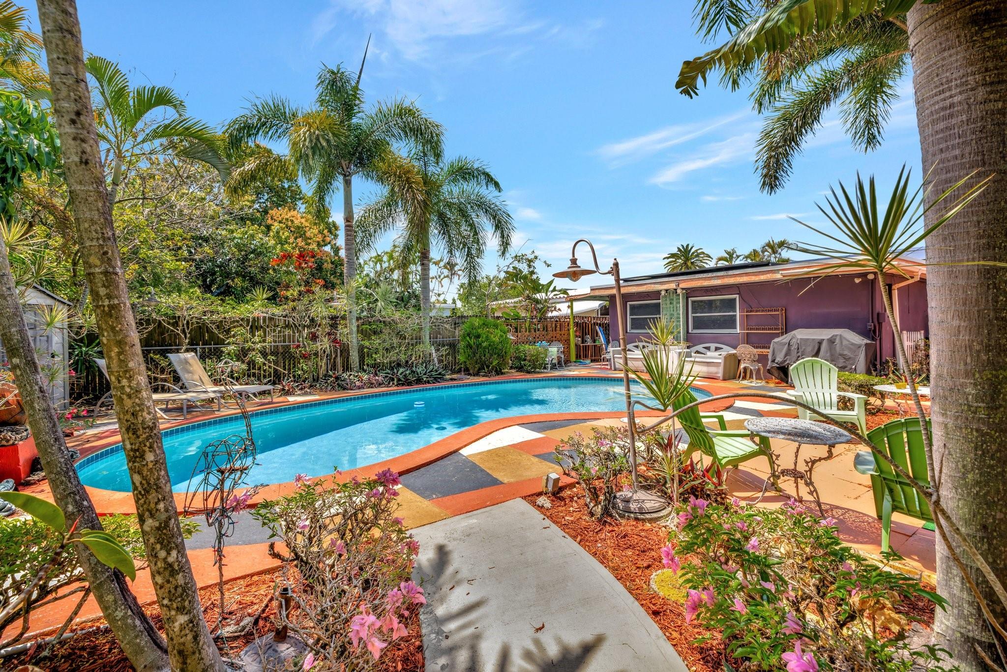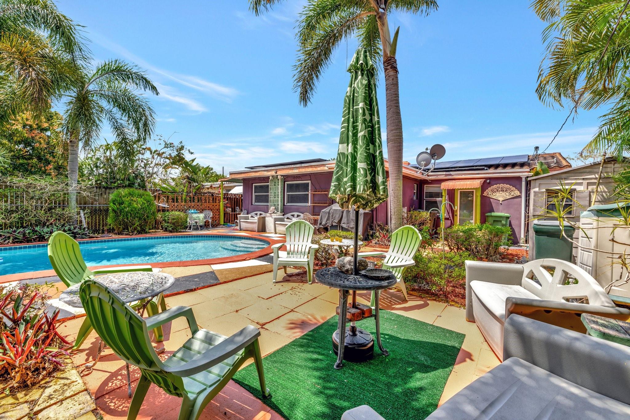 PRICED BELOW APPRAISED VALUE (3/5/2025) OF $700,000. Fantastic opportunity in sought-after Poinsettia Heights! This home has a mother-in-law apt perfect for living in one unit and renting the other, with residential multifamily, low-rise, medium-density zoning. Walk to Wilton Manors, bike to the beach, and enjoy nearby shopping and dining. Pool is approx 10 feet deep city won’t allow new pools to be that deep these days. Updates include full PVC plumbing to the street, on-demand electric water heater, (2023) solar system, new rear flat roof, attic insulation (2021). Saltwater pool with Diamond Brite finish (2015). Impact windows/doors, closed-in back porch, front addition, and barrel tile roof (2007). 4 exterior storage sheds 1 with electric & AC Ready for your personal touches!