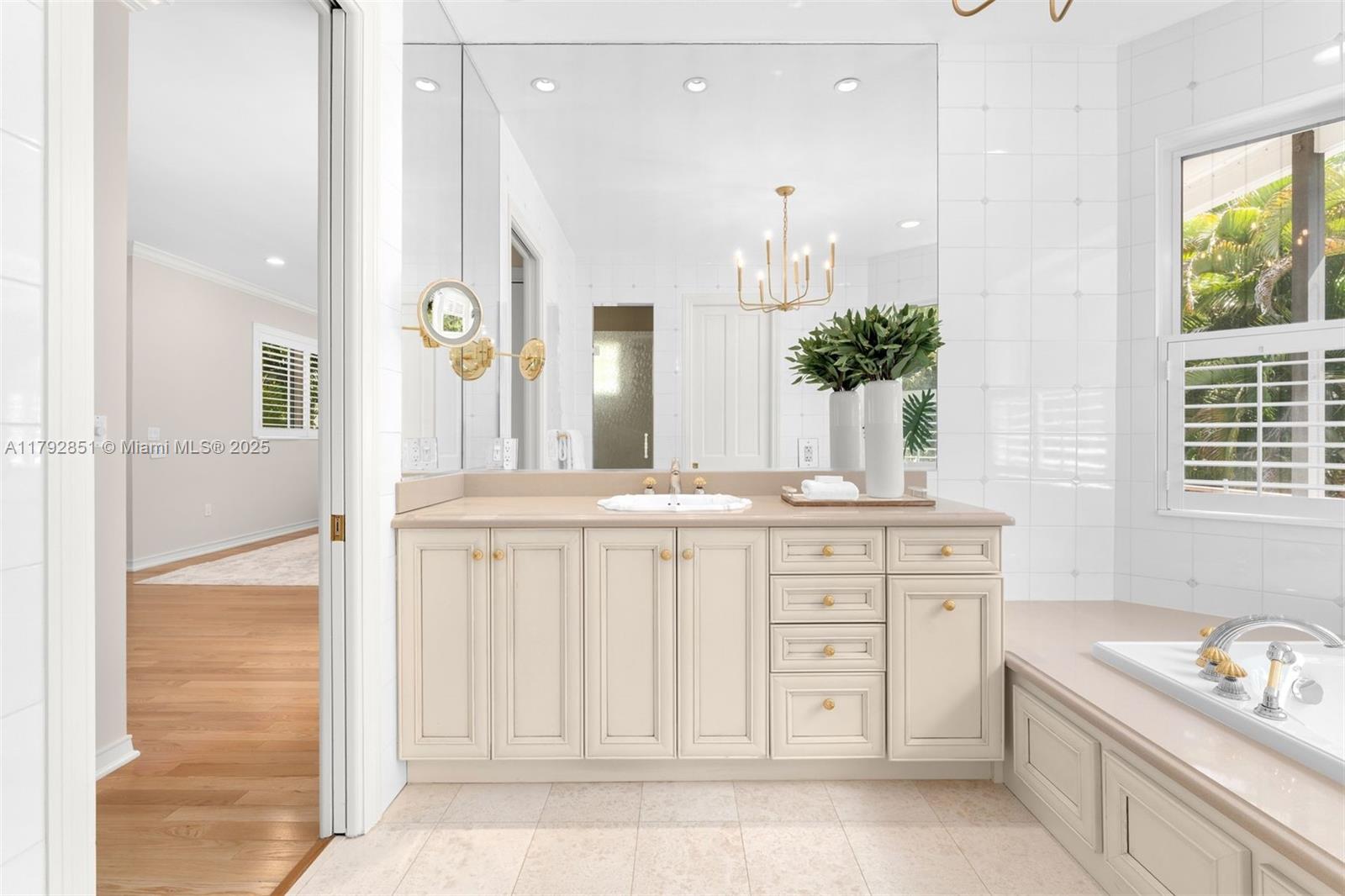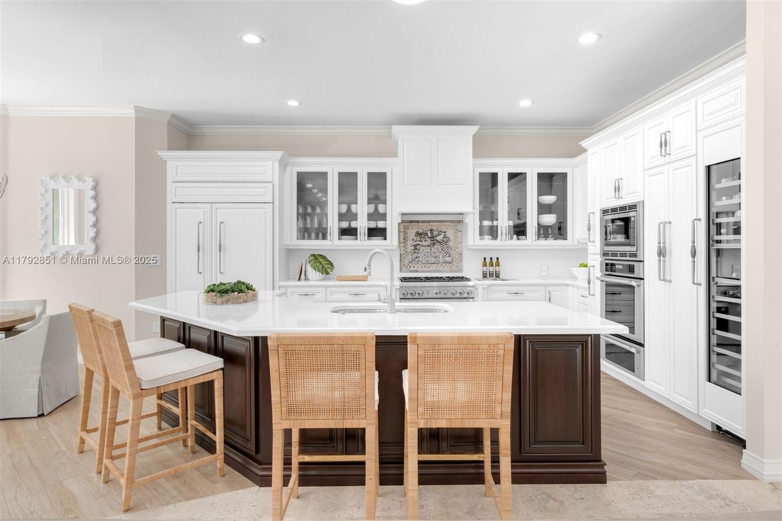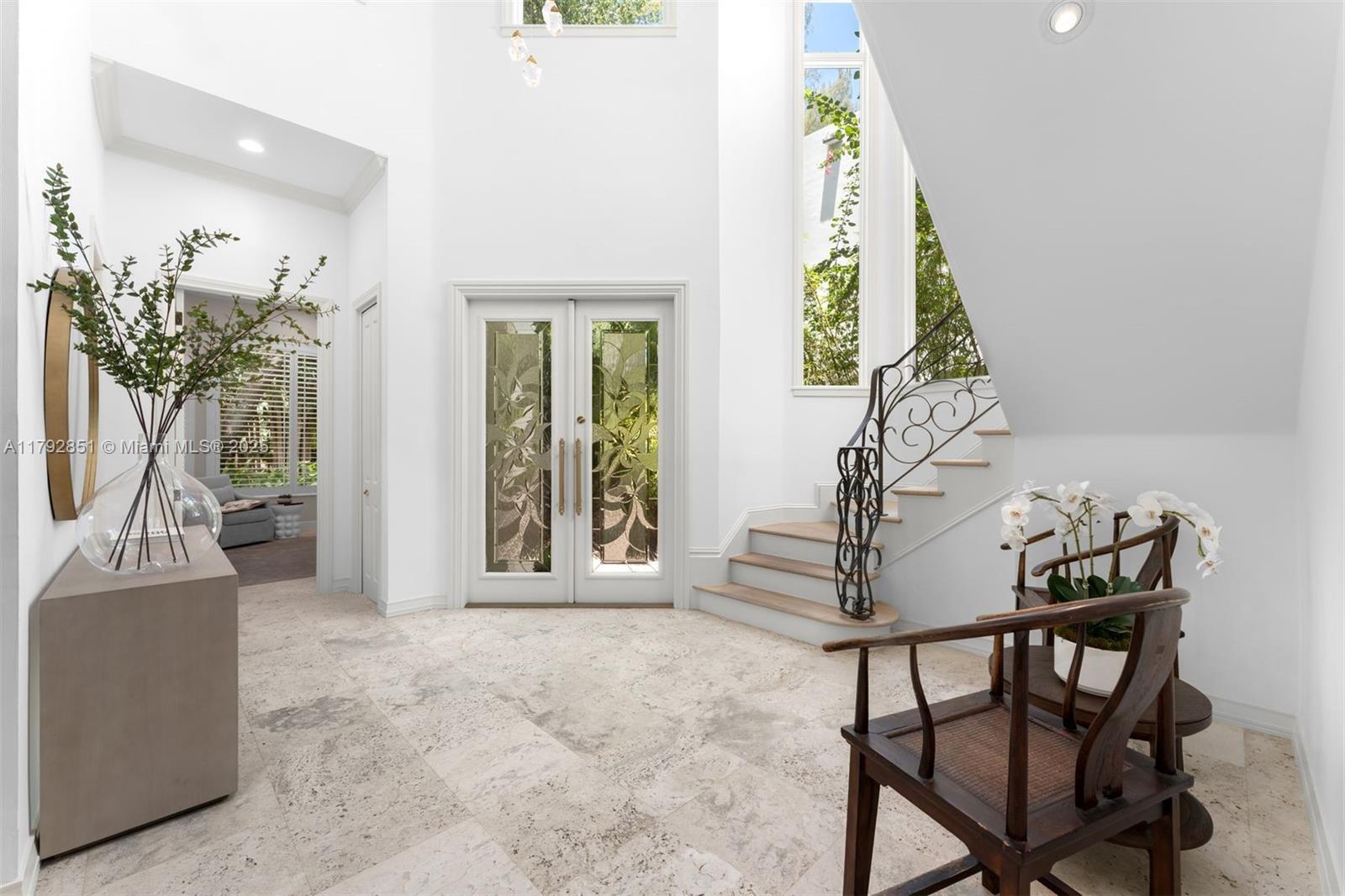 Gracefully set on a lushly landscaped 7,158 SF lot, this elegant 3 BD/4.5 BA residence offers 3,702 SF, combining timeless architectural details with modern upgrades. Interiors feature soaring ceilings, custom millwork, French doors, crown moldings, and a wood staircase with iron railing. The open-concept kitchen boasts quartz countertops, Thermador appliances, Sub-Zero fridge, and a wine cooler. Outdoor highlights include a chlorine tile pool with jets, covered terrace, built-in Bull grill, and mosquito system. Additional features: elevator, 2 ACs, Tesla wall backups, 2-car garage with epoxy floors, and generator-ready wiring. Located on a quiet, tree-lined street.