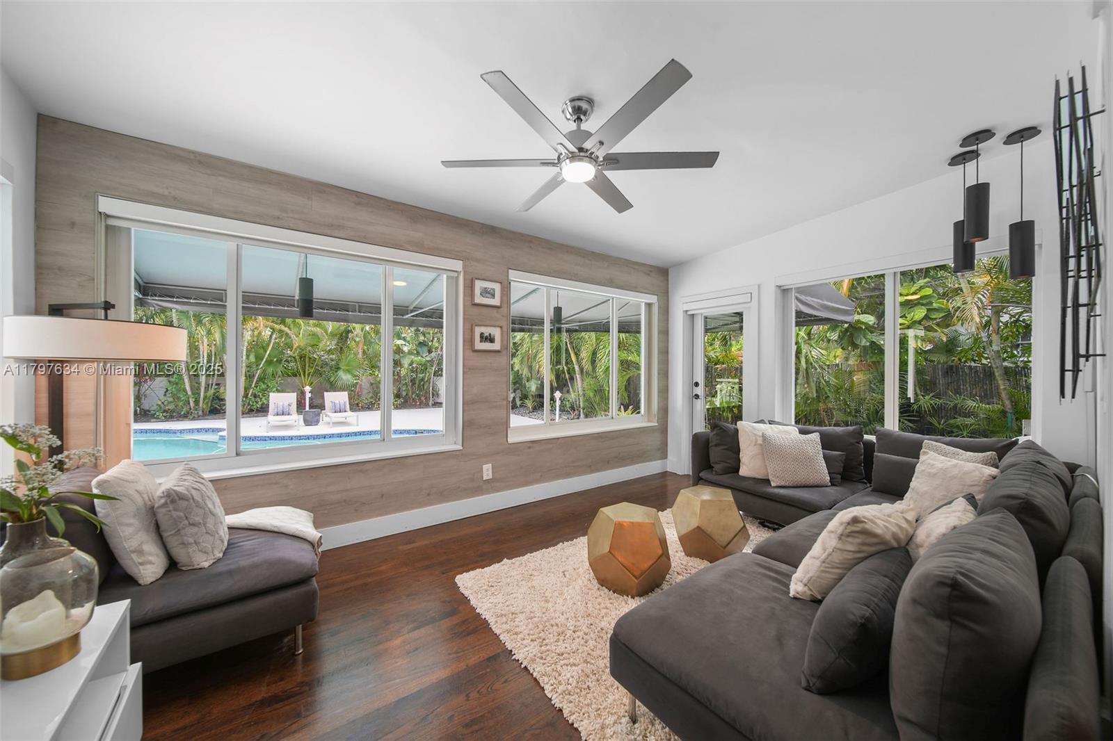 In this prime location in the heart of Miami Shores, sits this renovated home, where curb appeal is just the beginning. Circular driveway, dashing landscaping and full hurricane impact glass welcome you in. New wood flooring anchors the living room with large windows, art deco fireplace, and unique ceiling moldings. Home chefs will love the fully updated kitchen featuring gas range and plenty of cooking prep space on the beautiful counters. Additional office space, plus garage storage area keep everything organized. Spacious backyard with covered awning, new decking, built-in BBQ area and freeform pool, make summer soirees here a delight. Enjoy nearby access to all Miami Shores has to offer from coffee shops, to the community center, to top local schools. A Very Special Home.