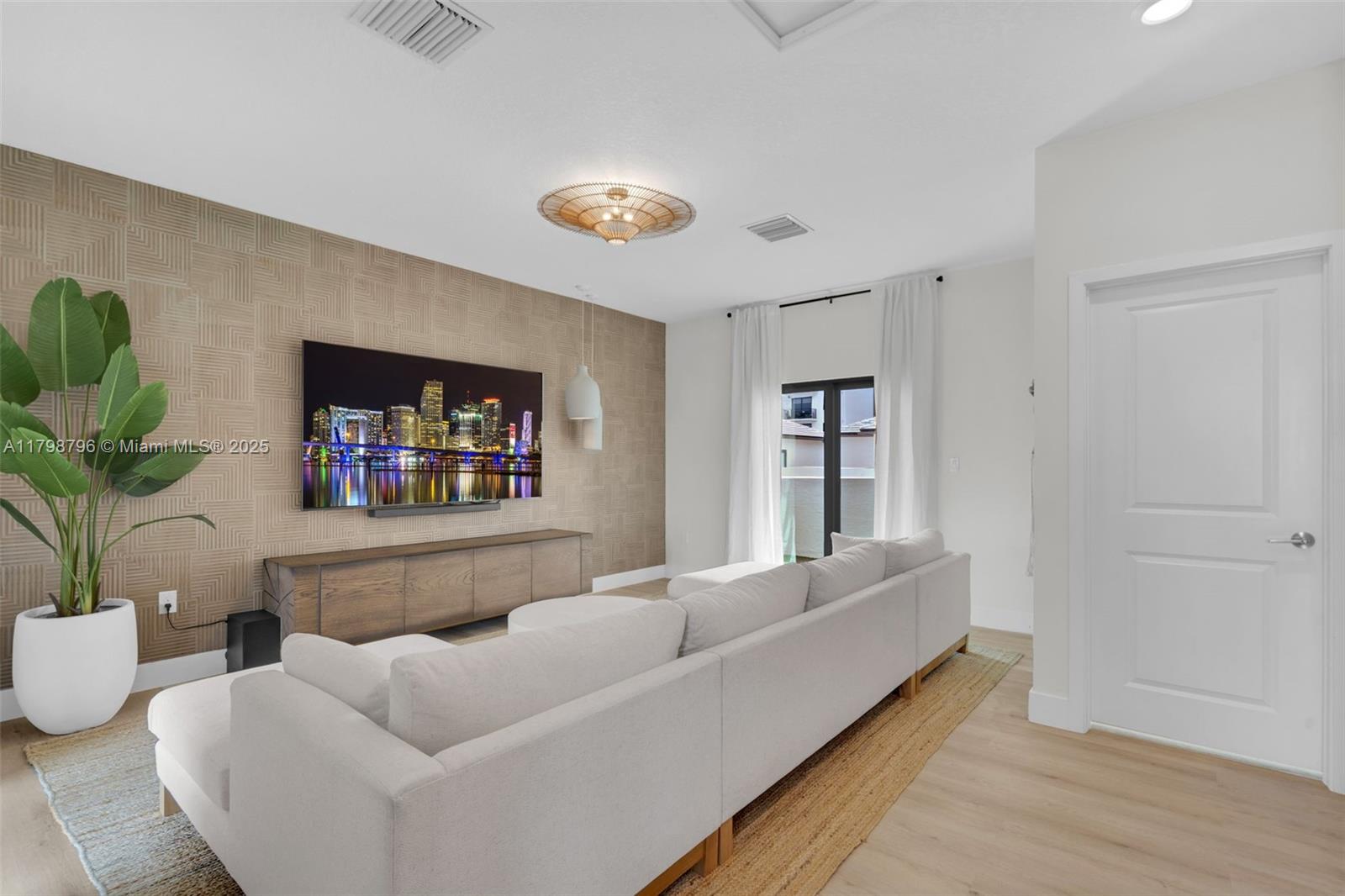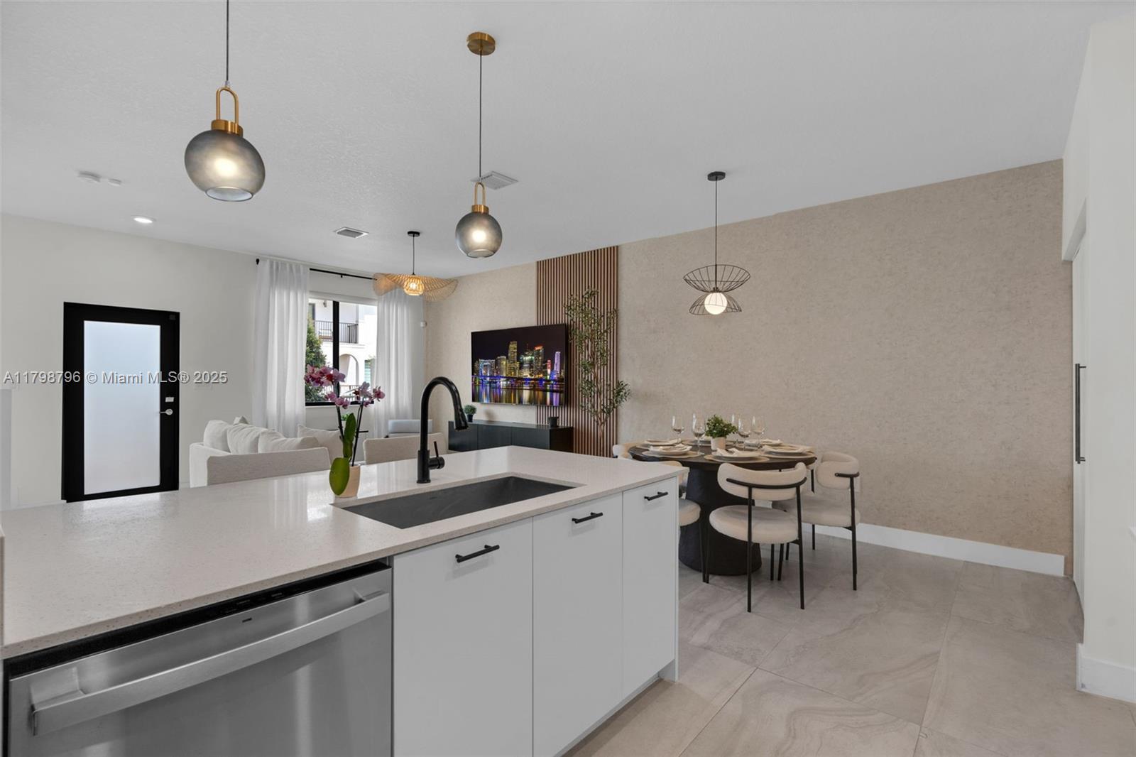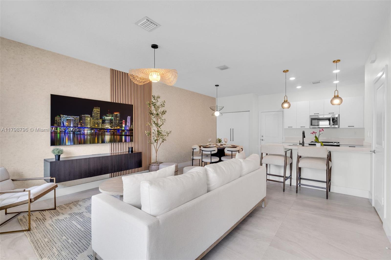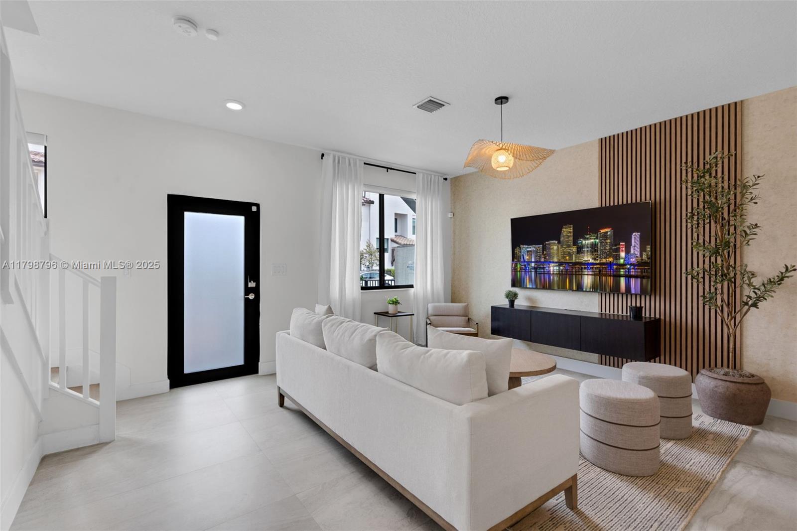 Simply Magnificent 3 bedroom, 2 full/2-Half bath townhouse exceptionally decorated by Three Leaf Interiors. Residence features flooring upgrades, built-ins, pantry built-out, customized walk-in closet, beautiful wall accents, spacious bedrooms, meticulously designed office/work station, phenomenal entertainment area, shaded rooftop patio and open space balcony equipped for BBQ install. Water filtration system throughout the home, EV charger and storage racks in two car garage as well as video camera installations. Perfectly situated in Downtown Doral, which boasts Publix supermarket, restaurants, a state-of-the-art fitness facility, with indoor track, basketball courts, spinning room, pool, business center, parks & outdoor spaces. Quality of life awaits in this gorgeous TH community.
