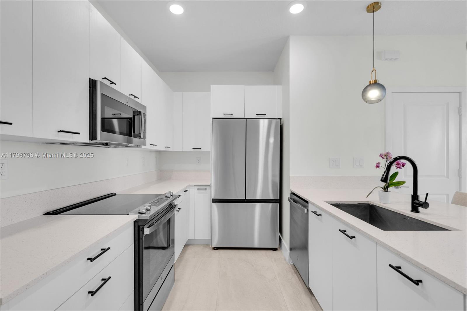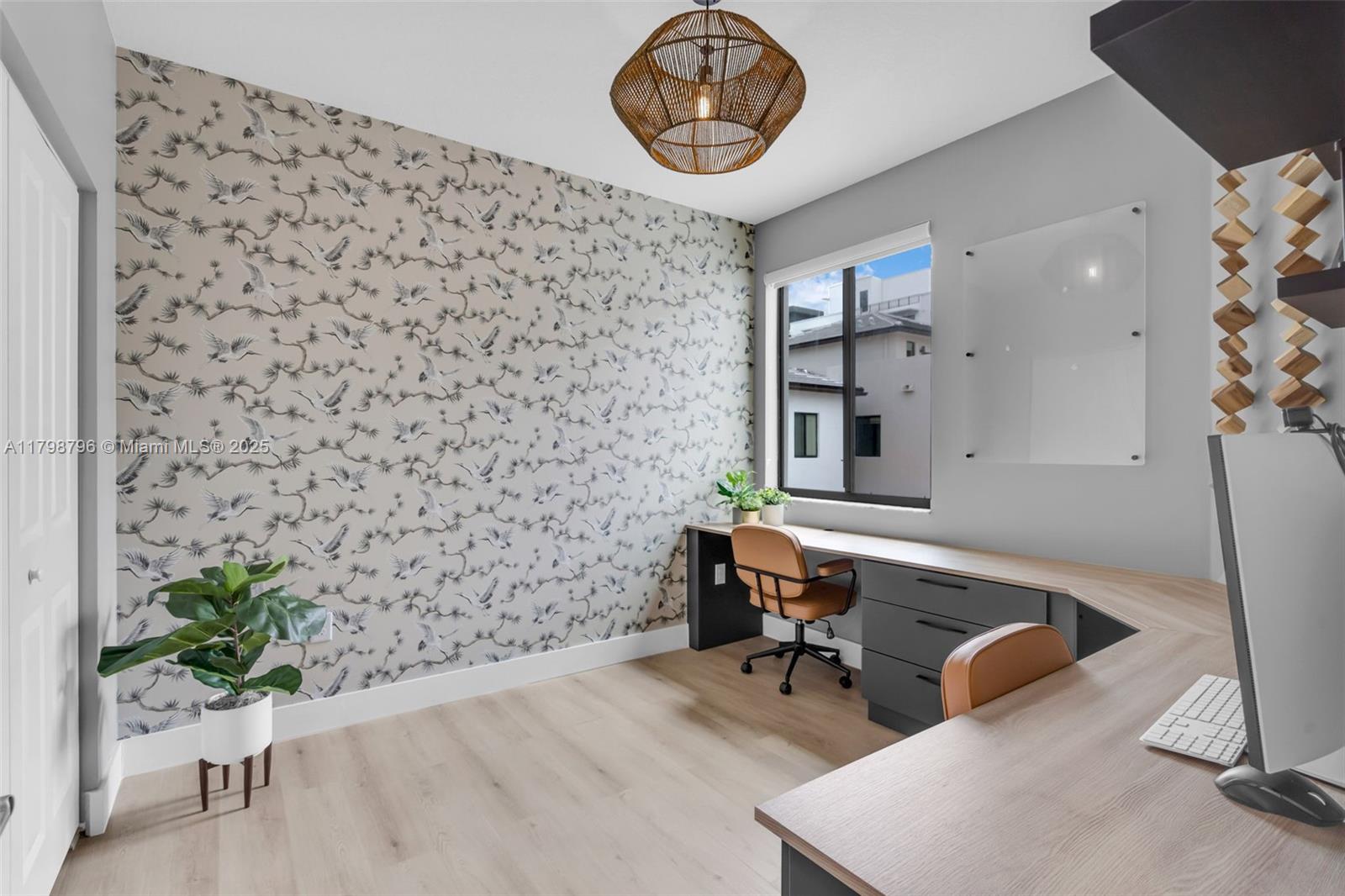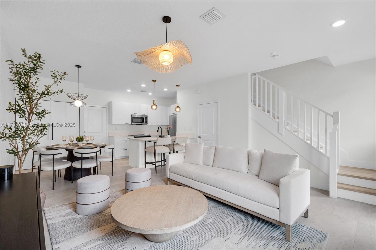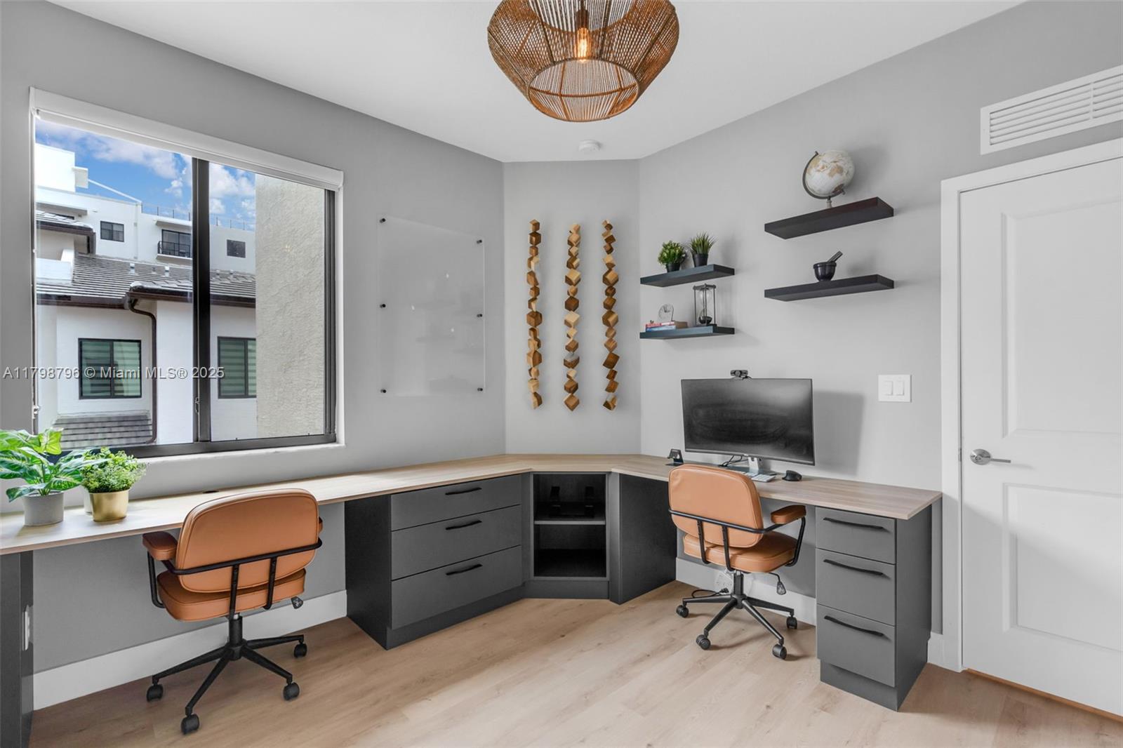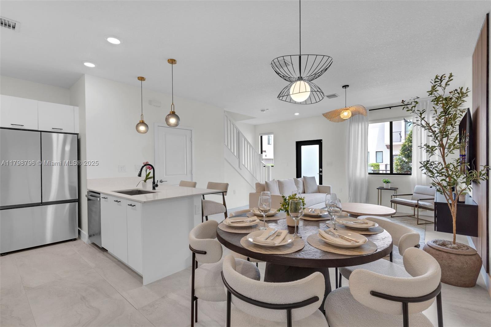 Simply Magnificent 3 bedroom, 2 full/2-Half bath townhouse exceptionally decorated by Three Leaf Interiors. Residence features flooring upgrades, built-ins, pantry built-out, customized walk-in closet, beautiful wall accents, spacious bedrooms, meticulously designed office/work station, phenomenal entertainment area, shaded rooftop patio and open space balcony equipped for BBQ install. Water filtration system throughout the home, EV charger and storage racks in two car garage as well as video camera installations. Perfectly situated in Downtown Doral, which boasts Publix supermarket, restaurants, a state-of-the-art fitness facility, with indoor track, basketball courts, spinning room, pool, business center, parks & outdoor spaces. Quality of life awaits in this gorgeous TH community.