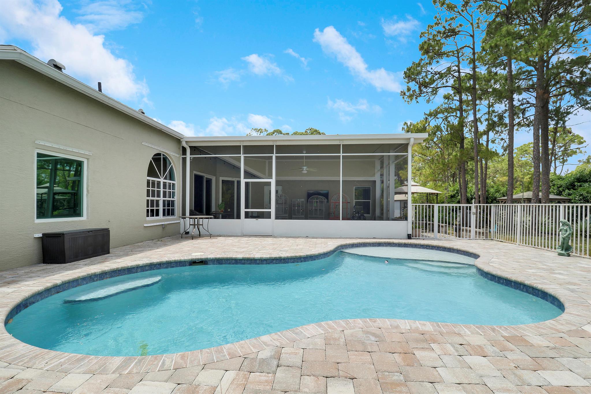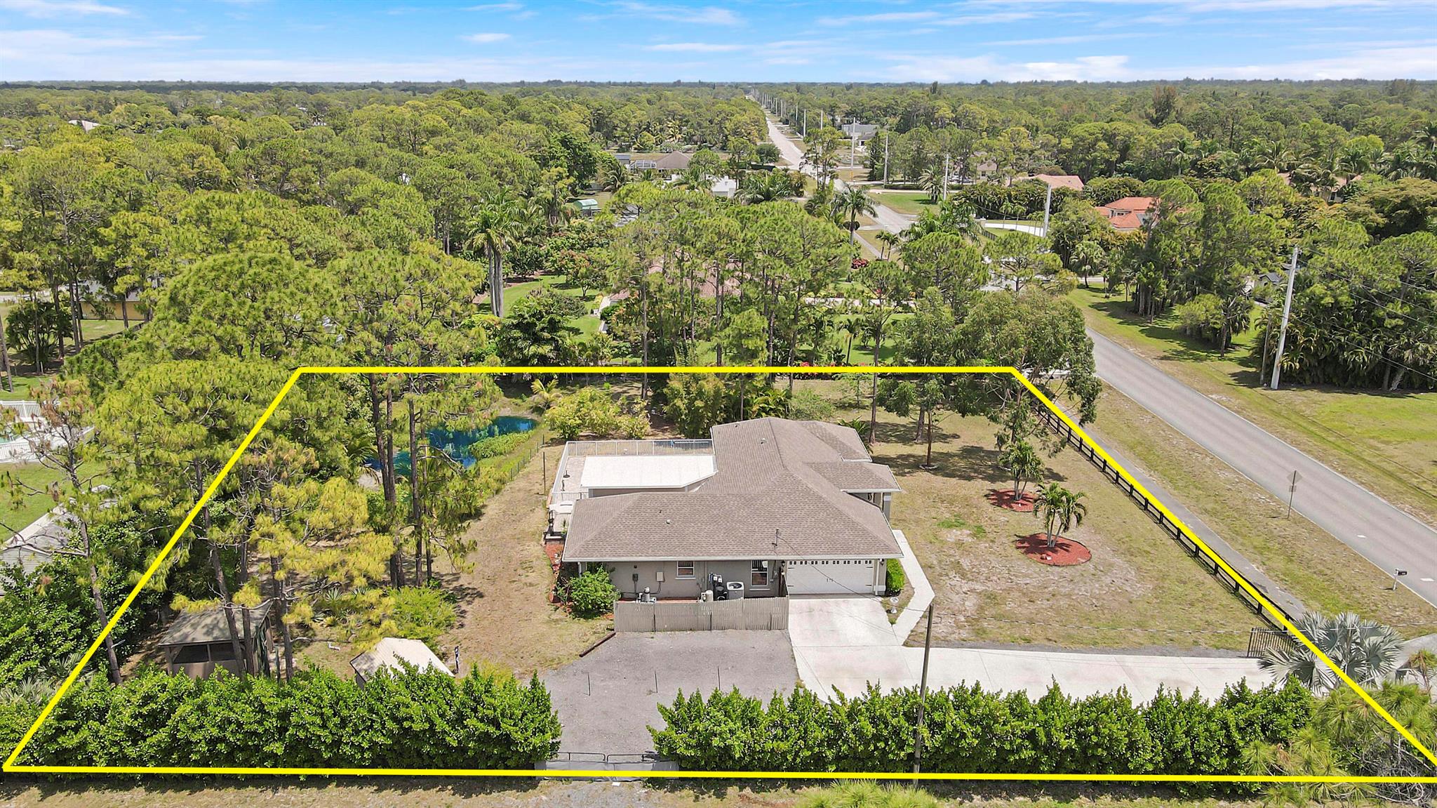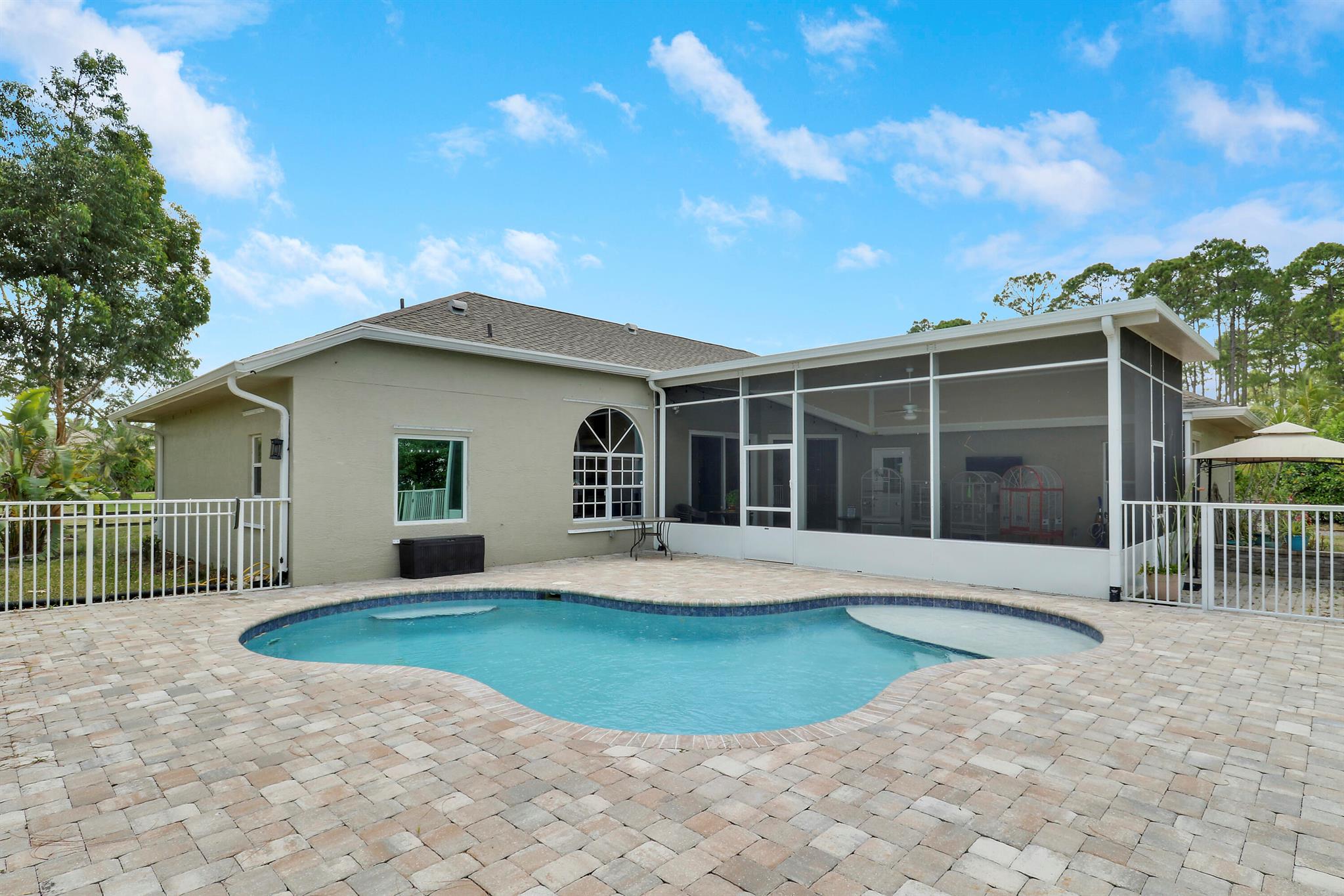 BOM: thru no fault of Seller/Ppty. (Buyer lost Job) HIGH & DRY on a Paved Rd. in the ''Acreage'', this Fully Fenced & Gated Pool Home with Fruit Trees is on a lushly wooded 1.37 acre lot with a Pond. Xtra parking for RV or boats, with separate 50 amp box. No HOA. Included is an outdoor '''Aviary'' & a ''Ted Shed/She Shed'' with Electric & A/C. Lots of Natural Light pours through the Palladian Windows of this 4BR/2BA/2CG updated home. Remodeled kitchen boasts modern Quartz Countertops, Storage Galore & Newer Appliances. Tile Flooring throughout. The large screened-in porch by the fenced pool area offers many entertaining possibilities! Complete Panel Storm Shutters & 2 Impact Sliders (to Patio Area), as well as Primary Bath Impact Window. Enjoy Country Living at its BEST!!