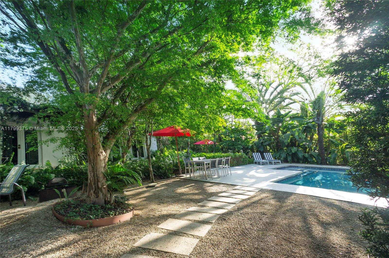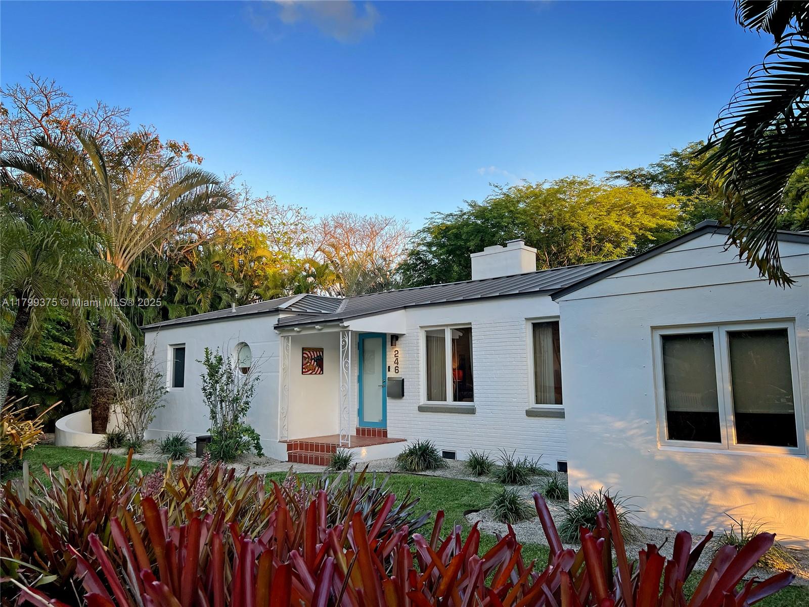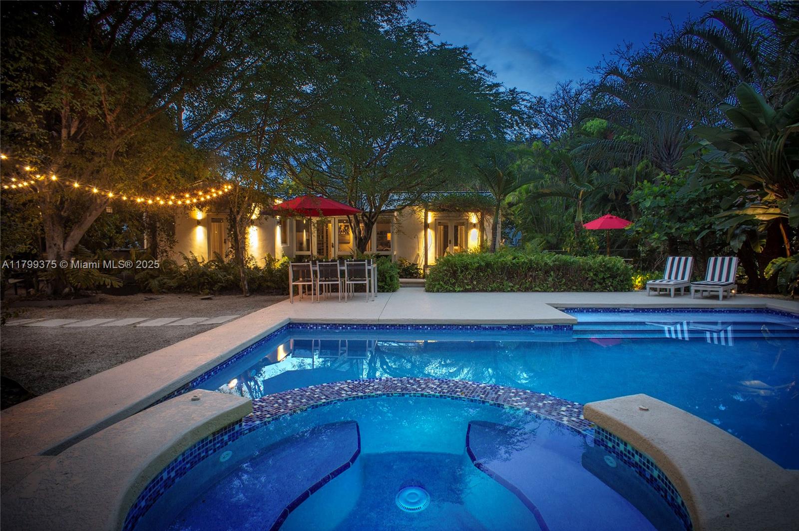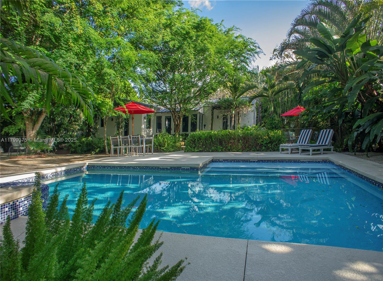 Tropical Charm meets California Cool in a unique pool home in prime Miami Shores location. This storybook house blends vintage character with modern updates and artistic touches w/ a serene private backyard on an oversized 11,700 sq ft lot. Non flood zone. This bright airy home features a desirable split-bedroom layout. The expansive master suite offers generous walk-through closets, a spa-like bathroom and direct access to the lush backyard. A sunny Family Room opens to shaded wood decks and large pool with sun shelf and jacuzzi, ideal for lounging and entertaining! Laundry room w/ ample storage, new spacious storage shed, newer aluminum roof. Live the Miami Shores lifestyle, oak-lined streets, minutes to top schools, golf course, trendy restaurants, shops and beaches. Actual Sq Ft 1,850