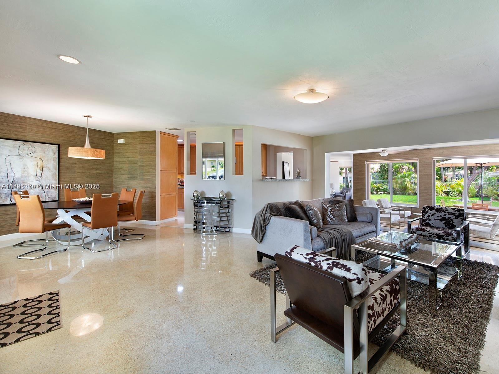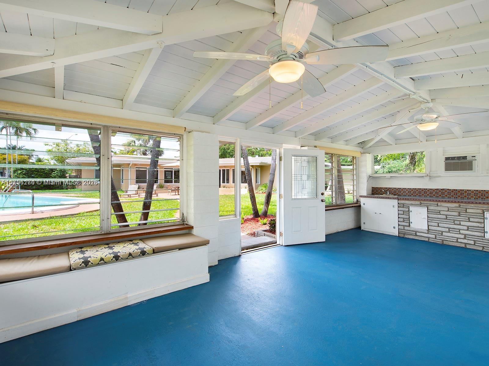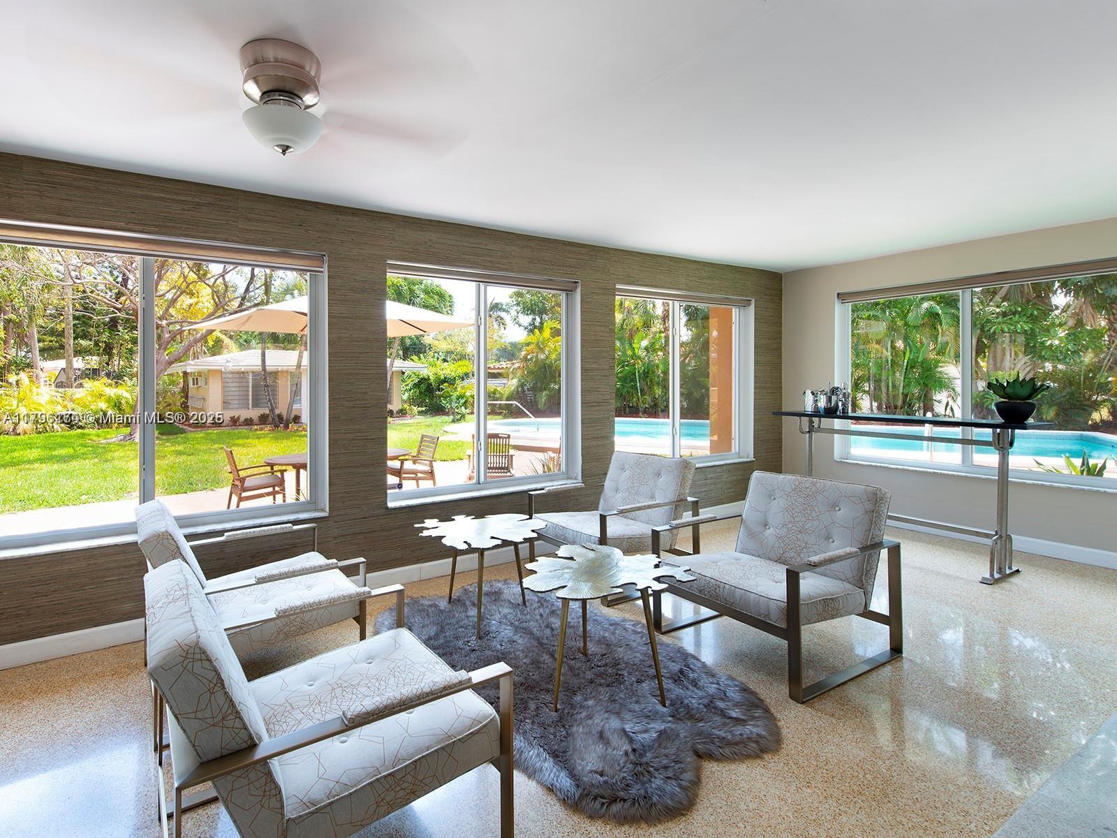 Spacious mid-century modern family home, located on an expansive, oversized lot in Miami Shores, steps from the golf course and Miami Country Day School. Comfortable split floor plan includes 4 bedrooms, 3 bathrooms, laundry room, storage room, double carport, large driveway. Original terrazzo floors in the living room extend into a bright, window-lined Florida room that overlooks stunning, recently updated pool (2019). Separate cabana perfect for entertaining or an artist studio. Notable features include mature landscaping providing privacy and shade, skylights, impact windows, stainless steel appliances, and granite countertops. This exceptional property presents a rare opportunity to purchase a large 2799 SF home with ample room for expansion on 17,875 SF lot. Photos 2018. Needs TLC.