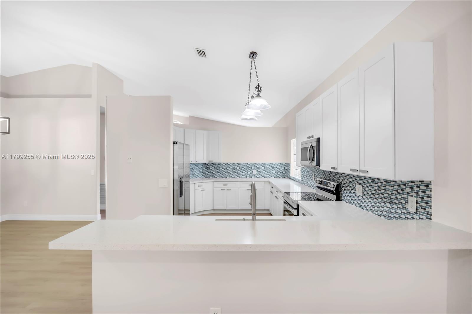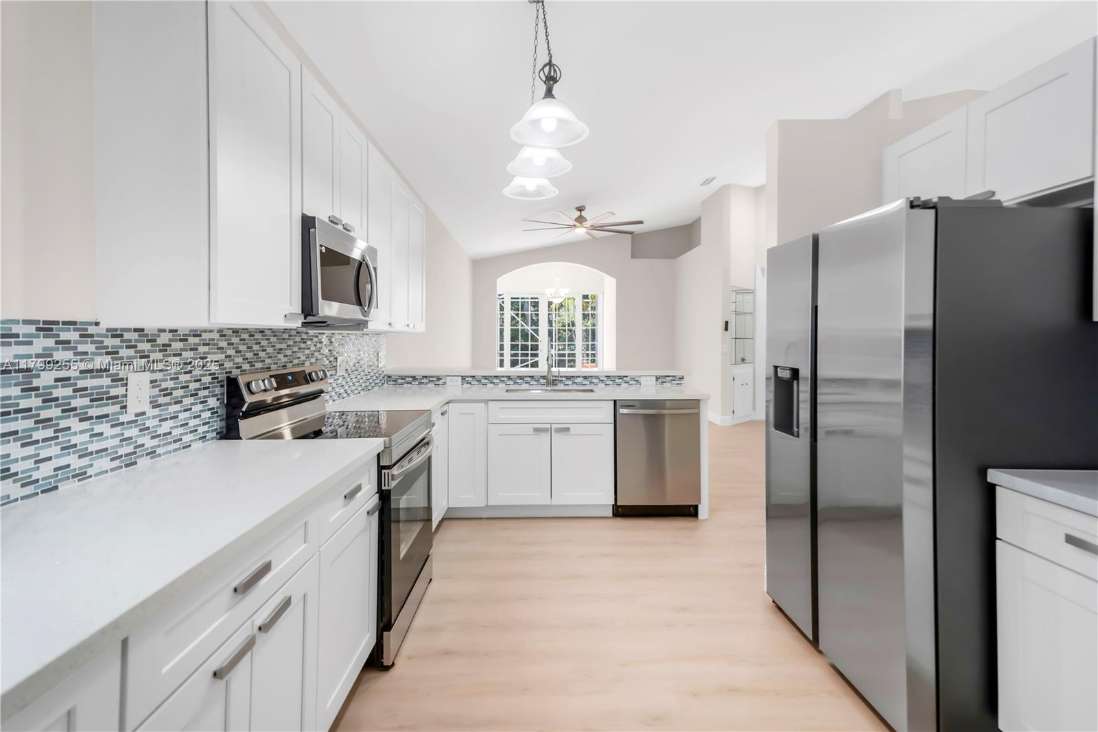 Beautifully updated LAKE FRONT 3-bed, 2-bath home in Grand Palms—one of Pembroke Pines’ most desirable gated golf communities with A-rated schools. This move-in ready, single-story gem features soaring ceilings, new laminate flooring, fresh paint, upgraded lighting, newer roof, and lush landscaping. The fully remodeled kitchen showcases quartz counters, white shaker cabinets, turquoise backsplash, and Samsung stainless appliances. The spacious primary suite offers serene lake views and double closets. Enjoy outdoor living on the oversized screened patio. 2022 A/C and water heater, 2-car garage, accordion shutters. Lawn irrigation from lake. HOA includes high-speed internet, cable, ADT alarm, and 24/7 gated security.