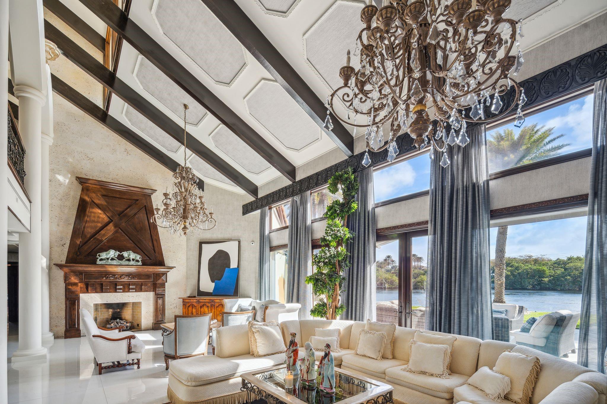 NEW IMPROVED PRICE! Discover the pinnacle of luxury on this 1.7-acre estate with 465 ft of waterfront across 4 lots. Boasting 15,000 sqft, this residence offers 8 bedrooms, 8.5 baths, a grand master suite with HIS & HERS areas, and a private sitting room. Includes a detached guest house and a separate pool house with cabana bath and studio apartment upstairs, a six car garage (split), 2 laundry rooms in main house, and a resort-style pool. Enjoy new tile floors, an upgraded kitchen, beautiful backlit agate bar, and plenty of storage. For recreation: a custom-painted basketball/tennis court, sand volleyball court and an outdoor grill area. Unparalleled privacy and elegance—don’t miss this extraordinary opportunity—true estates like this rarely come available!
