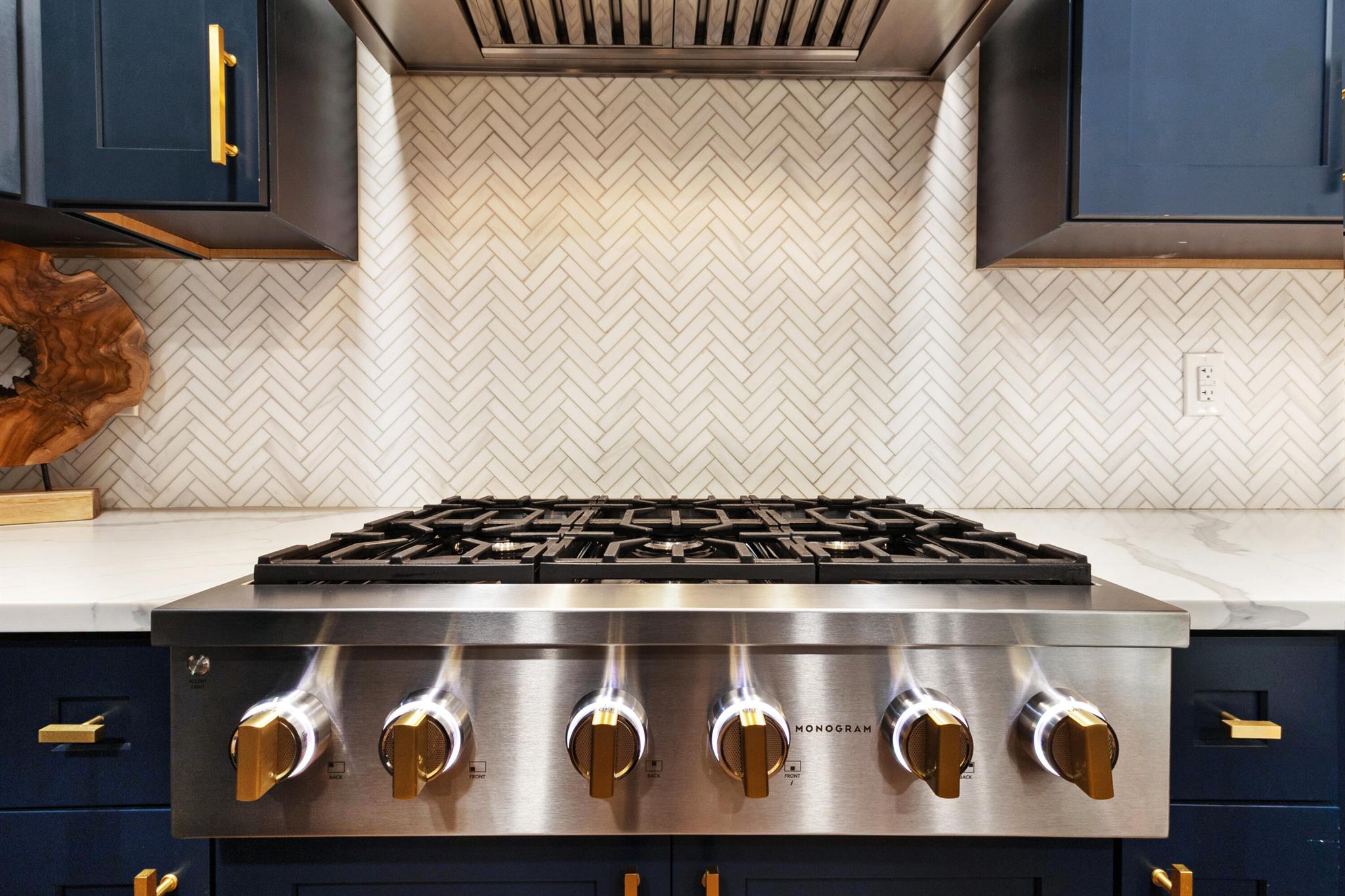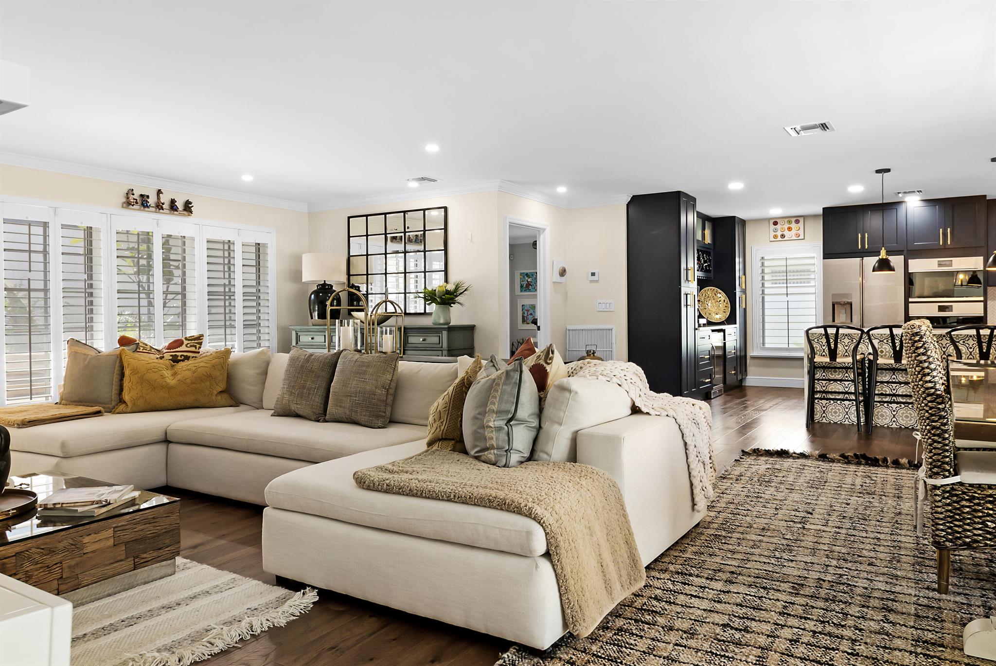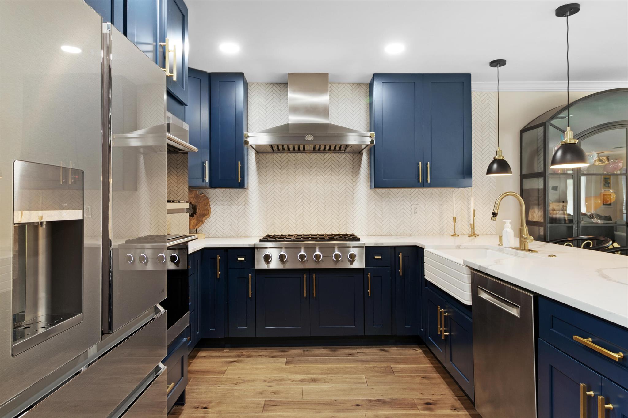 This fully remodeled designer home blends luxury, comfort, and thoughtful upgrades throughout. The stunning chef's kitchen is equipped with premium appliances including a Monogram 6-burner gas range, La Cornue hood, Cafe Platinum Glass refrigerator, double oven, Bosch dishwasher, NewAir beverage fridge, and a large farm-style sink. Custom Aria Blue shaker cabinets with brushed brass hardware pair beautifully with Calacatta quartz waterfall countertops, a Lili handmade tile backsplash, and a herringbone marble mosaic along the feature wall. A spacious wine rack and buffet complete this entertainer's dream kitchen.Flowing seamlessly from the kitchen, wide 6.5'' hardwood floors carry throughout the home, accentuated by a striking 16-ft walnut accent wall with floating cabinets in the