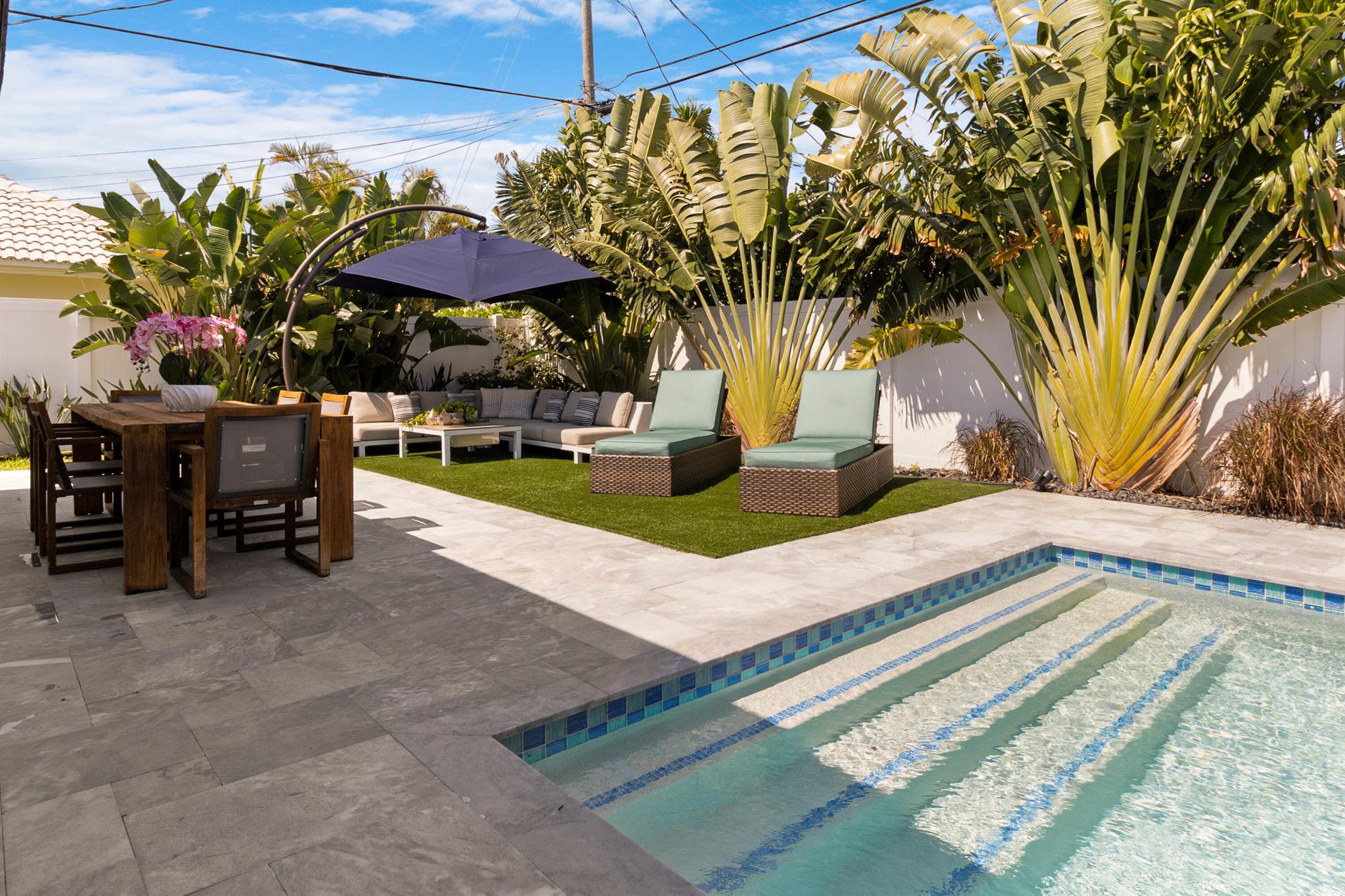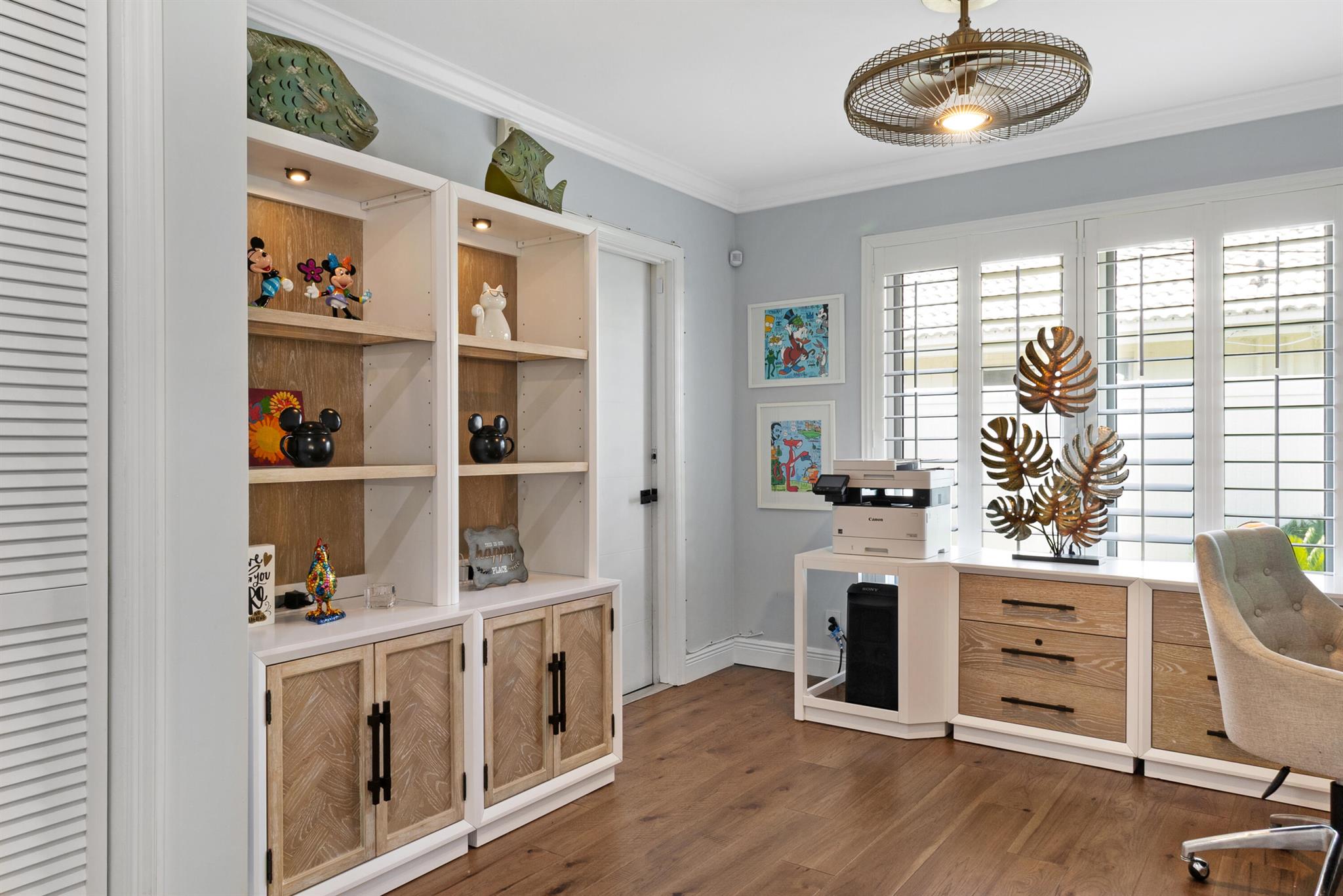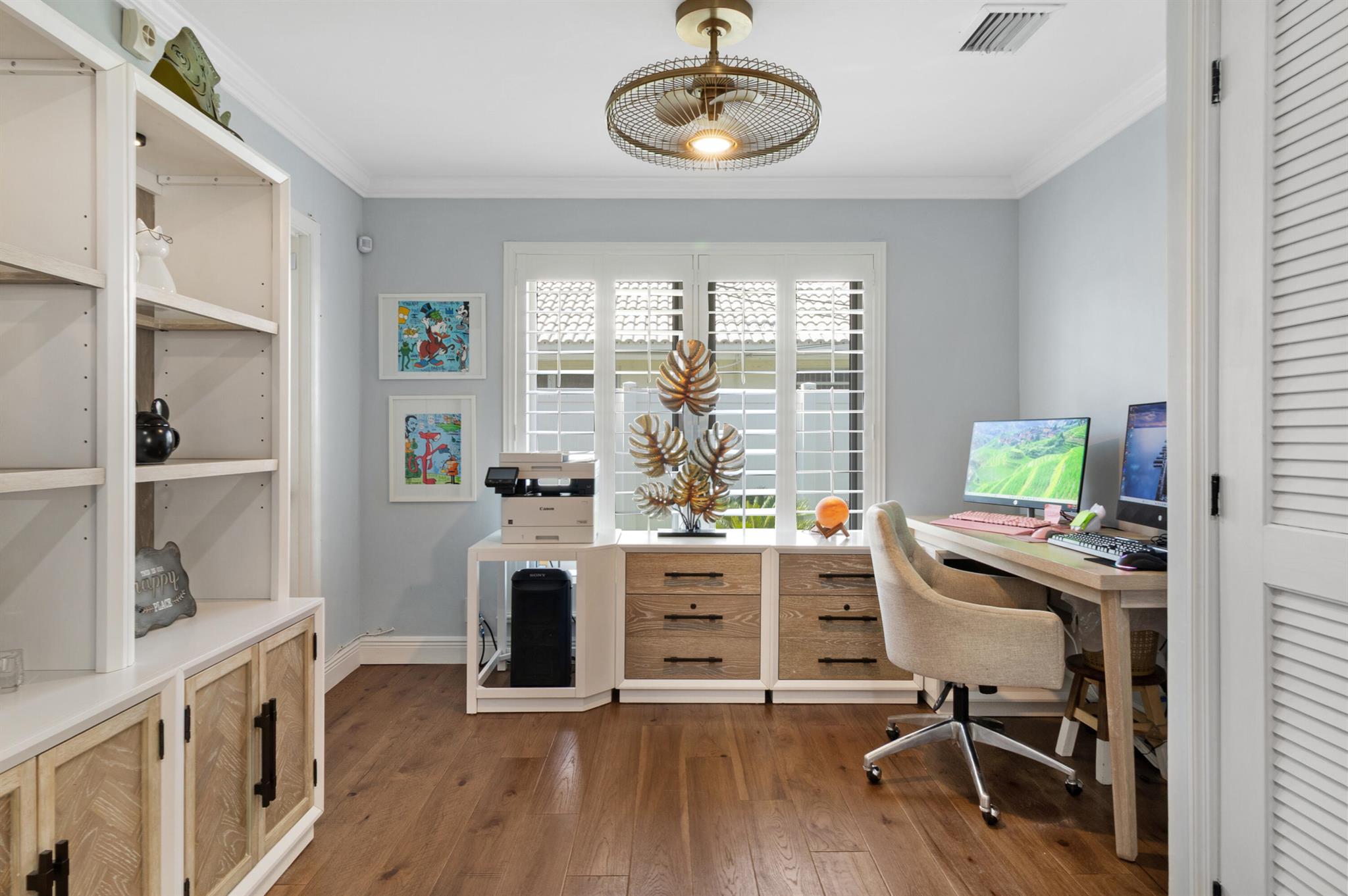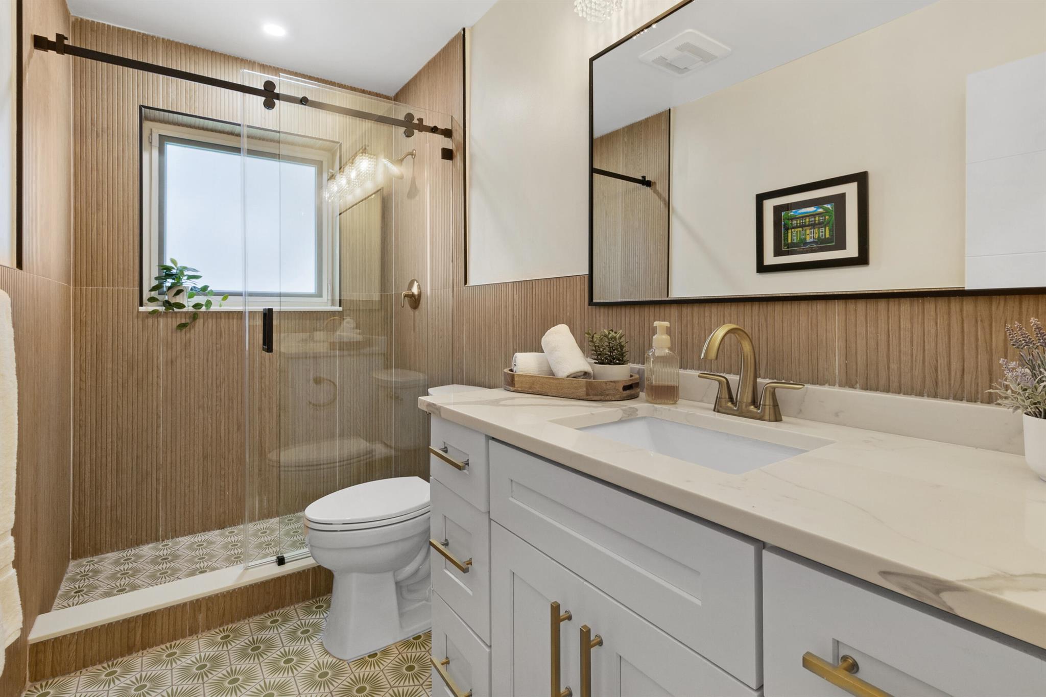 This fully remodeled designer home blends luxury, comfort, and thoughtful upgrades throughout. The stunning chef's kitchen is equipped with premium appliances including a Monogram 6-burner gas range, La Cornue hood, Cafe Platinum Glass refrigerator, double oven, Bosch dishwasher, NewAir beverage fridge, and a large farm-style sink. Custom Aria Blue shaker cabinets with brushed brass hardware pair beautifully with Calacatta quartz waterfall countertops, a Lili handmade tile backsplash, and a herringbone marble mosaic along the feature wall. A spacious wine rack and buffet complete this entertainer's dream kitchen.Flowing seamlessly from the kitchen, wide 6.5'' hardwood floors carry throughout the home, accentuated by a striking 16-ft walnut accent wall with floating cabinets in the