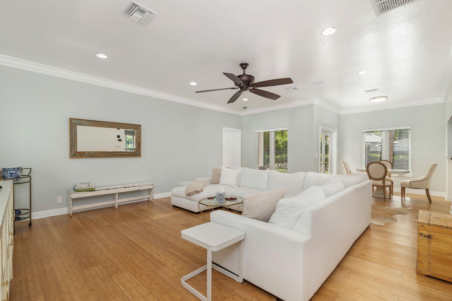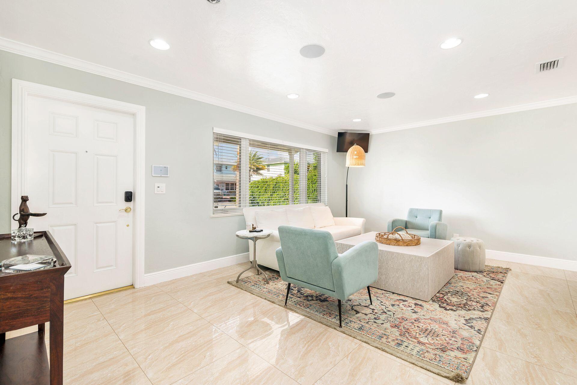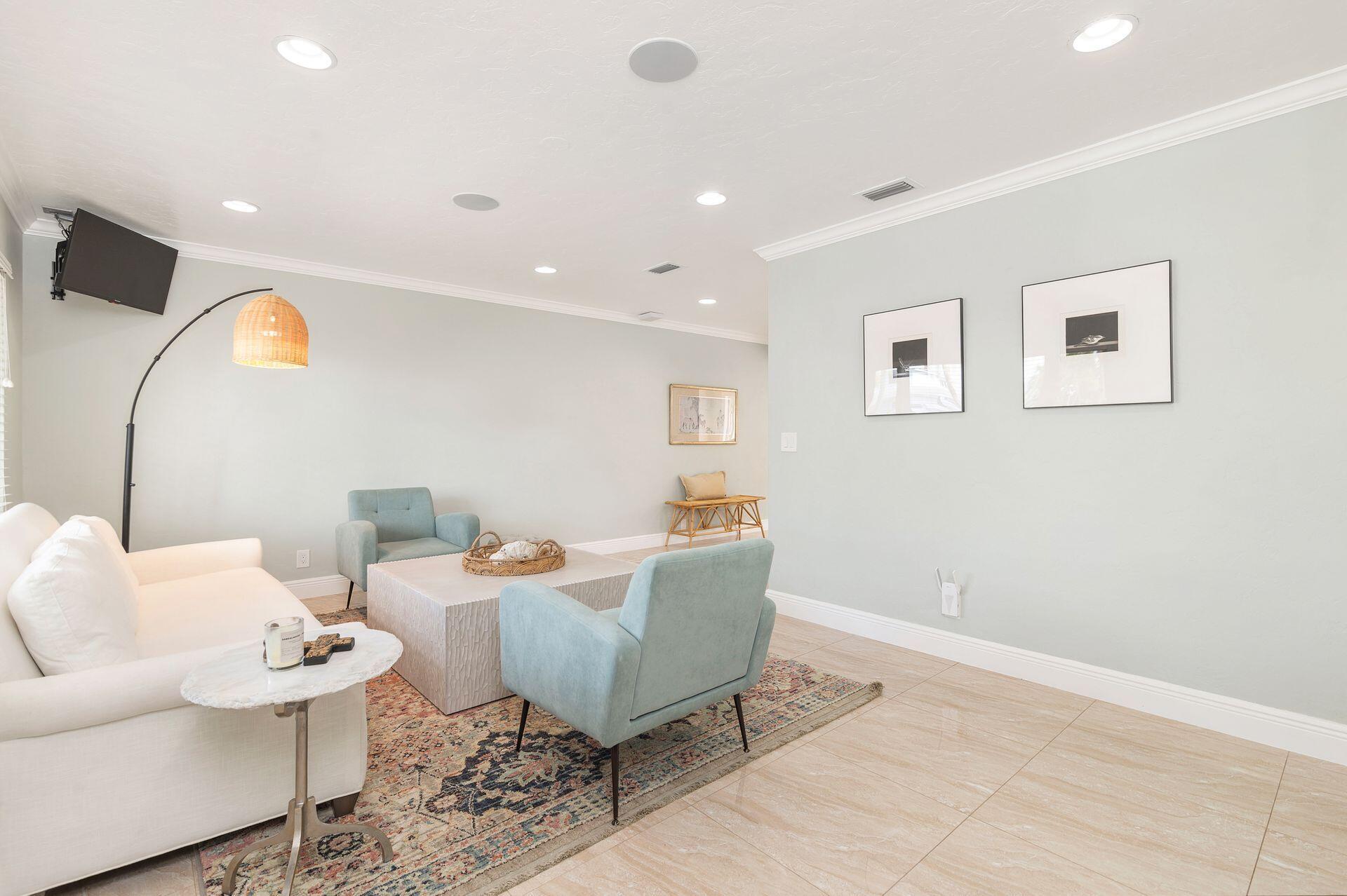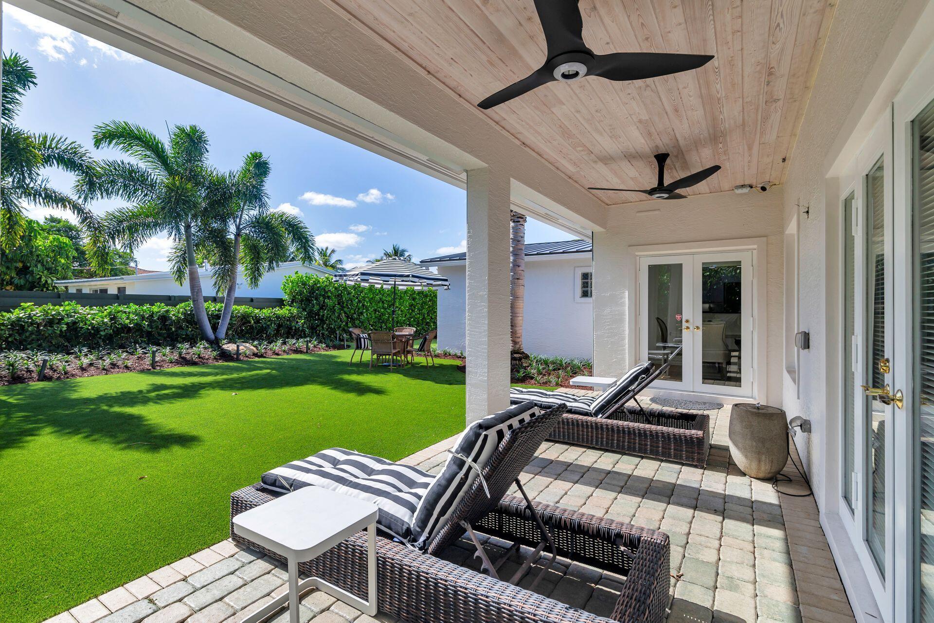Set among waterfront and multi-million dollar properties, this 3BR/2BTH located in SoSo is just delightful. Raised seam metal roof, freshly painted, gorgeous curb appeal, welcoming porch, light & bright interiors, impact windows, 22kw generator & garage! Tile and wood floors, large family room & dining area with10 foot ceilings, great open kitchen with granite counters & stainless steel appliances. Primary bedroom with ensuite bath, French doors to lanai & walk-in closet. Two comfortable guest bedrooms have large closets & beautiful marble guest bath. Beautiful lanai overlooks private lush tropical gardens and faces east to catch Intracoastal breezes. Paver circular driveway. Close to Flagler Drive Promenade, Intracoastal Waterway, Palm Beach Island, Antique Row, CityPlace and PBI airport