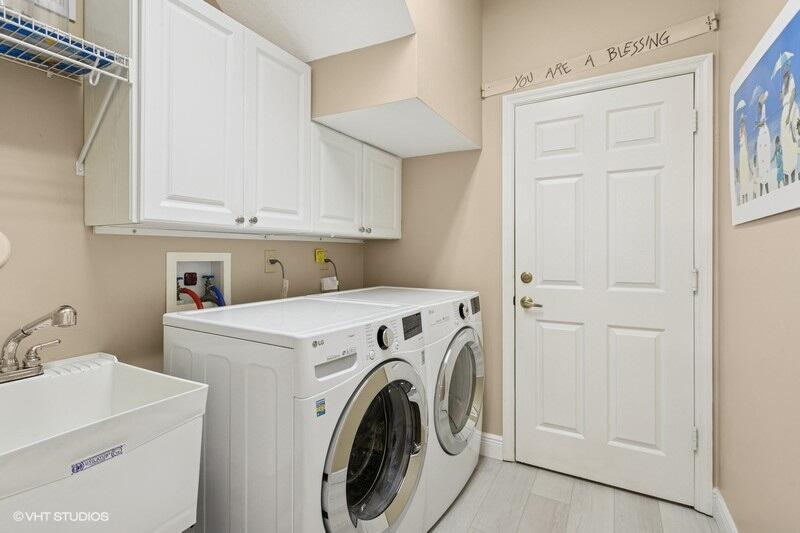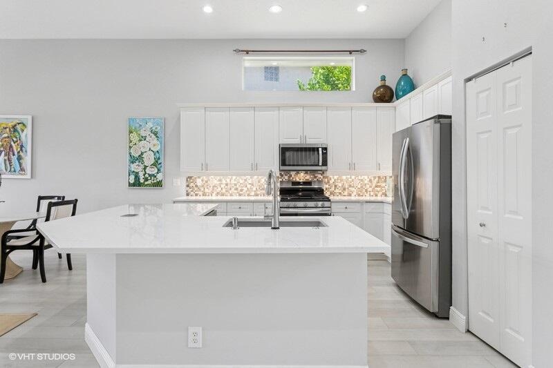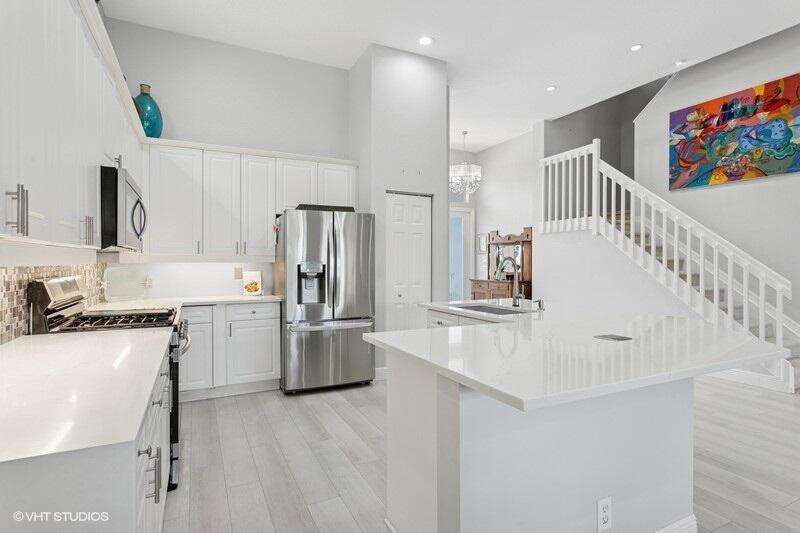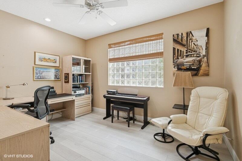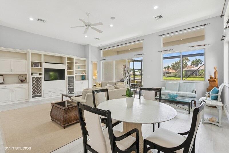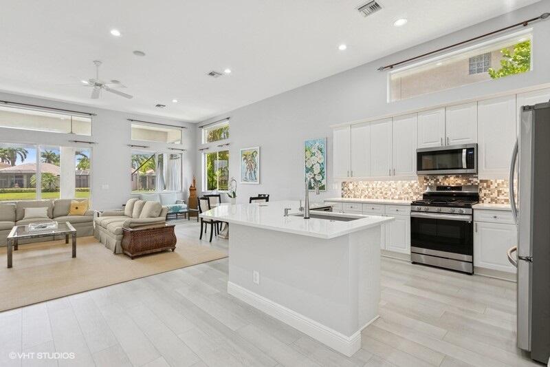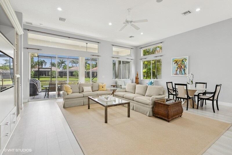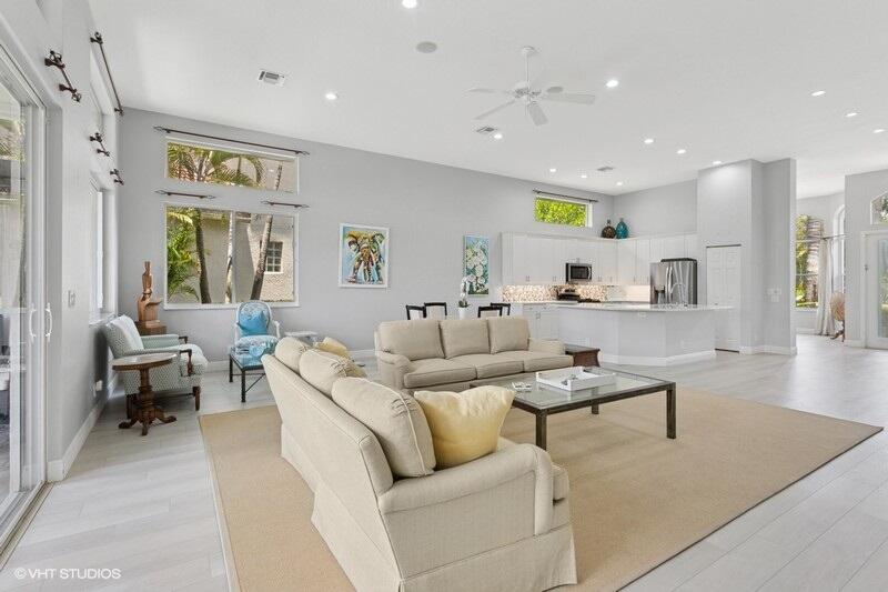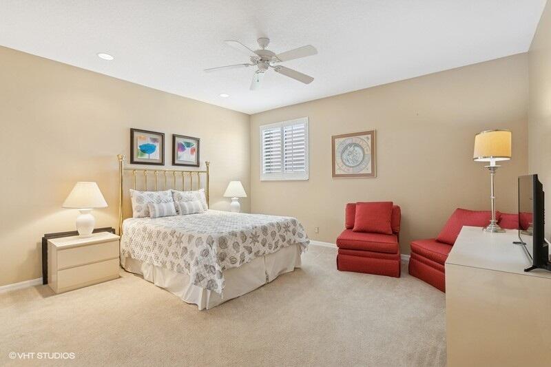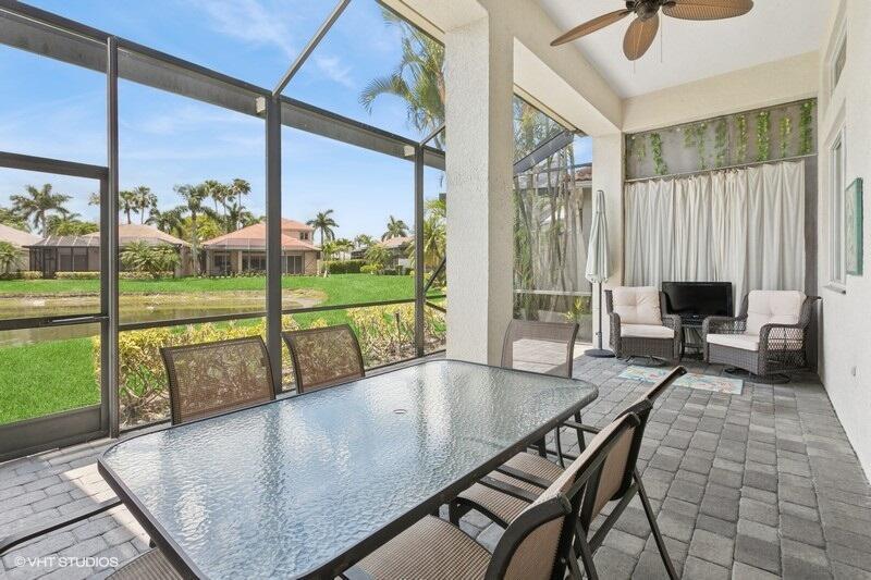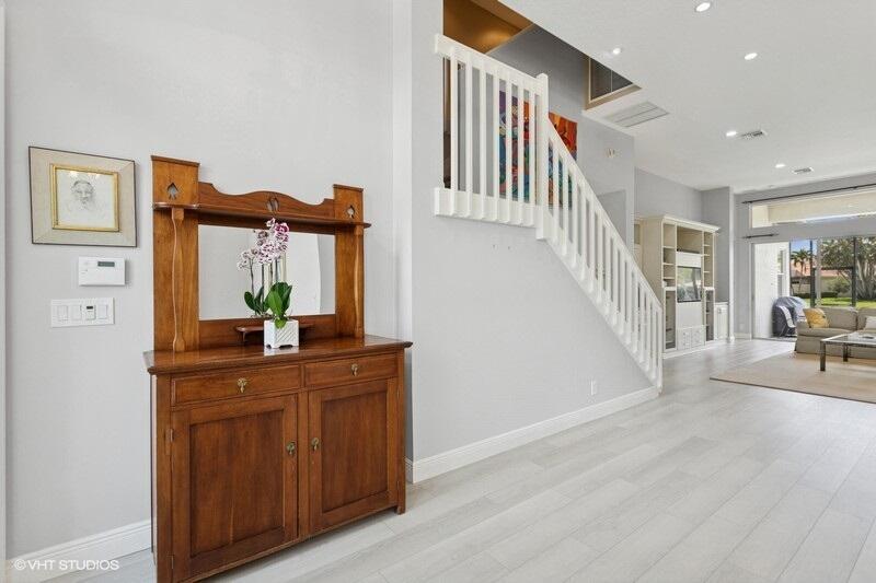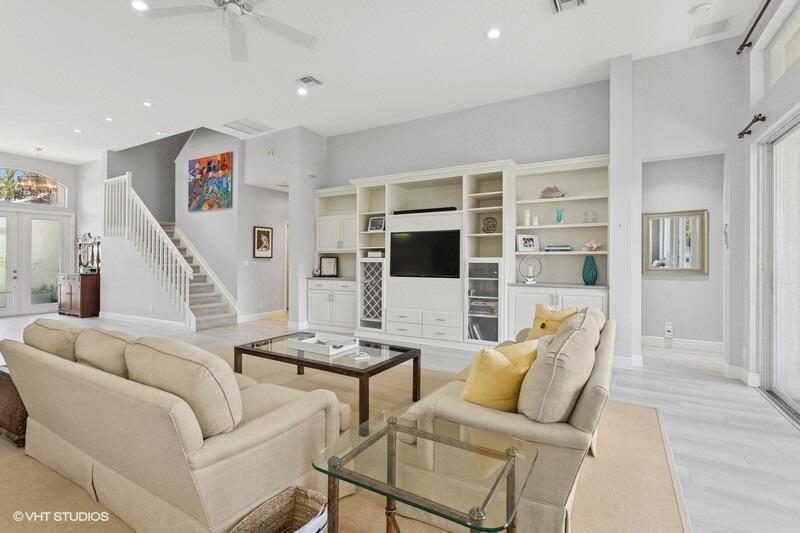 THIS PRINCETON MODIFIED MODEL OFFERS 3BR PLUS DEN, 2.1 BA & WATERFRONT VIEWS WITH AN OPEN FLOOR PLAN AND PLANKED FLOORING. THE LARGE GREAT ROOM, RECENTLY PAINTED, FEATURES A CONTEMPORARY STYLED WALL UNIT & TRIPLE SLIDING GLASS DOORS TO THE EXTENDED LANAI FEATURING DIRECT WATER VIEWS. THE OPEN KITCHEN FEATURES WHITE QUARTZ COUNTERTOPS, REPLACED S/S APPLIANCES, WHITE CABINETRY AND RECESSED LED LIGHTING. THE PRIMARY BEDROOM EN SUITE WITH 3 WALK-IN CLOSETS & BRIGHT WHITE PLANTATION SHUTTERS AND IT IS LOCATED ON THE MAIN FLOOR. THERE ARE 2 LARGE GUEST BEDROOMS UPSTAIRS OFFERING ADDED PRIVACY WITH A JACK AND JILL SHARED BATH. THE GRANDE IS LOCATED CLOSE TO THE MAIN GATE FOR EASY ACCESS IN AND OUT AND FEATURES A RESIDENT-ONLY CLUBHOUSE/POOL.