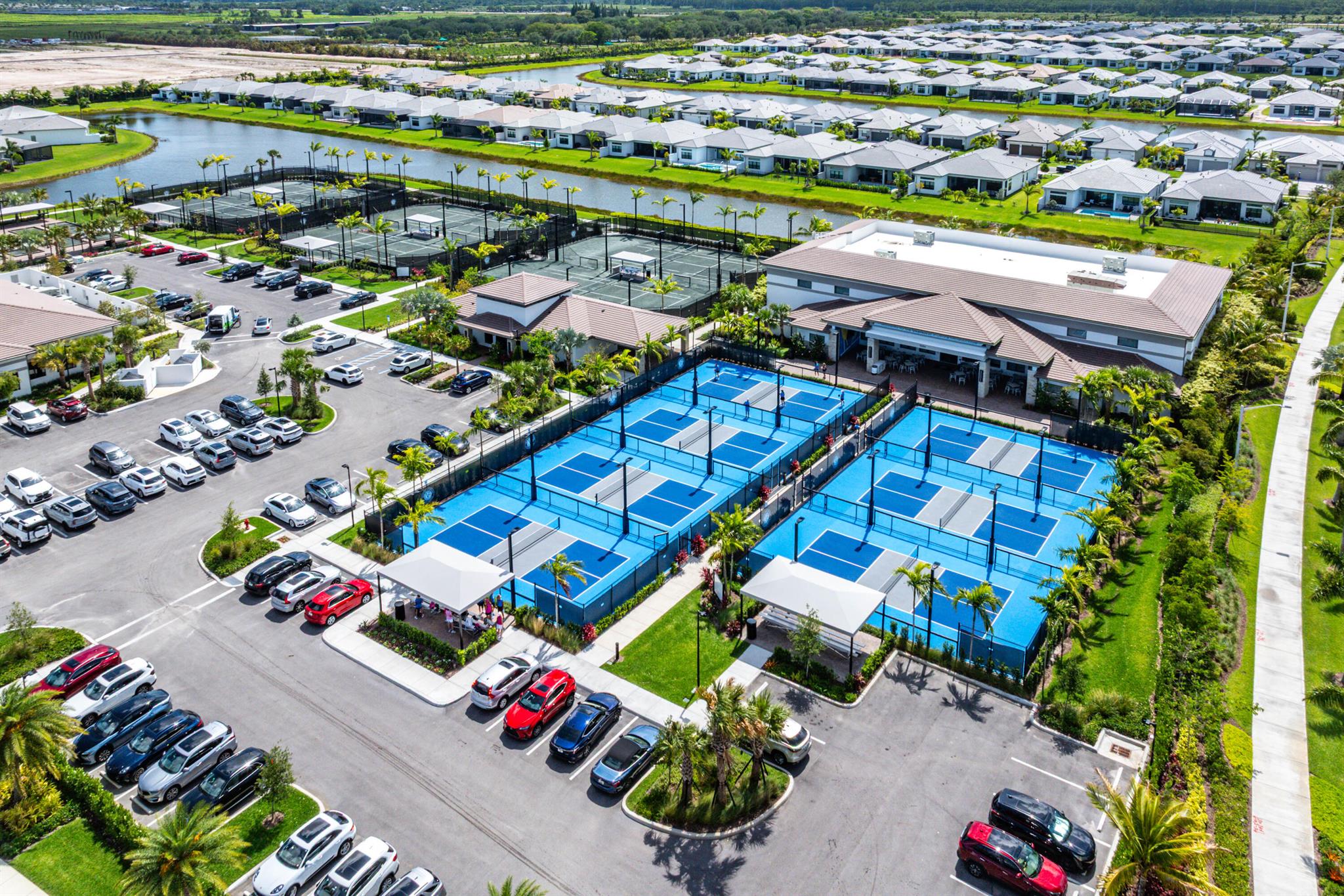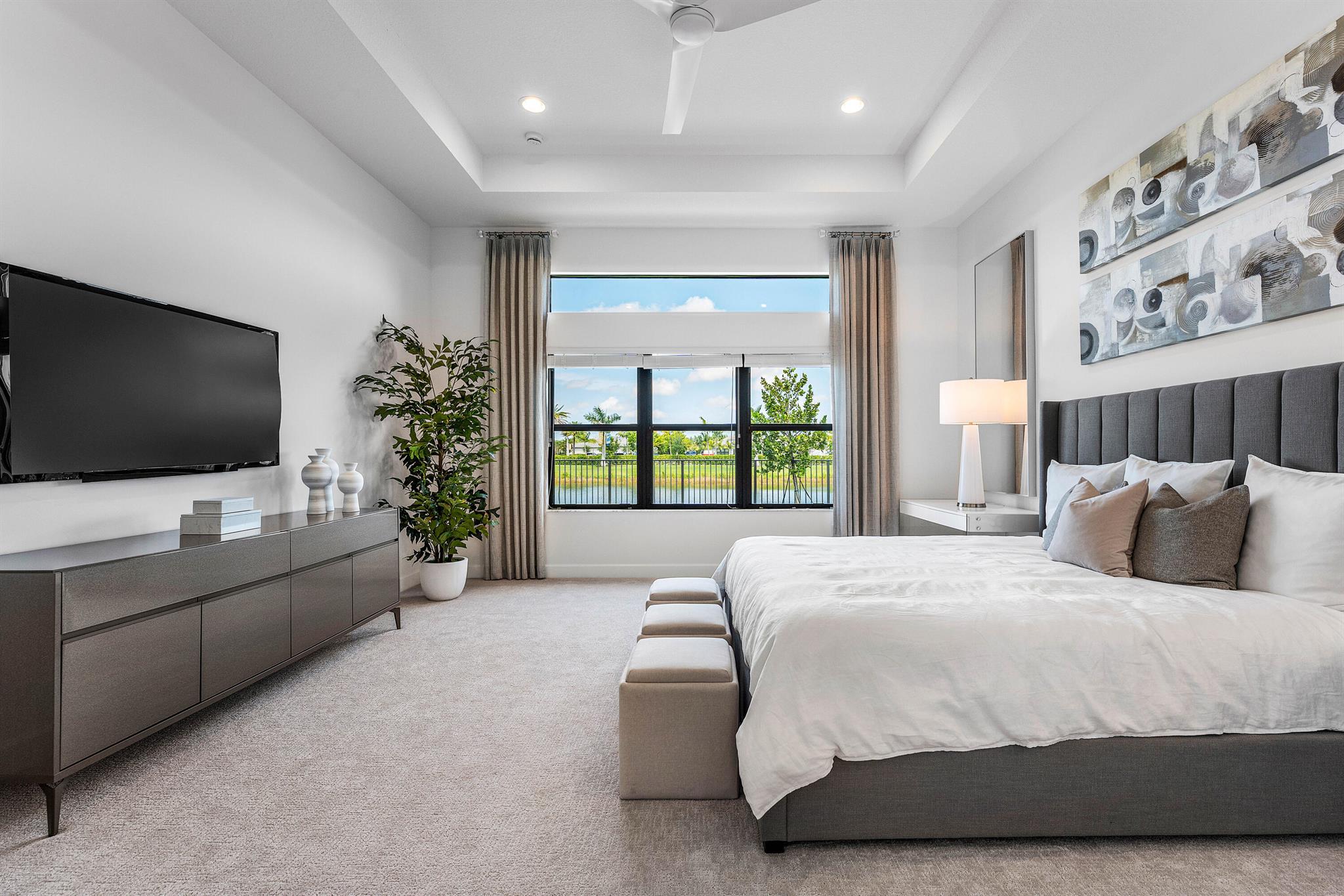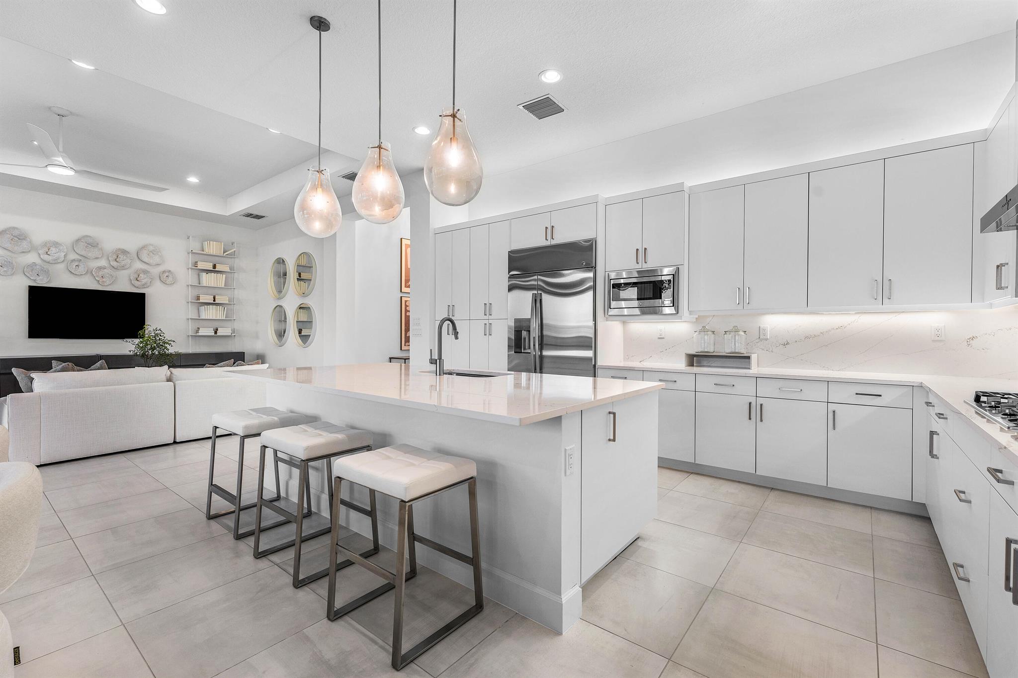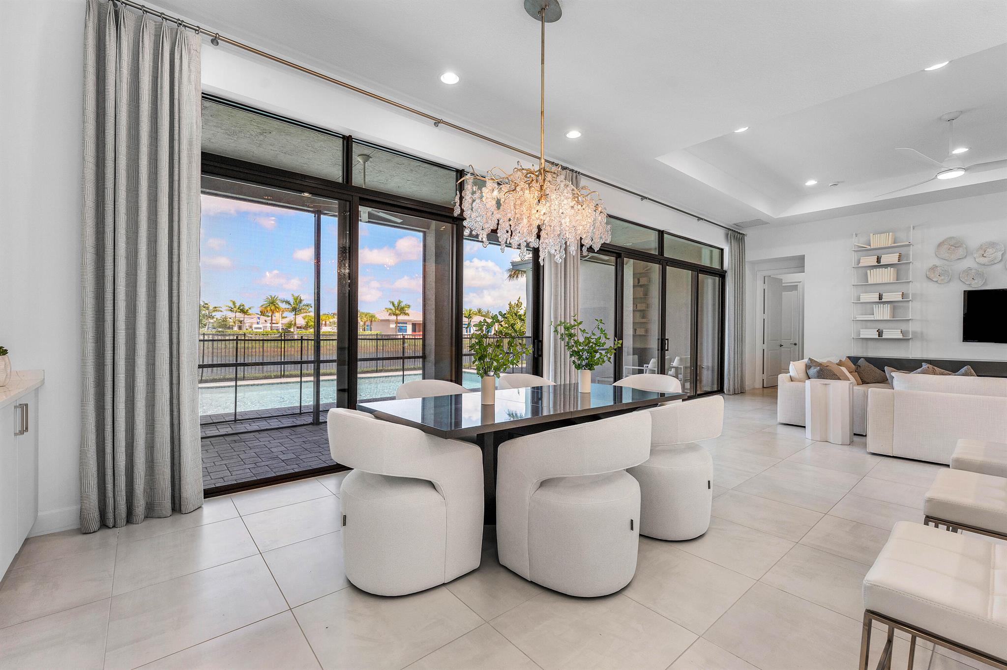 This sought after, never lived in, open concept Napa model sits on a lovely lakefront lot backing east. The beautiful home is being offered partially furnished and features impact windows, glass entry doors, porcelain tile in main living areas, designer light fixtures, fans, hi-hats, upgraded baths & more! The gourmet kitchen has contemporary white acrylic matte cabinets, quartz countertops, stainless steel appliances including stainless hood, built-in pantry cabinets and all the bells & whistles! There are three ensuite guest bedrooms, a large club room/den/office and a formal powder room. The large master suite has a luxurious bath. You'll love sitting on the covered screened patio the entire width of the home, lounging on the open patio or swimming in the pool looking out at the lake!
