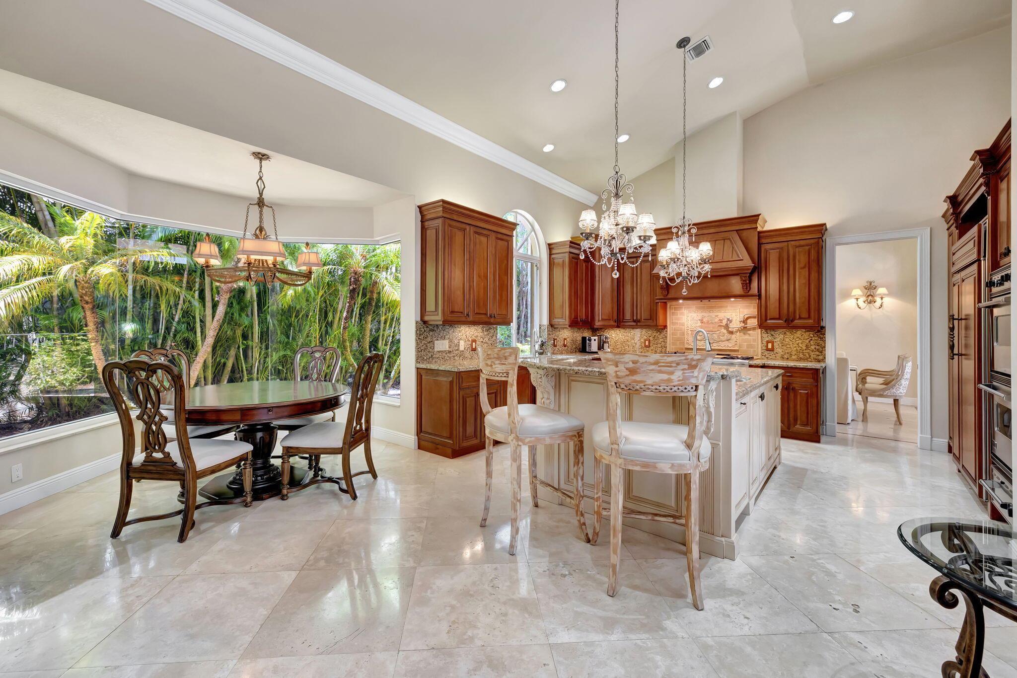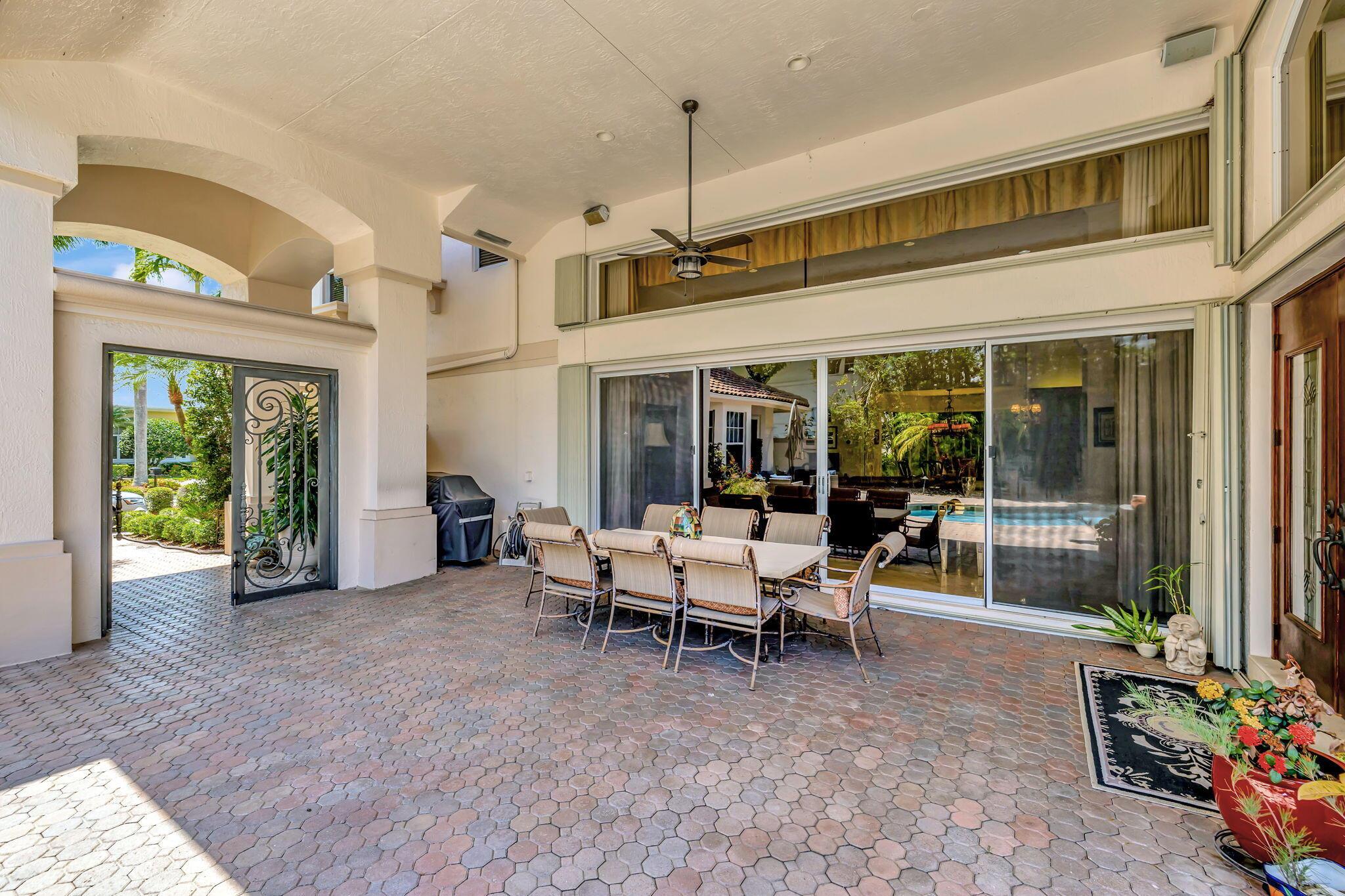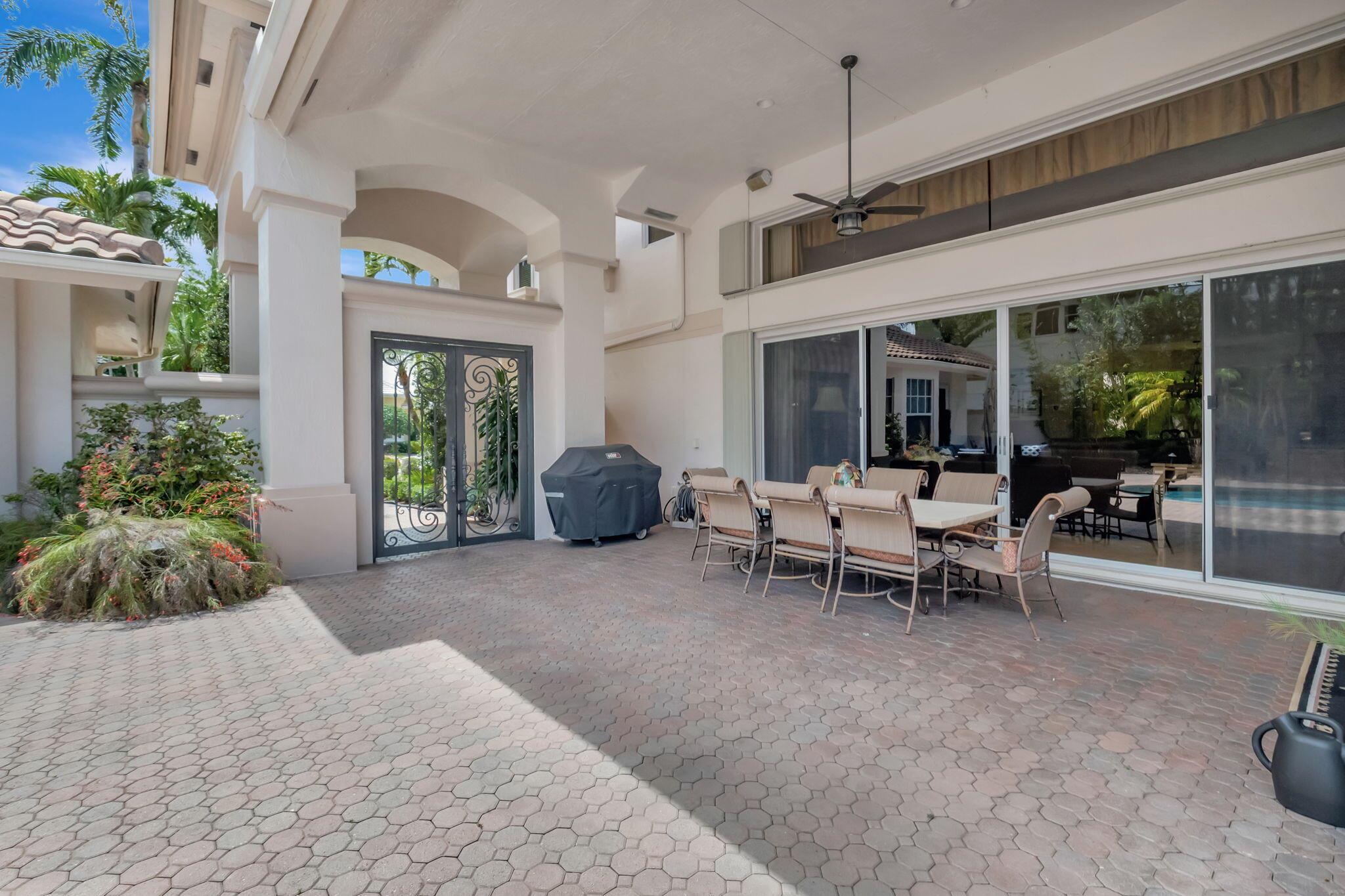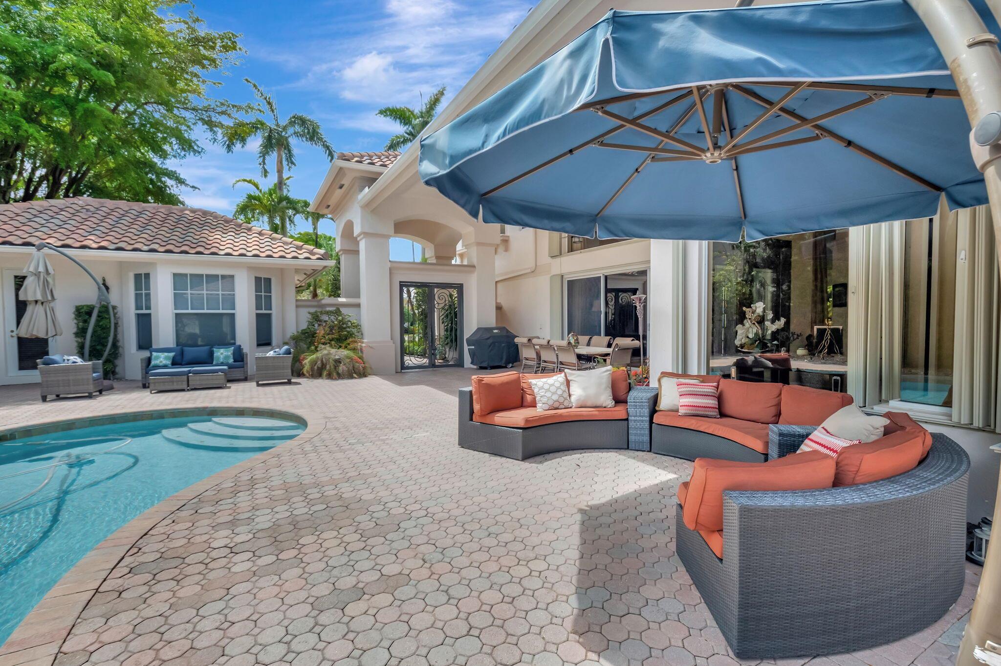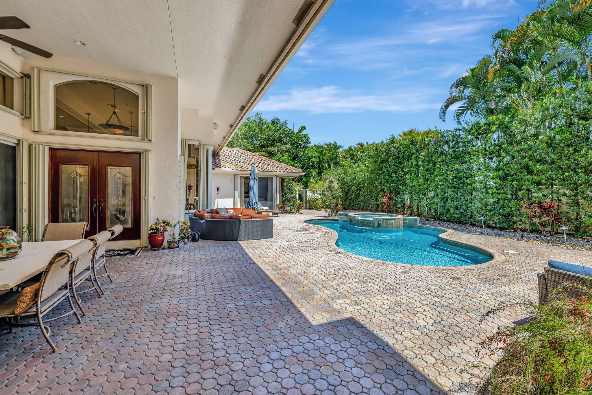 Beautiful two story courtyard style home in Boca Grove featuring six bedrooms with ensuite baths, including a one bedroom/one bath detached guesthouse. This residence offers volume ceilings allowing for plenty of light and an open floor plan which is great for entertaining. The chef's kitchen boasts a gas cooktop, two ovens, two dishwashers and two sinks, and opens to a breakfast area and family room. The living space is completed with a spacious living room and formal dining room. The primary suite, with his/her custom closets and lavish bath, looks out onto the courtyard patio and pool. There are two more guest bedrooms on the main floor, each with their own bath, and two bedrooms and a second laundry room upstairs. The detached guest house is currently set up as a theatre with a