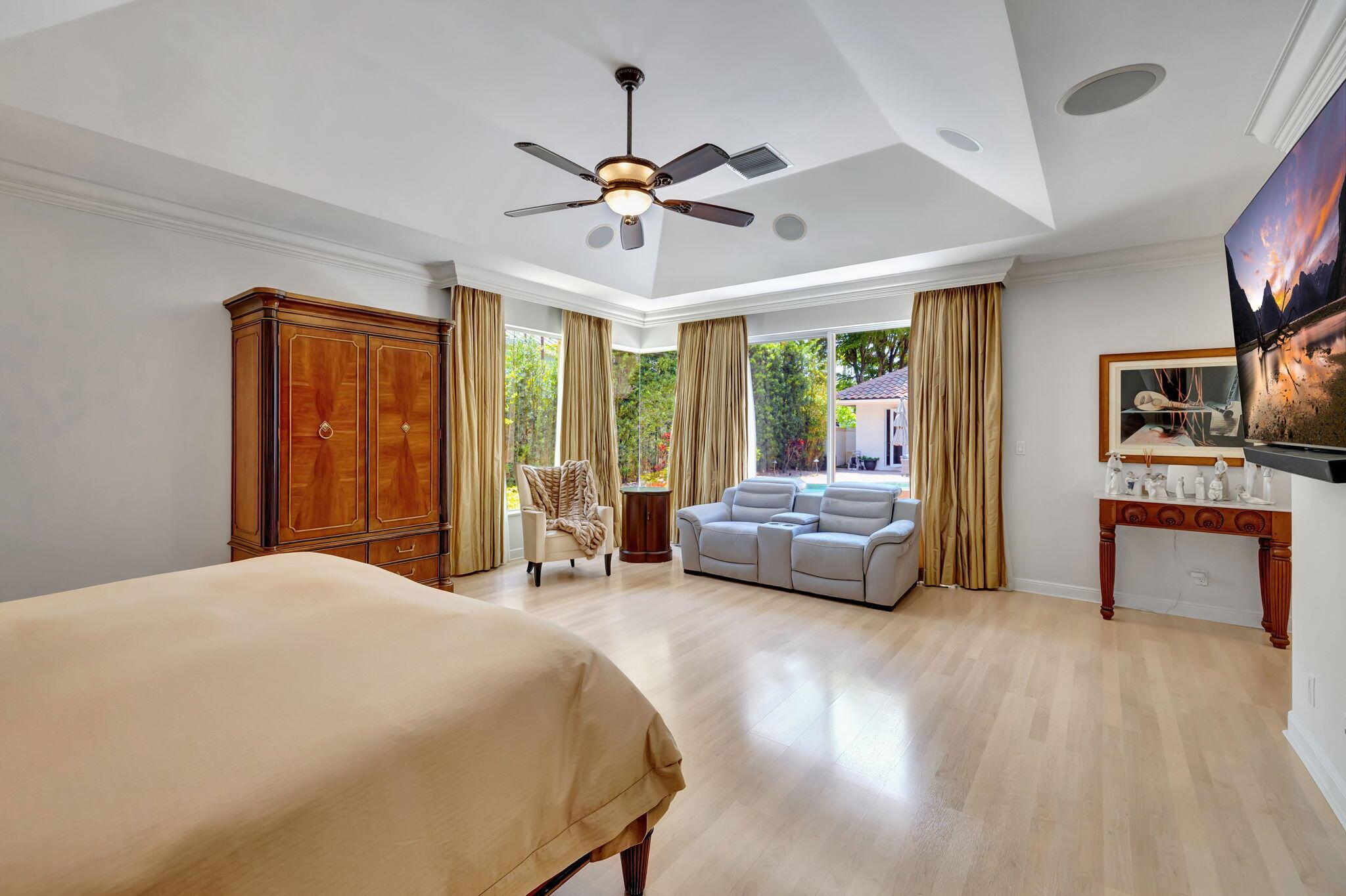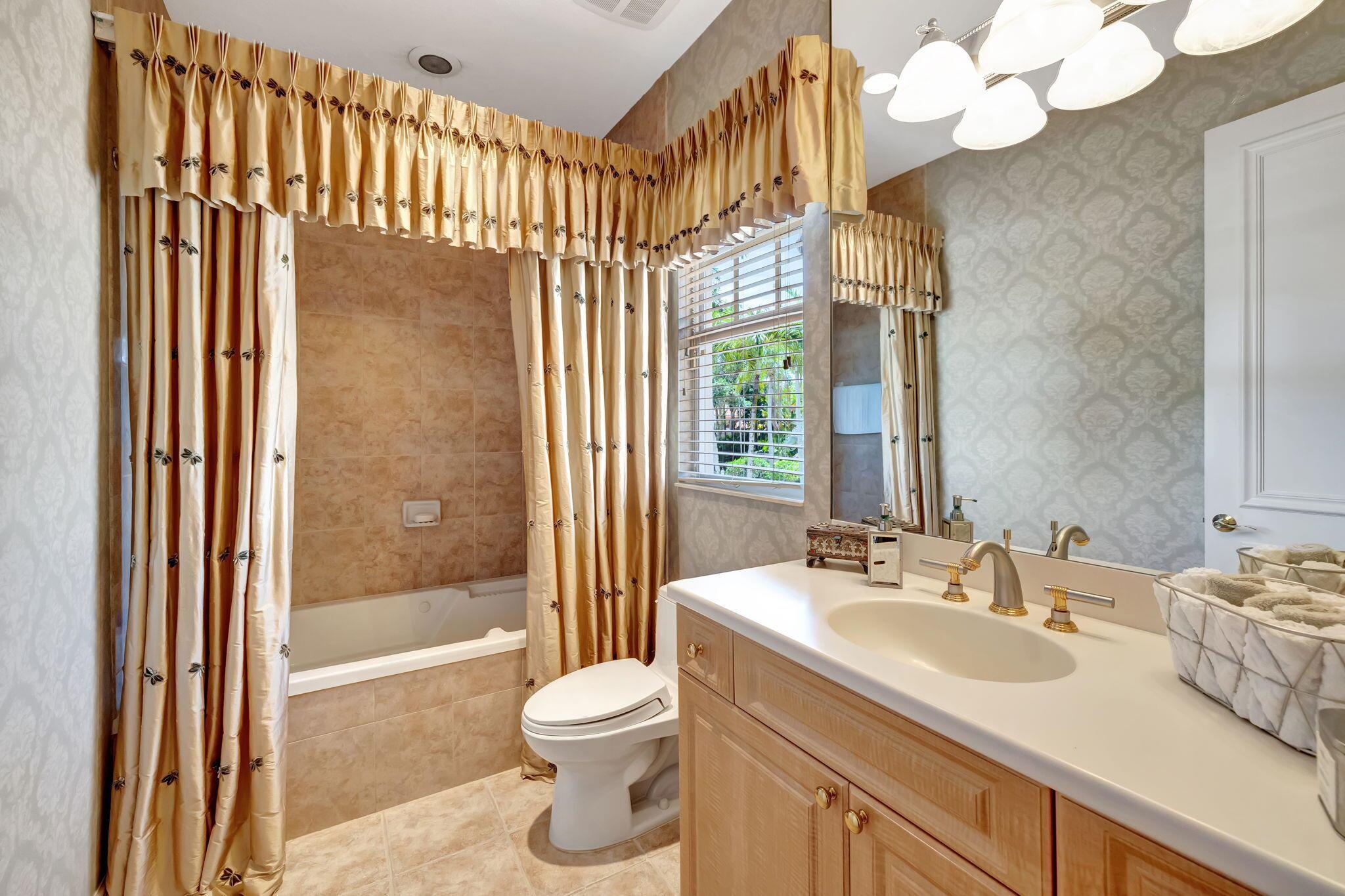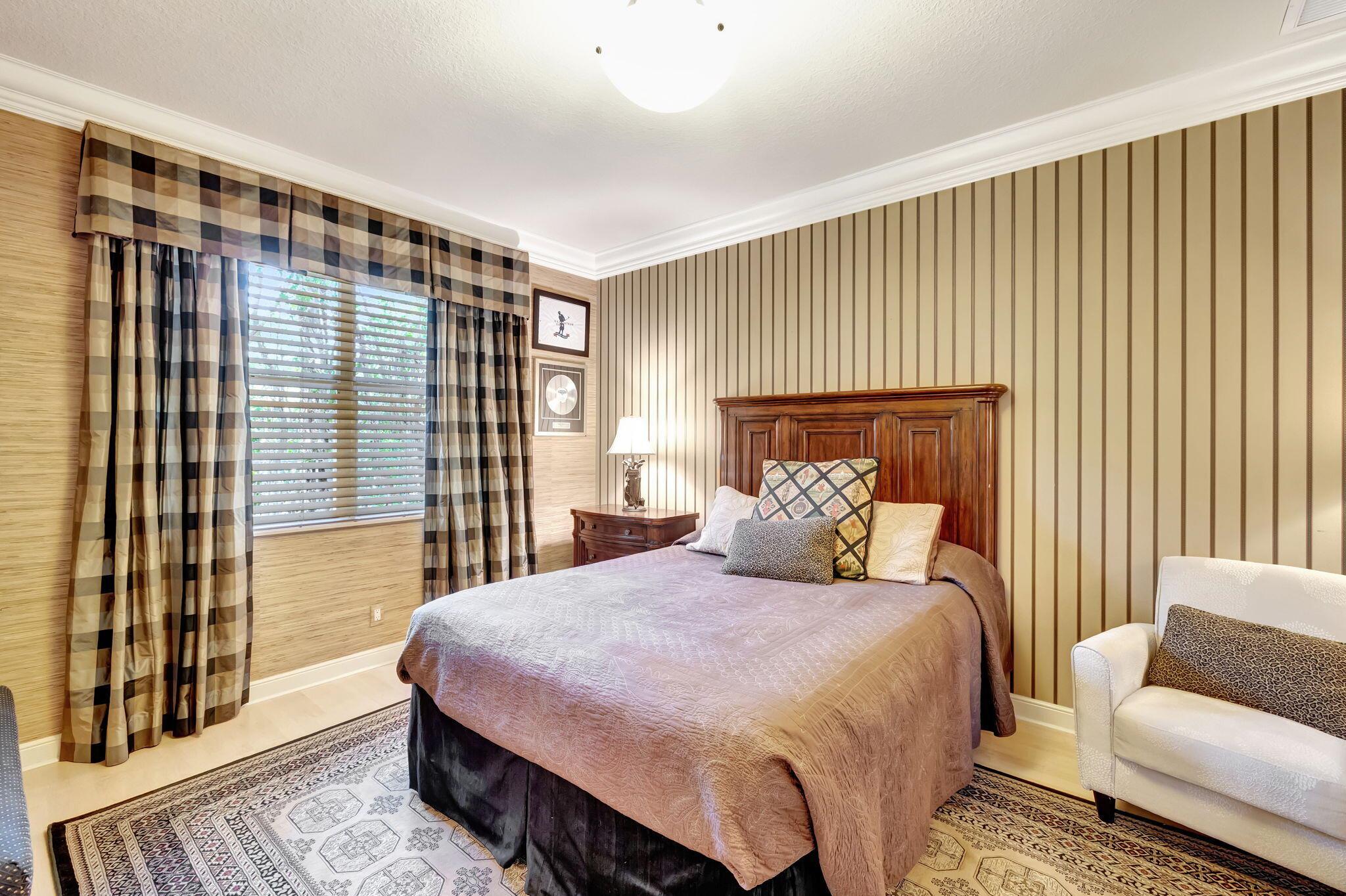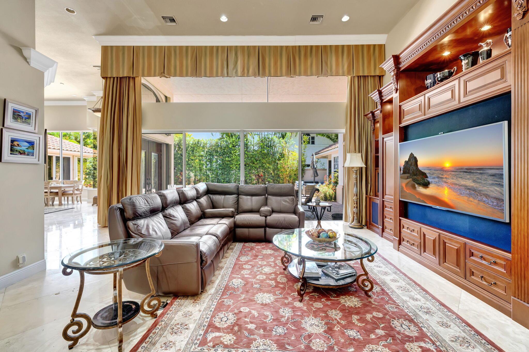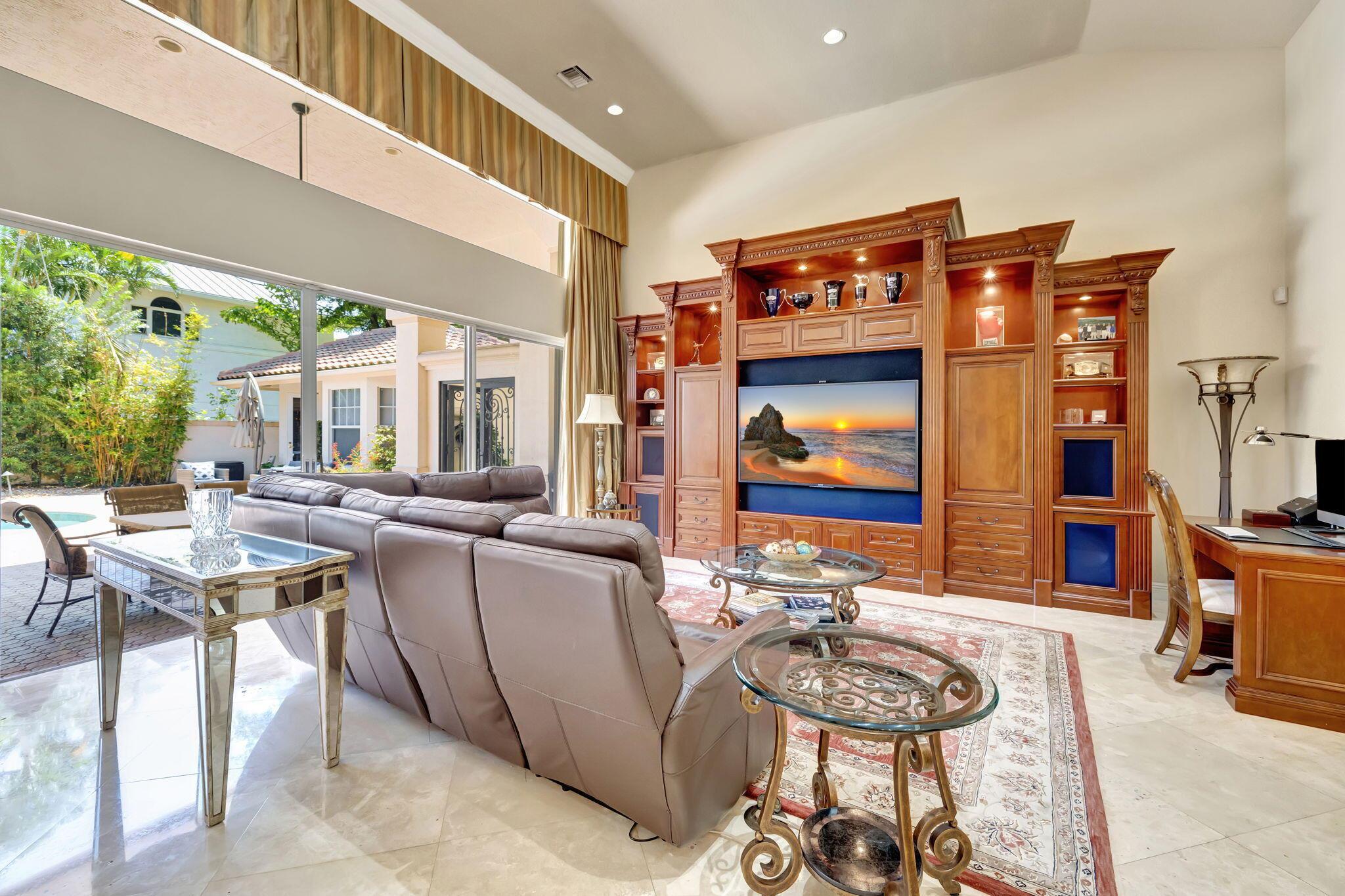 Beautiful two story courtyard style home in Boca Grove featuring six bedrooms with ensuite baths, including a one bedroom/one bath detached guesthouse. This residence offers volume ceilings allowing for plenty of light and an open floor plan which is great for entertaining. The chef's kitchen boasts a gas cooktop, two ovens, two dishwashers and two sinks, and opens to a breakfast area and family room. The living space is completed with a spacious living room and formal dining room. The primary suite, with his/her custom closets and lavish bath, looks out onto the courtyard patio and pool. There are two more guest bedrooms on the main floor, each with their own bath, and two bedrooms and a second laundry room upstairs. The detached guest house is currently set up as a theatre with a