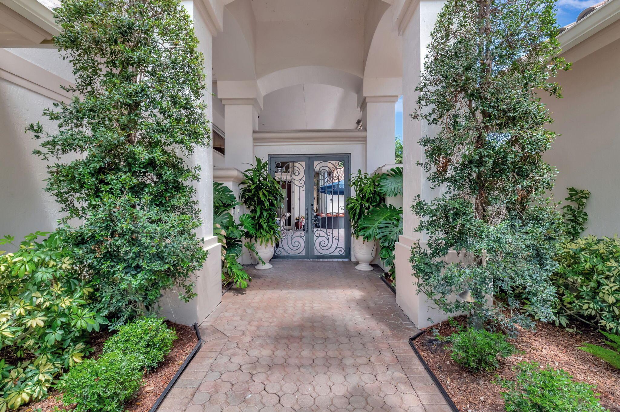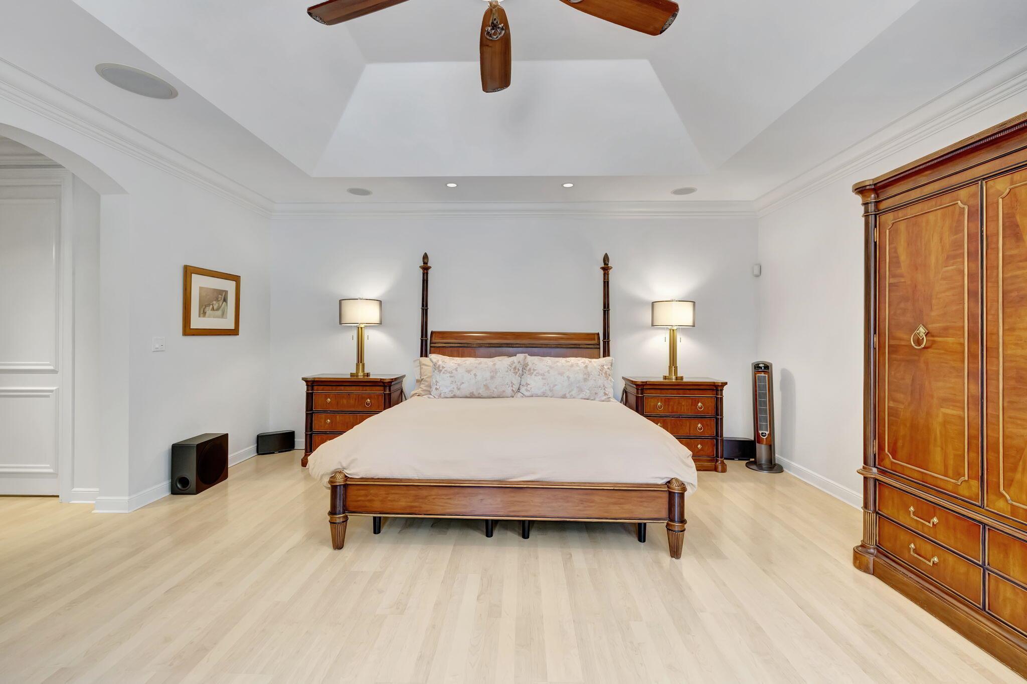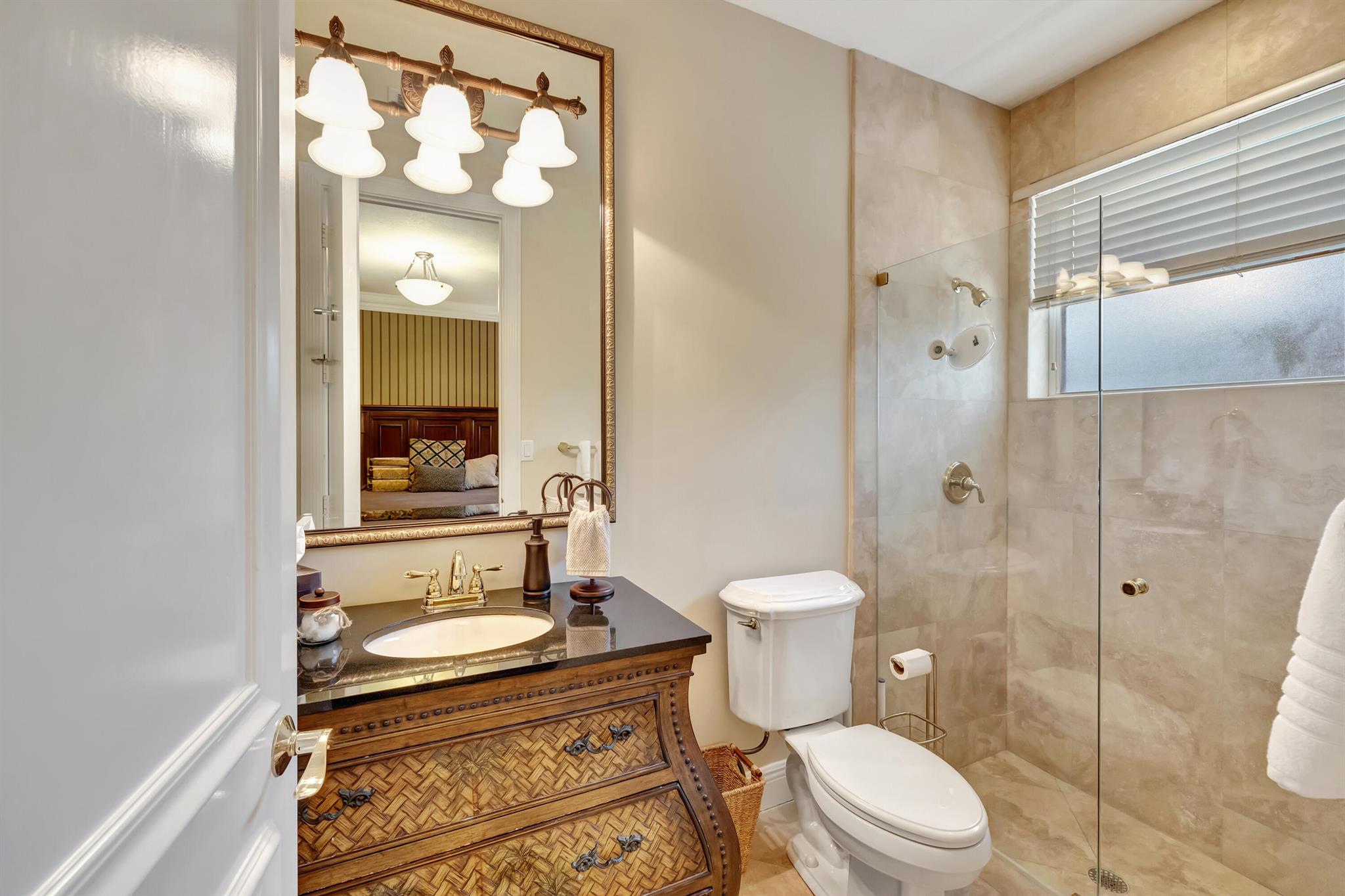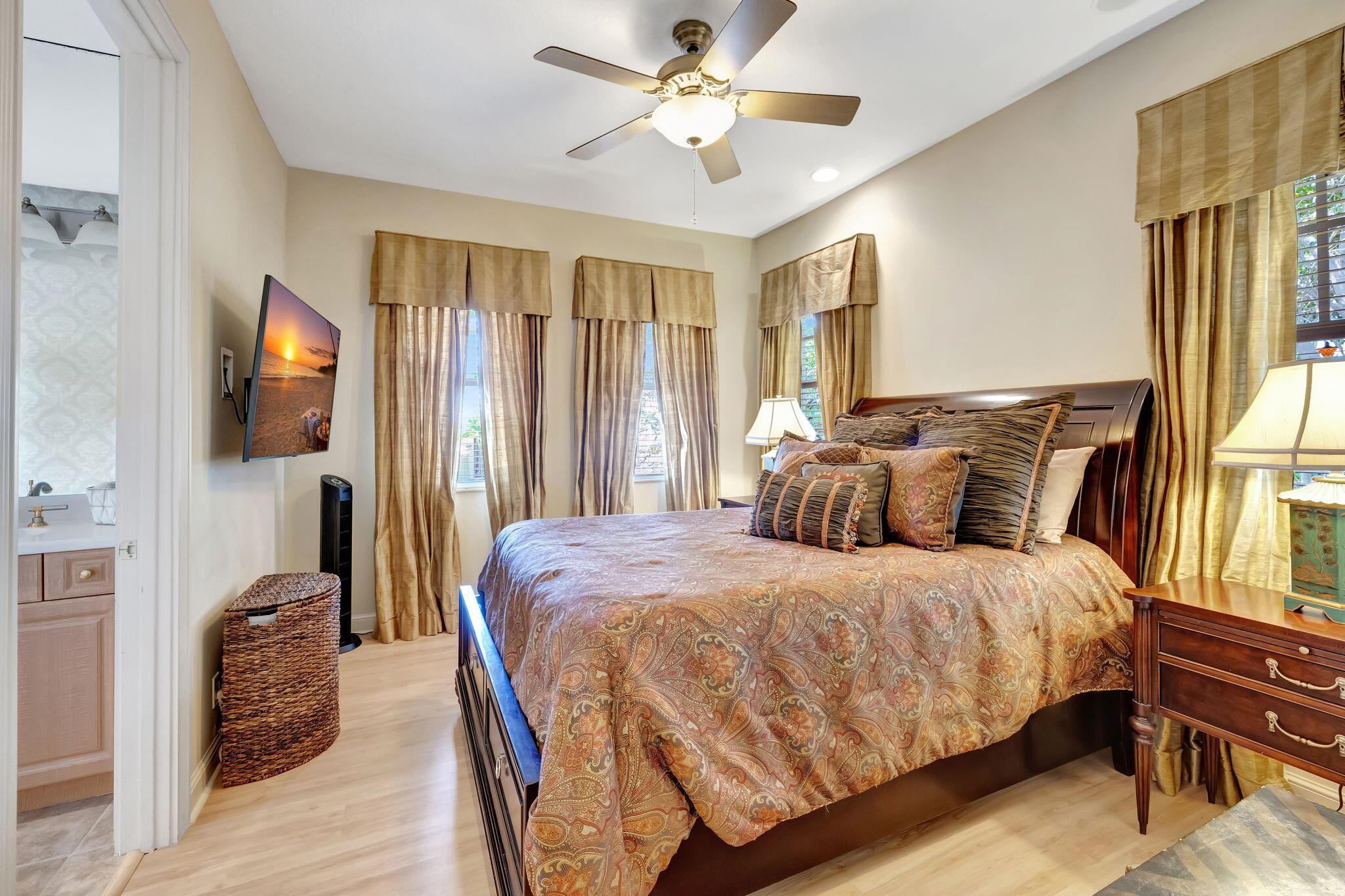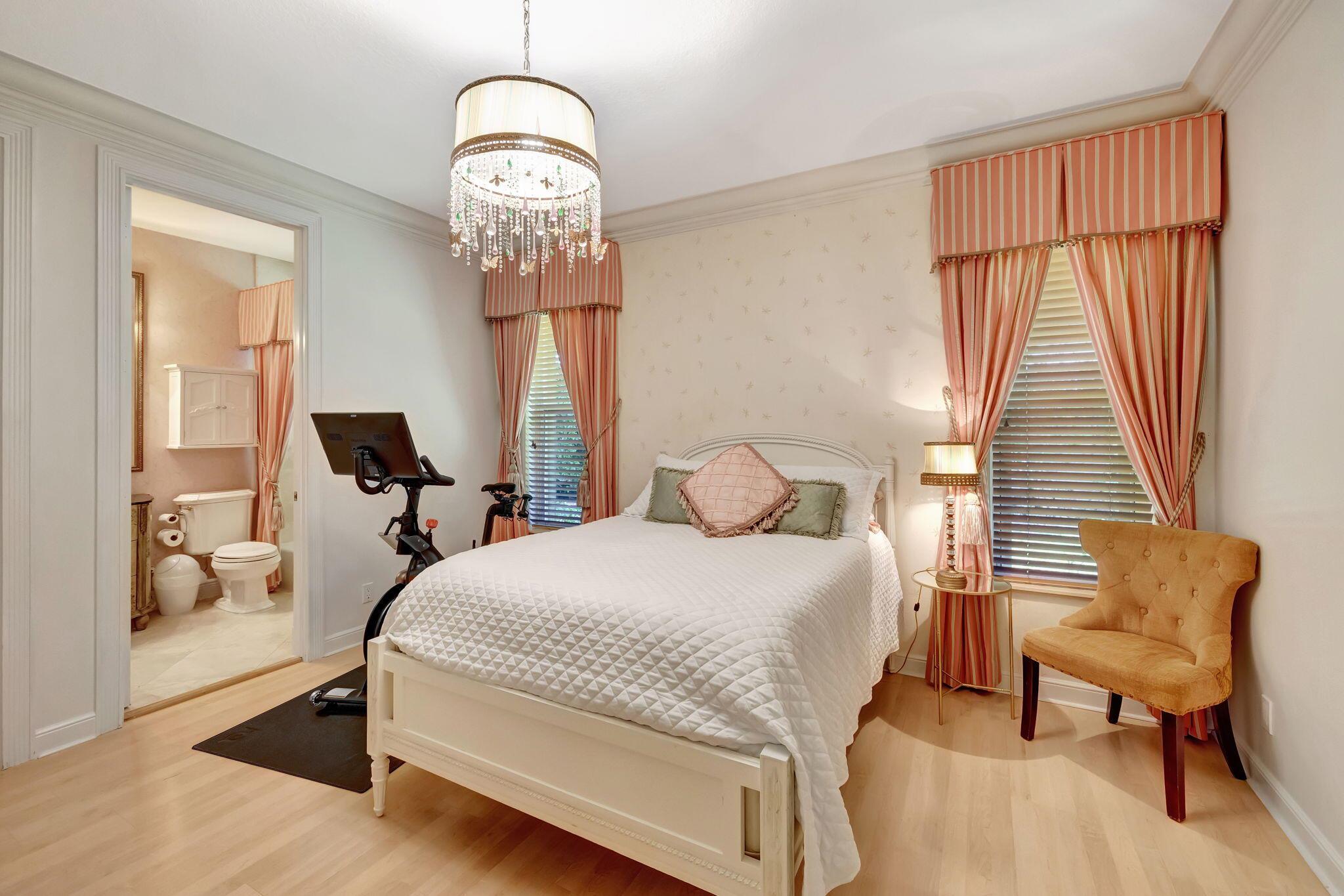 Beautiful two story courtyard style home in Boca Grove featuring six bedrooms with ensuite baths, including a one bedroom/one bath detached guesthouse. This residence offers volume ceilings allowing for plenty of light and an open floor plan which is great for entertaining. The chef's kitchen boasts a gas cooktop, two ovens, two dishwashers and two sinks, and opens to a breakfast area and family room. The living space is completed with a spacious living room and formal dining room. The primary suite, with his/her custom closets and lavish bath, looks out onto the courtyard patio and pool. There are two more guest bedrooms on the main floor, each with their own bath, and two bedrooms and a second laundry room upstairs. The detached guest house is currently set up as a theatre with a