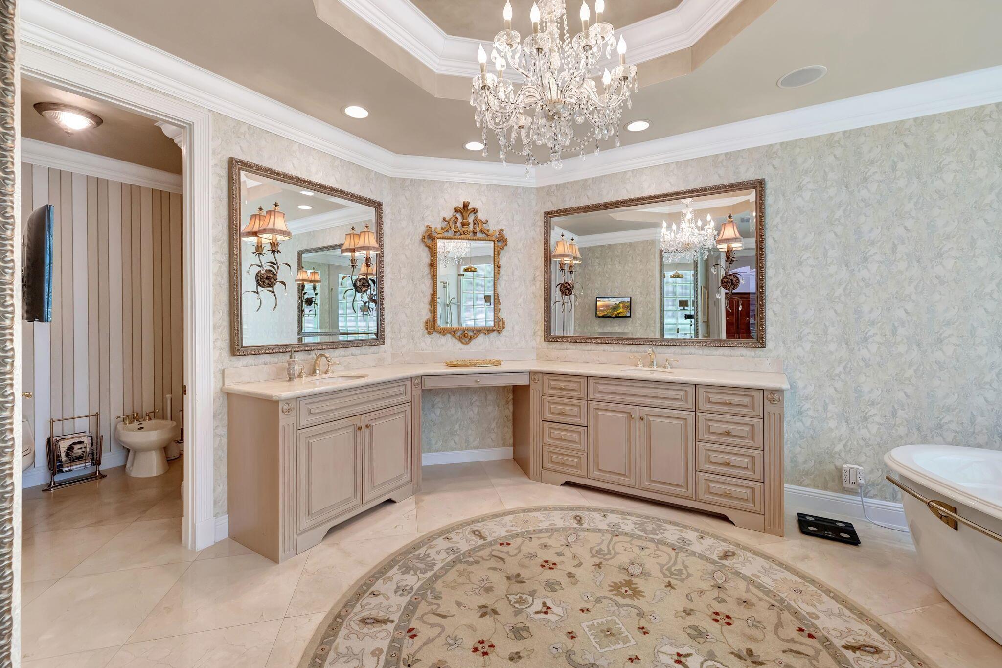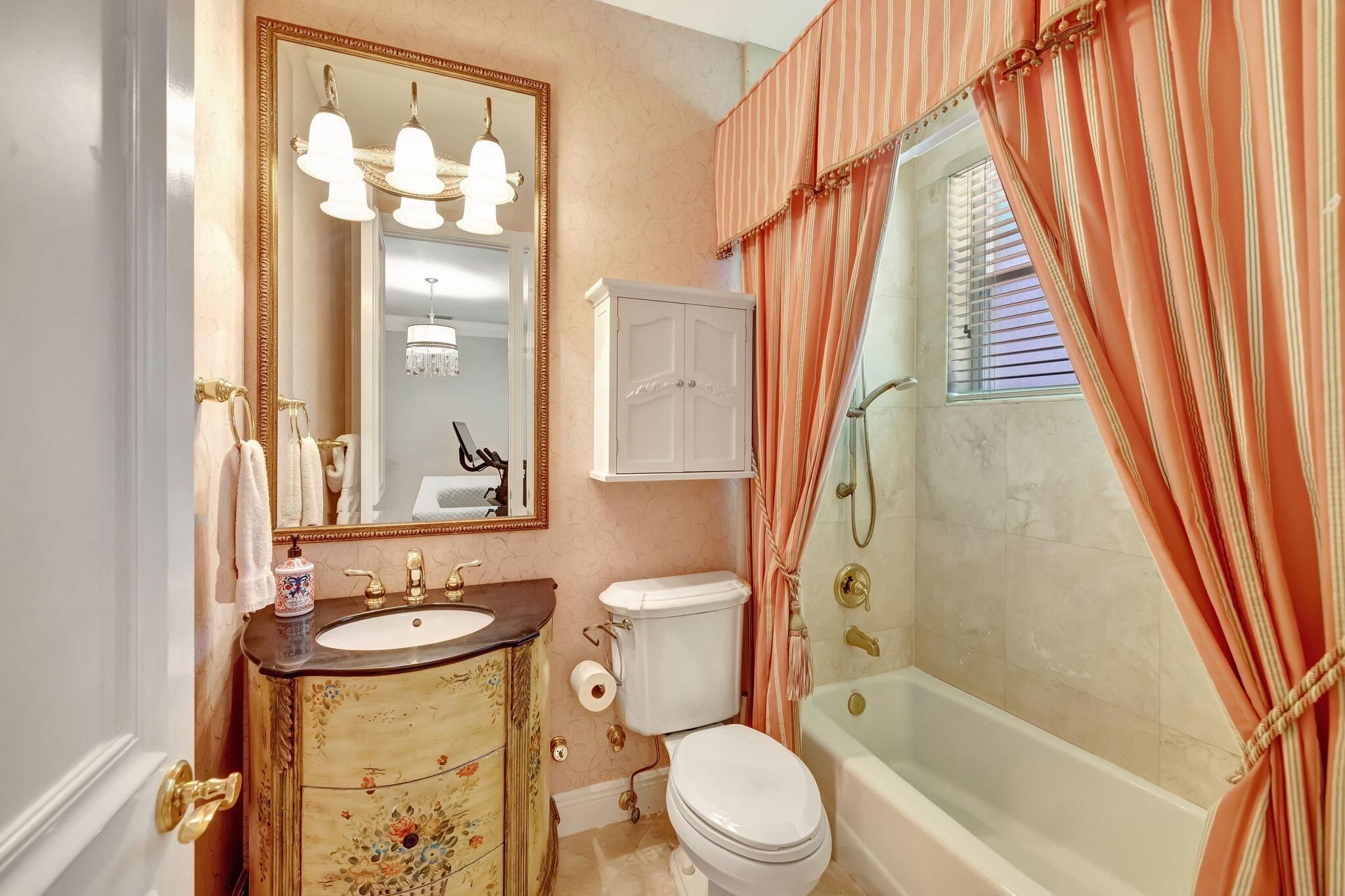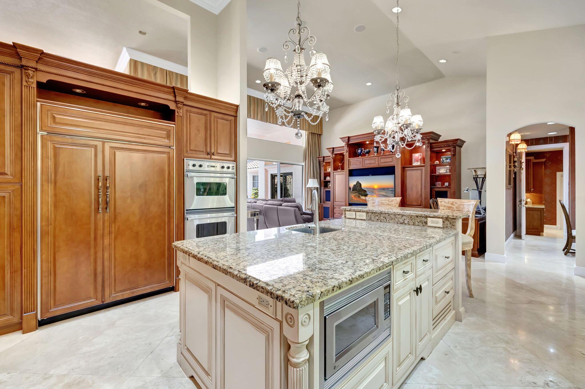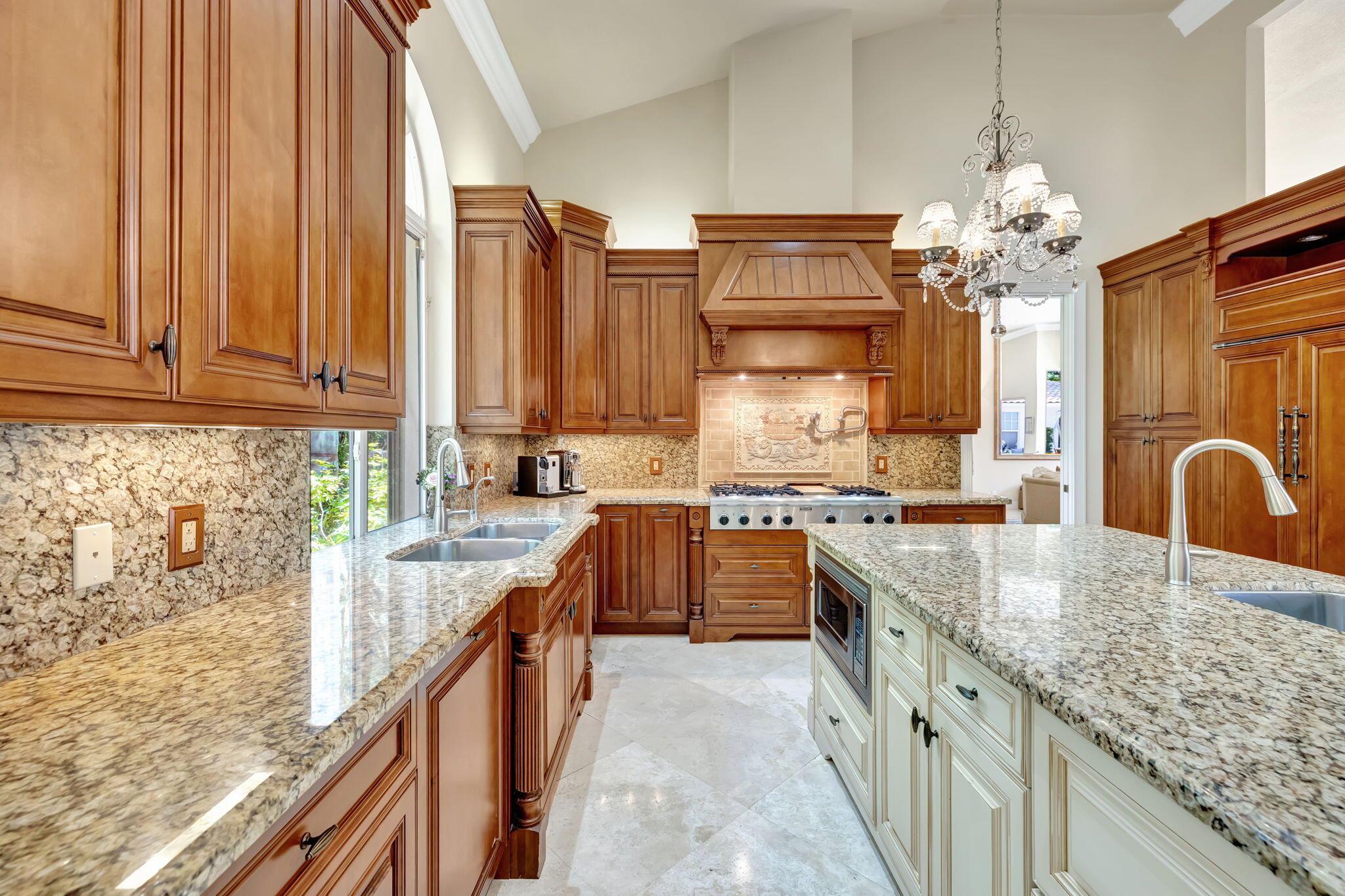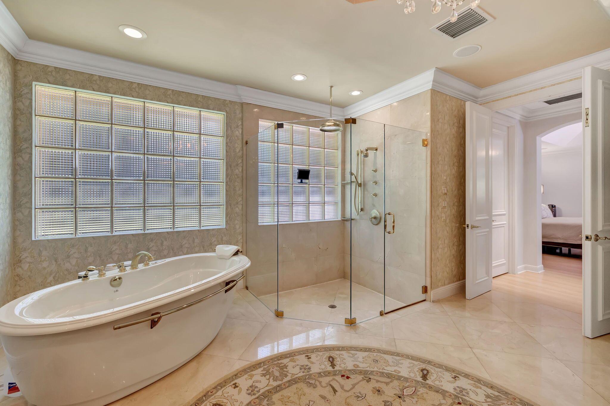 Beautiful two story courtyard style home in Boca Grove featuring six bedrooms with ensuite baths, including a one bedroom/one bath detached guesthouse. This residence offers volume ceilings allowing for plenty of light and an open floor plan which is great for entertaining. The chef's kitchen boasts a gas cooktop, two ovens, two dishwashers and two sinks, and opens to a breakfast area and family room. The living space is completed with a spacious living room and formal dining room. The primary suite, with his/her custom closets and lavish bath, looks out onto the courtyard patio and pool. There are two more guest bedrooms on the main floor, each with their own bath, and two bedrooms and a second laundry room upstairs. The detached guest house is currently set up as a theatre with a
