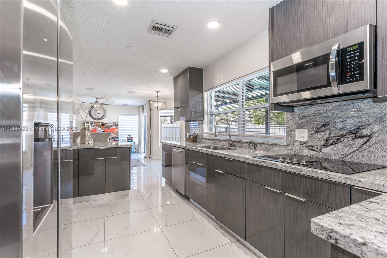 This stunning 4-bedroom, 3 full-bath home also features a spacious loft that can easily serve as a 5th bedroom. Soaring ceilings and abundant natural light greet you upon entry. Porcelain tile floors span the entire first floor, flowing into an updated kitchen with modern finishes. All bathrooms have been beautifully renovated. The home includes two brand-new A/C units, a new roof, and a new pool pump, offering comfort and peace of mind. Upstairs boasts fresh paint and warm laminate floors. The oversized backyard is perfect for entertaining, featuring a sparkling pool and a large pergola ideal for relaxing or hosting. With its flexible layout, stylish updates, and inviting outdoor space, this home is move-in ready. Schedule your private showing today!