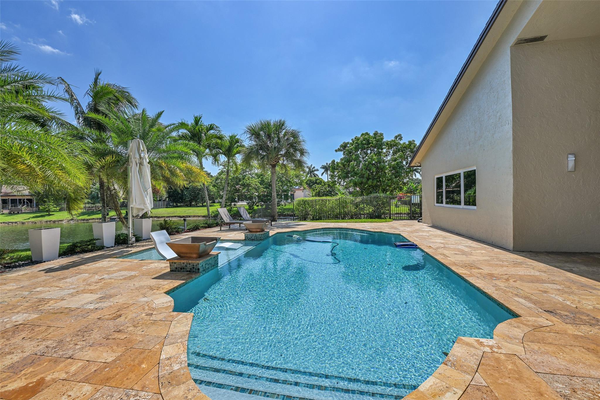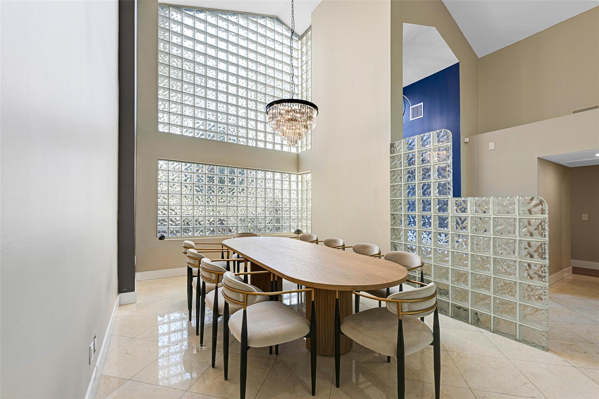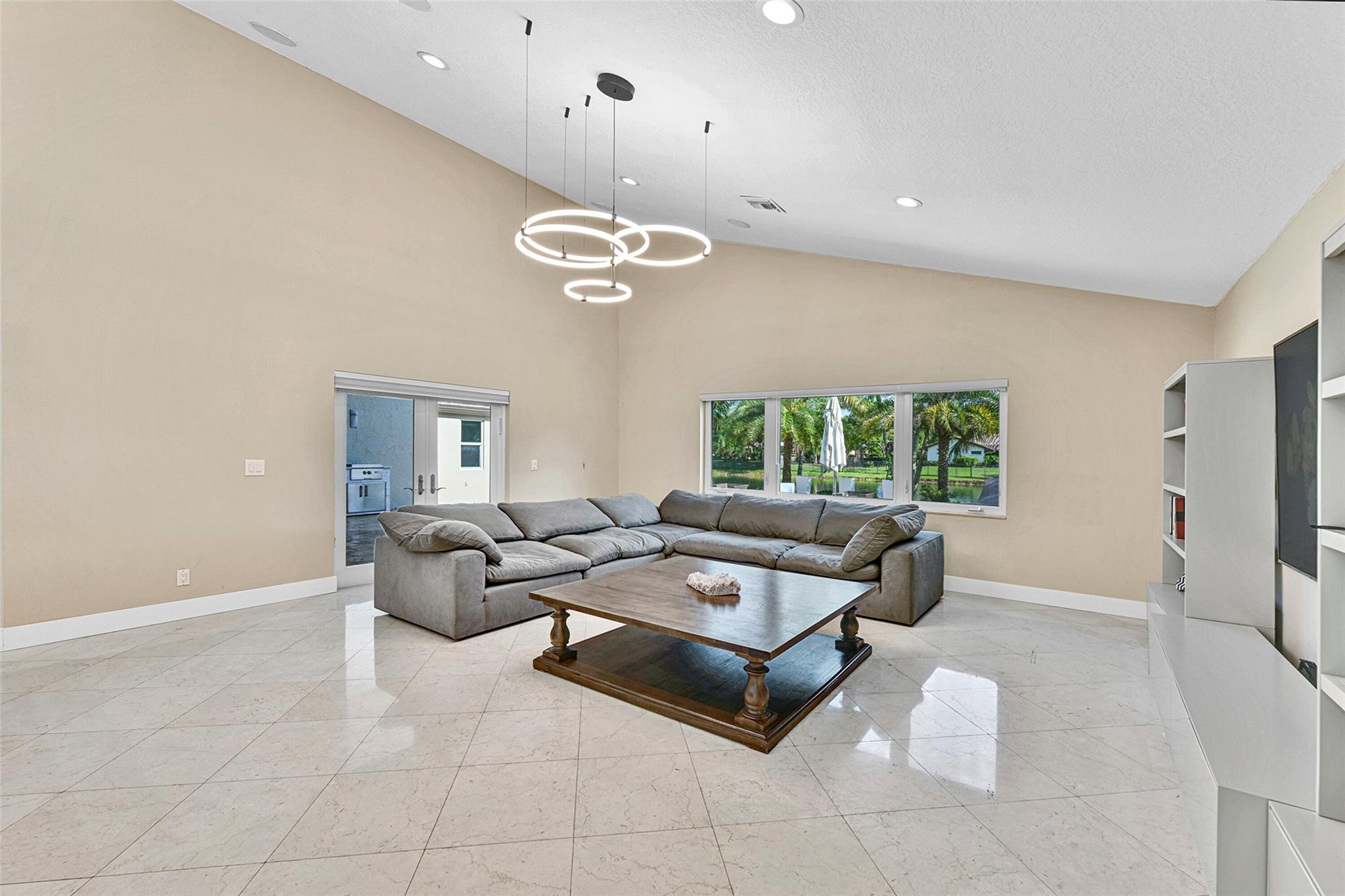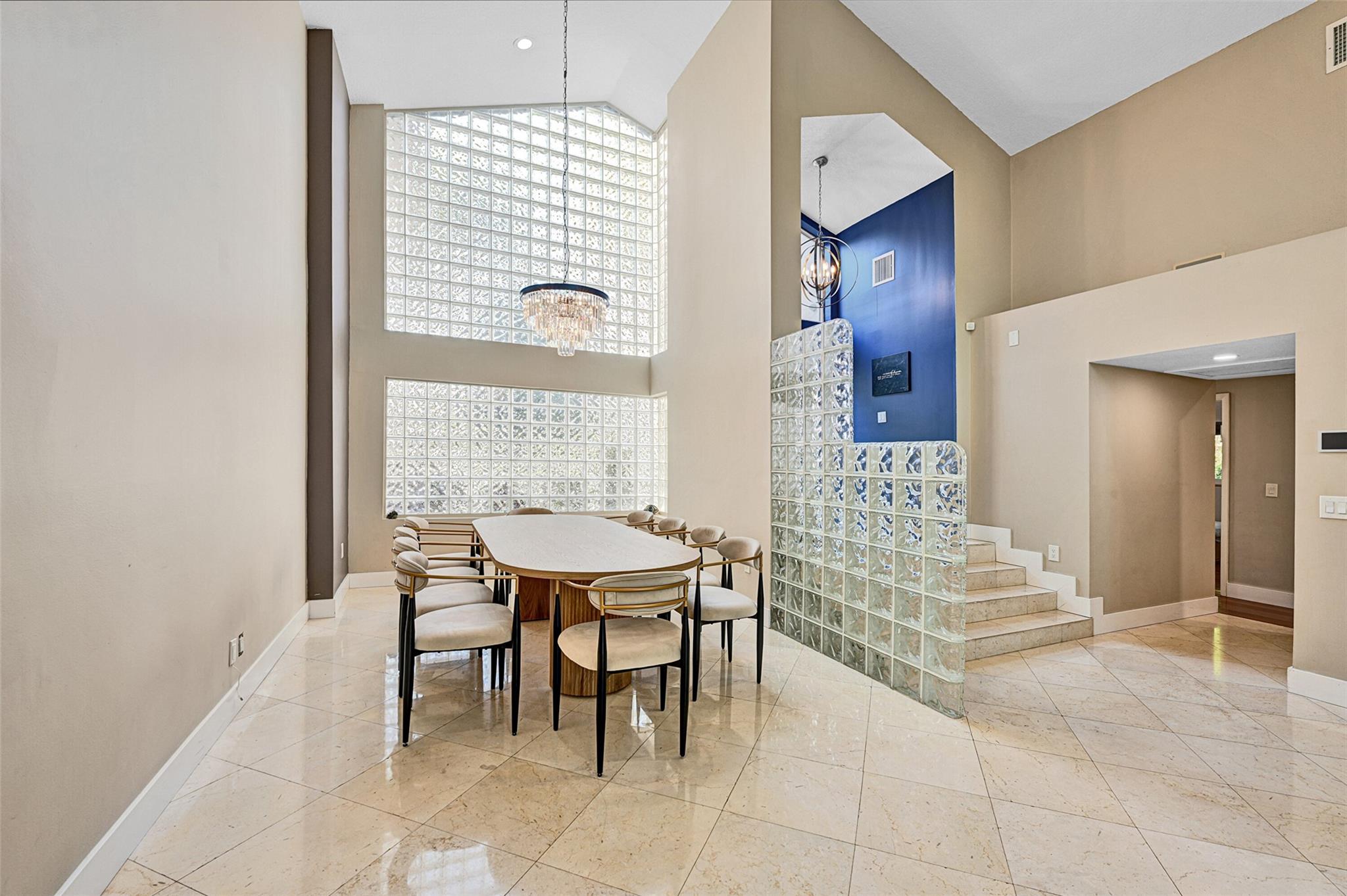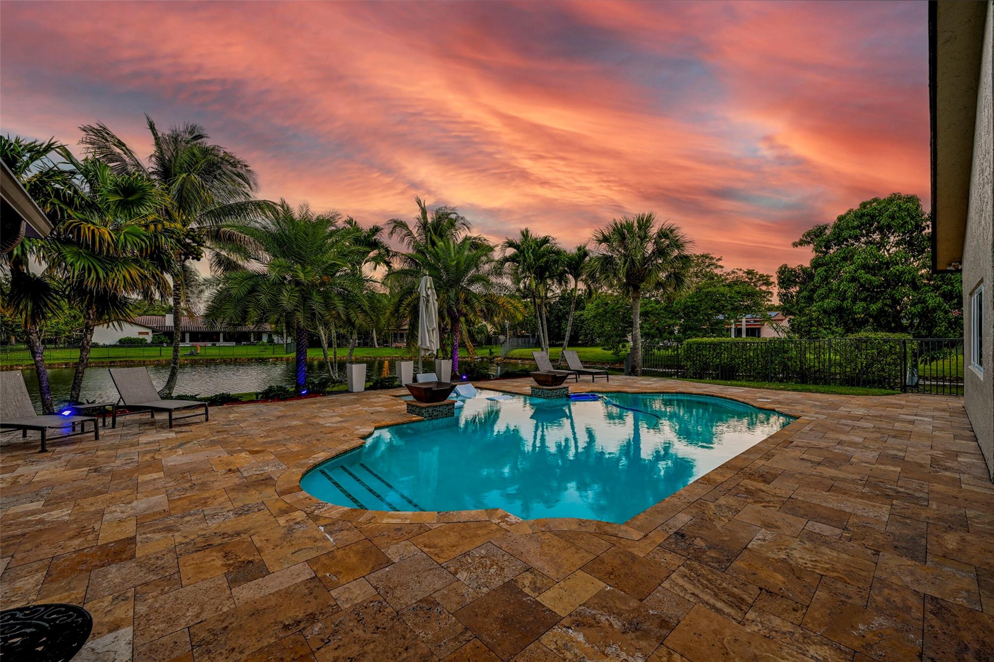 Discover refined living in the highly desirable Whispering pines community- where every home is uniquely crafted and surrounded by lush landscapes, peaceful water views and the soothing sounds of nature. This 5-bed, 3.5-bathroom estate is set on a builder's acre and offers the perfect balance of elegance and comfort. Designed with soaring 31-foot ceilings, the home features marble flooring in common areas, hardwood floors in bedrooms, and built in closets throughout. The oversized primary bedroom overlooks the pool. At the heart of the home is a chef-inspired kitchen outfitted with Thermador appliances and built in Miele coffee system. Step outside to your resort style backyard with heated pool, stunning water views, and a brand new in ground basketball hoop. This rare find won't last.