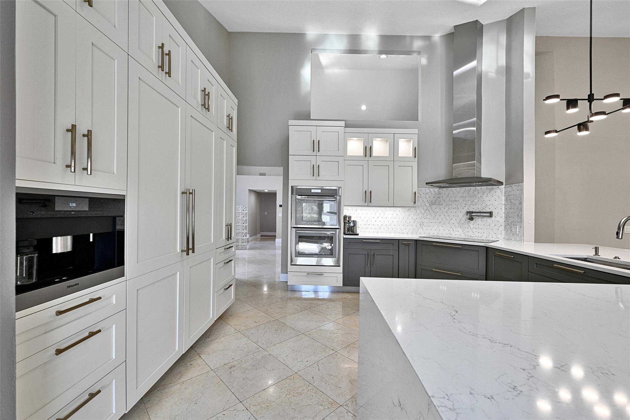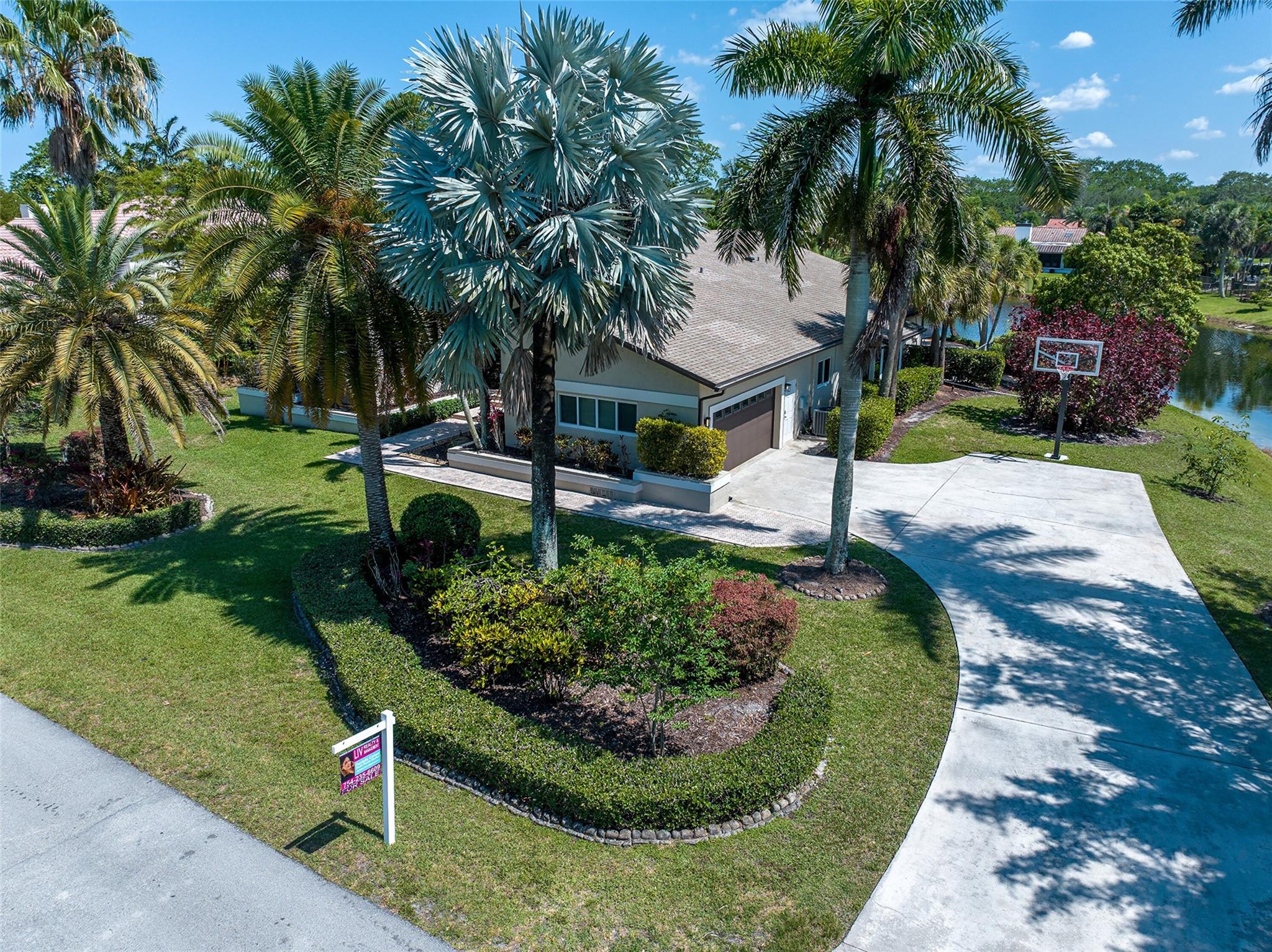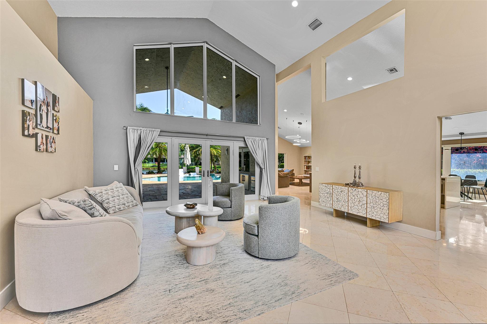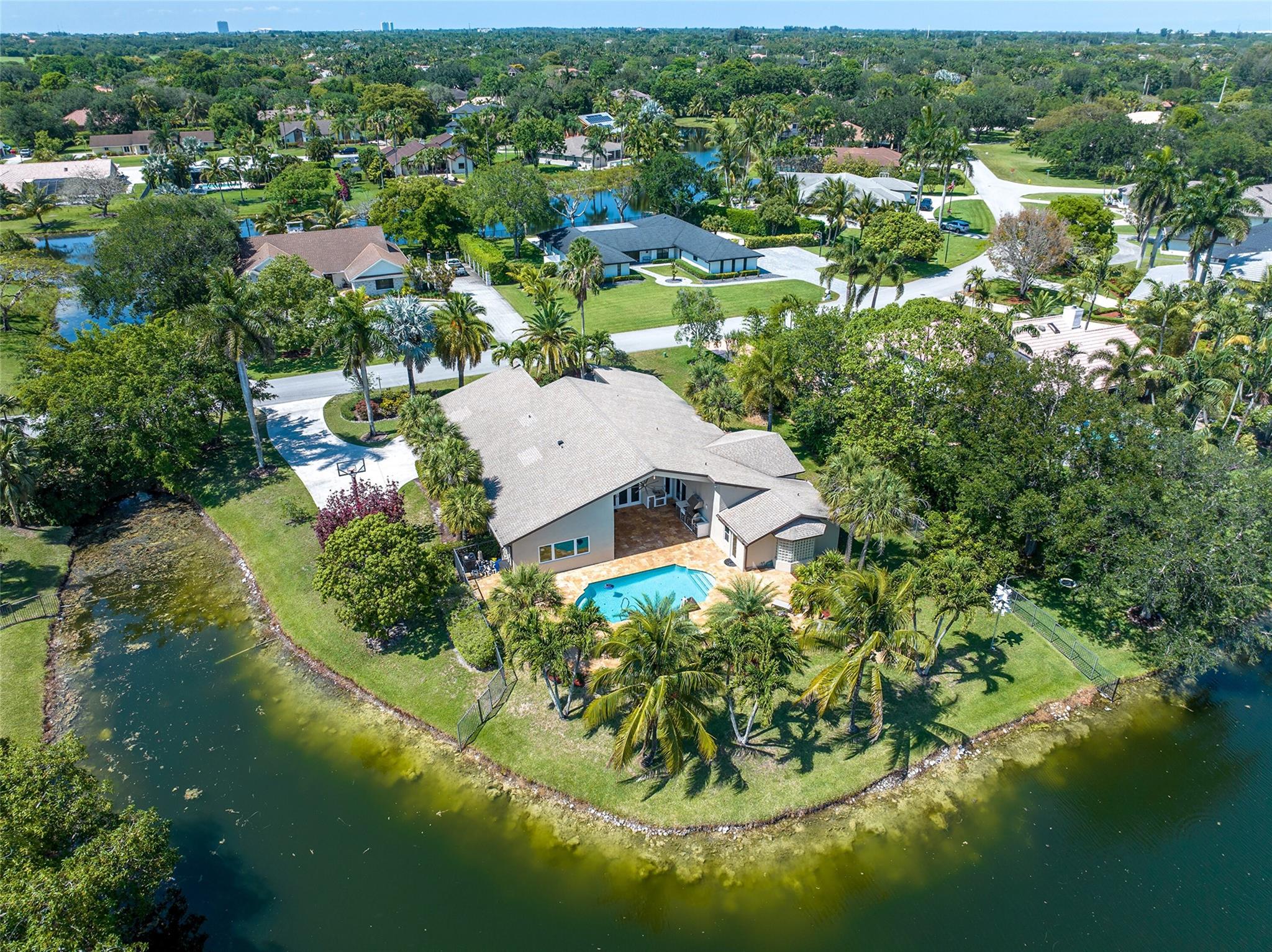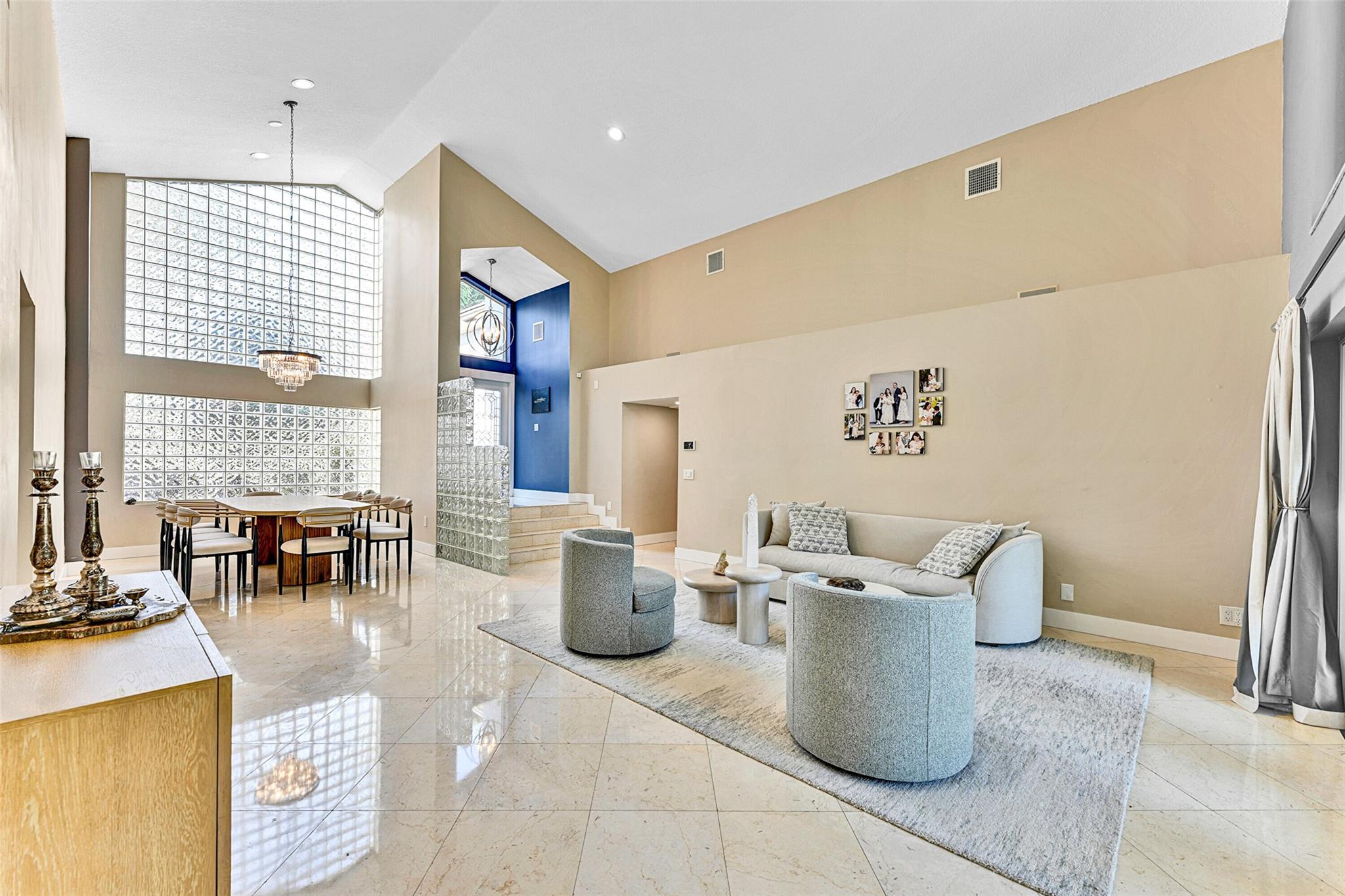 Discover refined living in the highly desirable Whispering pines community- where every home is uniquely crafted and surrounded by lush landscapes, peaceful water views and the soothing sounds of nature. This 5-bed, 3.5-bathroom estate is set on a builder's acre and offers the perfect balance of elegance and comfort. Designed with soaring 31-foot ceilings, the home features marble flooring in common areas, hardwood floors in bedrooms, and built in closets throughout. The oversized primary bedroom overlooks the pool. At the heart of the home is a chef-inspired kitchen outfitted with Thermador appliances and built in Miele coffee system. Step outside to your resort style backyard with heated pool, stunning water views, and a brand new in ground basketball hoop. This rare find won't last.