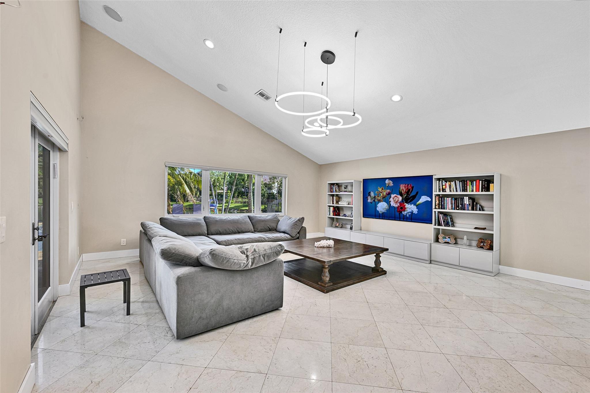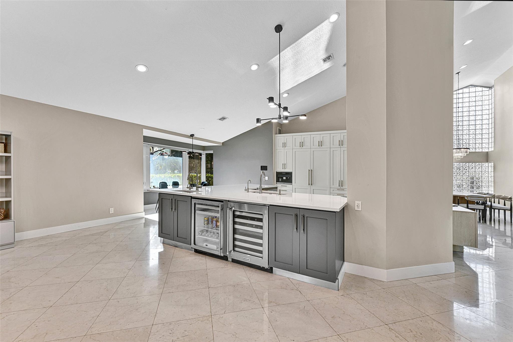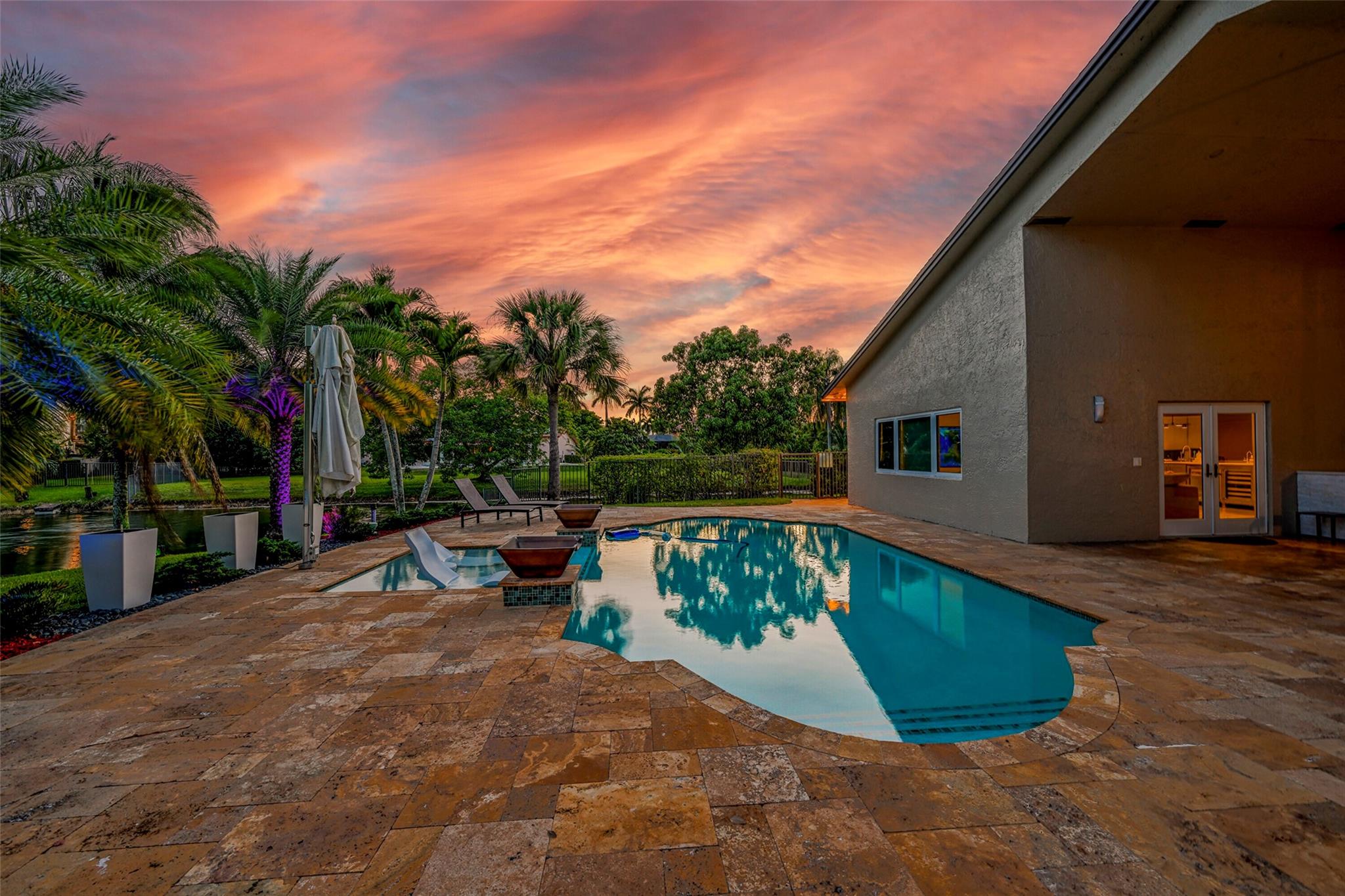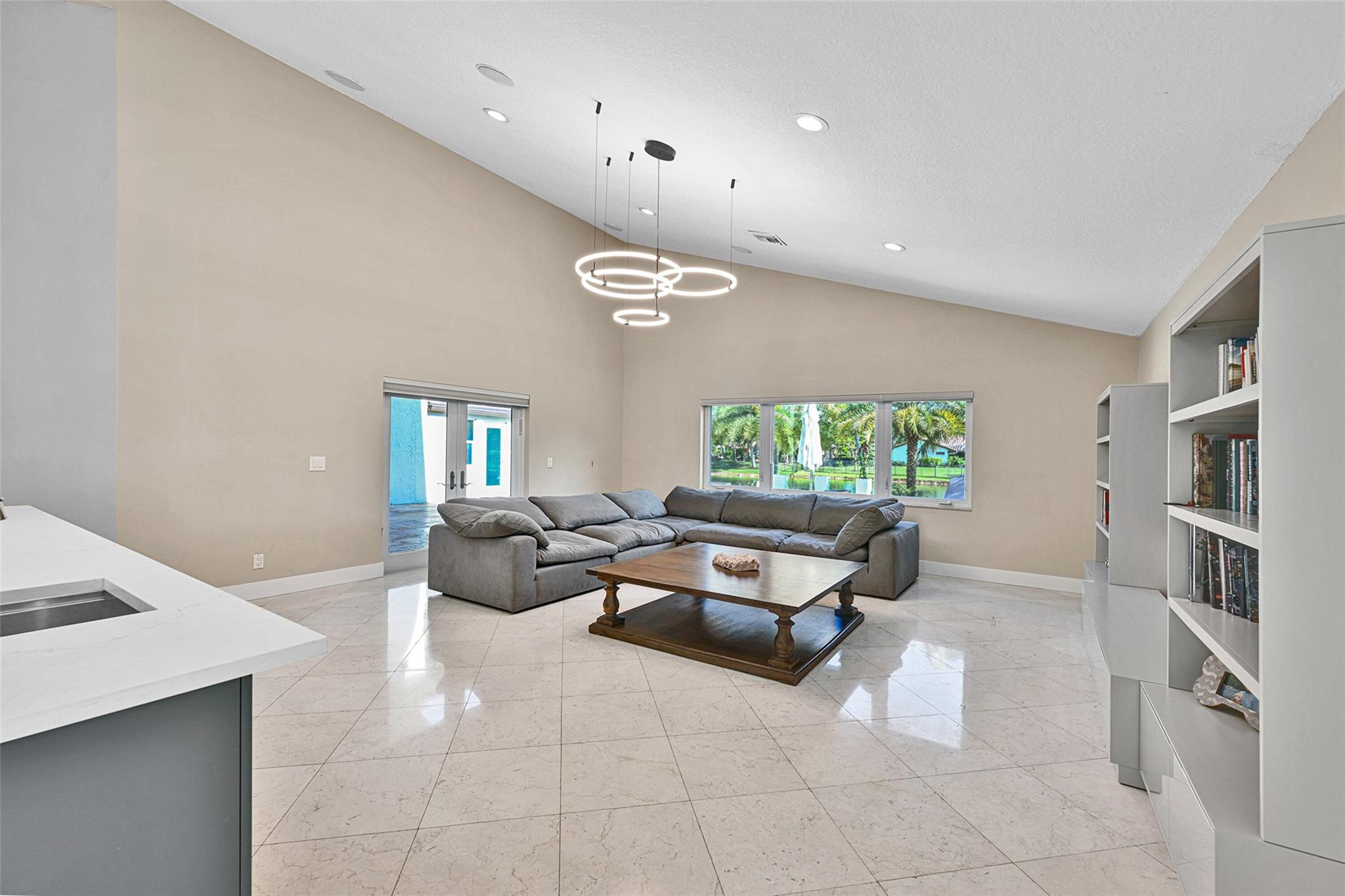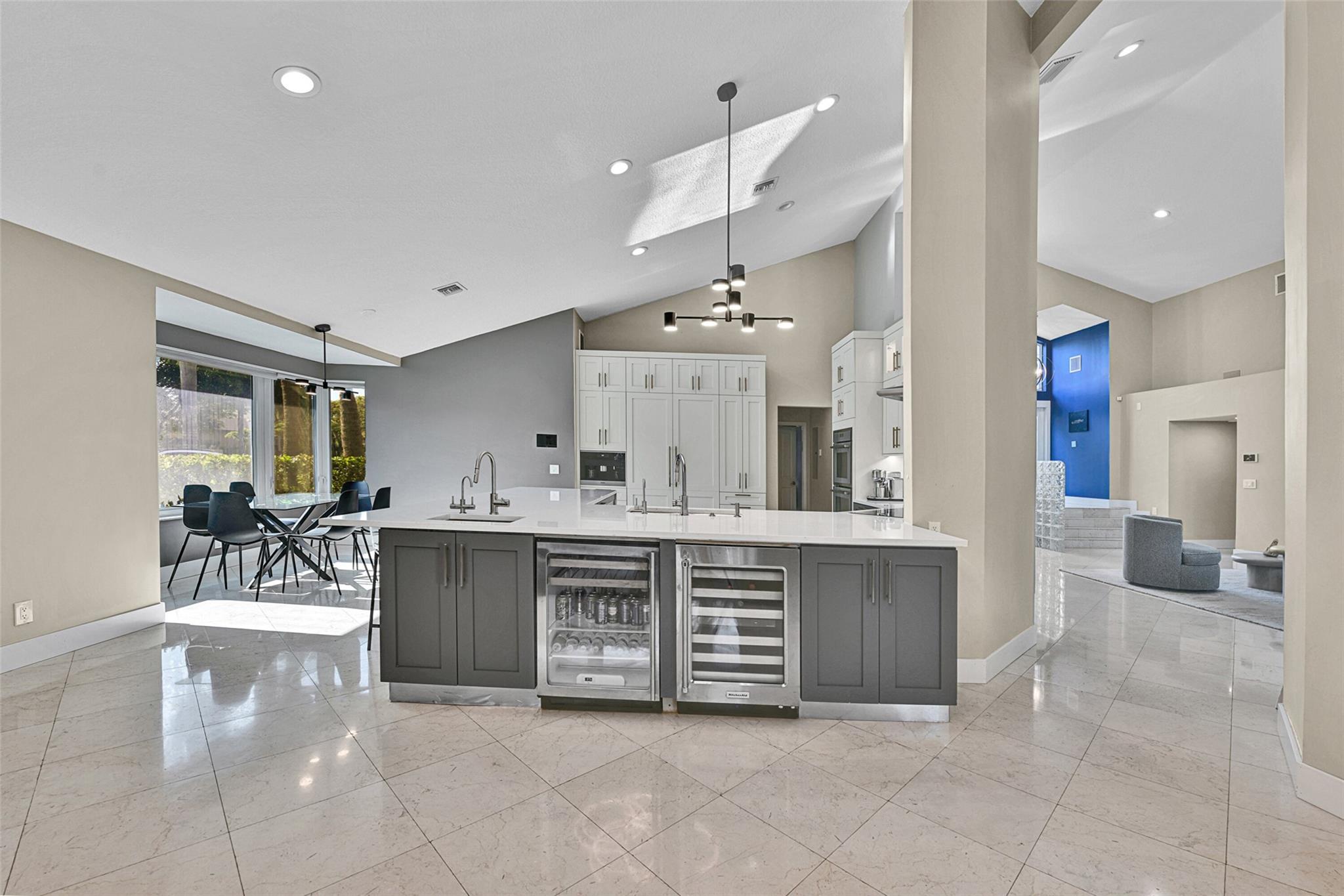 Discover refined living in the highly desirable Whispering pines community- where every home is uniquely crafted and surrounded by lush landscapes, peaceful water views and the soothing sounds of nature. This 5-bed, 3.5-bathroom estate is set on a builder's acre and offers the perfect balance of elegance and comfort. Designed with soaring 31-foot ceilings, the home features marble flooring in common areas, hardwood floors in bedrooms, and built in closets throughout. The oversized primary bedroom overlooks the pool. At the heart of the home is a chef-inspired kitchen outfitted with Thermador appliances and built in Miele coffee system. Step outside to your resort style backyard with heated pool, stunning water views, and a brand new in ground basketball hoop. This rare find won't last.