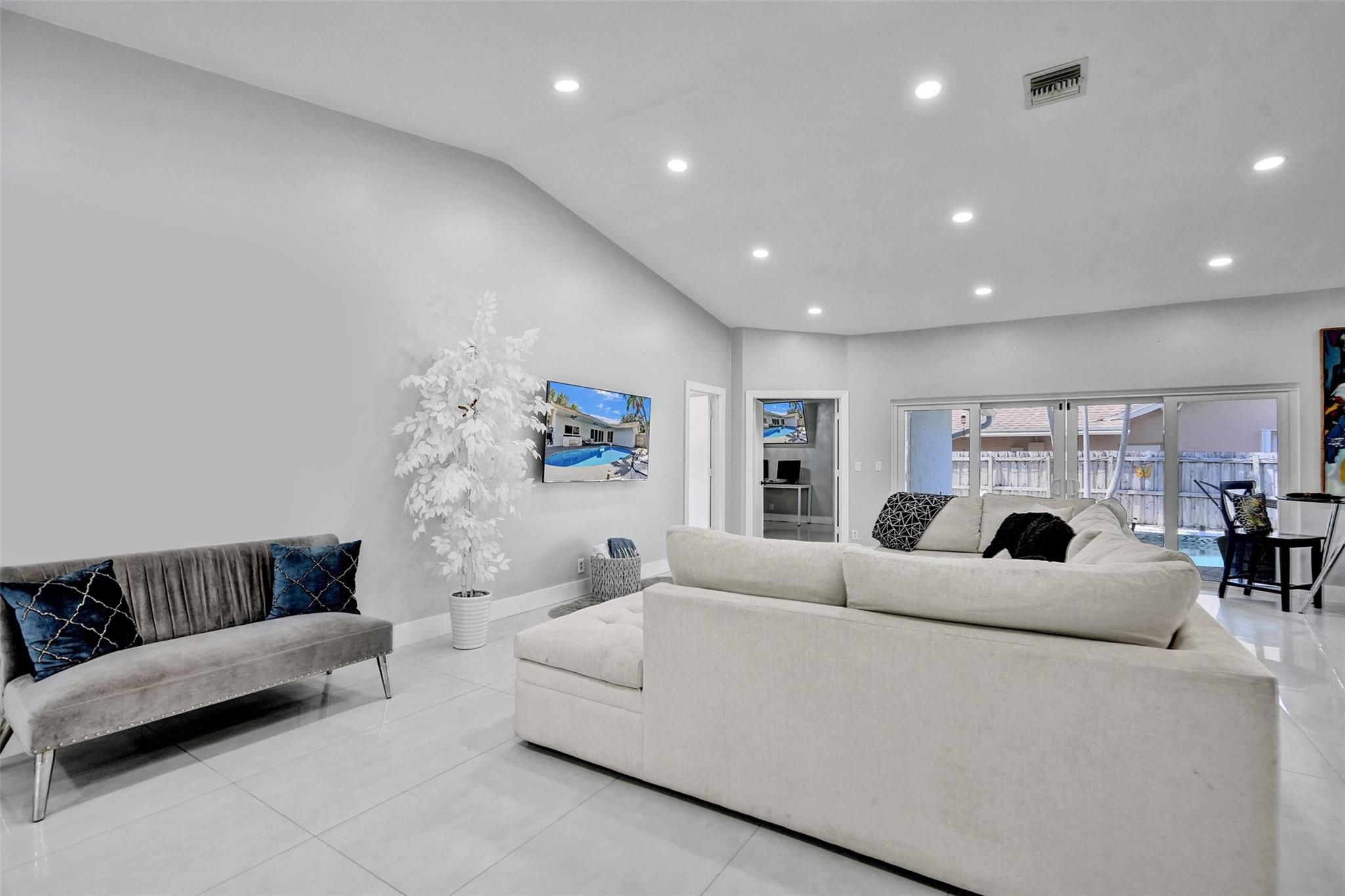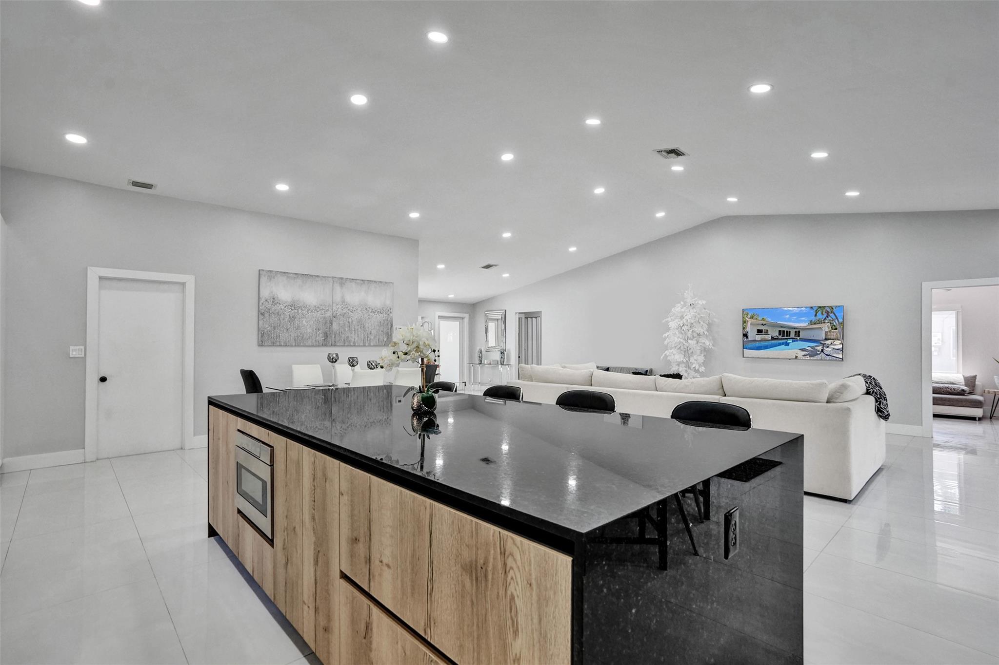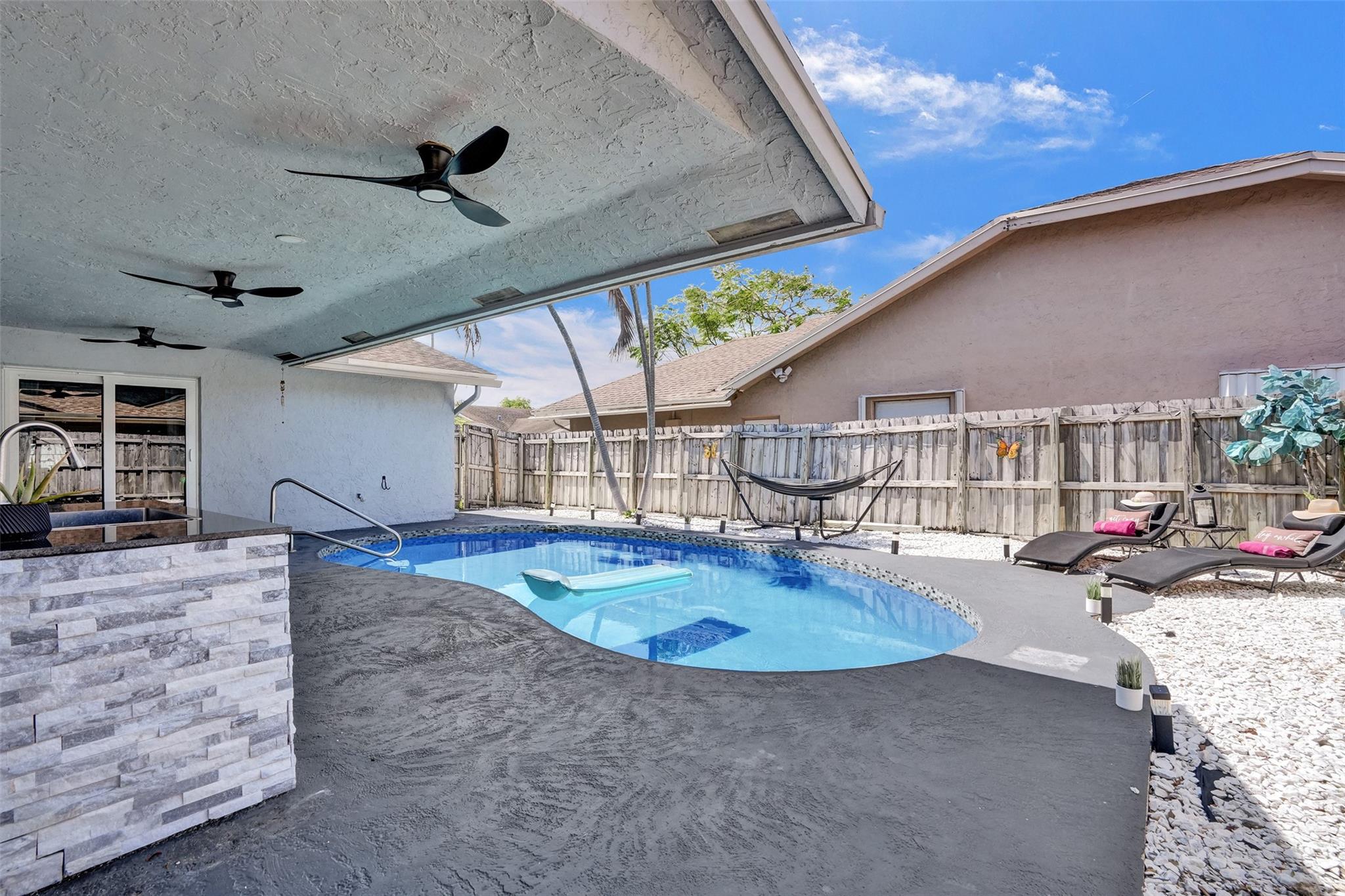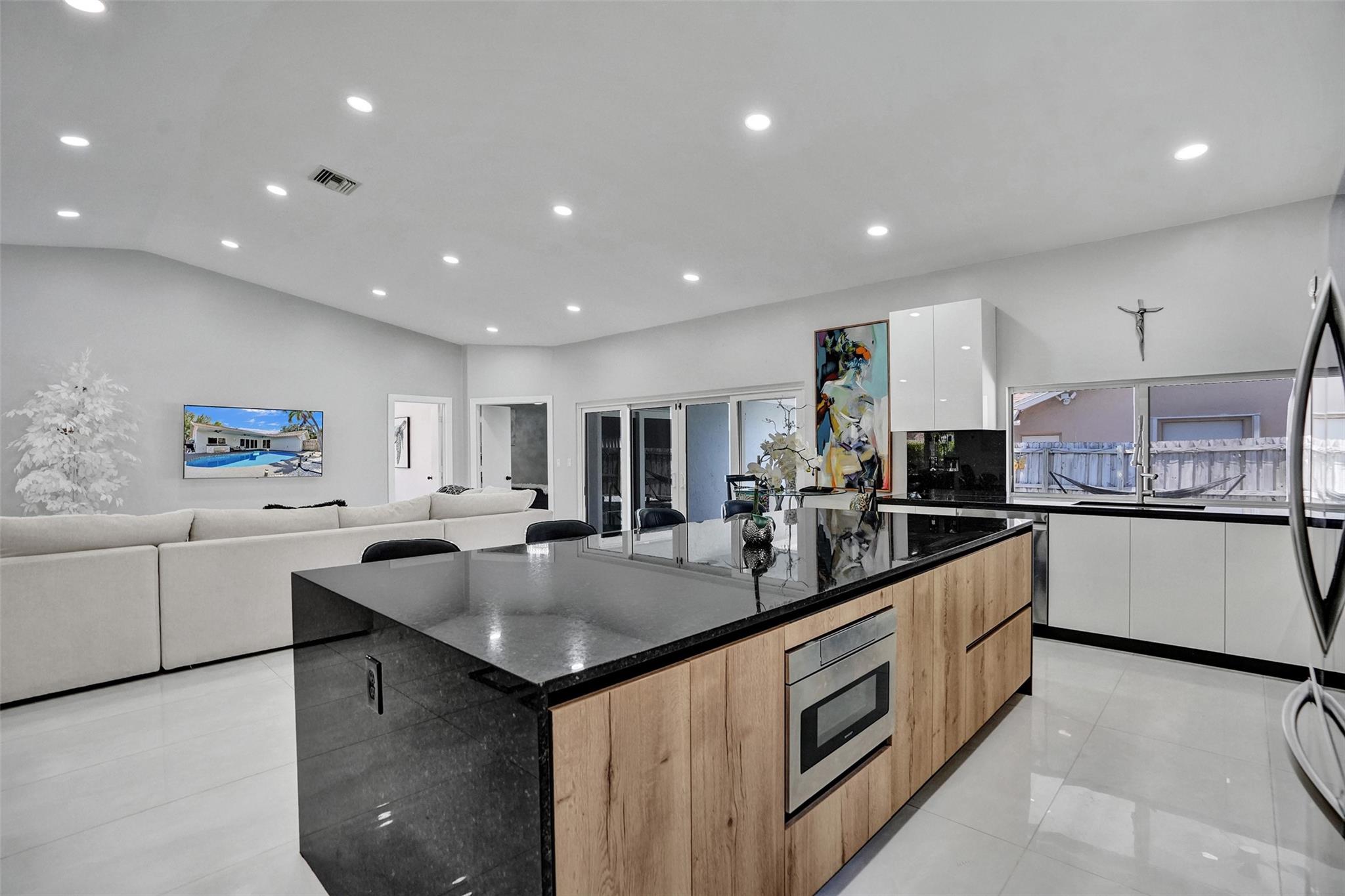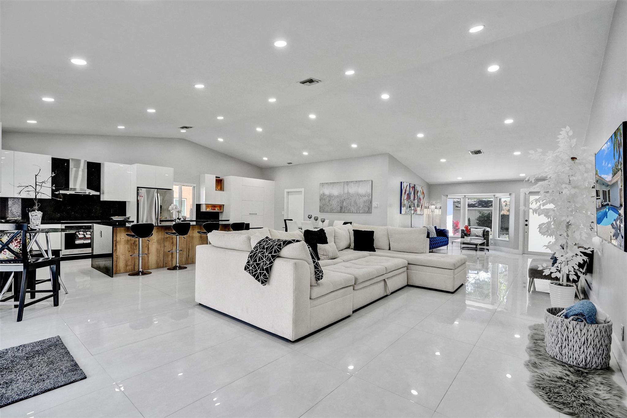Welcome to this beautifully updated 4-bed, 2-bath corner lot home! Featuring an open floor plan with vaulted ceilings, recessed lighting, & large white tile flooring, this home exudes modern elegance. The upgraded kitchen boasts black granite countertops, high-gloss white cabinets, a spacious island with ample seating, stainless steel appliances, wine fridge, & coffee bar, perfect for entertaining. Enjoy peace of mind with hurricane impact windows, a tankless water heater, & zebra blinds throughout. The primary bath includes a cabana door leading to the backyard oasis, with a recently re-diamond brited & re-tiled kidney-shaped pool & fenced. Additional features : a 2-car garage & low annual HOA fee of just $300. Situated near University Drive, you're close to shops, restaurants, and more.