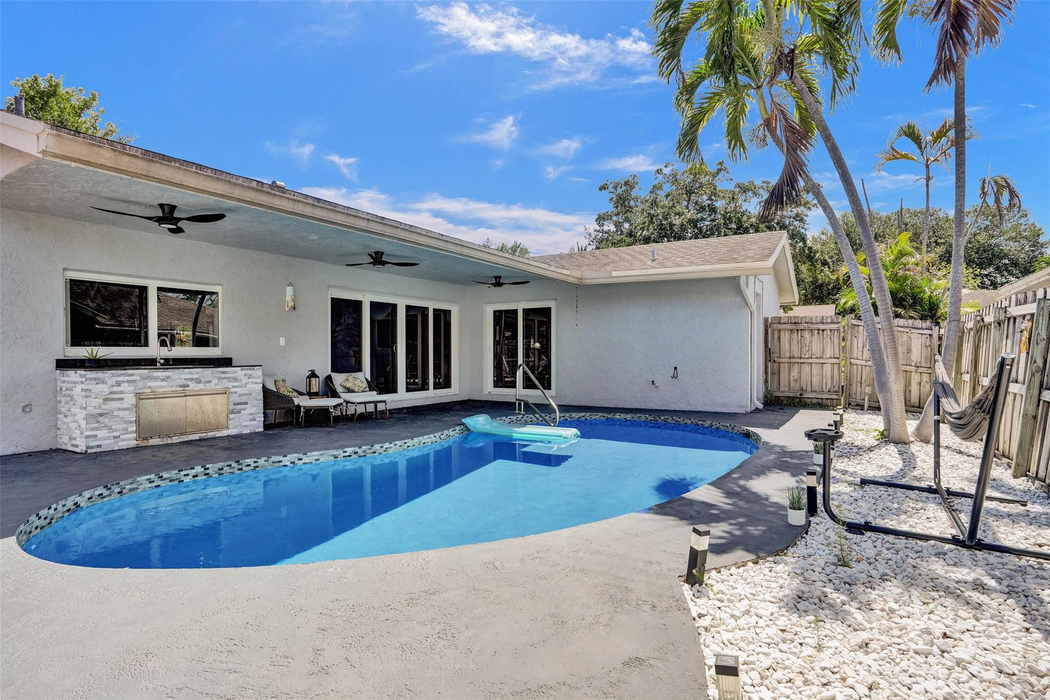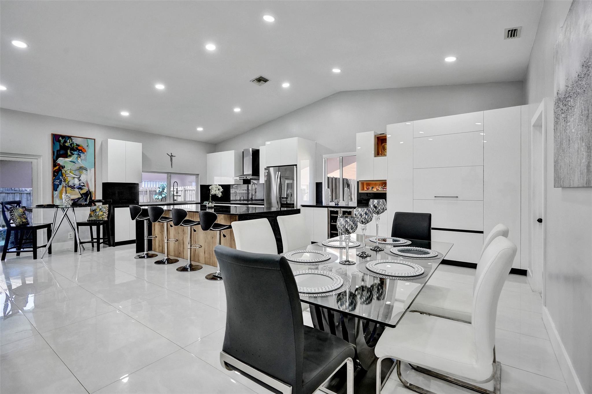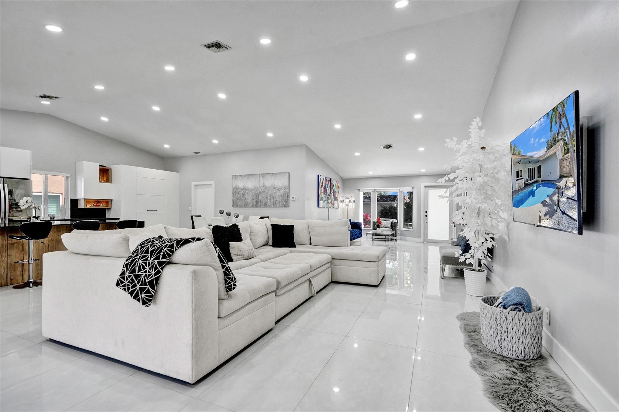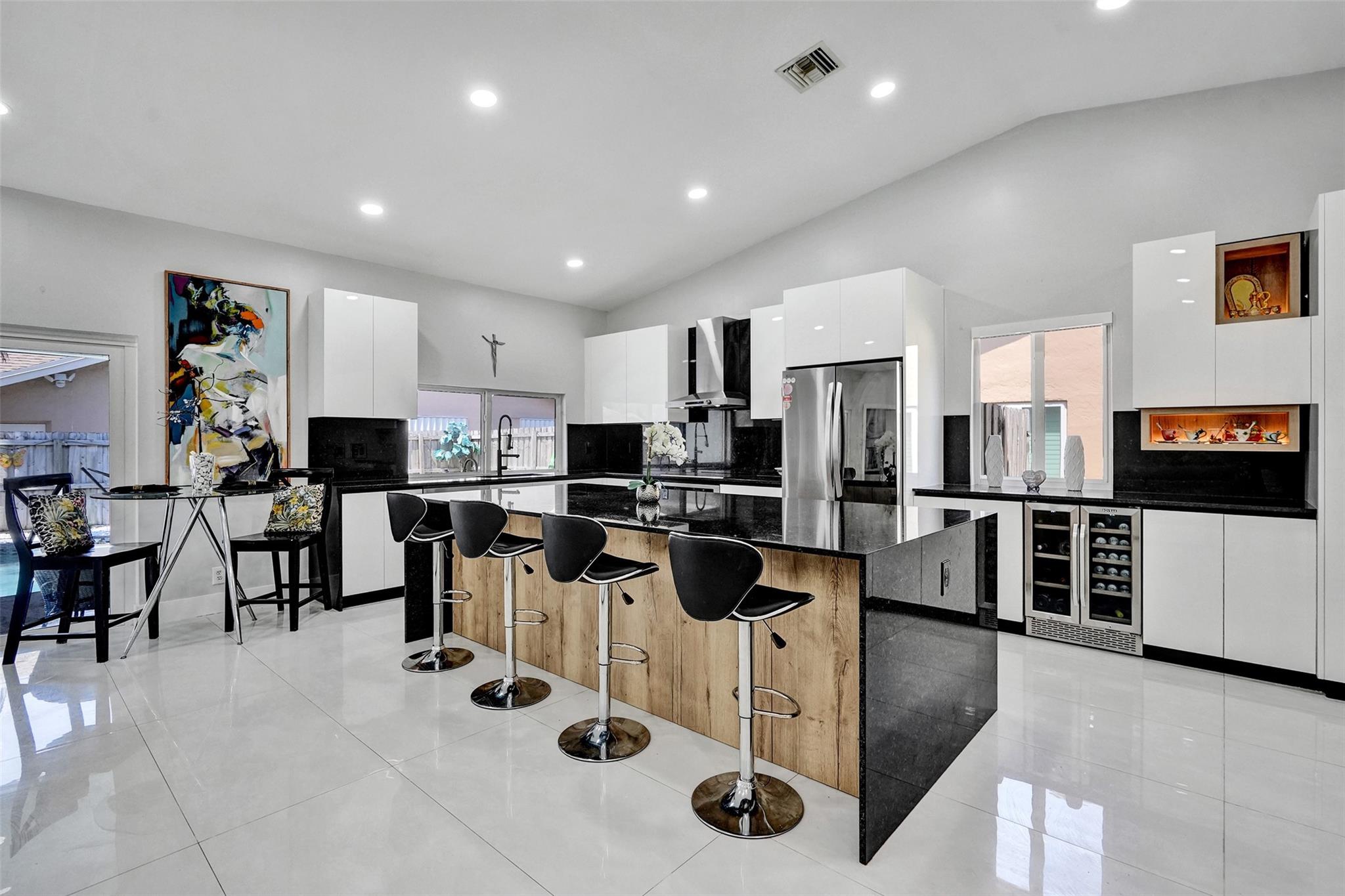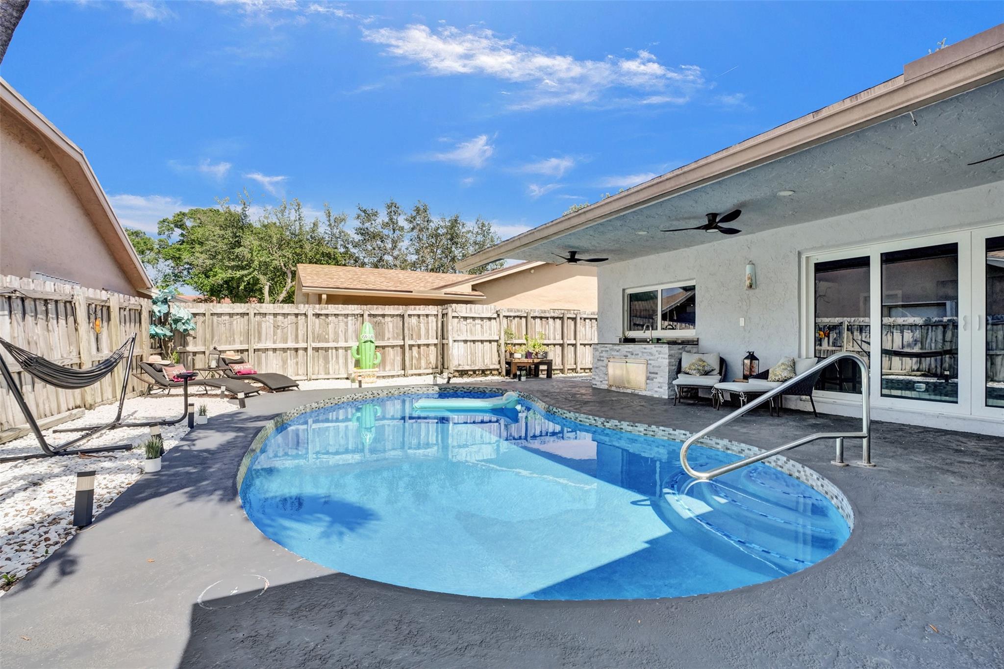 Welcome to this beautifully updated 4-bed, 2-bath corner lot home! Featuring an open floor plan with vaulted ceilings, recessed lighting, & large white tile flooring, this home exudes modern elegance. The upgraded kitchen boasts black granite countertops, high-gloss white cabinets, a spacious island with ample seating, stainless steel appliances, wine fridge, & coffee bar, perfect for entertaining. Enjoy peace of mind with hurricane impact windows, a tankless water heater, & zebra blinds throughout. The primary bath includes a cabana door leading to the backyard oasis, with a recently re-diamond brited & re-tiled kidney-shaped pool & fenced. Additional features : a 2-car garage & low annual HOA fee of just $300. Situated near University Drive, you're close to shops, restaurants, and more.
