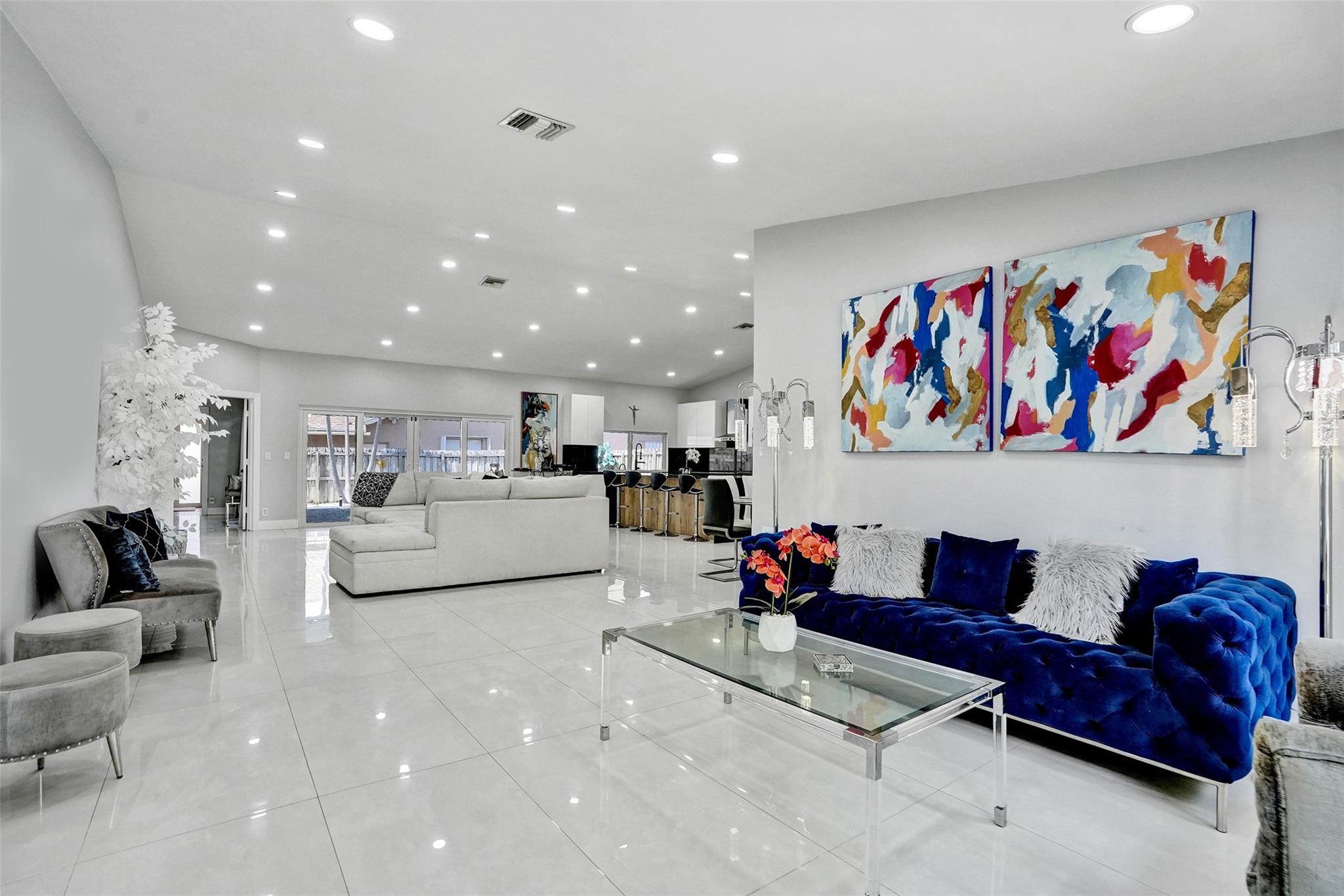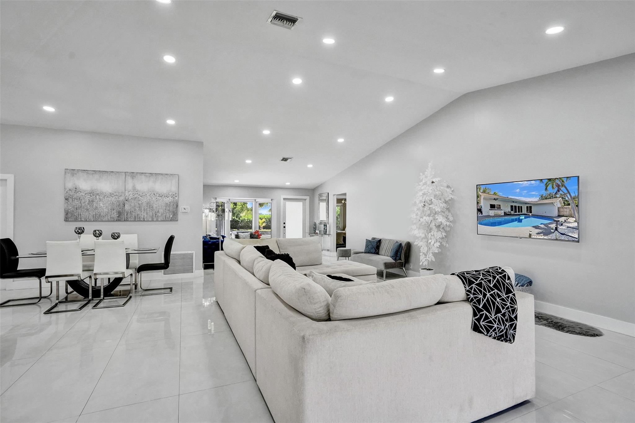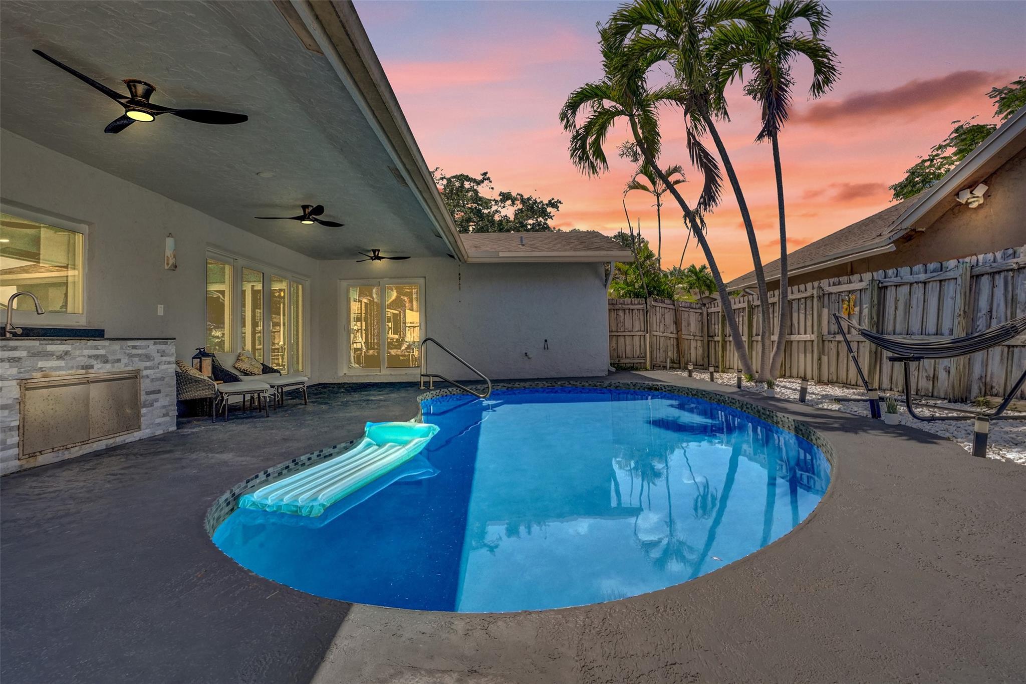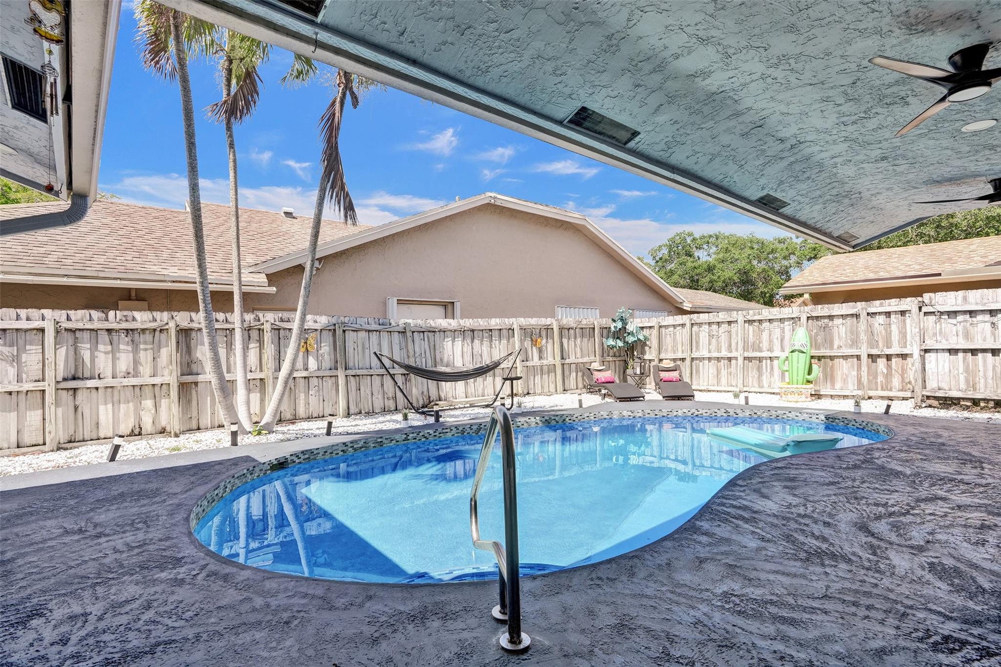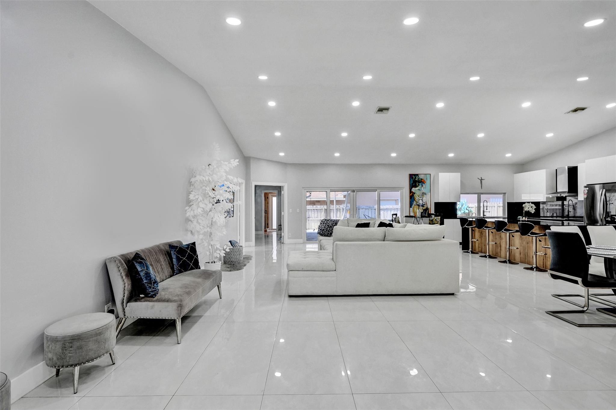 Welcome to this beautifully updated 4-bed, 2-bath corner lot home! Featuring an open floor plan with vaulted ceilings, recessed lighting, & large white tile flooring, this home exudes modern elegance. The upgraded kitchen boasts black granite countertops, high-gloss white cabinets, a spacious island with ample seating, stainless steel appliances, wine fridge, & coffee bar, perfect for entertaining. Enjoy peace of mind with hurricane impact windows, a tankless water heater, & zebra blinds throughout. The primary bath includes a cabana door leading to the backyard oasis, with a recently re-diamond brited & re-tiled kidney-shaped pool & fenced. Additional features : a 2-car garage & low annual HOA fee of just $300. Situated near University Drive, you're close to shops, restaurants, and more.