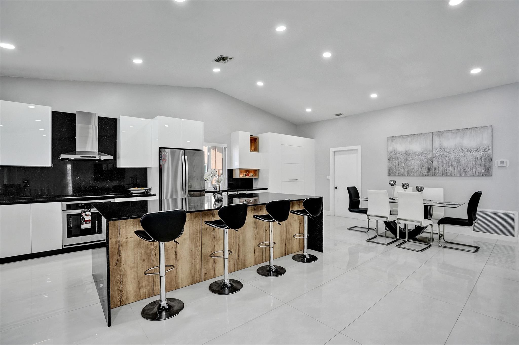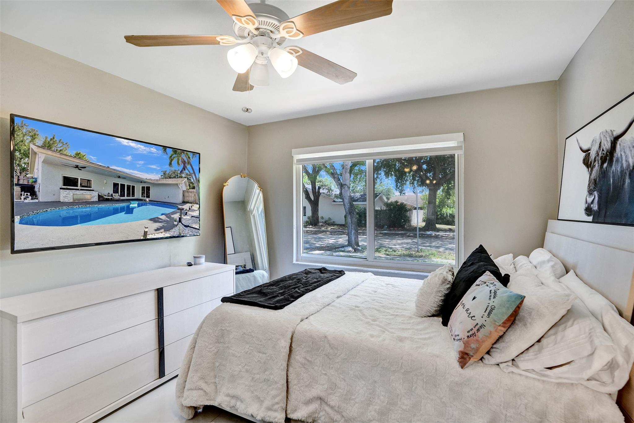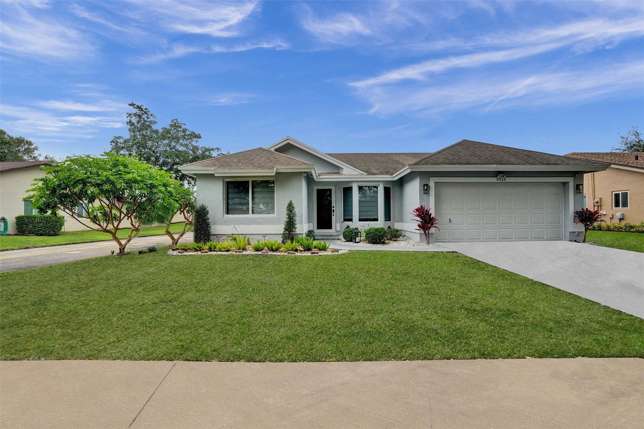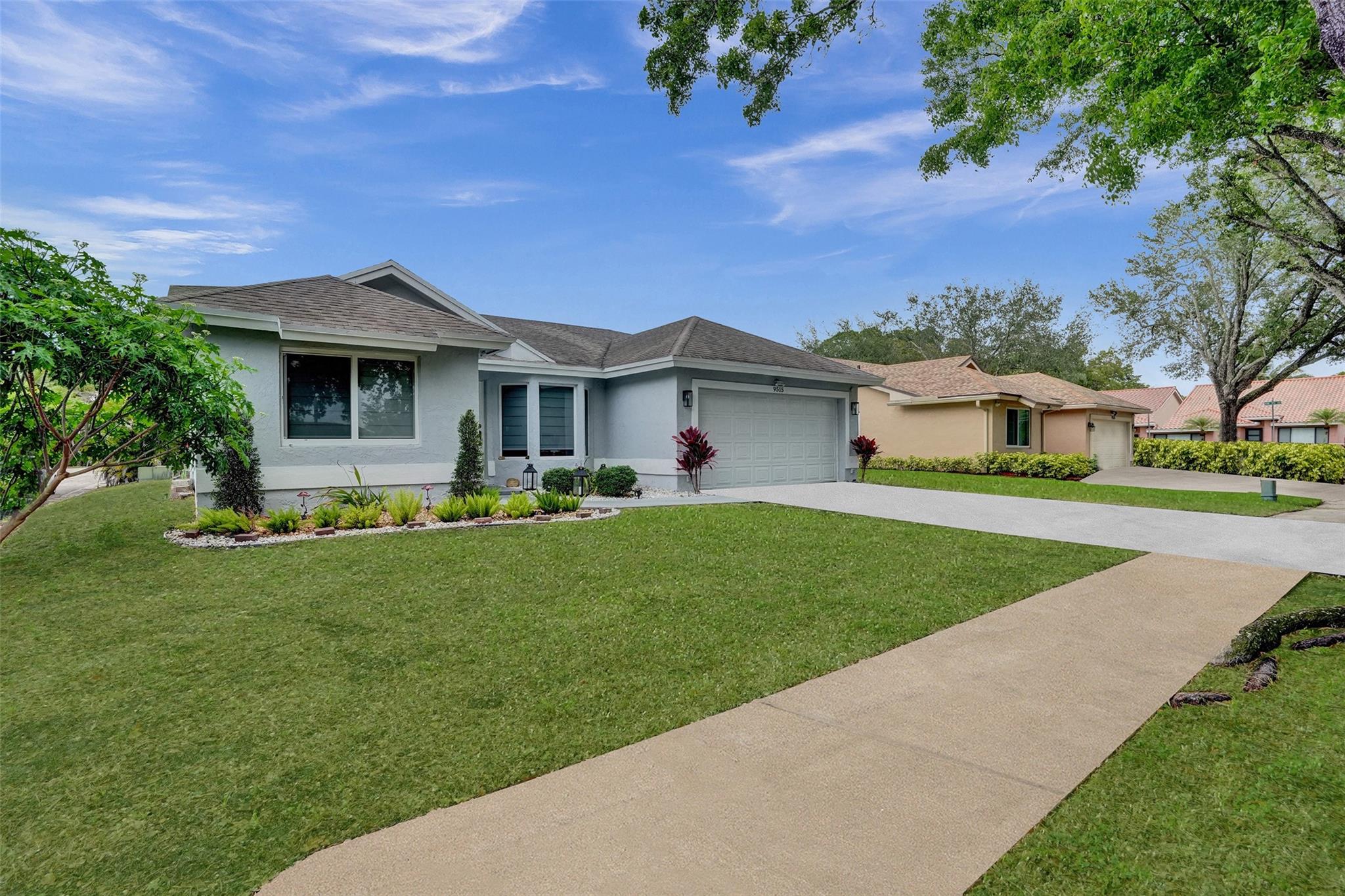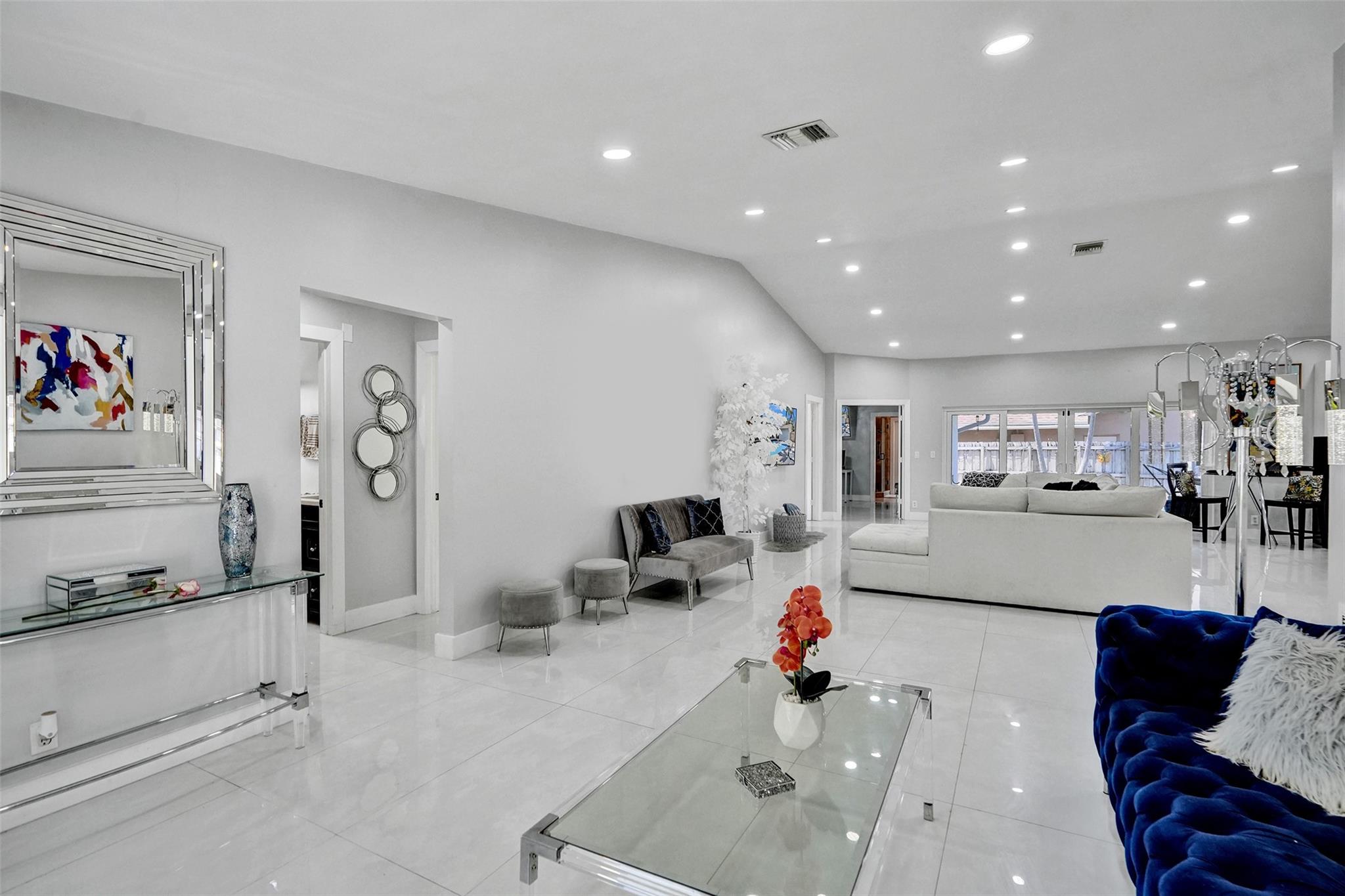 Welcome to this beautifully updated 4-bed, 2-bath corner lot home! Featuring an open floor plan with vaulted ceilings, recessed lighting, & large white tile flooring, this home exudes modern elegance. The upgraded kitchen boasts black granite countertops, high-gloss white cabinets, a spacious island with ample seating, stainless steel appliances, wine fridge, & coffee bar, perfect for entertaining. Enjoy peace of mind with hurricane impact windows, a tankless water heater, & zebra blinds throughout. The primary bath includes a cabana door leading to the backyard oasis, with a recently re-diamond brited & re-tiled kidney-shaped pool & fenced. Additional features : a 2-car garage & low annual HOA fee of just $300. Situated near University Drive, you're close to shops, restaurants, and more.
