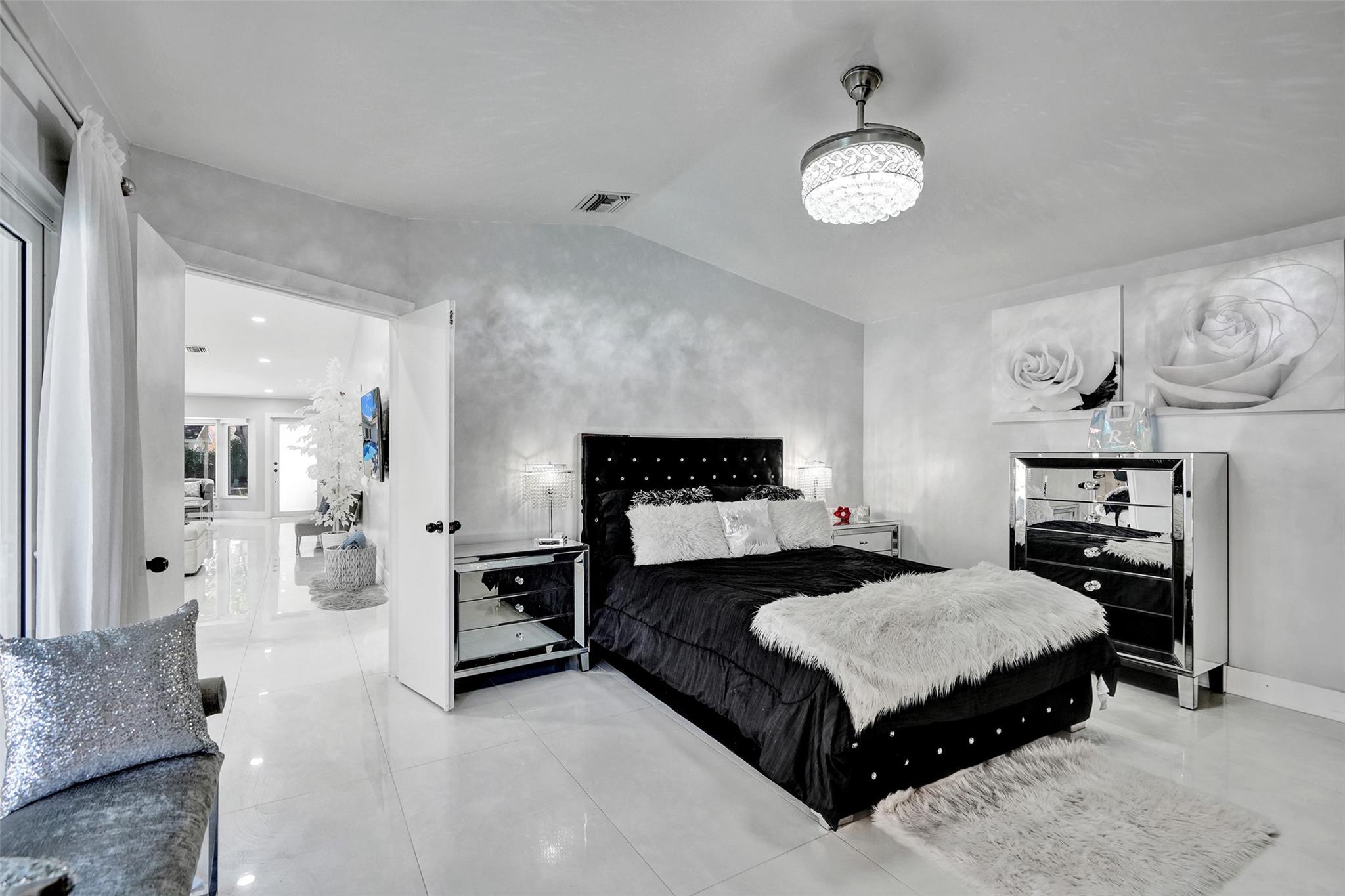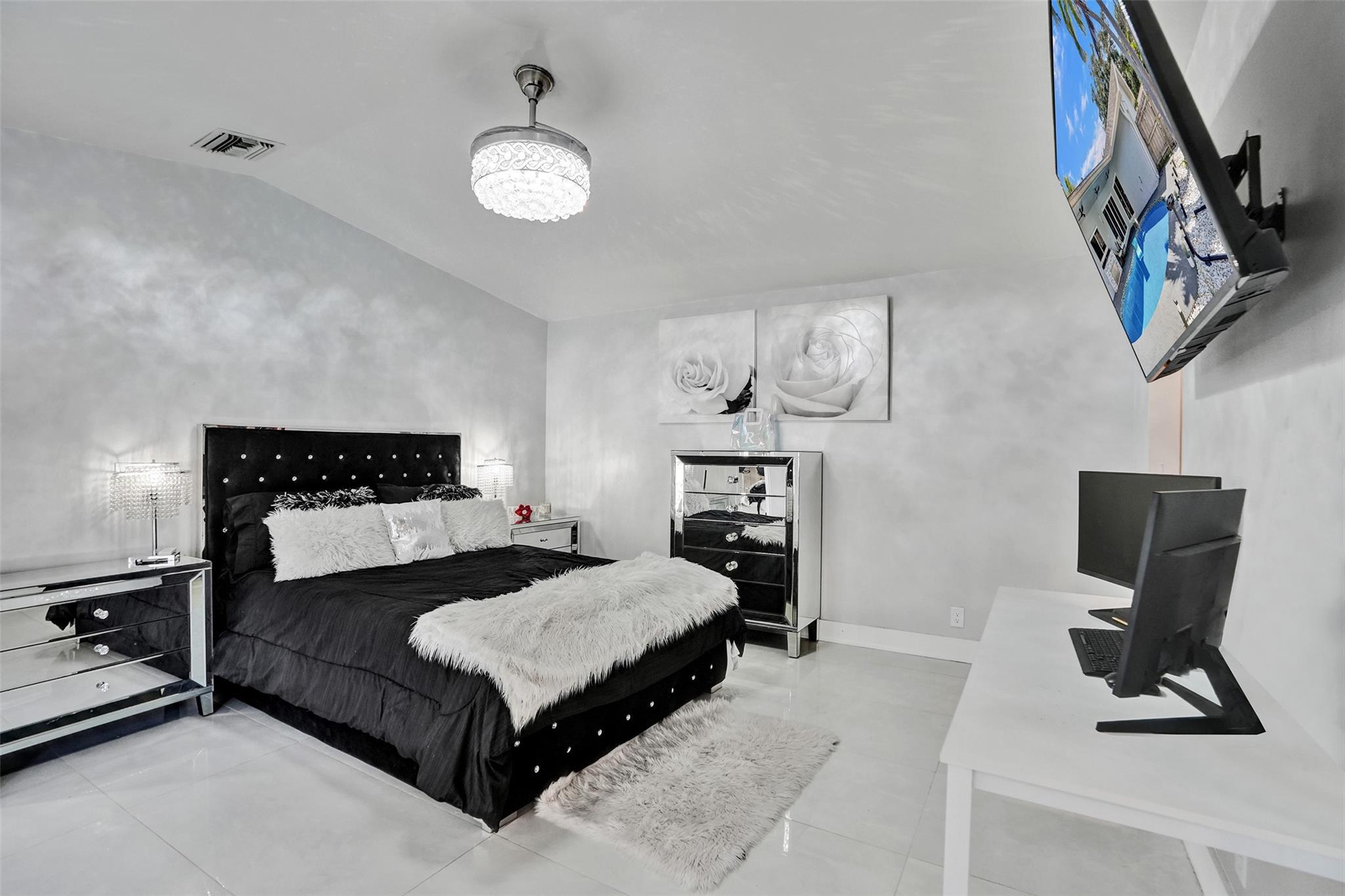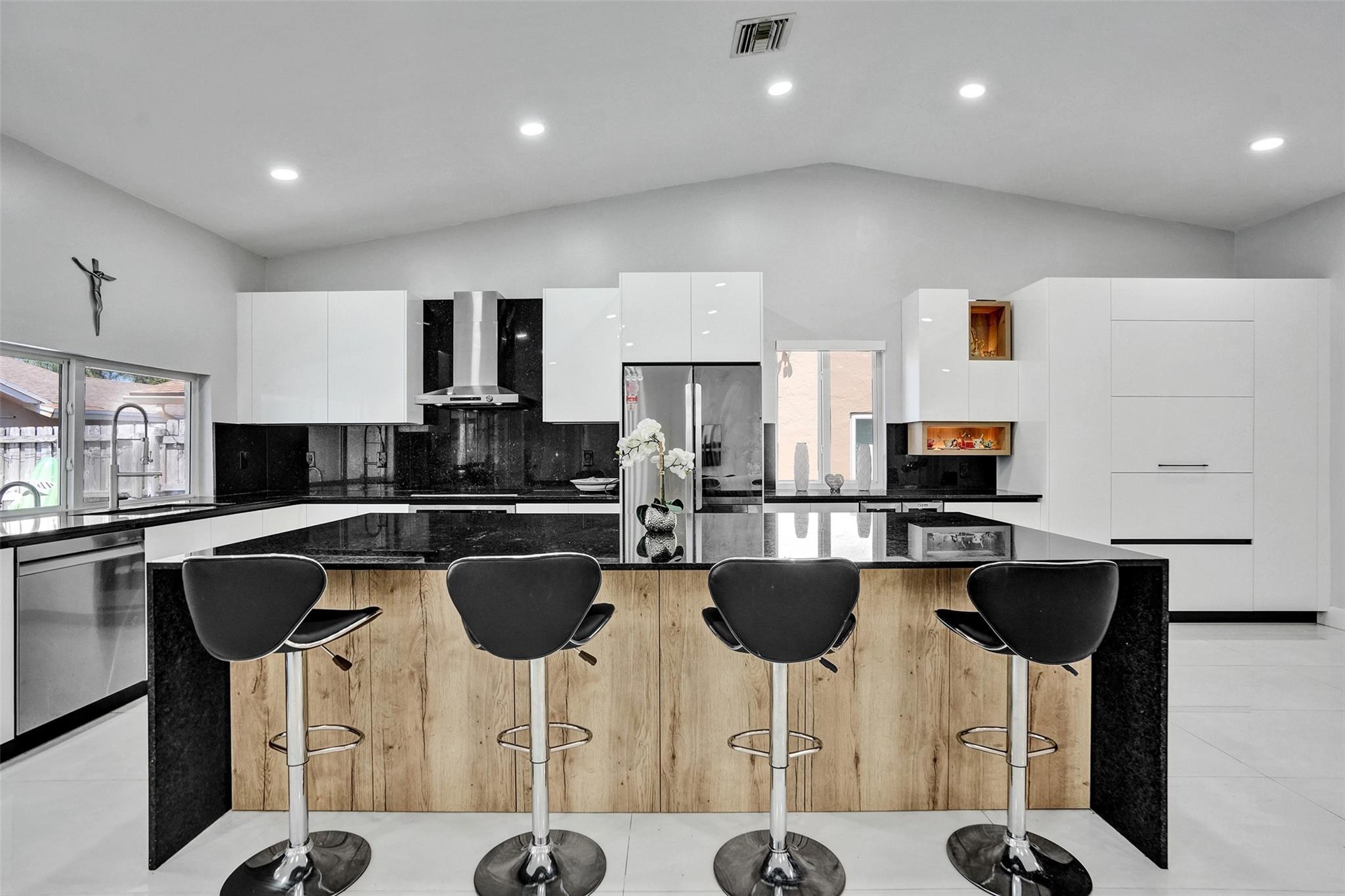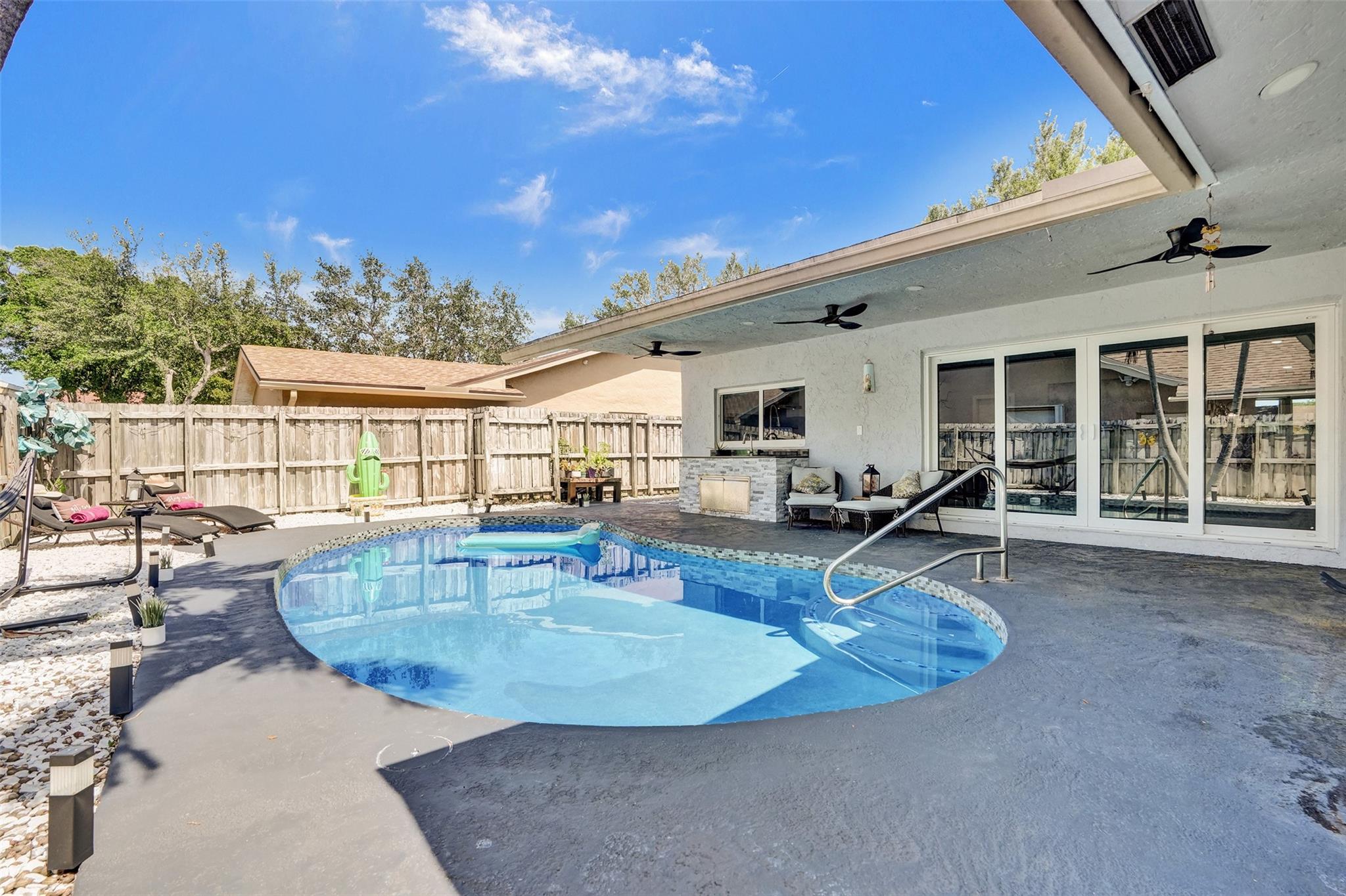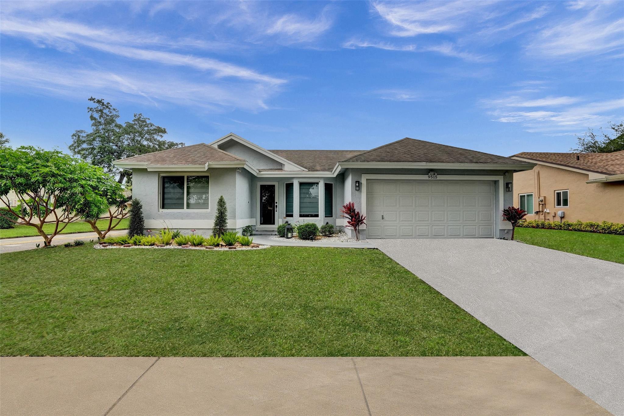Welcome to this beautifully updated 4-bed, 2-bath corner lot home! Featuring an open floor plan with vaulted ceilings, recessed lighting, & large white tile flooring, this home exudes modern elegance. The upgraded kitchen boasts black granite countertops, high-gloss white cabinets, a spacious island with ample seating, stainless steel appliances, wine fridge, & coffee bar, perfect for entertaining. Enjoy peace of mind with hurricane impact windows, a tankless water heater, & zebra blinds throughout. The primary bath includes a cabana door leading to the backyard oasis, with a recently re-diamond brited & re-tiled kidney-shaped pool & fenced. Additional features : a 2-car garage & low annual HOA fee of just $300. Situated near University Drive, you're close to shops, restaurants, and more.