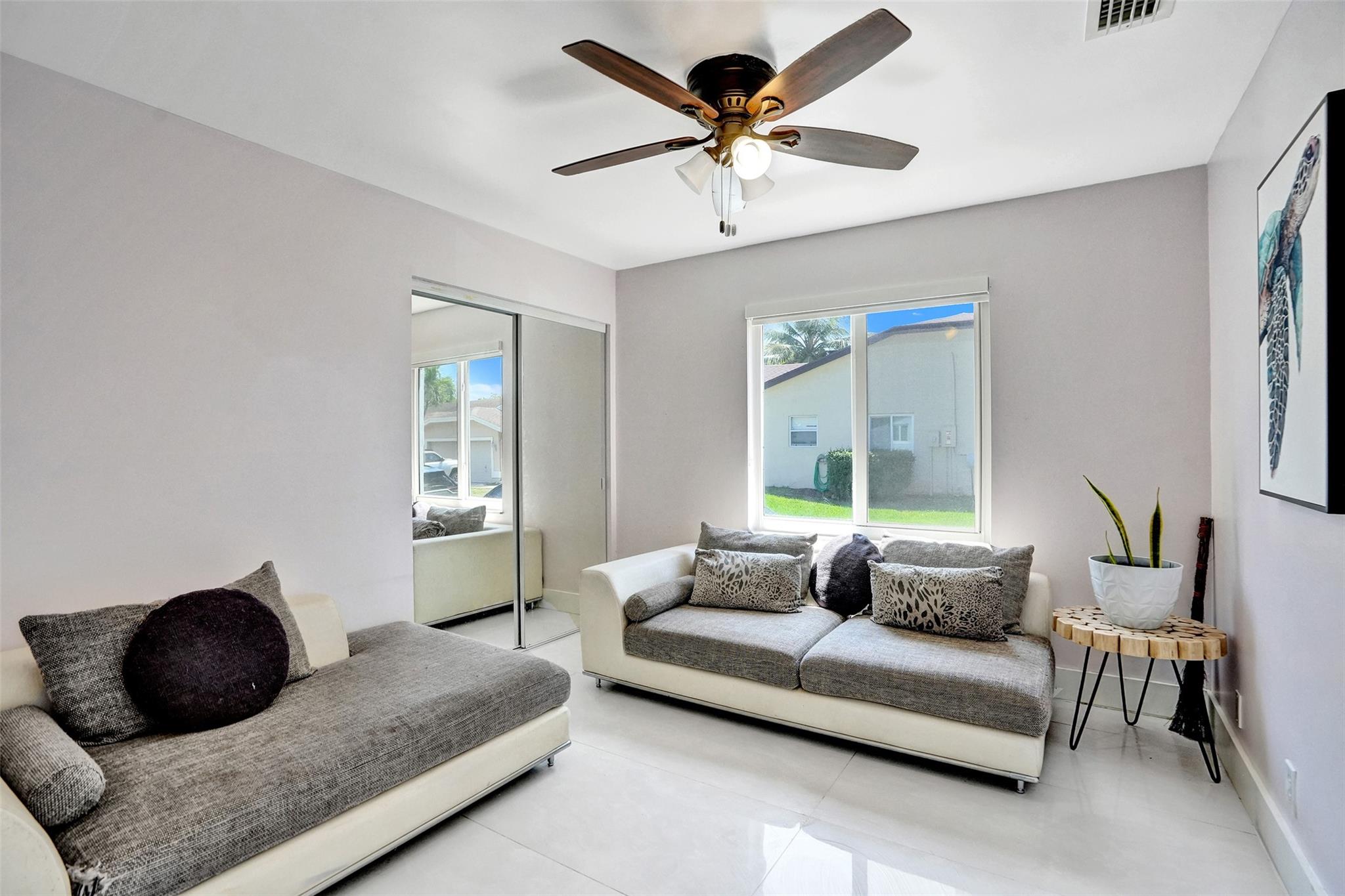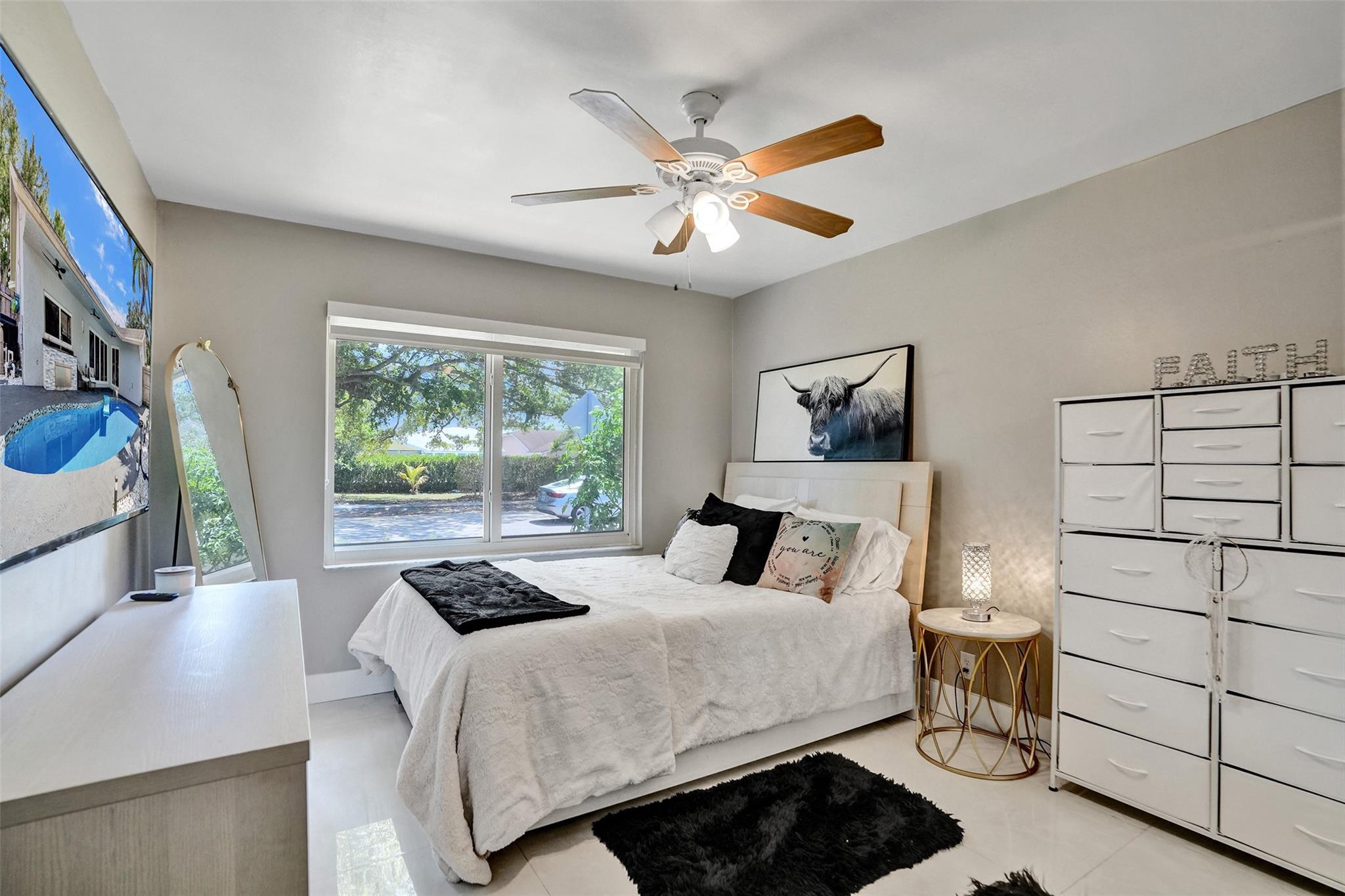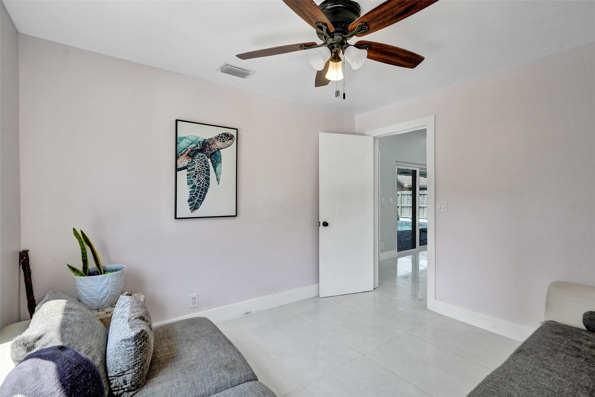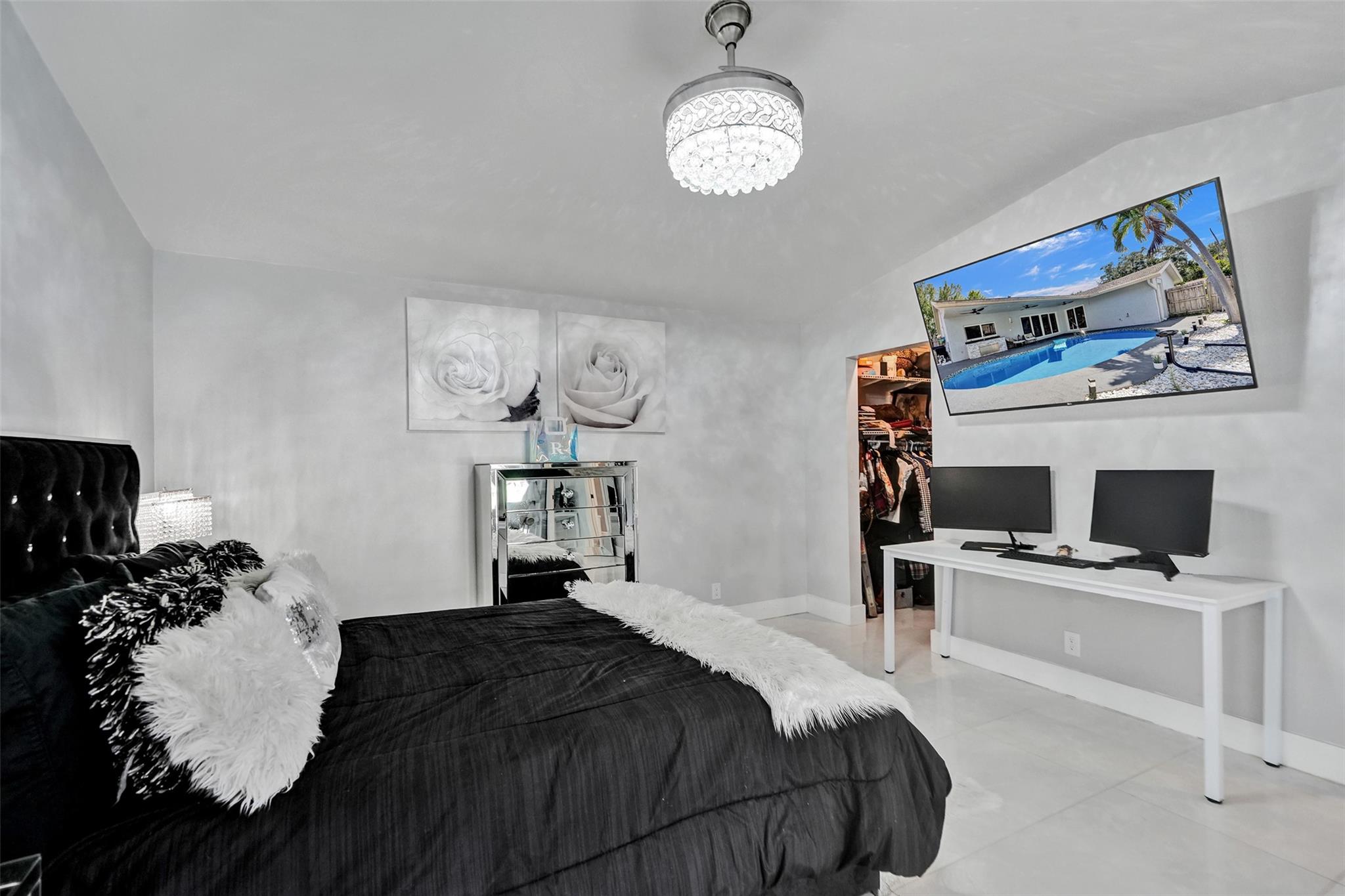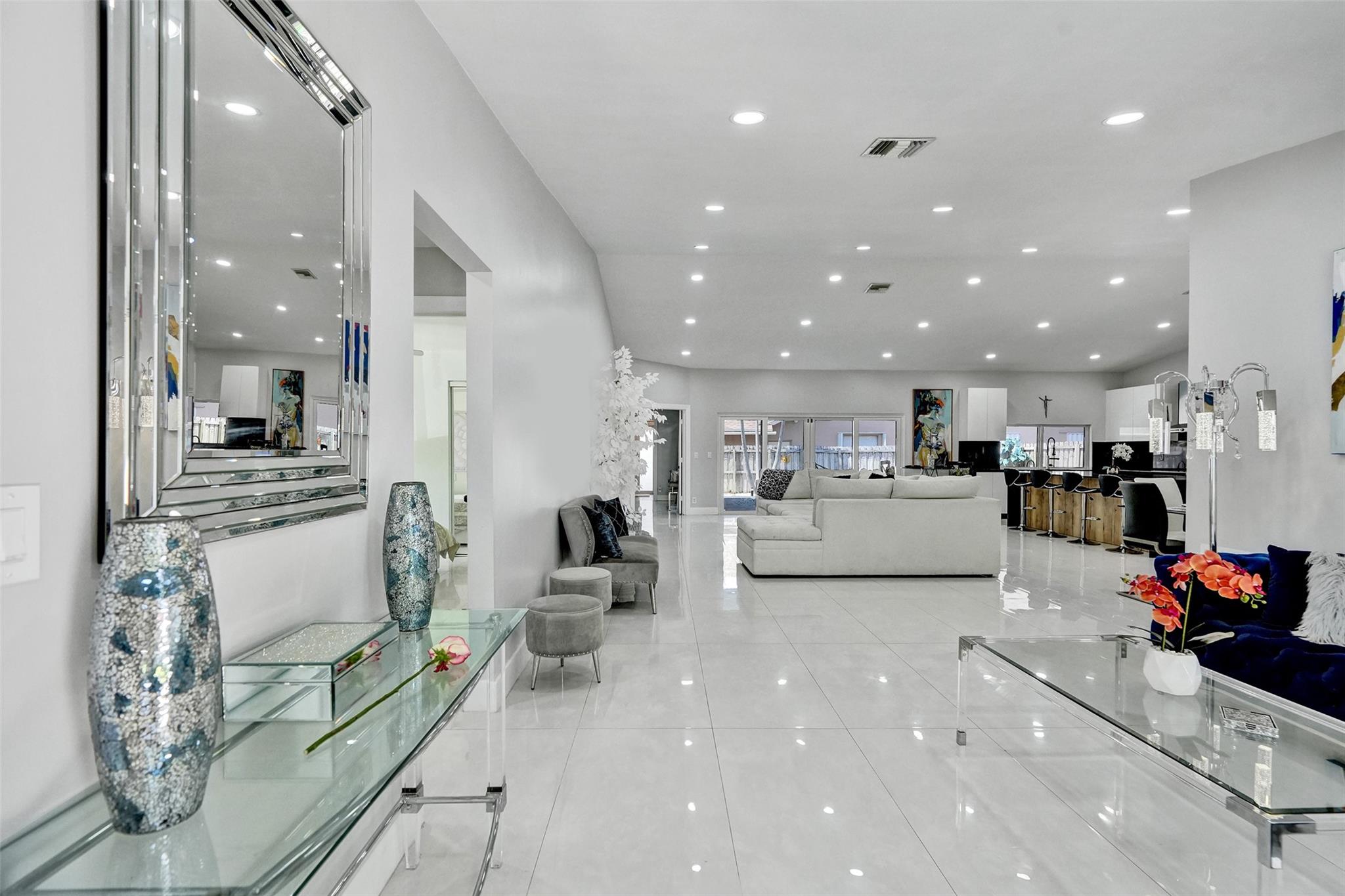 Welcome to this beautifully updated 4-bed, 2-bath corner lot home! Featuring an open floor plan with vaulted ceilings, recessed lighting, & large white tile flooring, this home exudes modern elegance. The upgraded kitchen boasts black granite countertops, high-gloss white cabinets, a spacious island with ample seating, stainless steel appliances, wine fridge, & coffee bar, perfect for entertaining. Enjoy peace of mind with hurricane impact windows, a tankless water heater, & zebra blinds throughout. The primary bath includes a cabana door leading to the backyard oasis, with a recently re-diamond brited & re-tiled kidney-shaped pool & fenced. Additional features : a 2-car garage & low annual HOA fee of just $300. Situated near University Drive, you're close to shops, restaurants, and more.